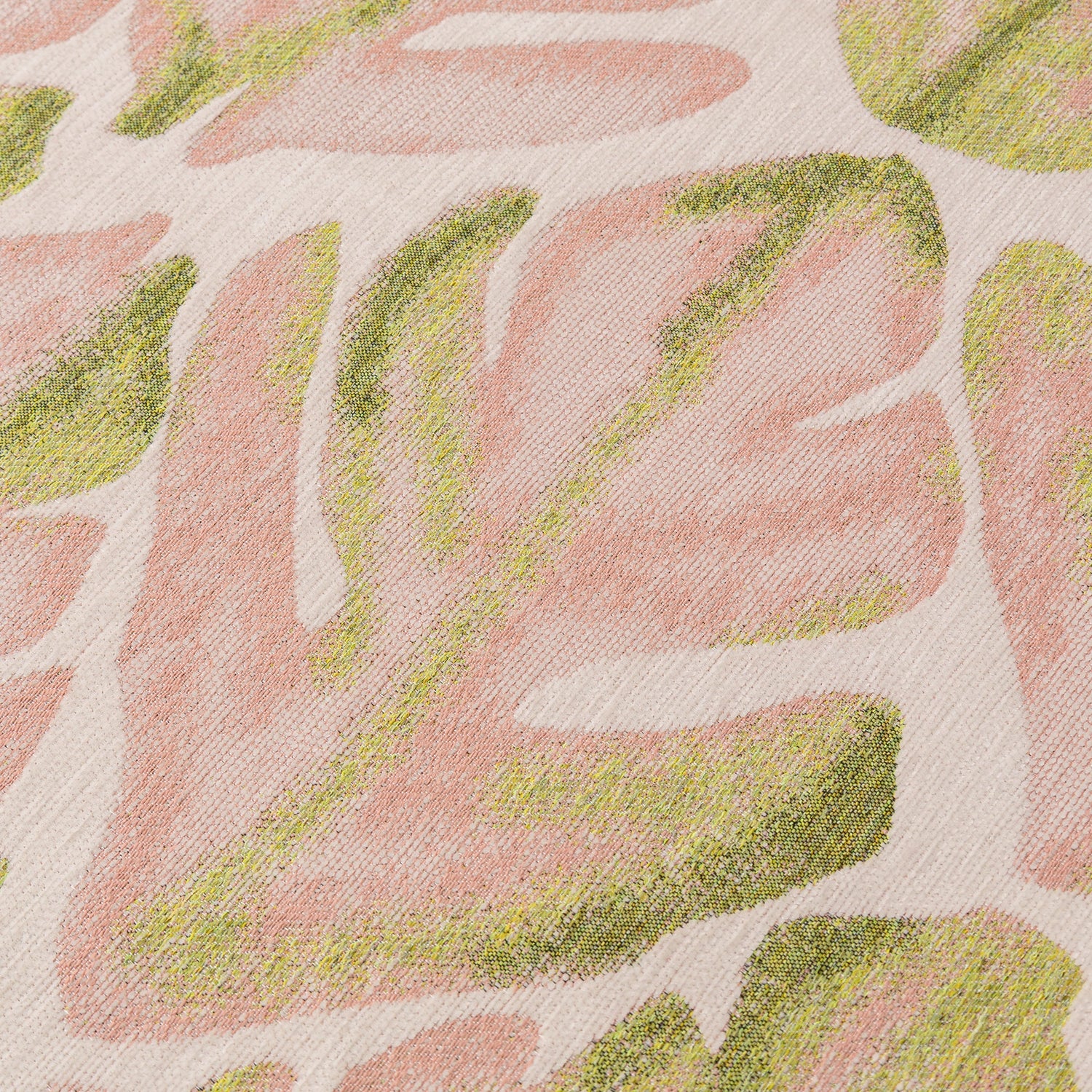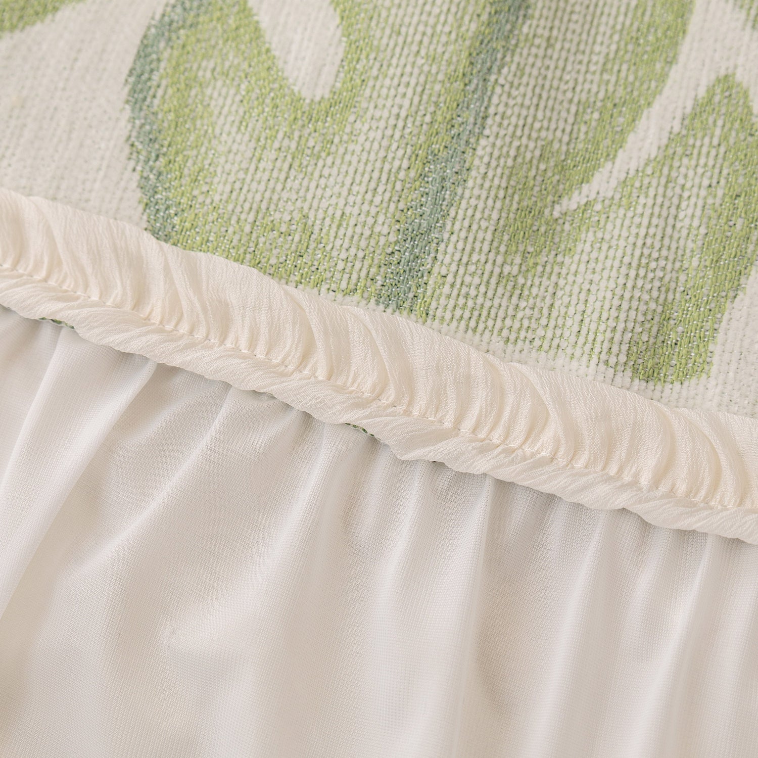Bring a soft botanical accent to your home with this elegant floral sofa cover. The woven fabric features pastel leaf and flower motifs, creating a calm, nature-inspired atmosphere. A sheer chiffon ruffle skirt adds graceful texture and dimension, making it ideal for cottagecore and soft boho interiors.