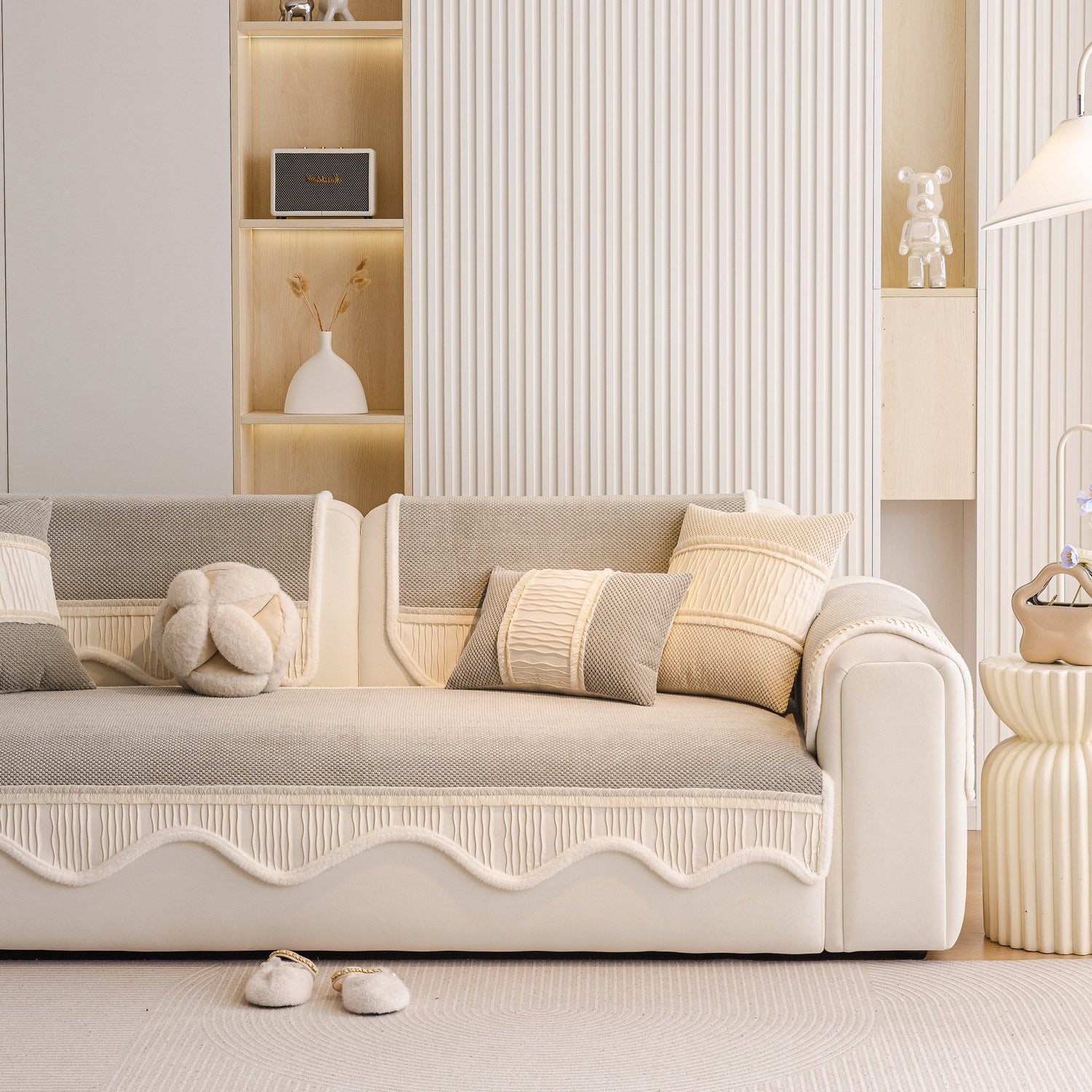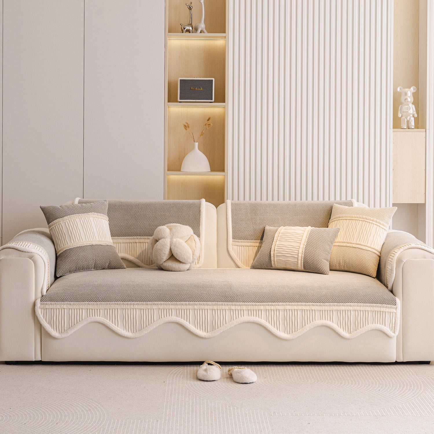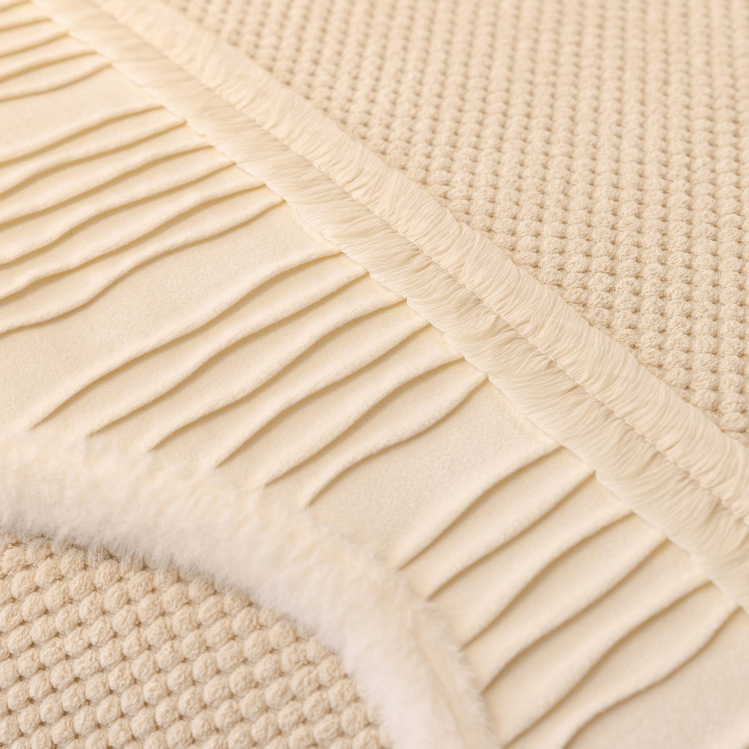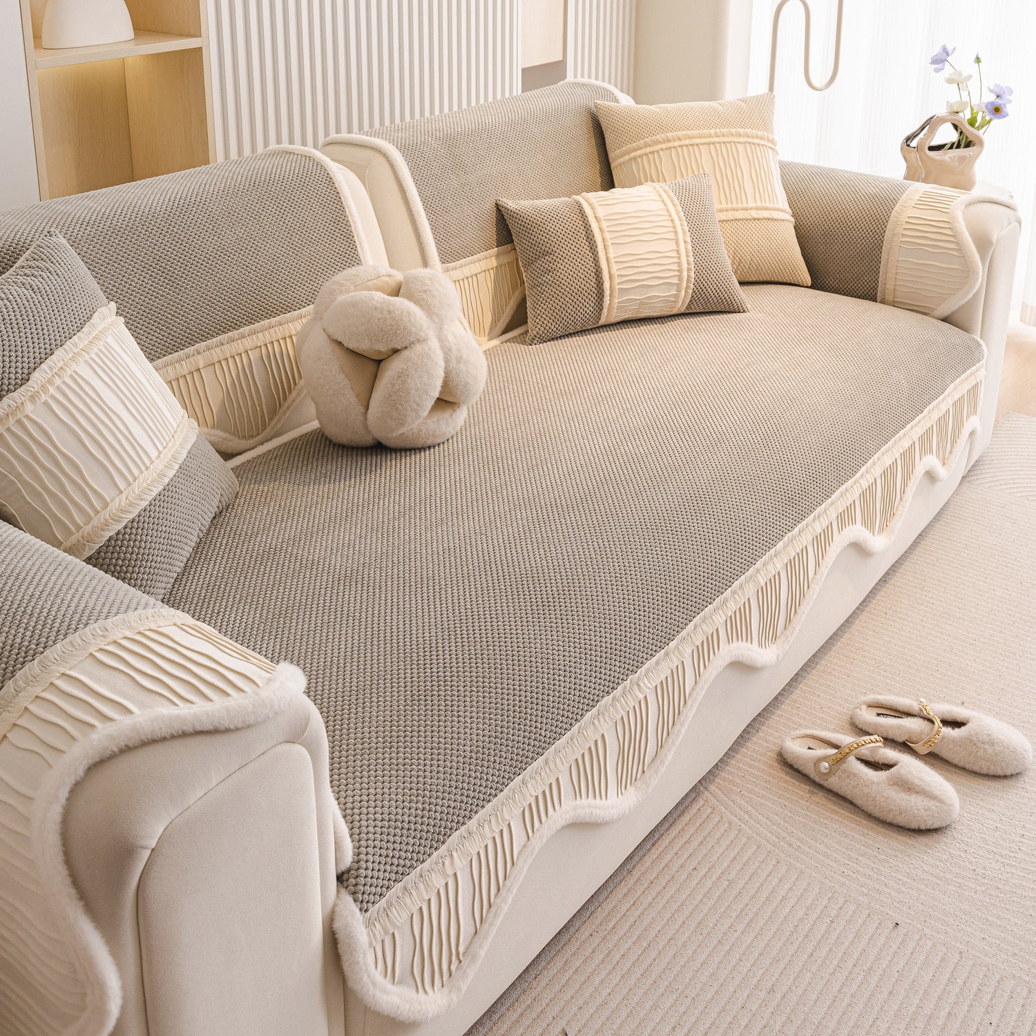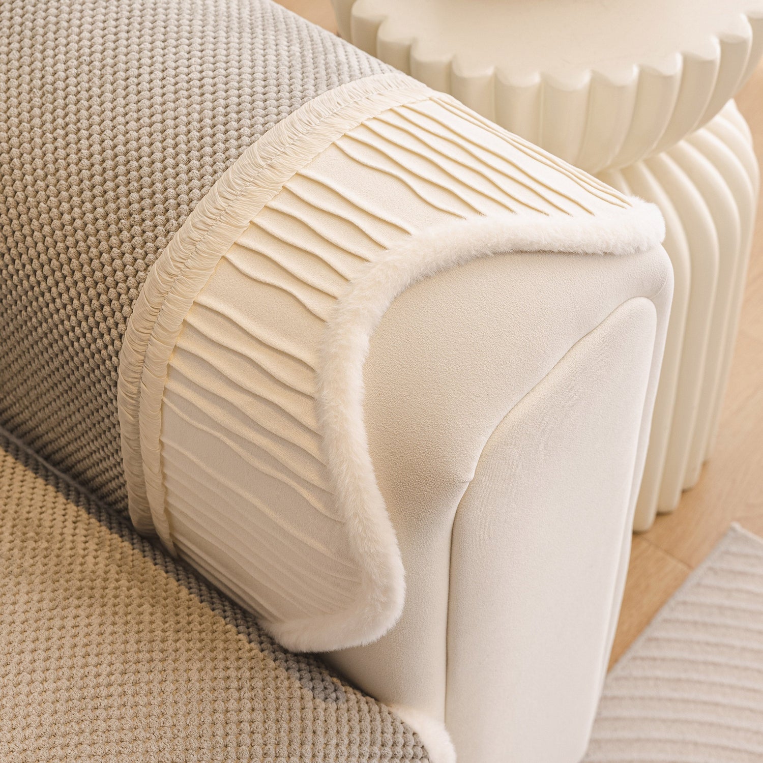 This dog washable sofa protector features a thick and soft honeycomb texture for a cozy, durable feel. Soft faux rabbit fur trims the wave-shaped, pleated edges, while non-slip silicone granules on the back keep the cover securely in place. Its split-piece design offers a tailored fit for the backrest, seat cushion, and armrests. Available in beige, gray, and khaki —each accented with crisp white faux fur edging—this cover elevates both the style and functionality of your sofa.