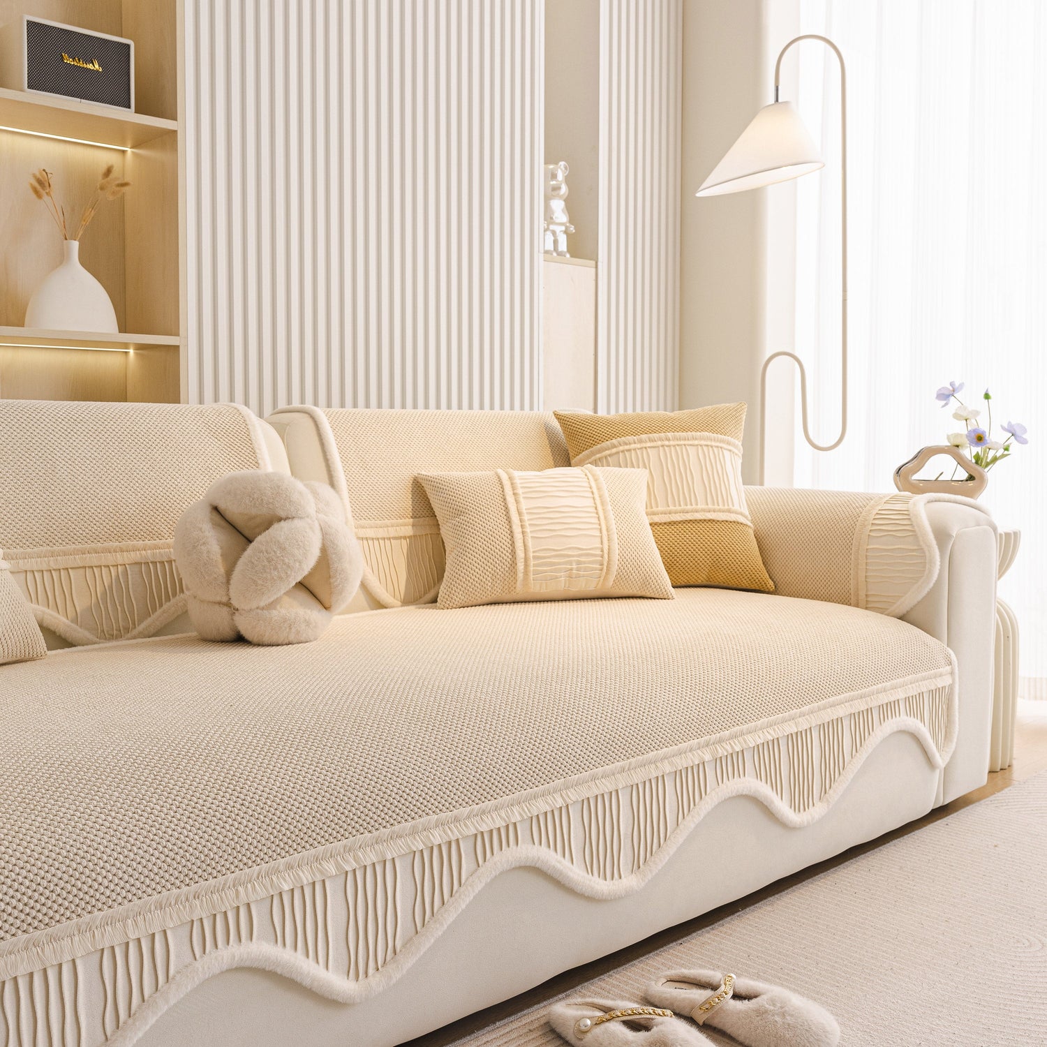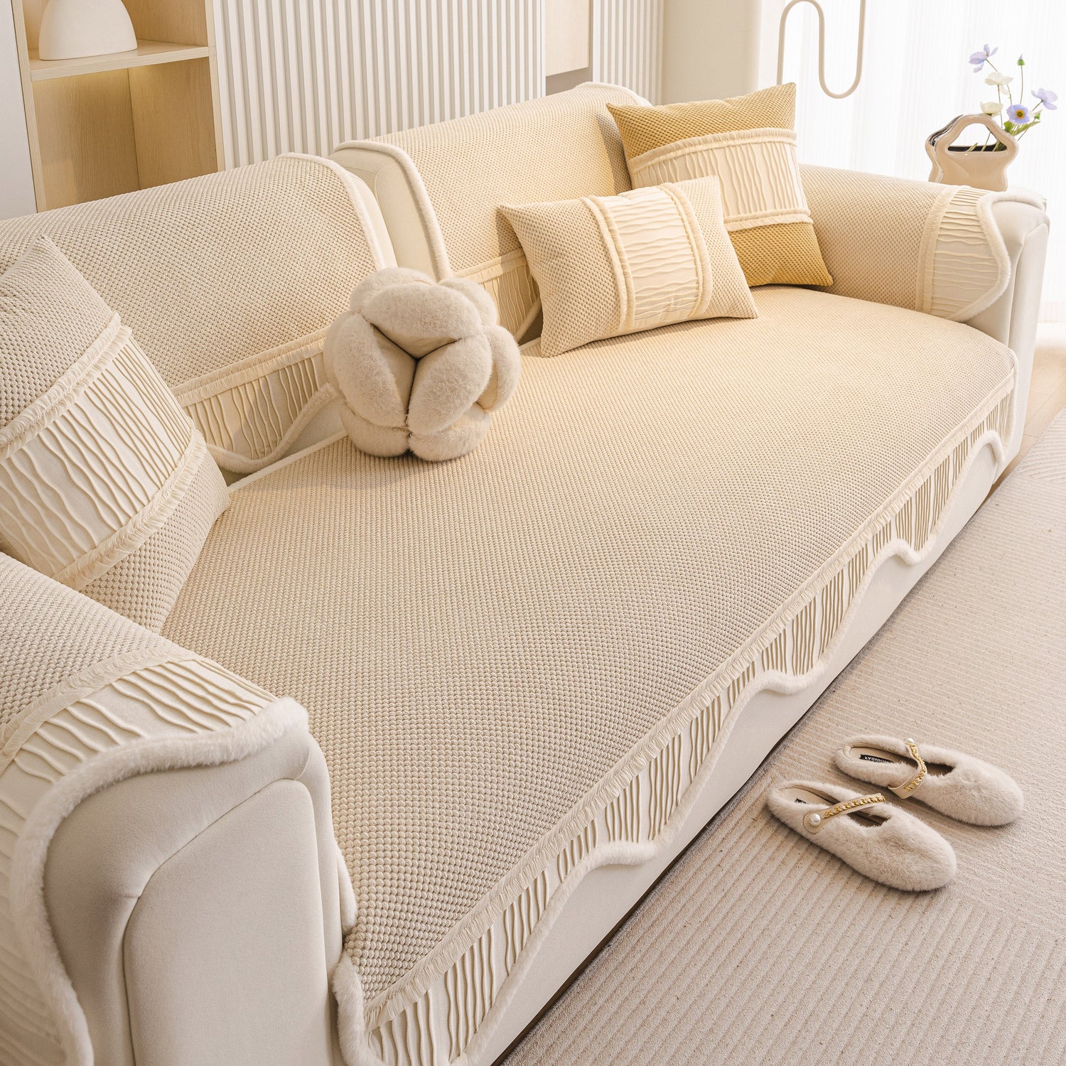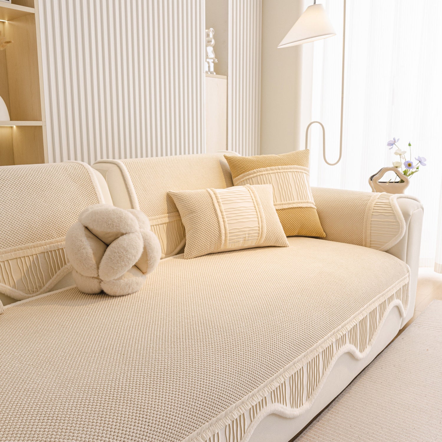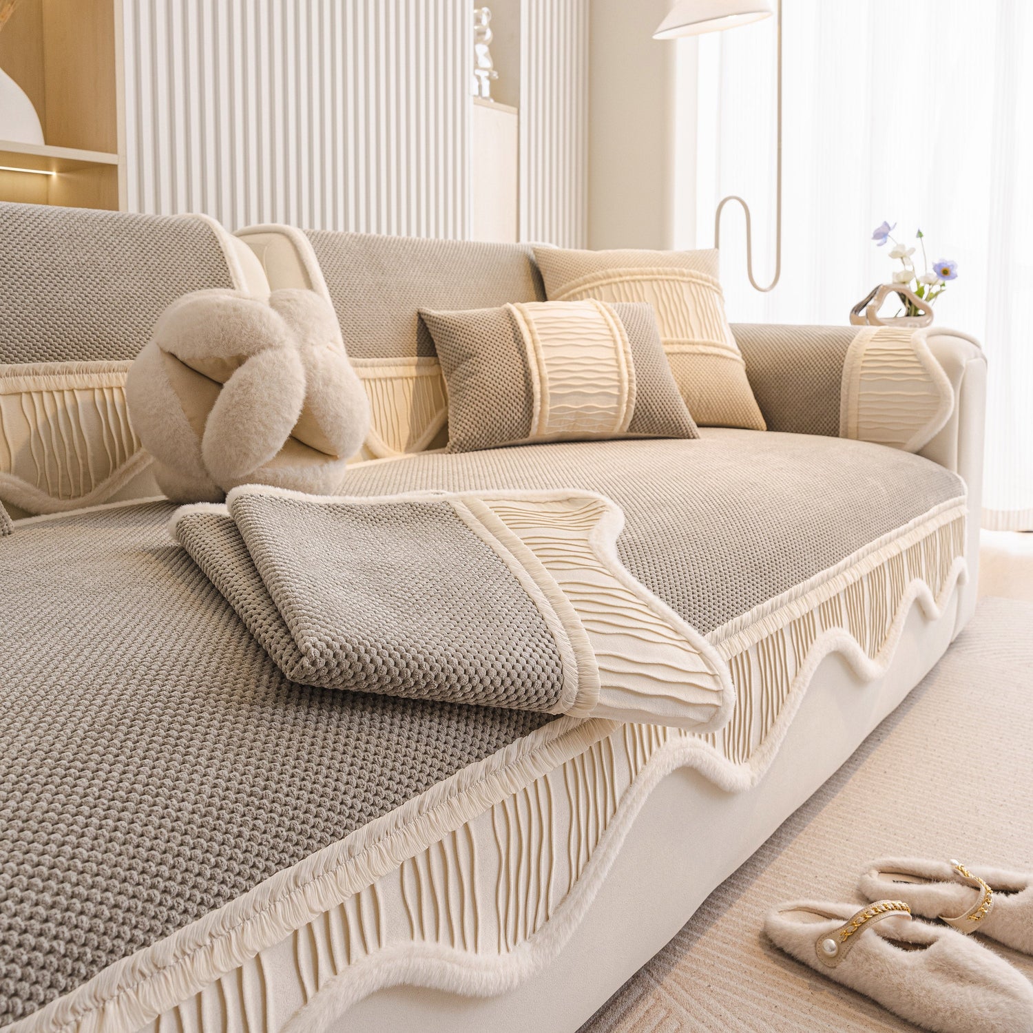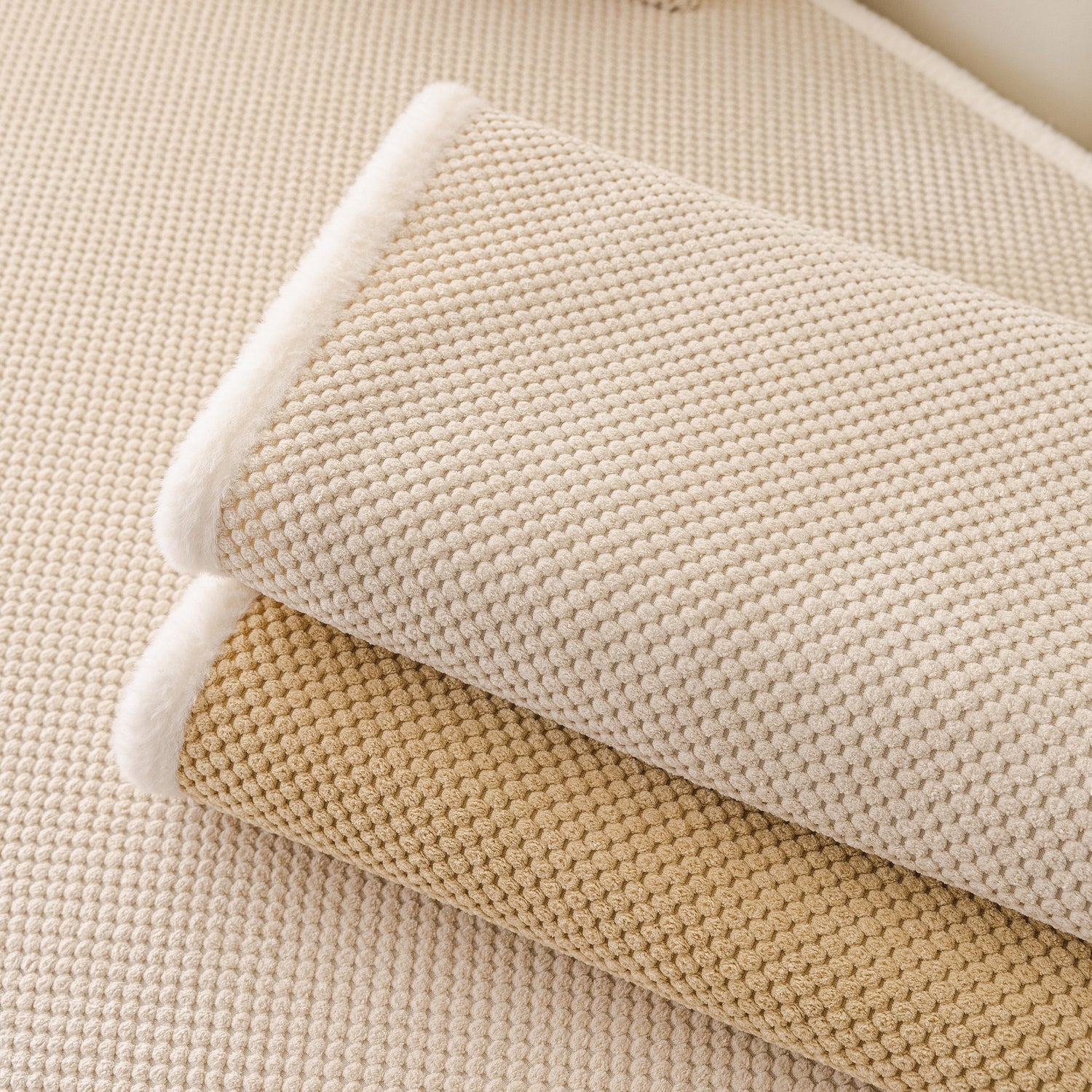 This dog washable sofa protector features a thick and soft honeycomb texture for a cozy, durable feel. Soft faux rabbit fur trims the wave-shaped, pleated edges, while non-slip silicone granules on the back keep the cover securely in place. Its split-piece design offers a tailored fit for the backrest, seat cushion, and armrests. Available in beige, gray, and khaki —each accented with crisp white faux fur edging—this cover elevates both the style and functionality of your sofa.