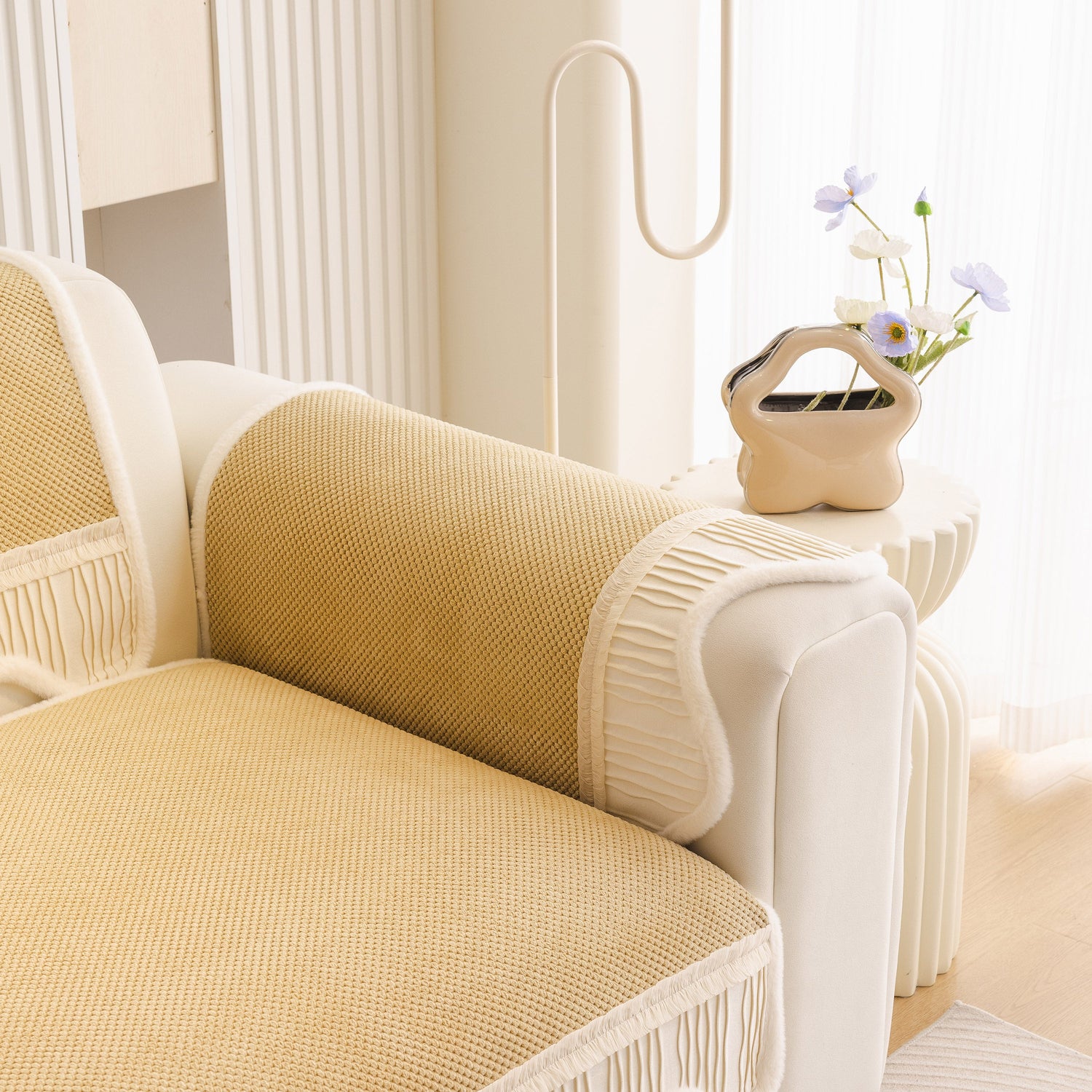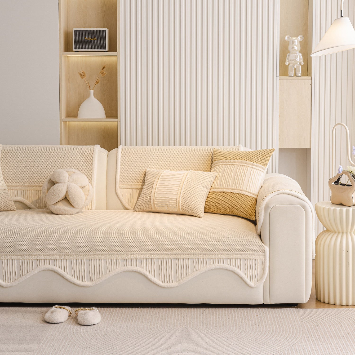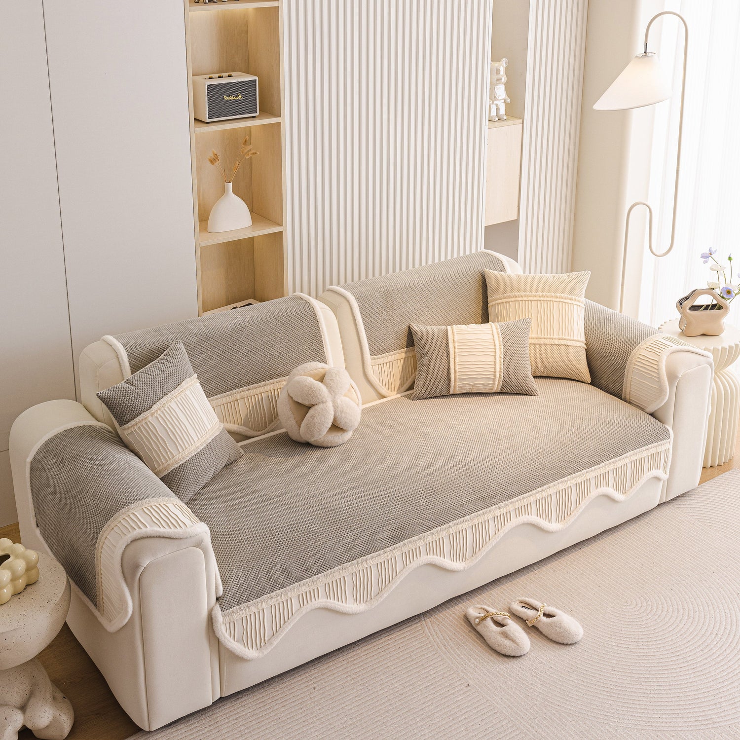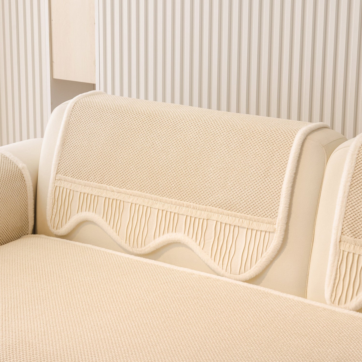 This dog washable sofa protector features a thick and soft honeycomb texture for a cozy, durable feel. Soft faux rabbit fur trims the wave-shaped, pleated edges, while non-slip silicone granules on the back keep the cover securely in place. Its split-piece design offers a tailored fit for the backrest, seat cushion, and armrests. Available in beige, gray, and khaki —each accented with crisp white faux fur edging—this cover elevates both the style and functionality of your sofa.