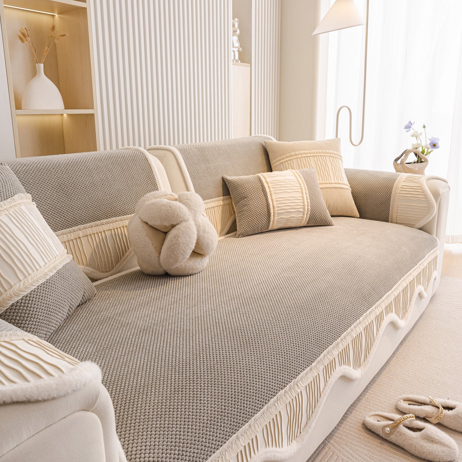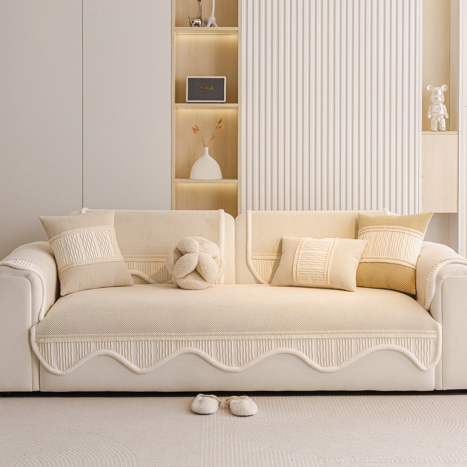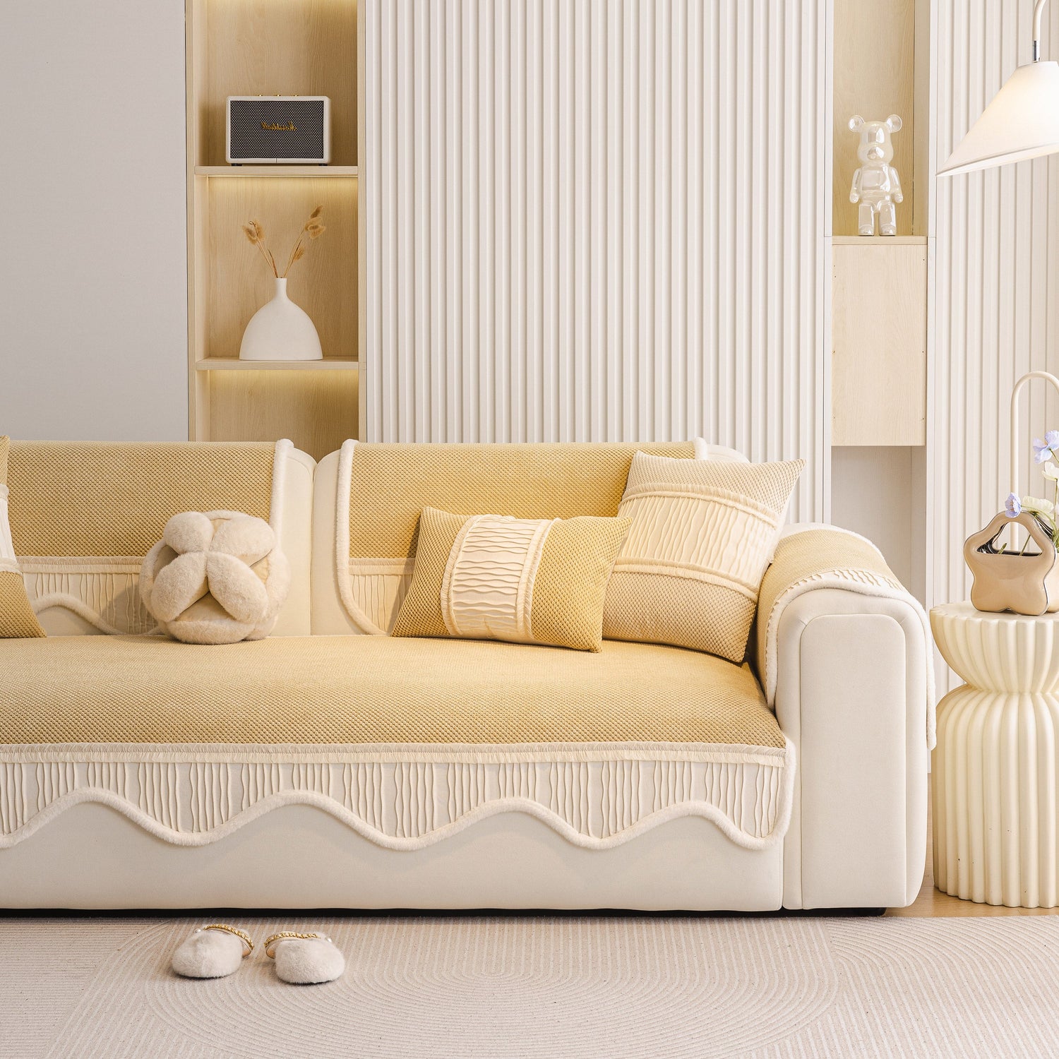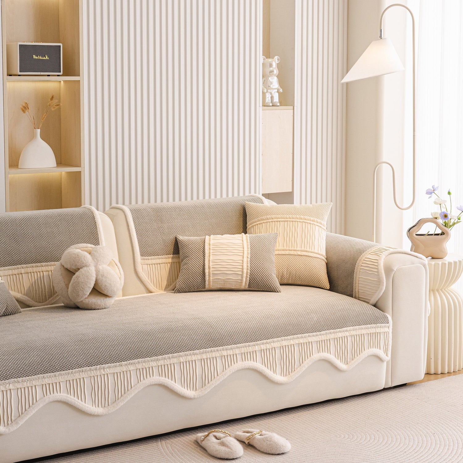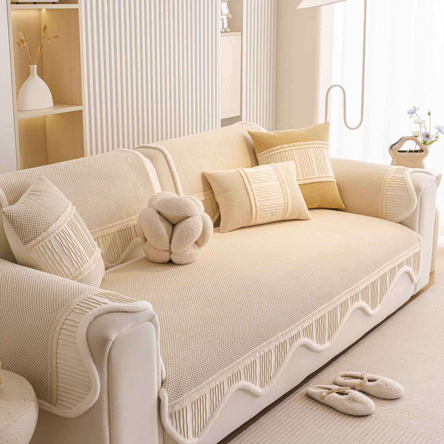 This dog washable sofa protector features a thick and soft honeycomb texture for a cozy, durable feel. Soft faux rabbit fur trims the wave-shaped, pleated edges, while non-slip silicone granules on the back keep the cover securely in place. Its split-piece design offers a tailored fit for the backrest, seat cushion, and armrests. Available in beige, gray, and khaki —each accented with crisp white faux fur edging—this cover elevates both the style and functionality of your sofa.