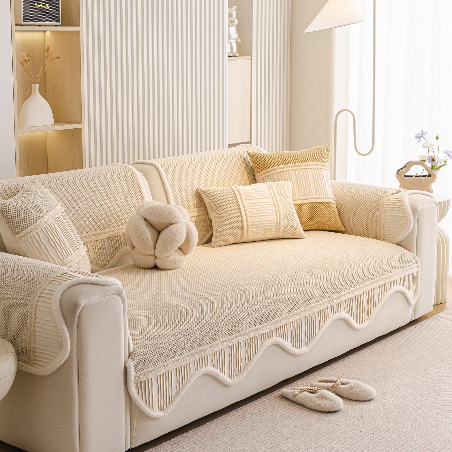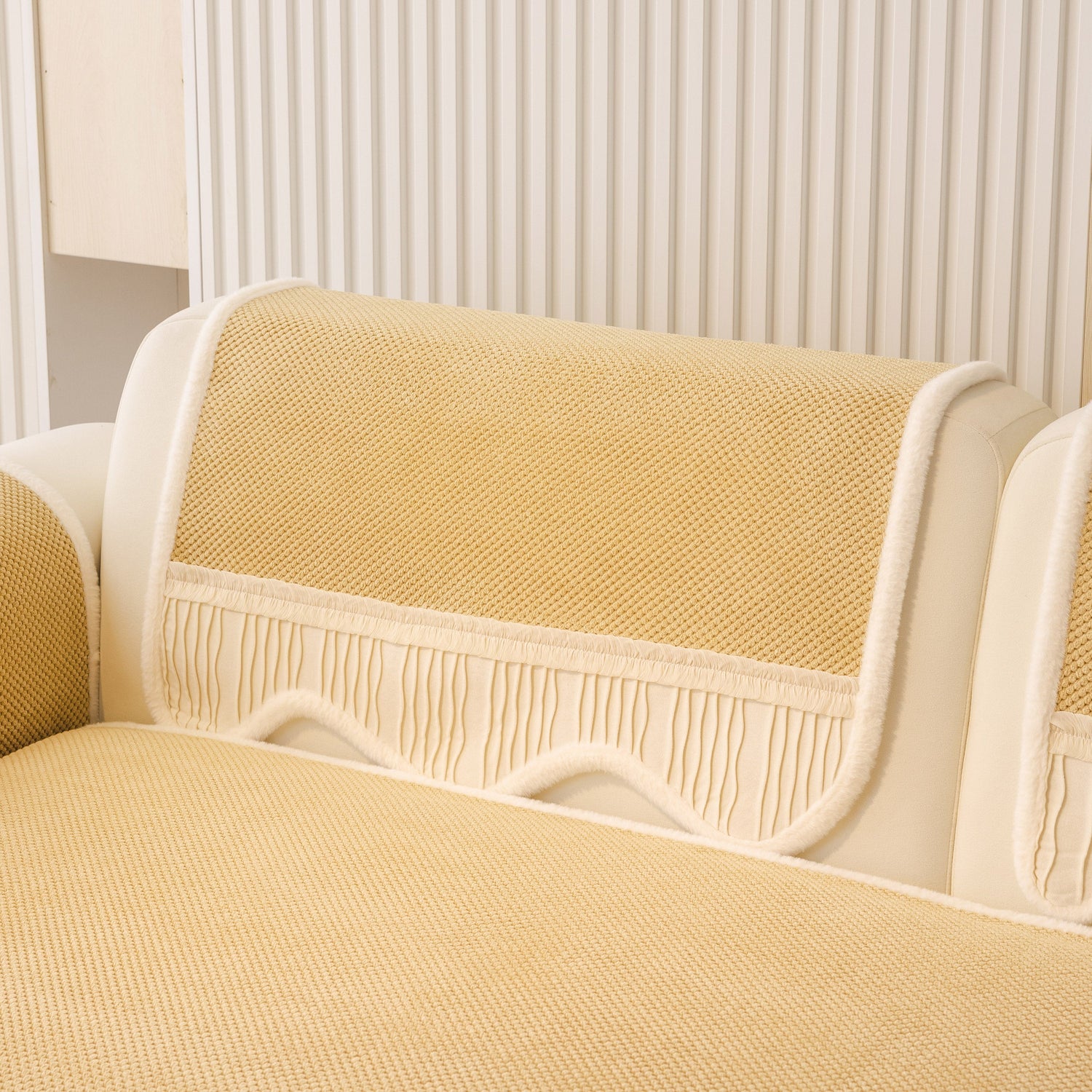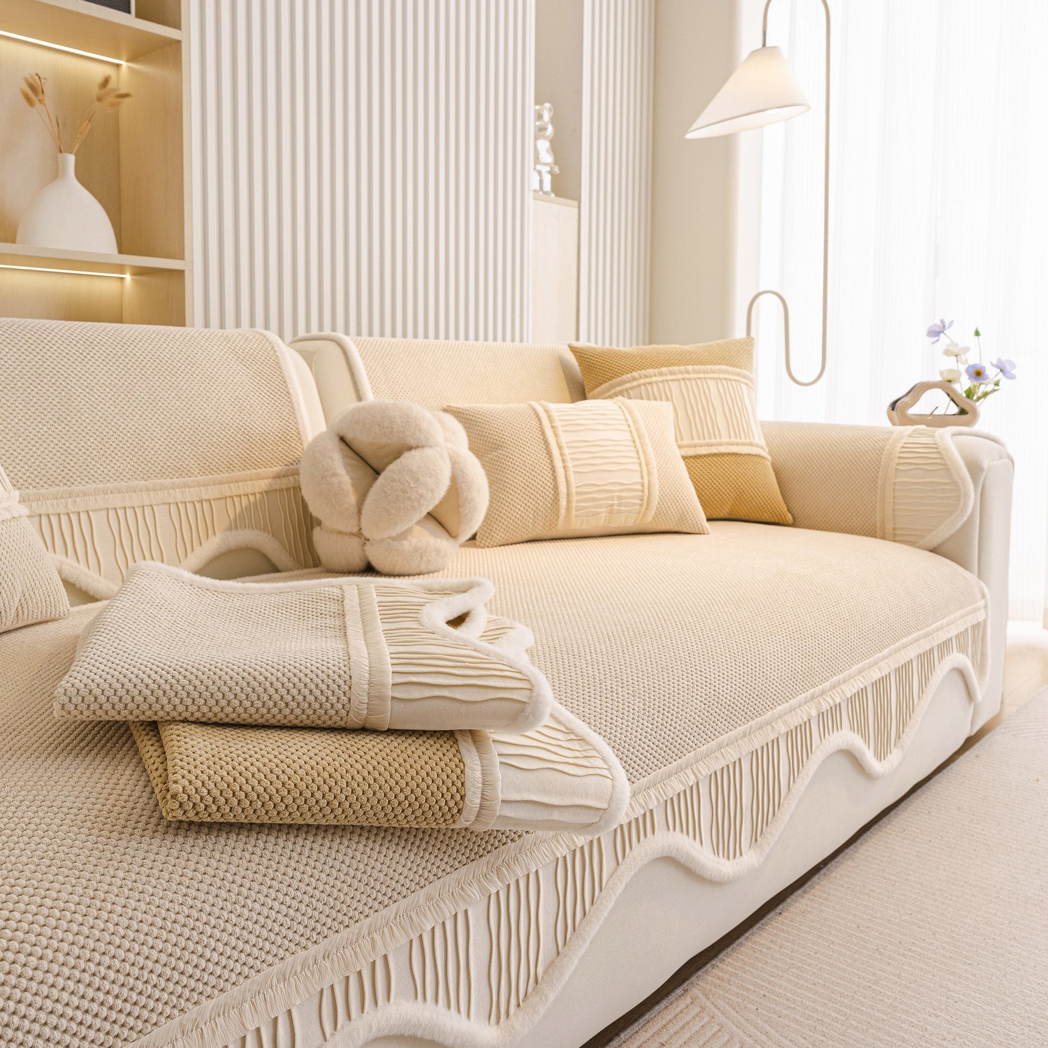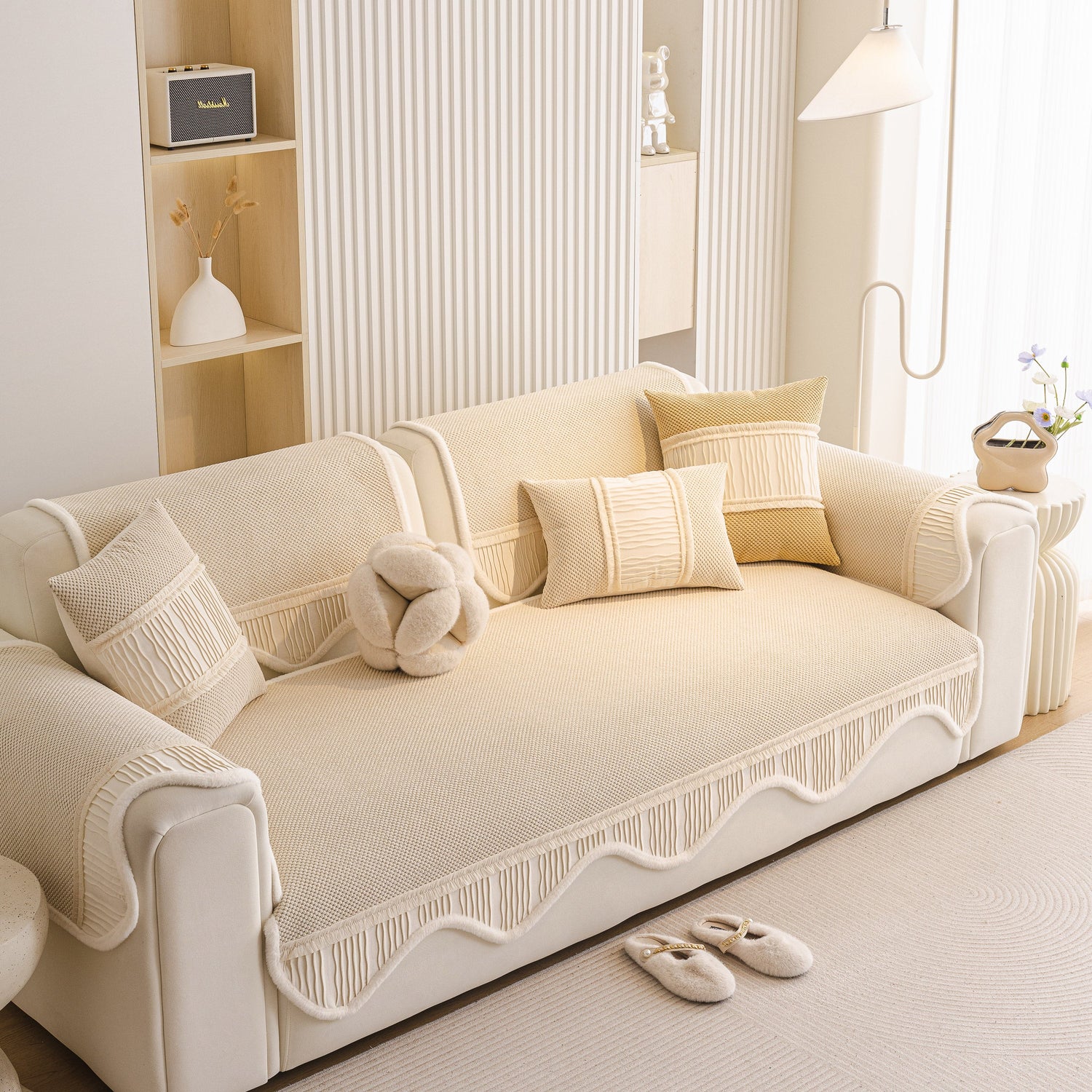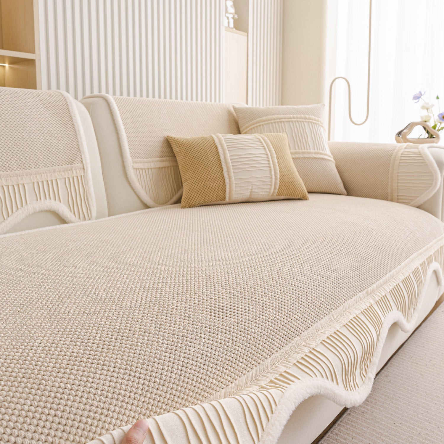This dog washable sofa protector features a thick and soft honeycomb texture for a cozy, durable feel. Soft faux rabbit fur trims the wave-shaped, pleated edges, while non-slip silicone granules on the back keep the cover securely in place. Its split-piece design offers a tailored fit for the backrest, seat cushion, and armrests. Available in beige, gray, and khaki —each accented with crisp white faux fur edging—this cover elevates both the style and functionality of your sofa.
