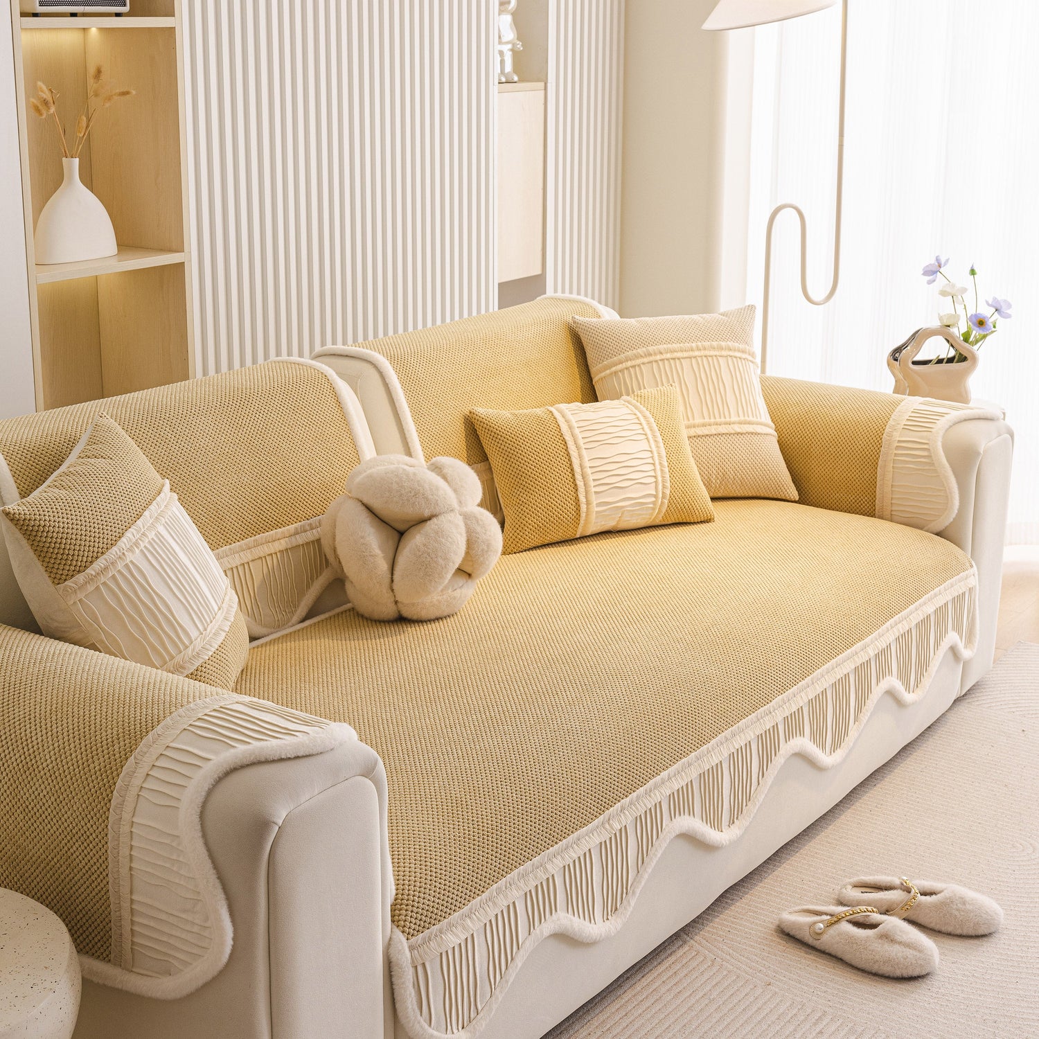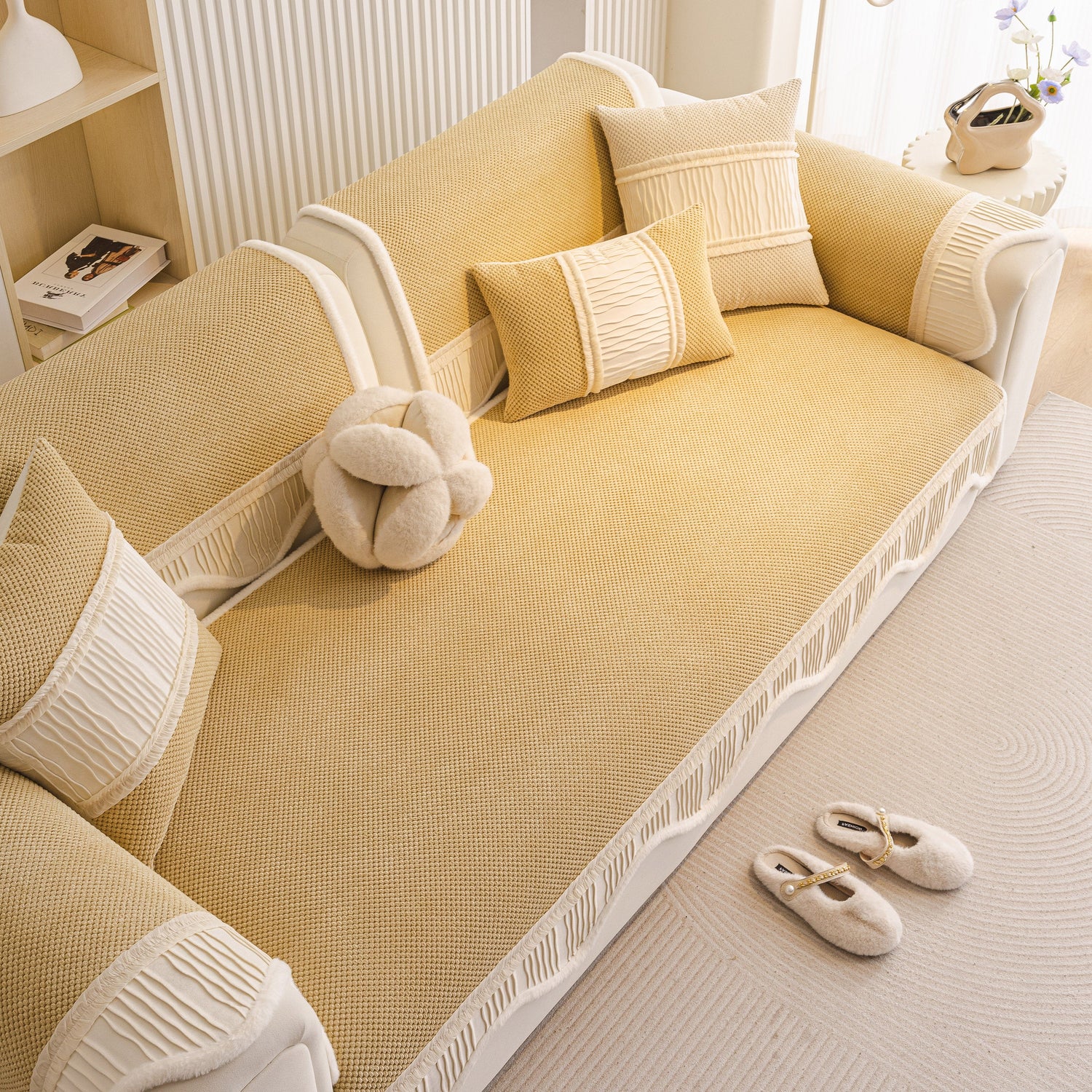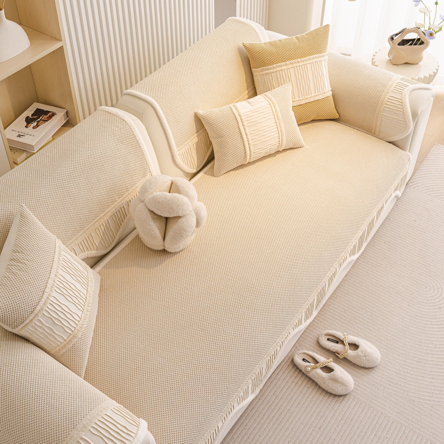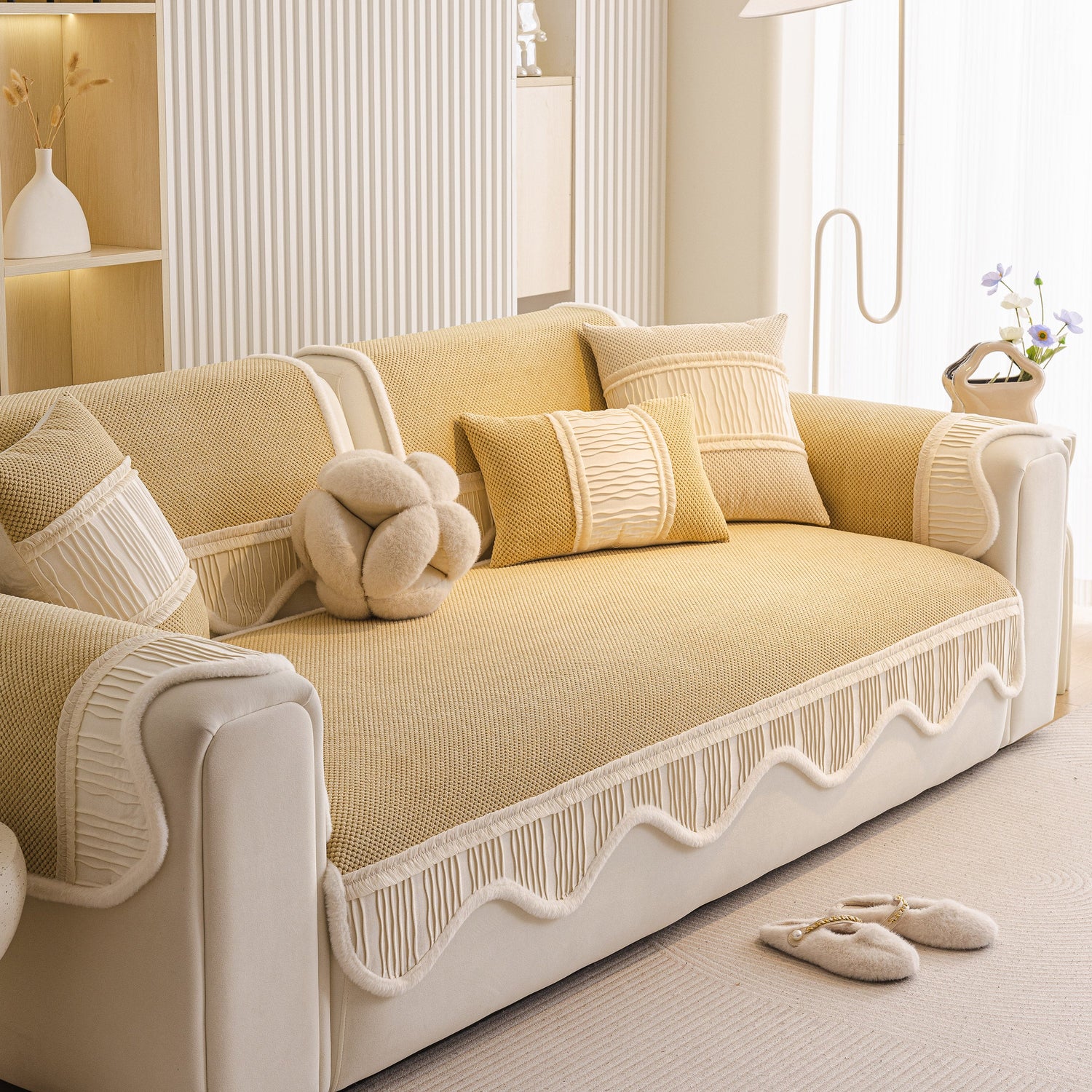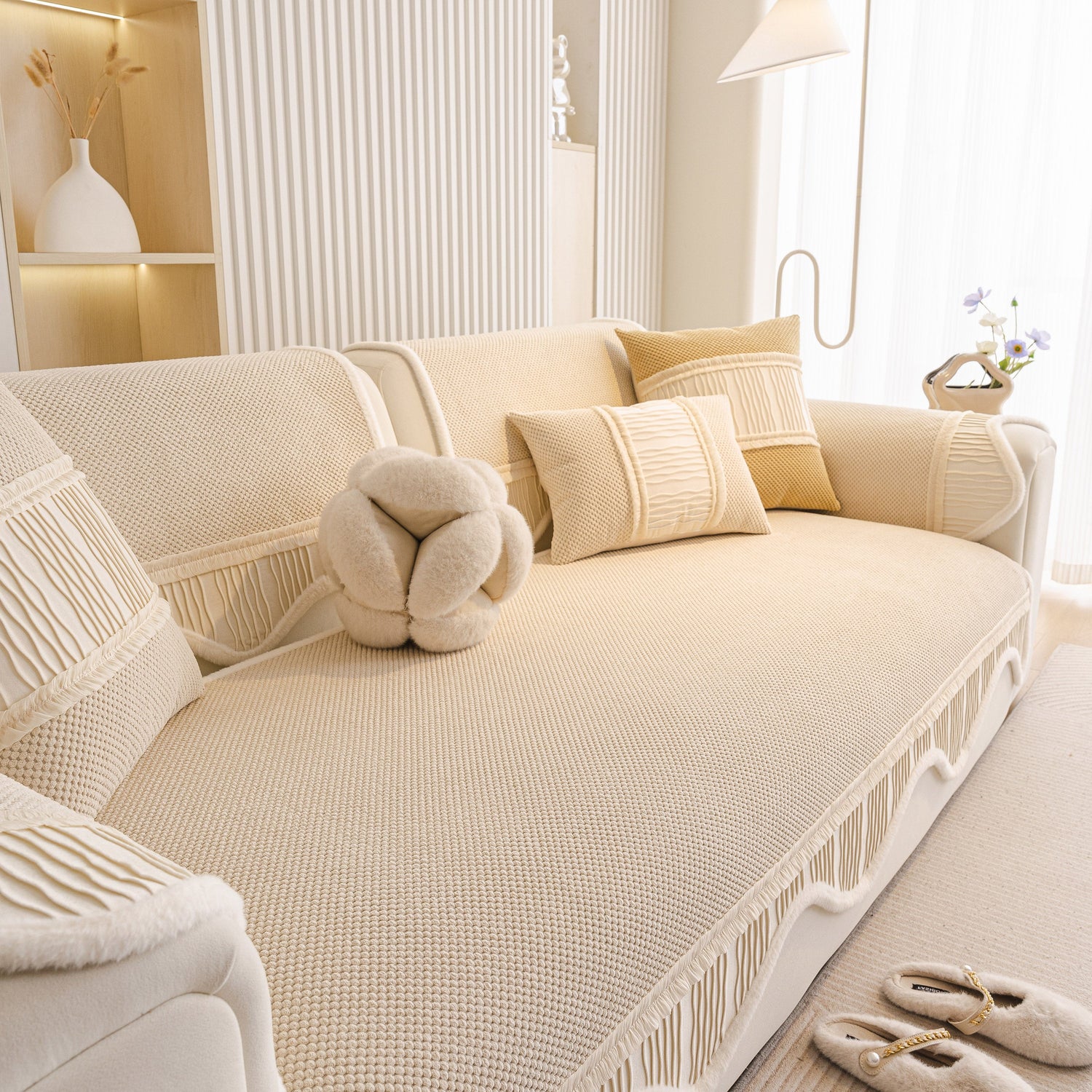 This dog washable sofa protector features a thick and soft honeycomb texture for a cozy, durable feel. Soft faux rabbit fur trims the wave-shaped, pleated edges, while non-slip silicone granules on the back keep the cover securely in place. Its split-piece design offers a tailored fit for the backrest, seat cushion, and armrests. Available in beige, gray, and khaki —each accented with crisp white faux fur edging—this cover elevates both the style and functionality of your sofa.