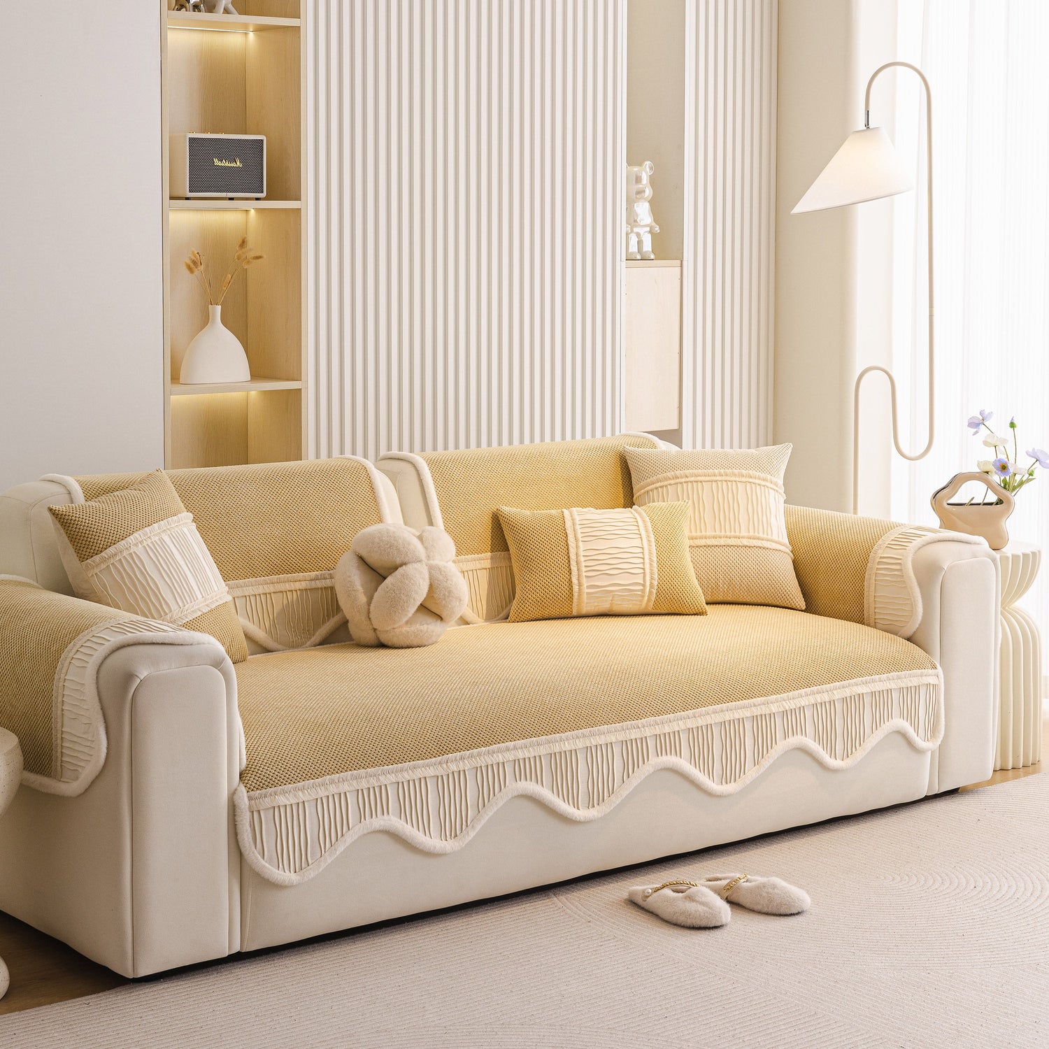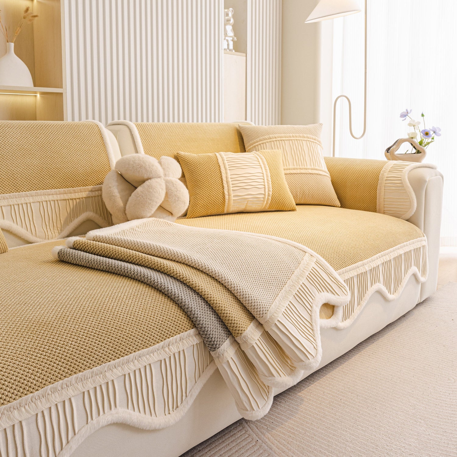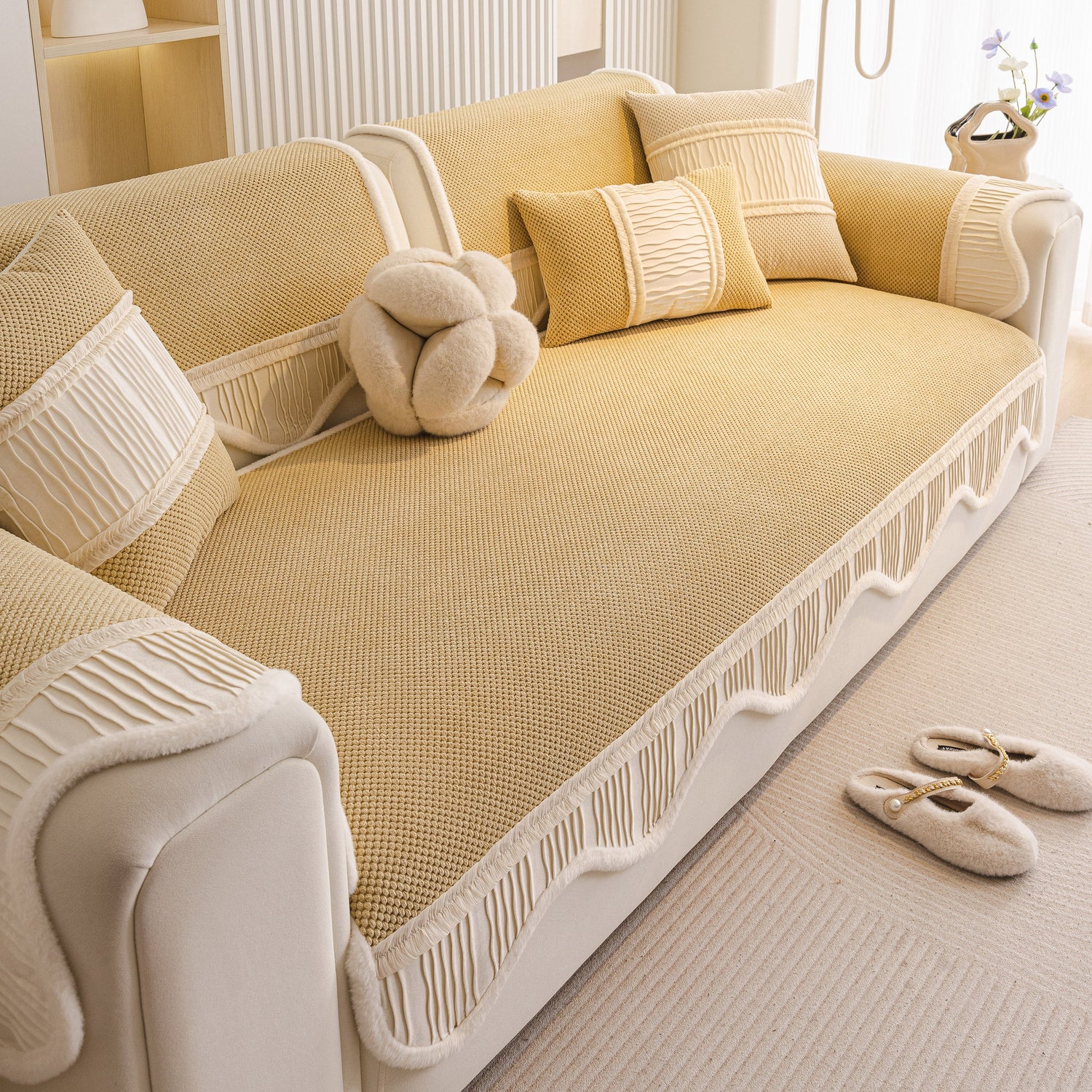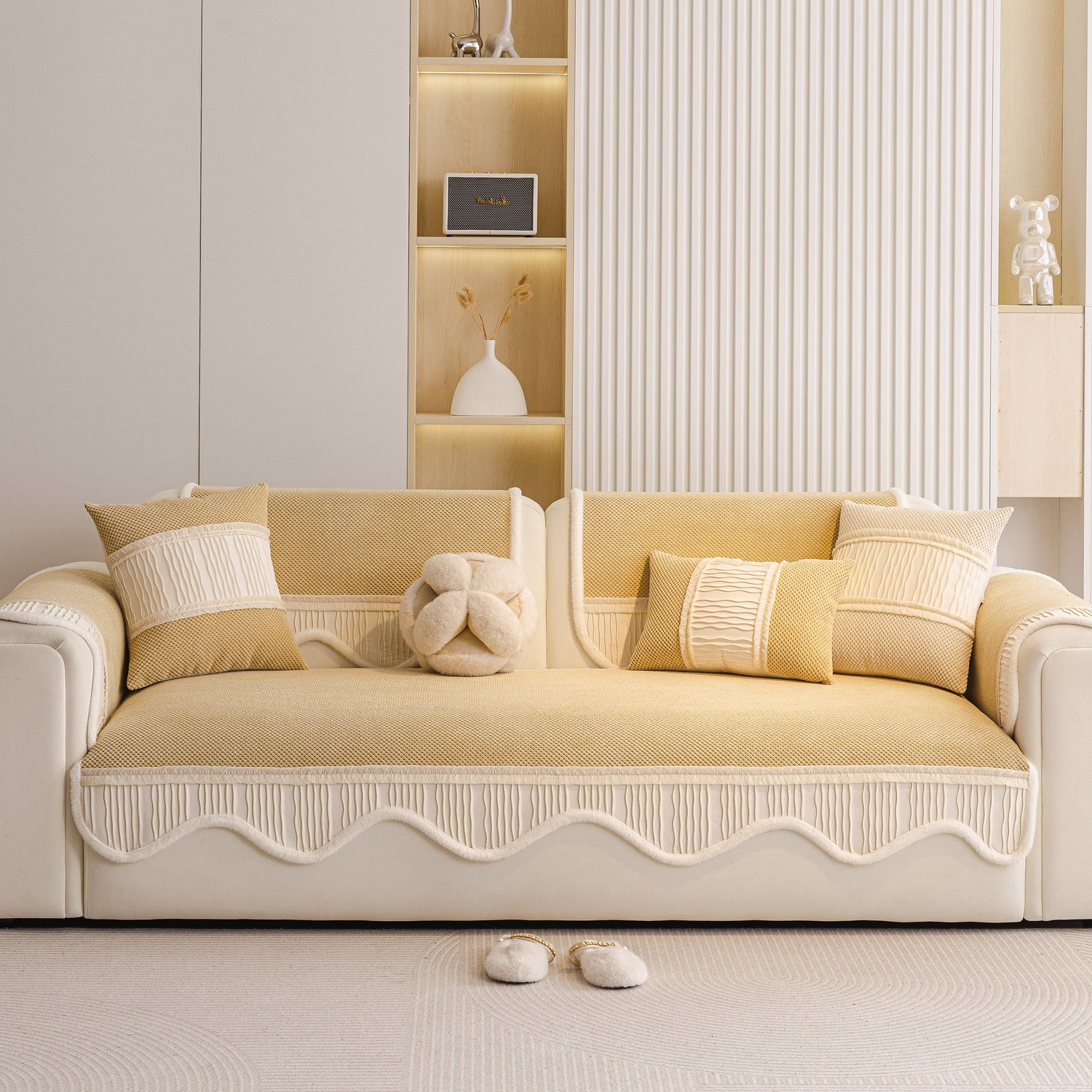 This dog washable sofa protector features a thick and soft honeycomb texture for a cozy, durable feel. Soft faux rabbit fur trims the wave-shaped, pleated edges, while non-slip silicone granules on the back keep the cover securely in place. Its split-piece design offers a tailored fit for the backrest, seat cushion, and armrests. Available in beige, gray, and khaki —each accented with crisp white faux fur edging—this cover elevates both the style and functionality of your sofa.