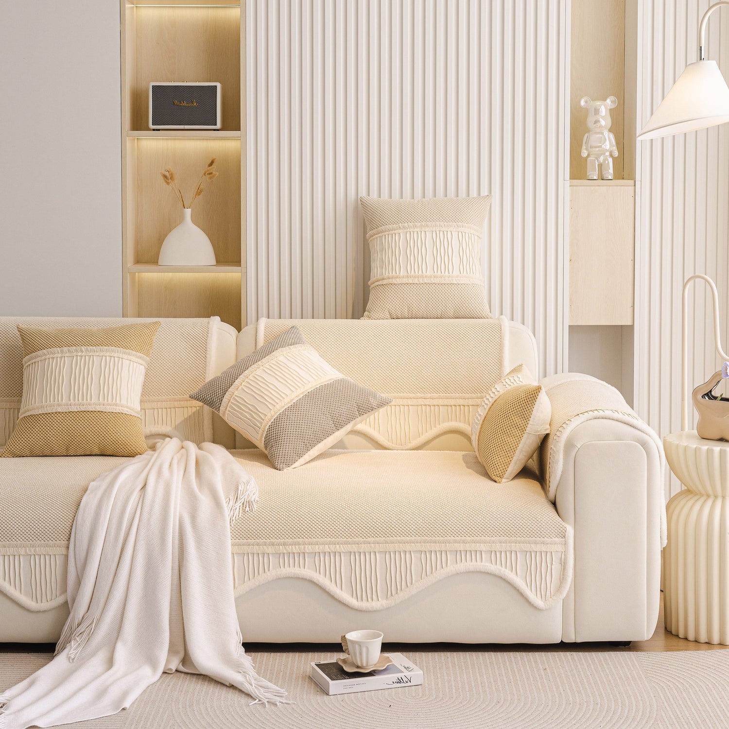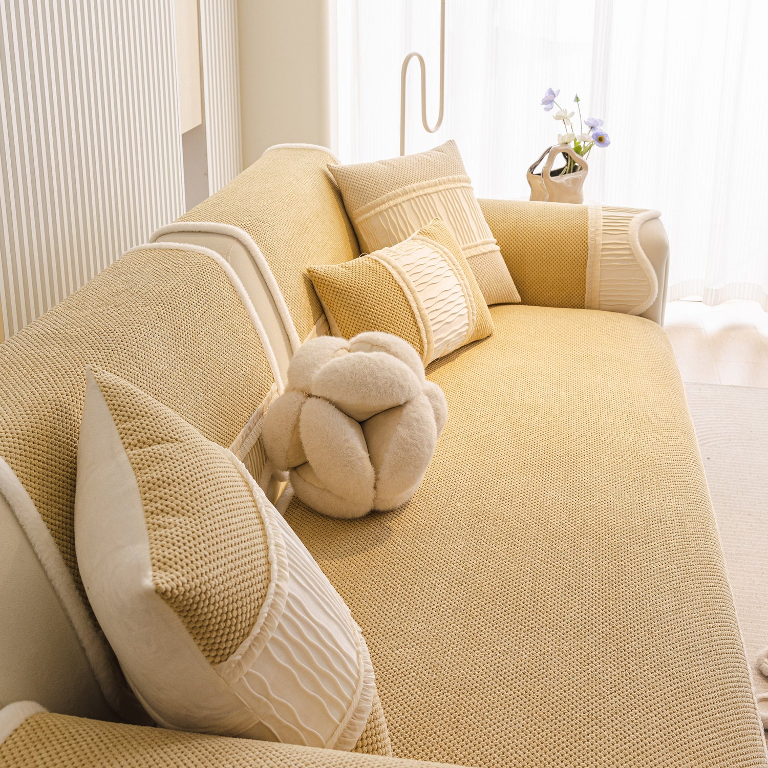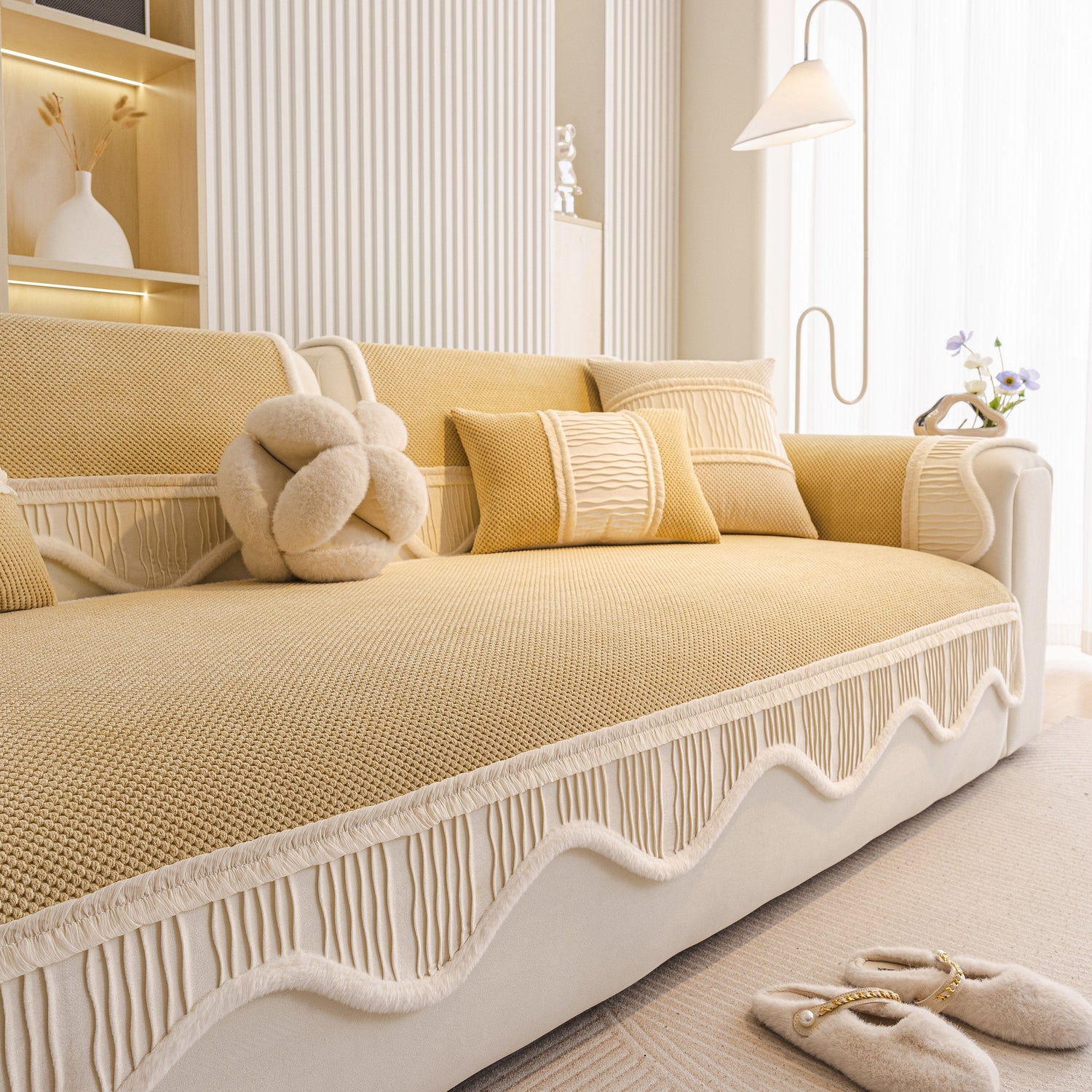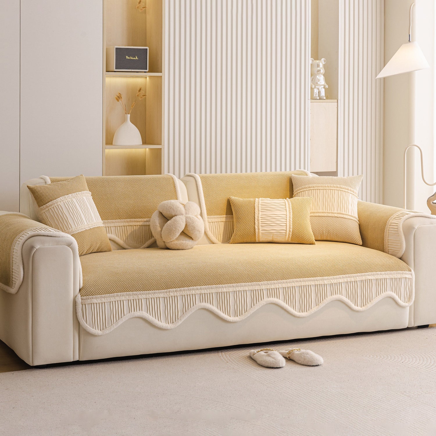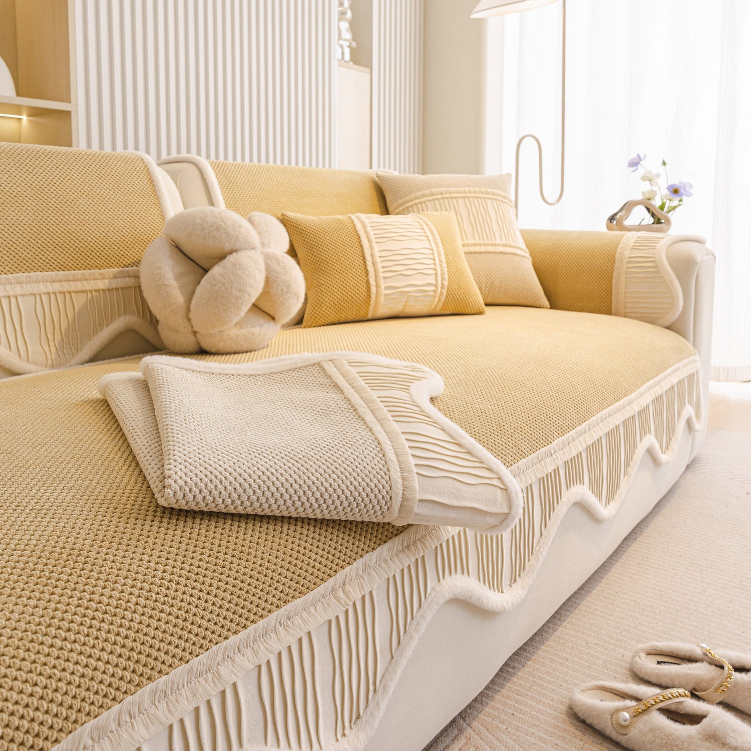 This dog washable sofa protector features a thick and soft honeycomb texture for a cozy, durable feel. Soft faux rabbit fur trims the wave-shaped, pleated edges, while non-slip silicone granules on the back keep the cover securely in place. Its split-piece design offers a tailored fit for the backrest, seat cushion, and armrests. Available in beige, gray, and khaki —each accented with crisp white faux fur edging—this cover elevates both the style and functionality of your sofa.