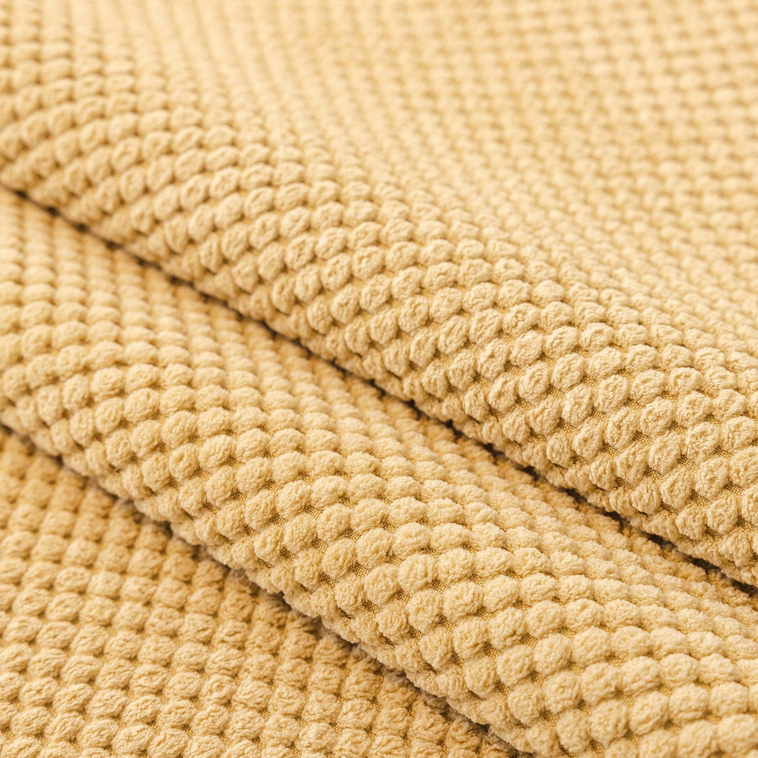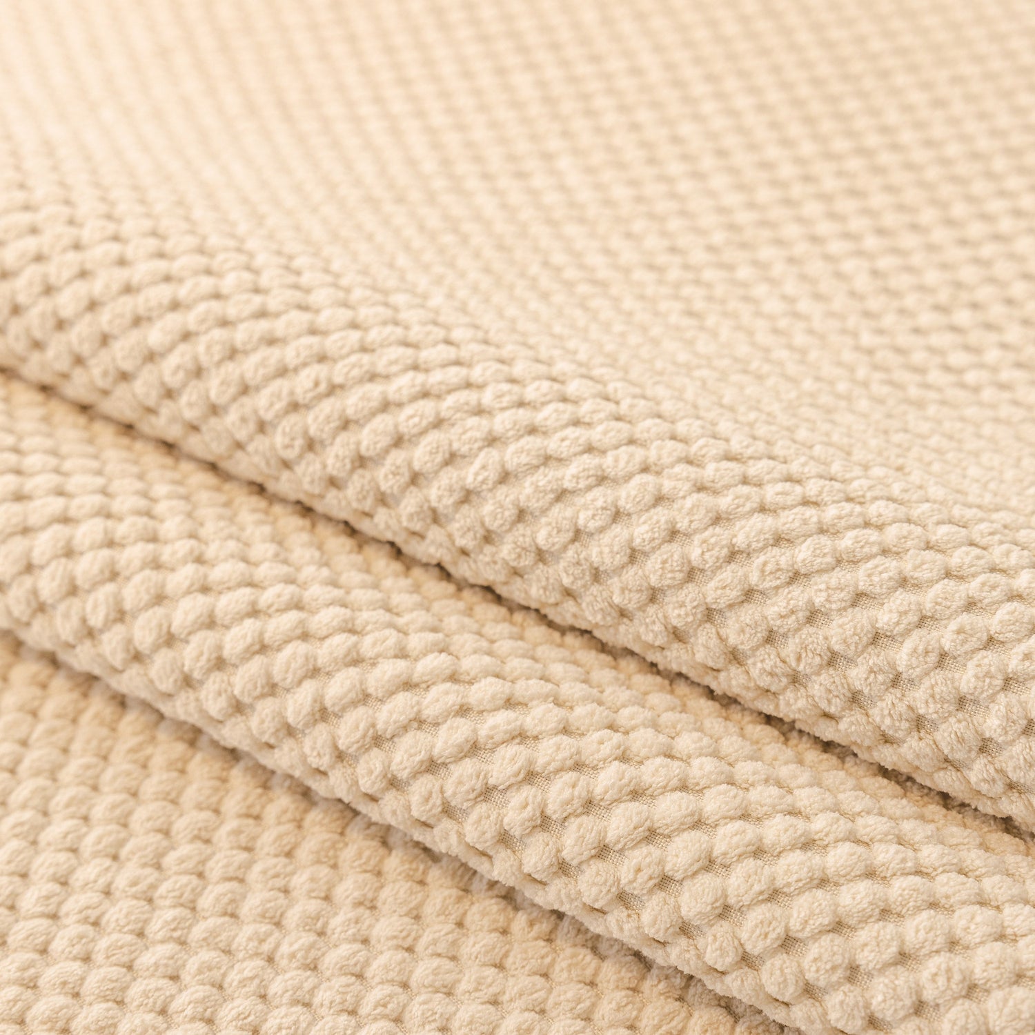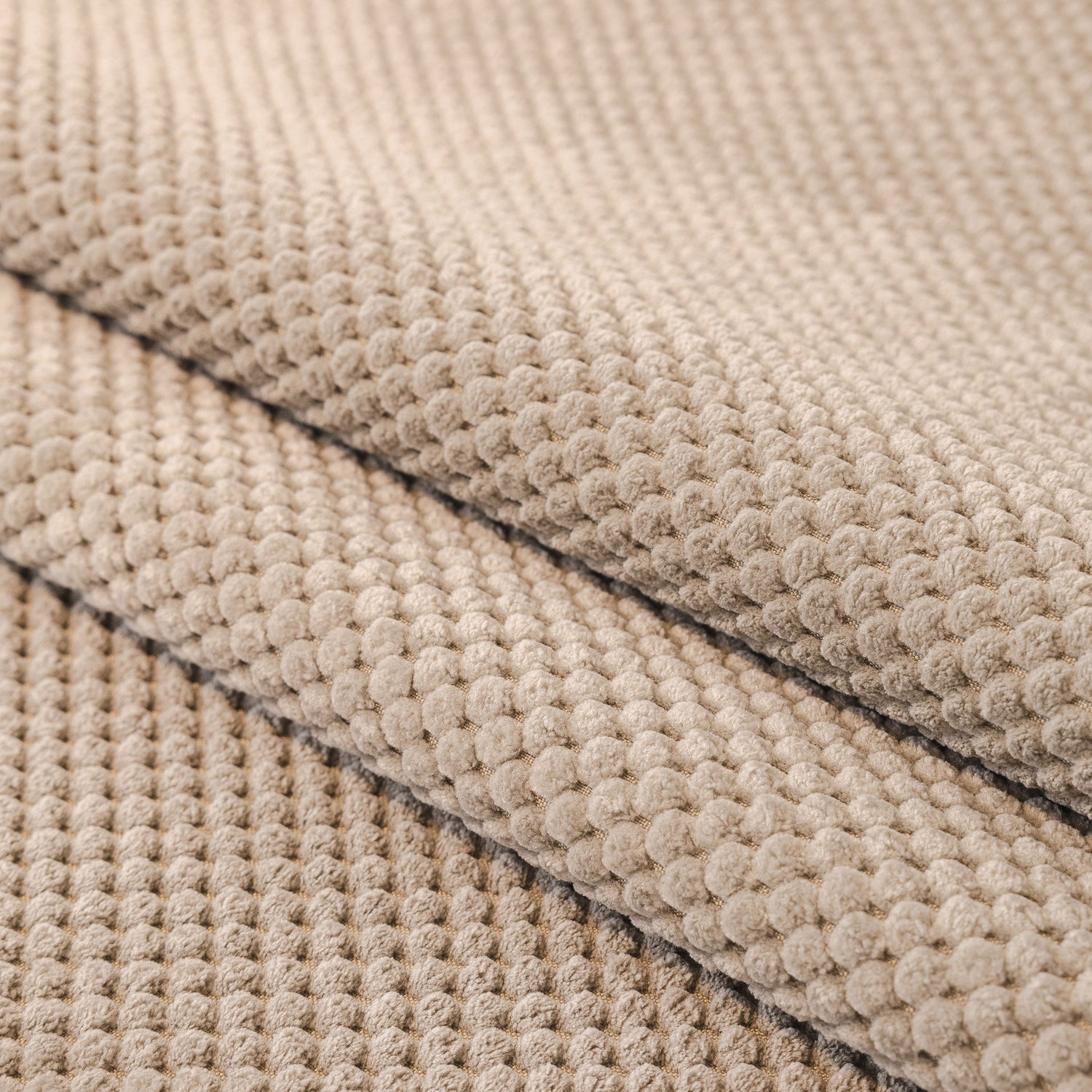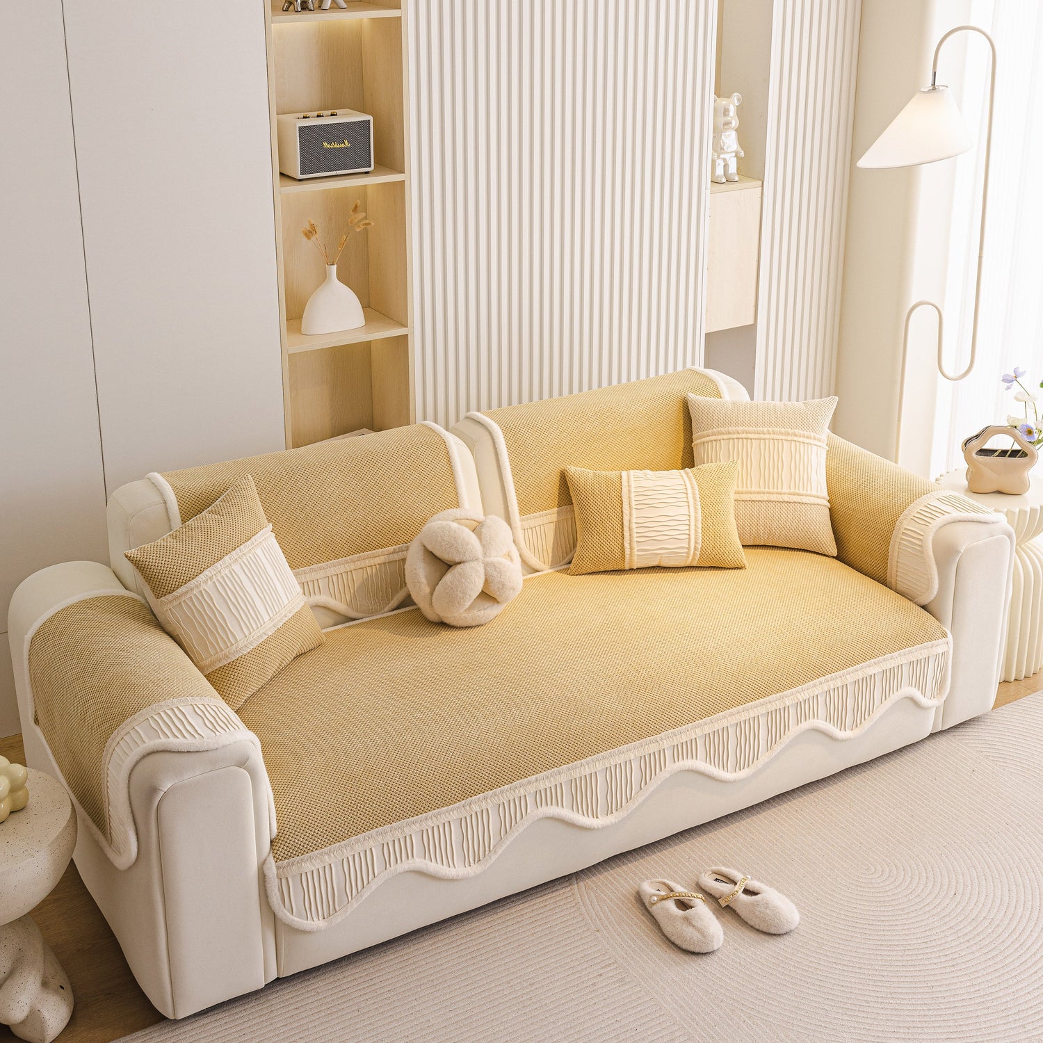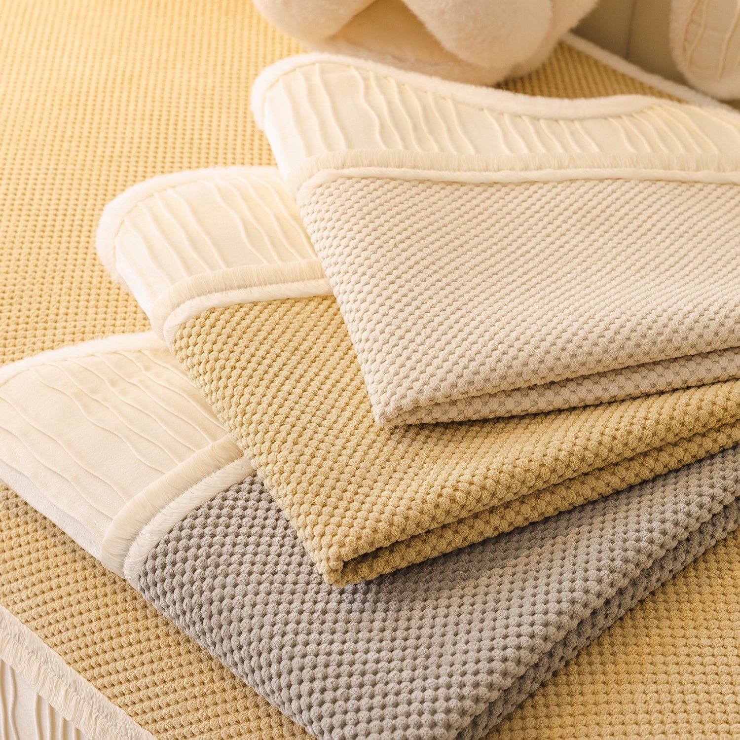This dog washable sofa protector features a thick and soft honeycomb texture for a cozy, durable feel. Soft faux rabbit fur trims the wave-shaped, pleated edges, while non-slip silicone granules on the back keep the cover securely in place. Its split-piece design offers a tailored fit for the backrest, seat cushion, and armrests. Available in beige, gray, and khaki —each accented with crisp white faux fur edging—this cover elevates both the style and functionality of your sofa.