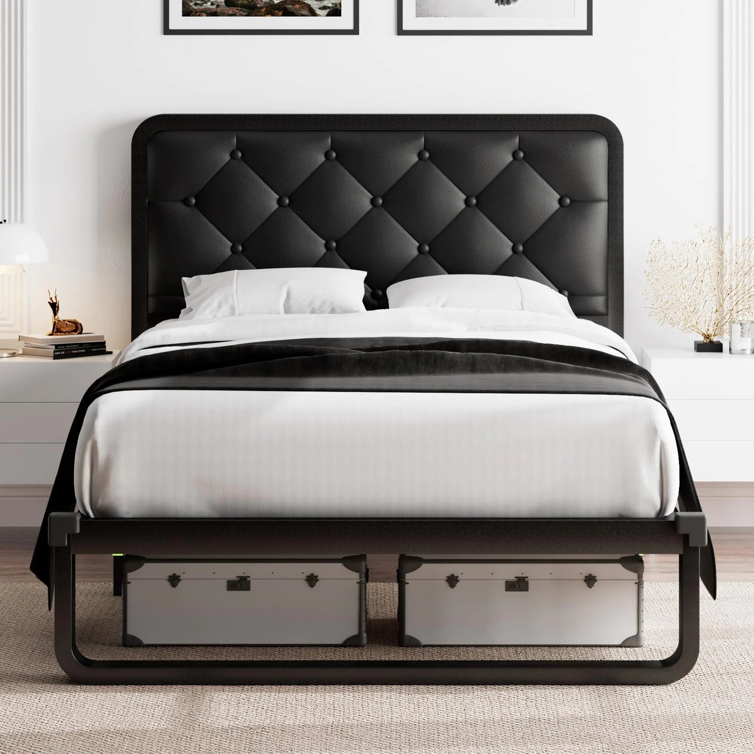 [Secure Edges: Each corner of the twin bed is blunted to effectively reduce collision injuries caused by bumping into bed frame corners especially when bedroom space is limited or waking up at night.Creating safer sleeping conditions Solid As Rock: Maximizing contact with the floor helps to relieve pressure on single support points reducing the risk of bed frame warping or damage. Evenly distributed slats provide a solid sleeping platform without shaking Minimalist Aesthetics: A combination of lacquered metal frame and classic faux leather diamond tufted headboard can be paired with any furniture decor style for a personalized look. Soft touch provides comfort and support when lying in bed 12" Perfect Under-bed Room: Sufficient room for storage and daily clearance. Even small apartments can always be kept spacious and tidy. A boon for limited spaces and friendly height suits all age No Noise & Easy Assembly: EVA strips isolate perfectly all noise. Slats one-click buckles install only takes 20 minutes to finish assembling (NOTE: MATTRESS NOT INCLUDED)]