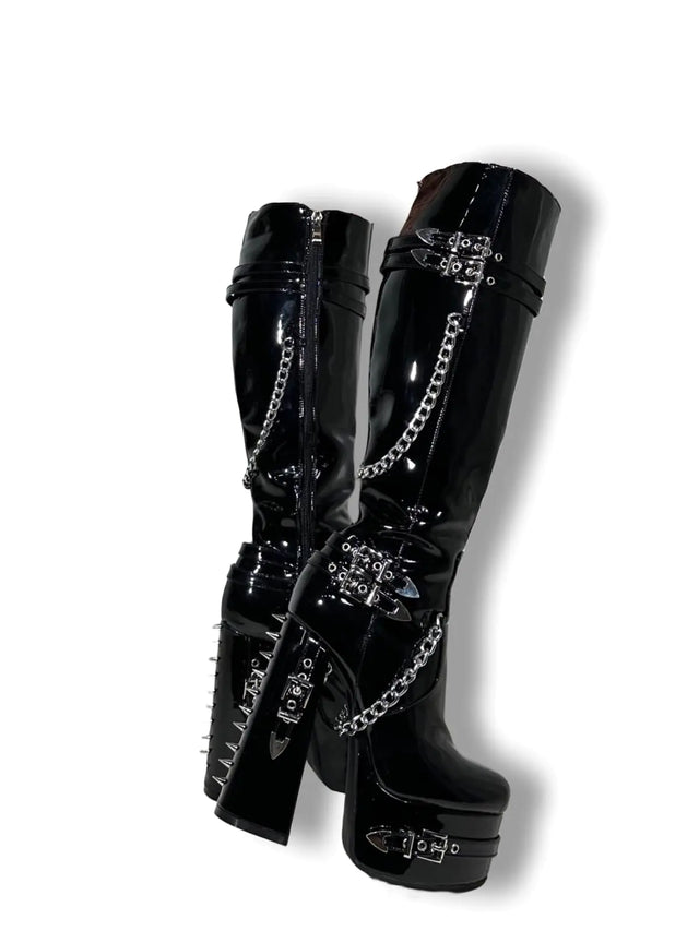 Frankie Hsu Goth Sexy Chunky Platform Knee High Heeled Boots Black Patent Silver Chain Rivets Gothic Punk Y2K Hot Girl Big Large Size Wide Calf Long Shoes For Women Men