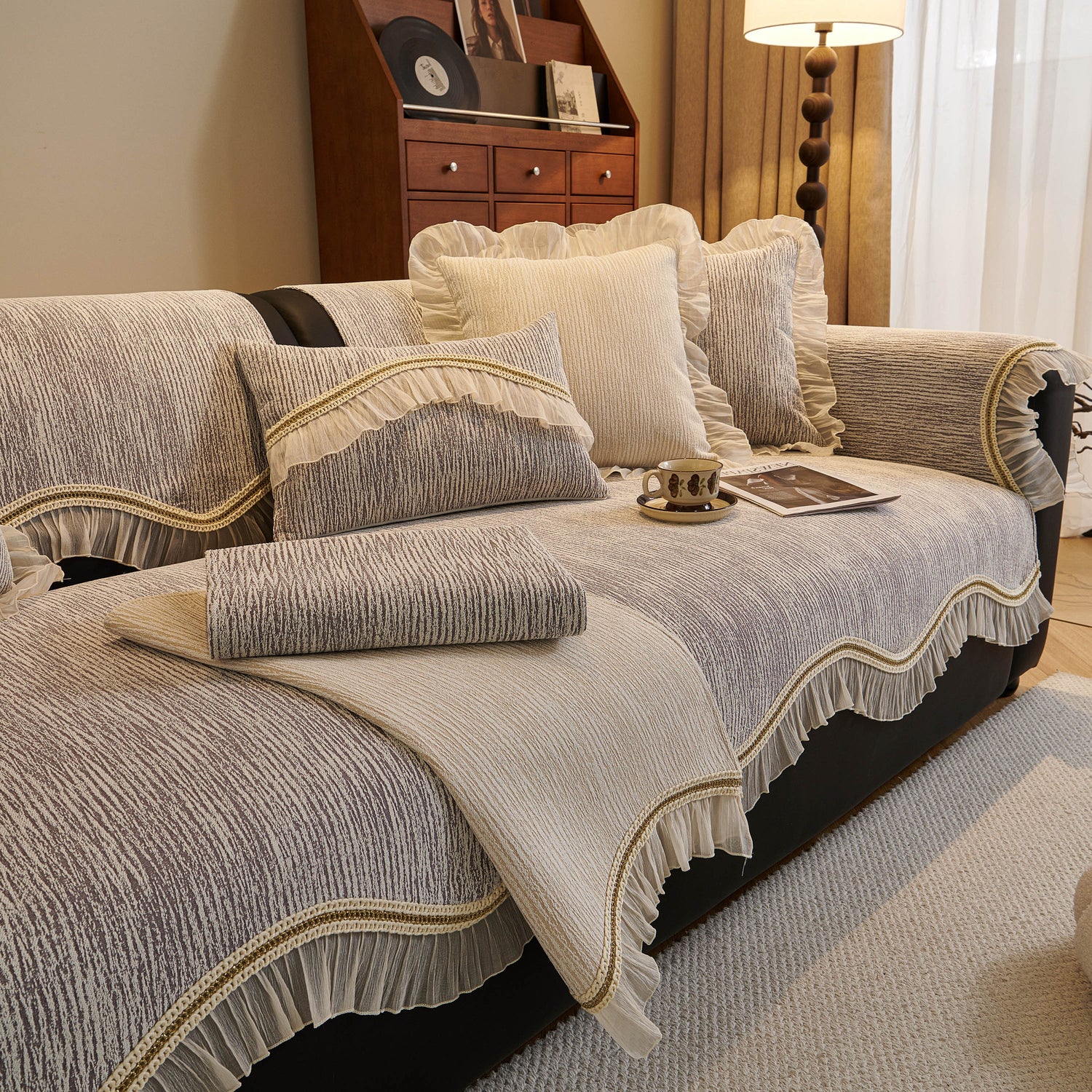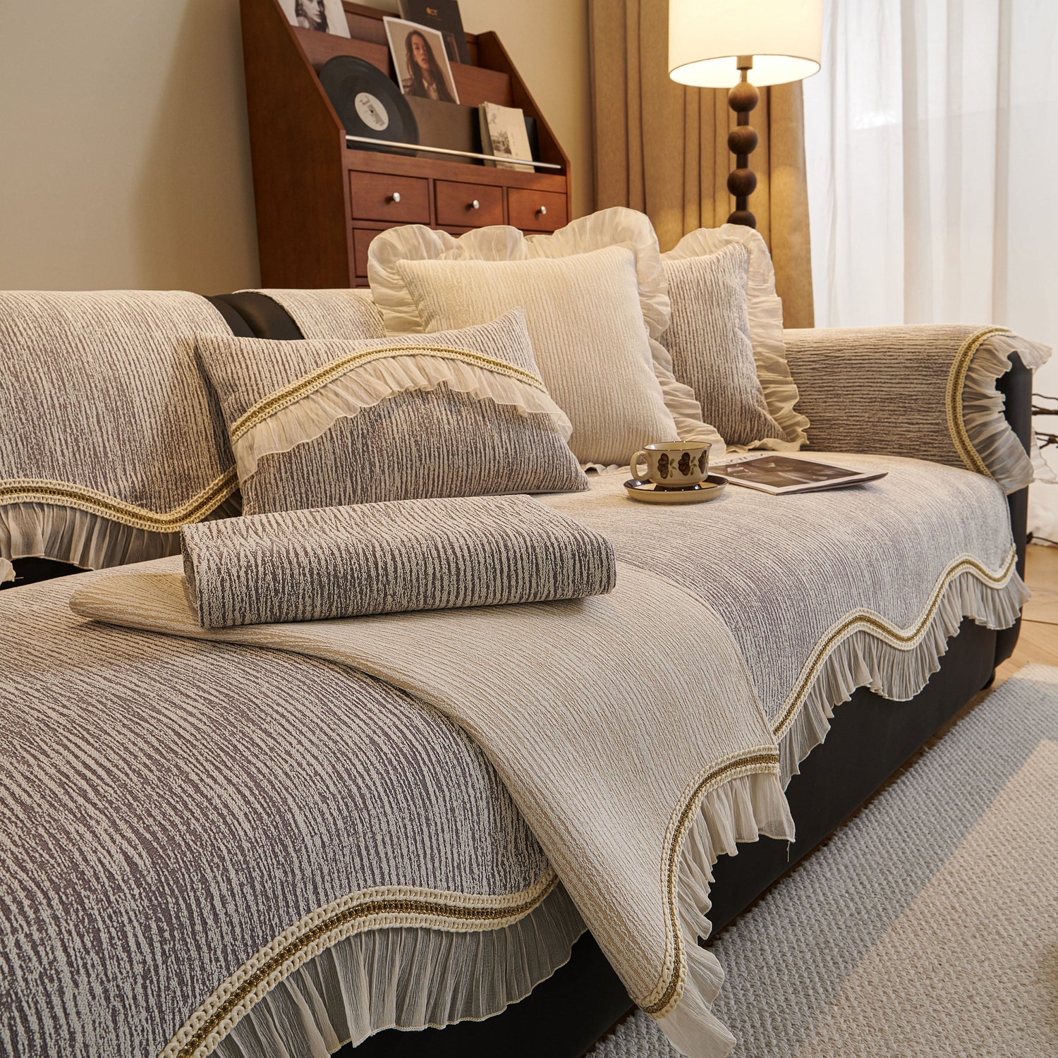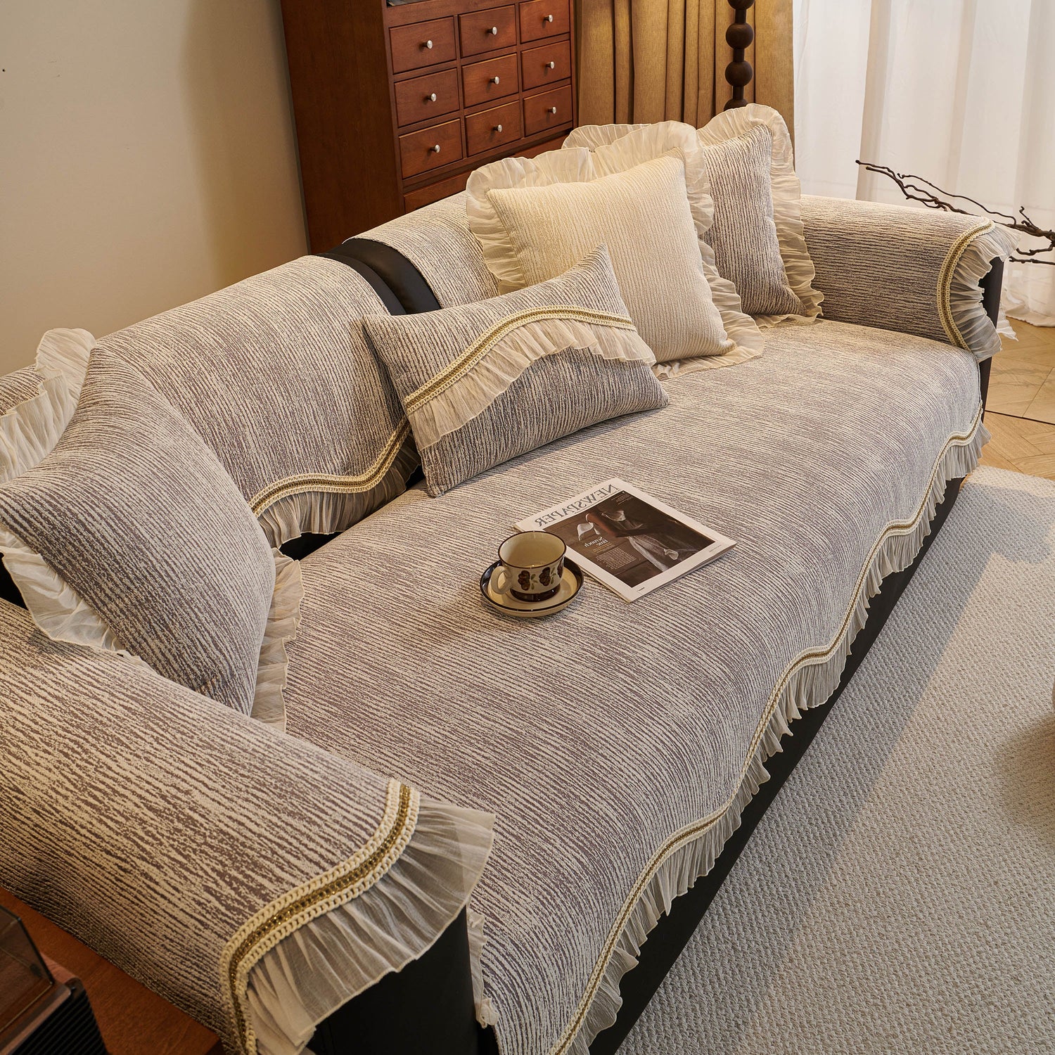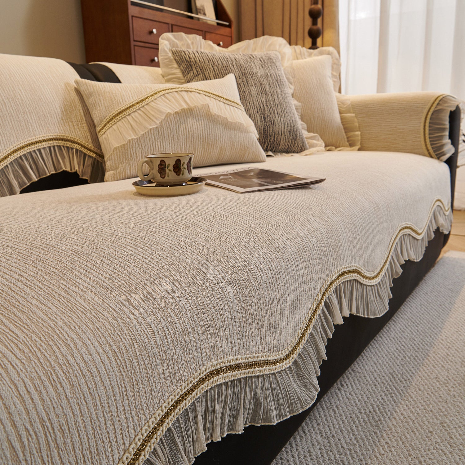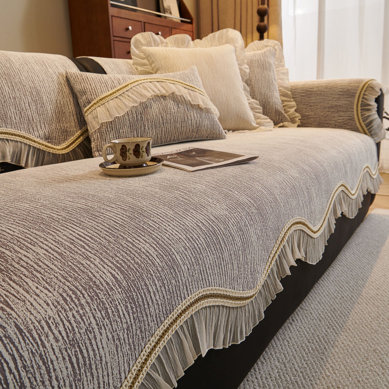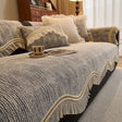 This chenille sofa cover combines comfort, elegance, and functionality for year-round use. The surface features soft, thick chenille fabric with a naturally flowing linear texture that feels smooth to the touch while offering breathable comfort. Its refined design includes subtle gradient stripes paired with decorative gold embroidery trim and pleated ruffle edges, adding a romantic, palace-inspired charm to any living room.