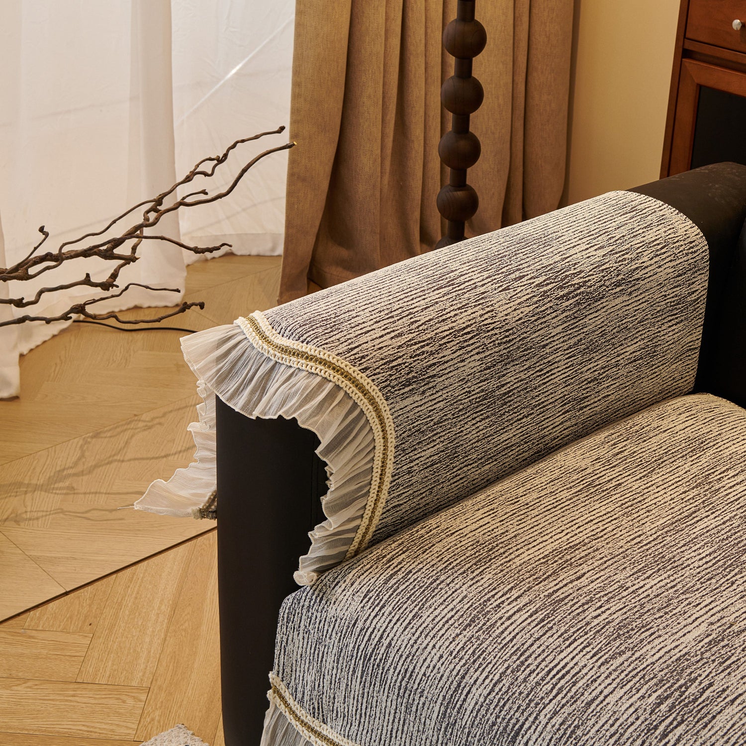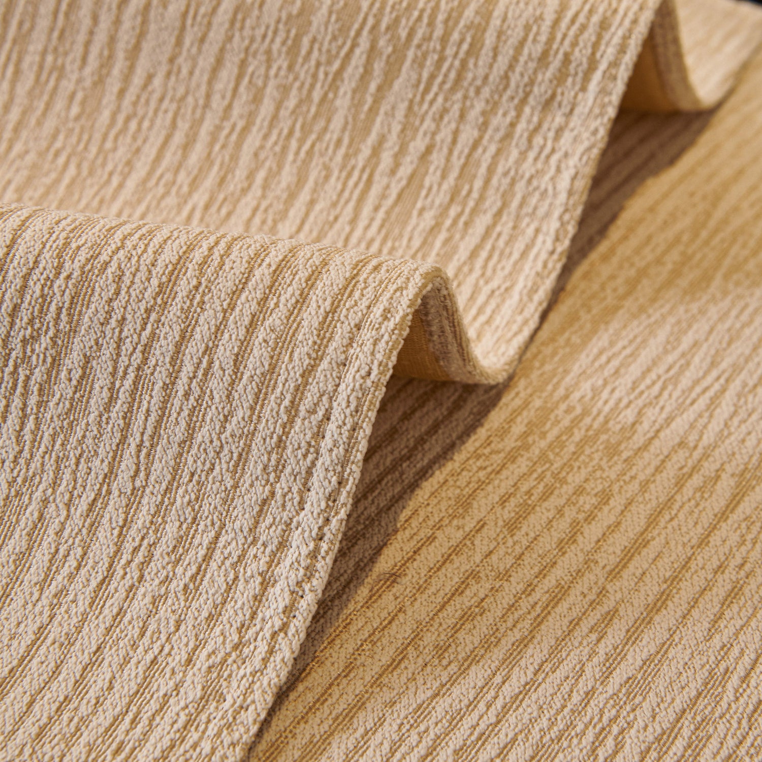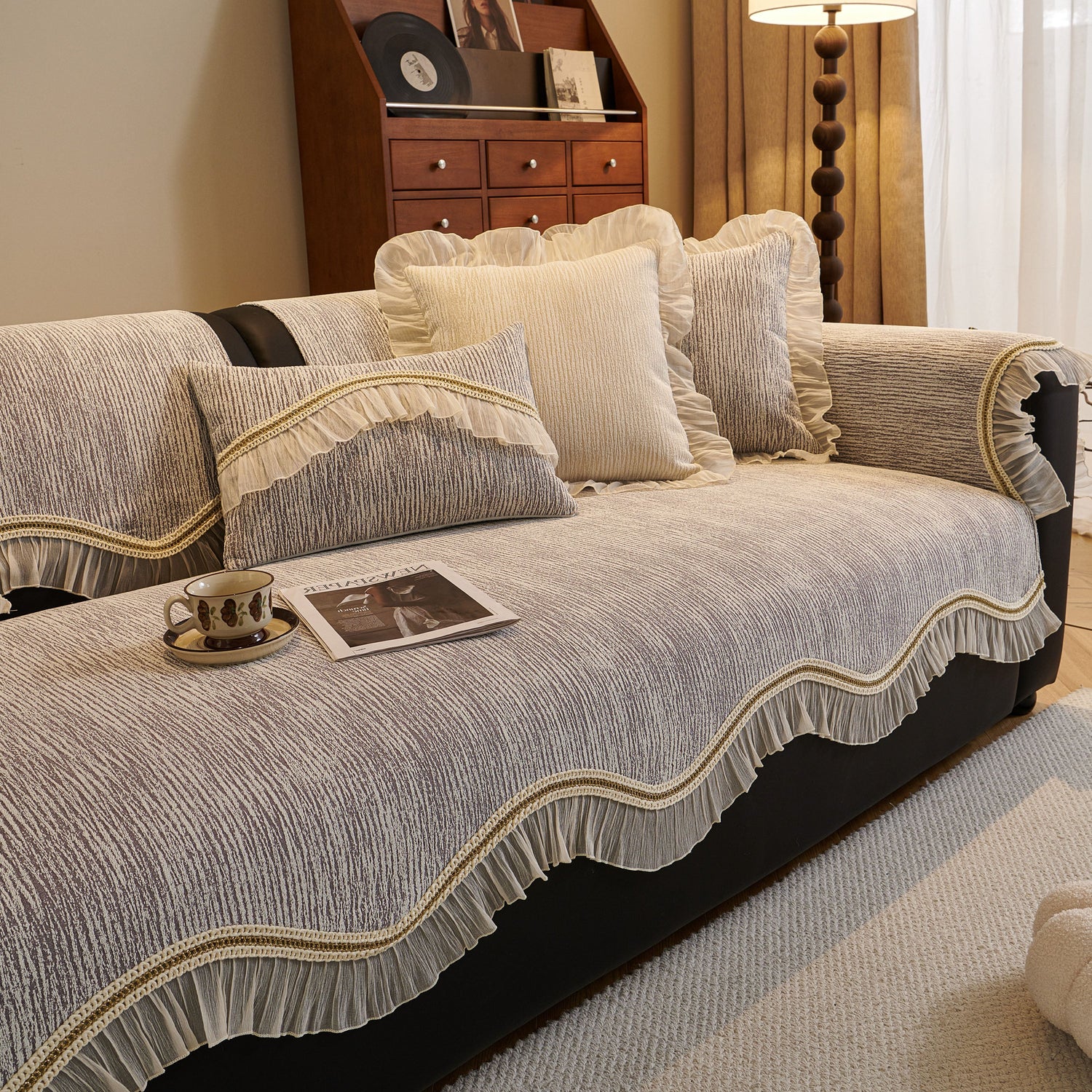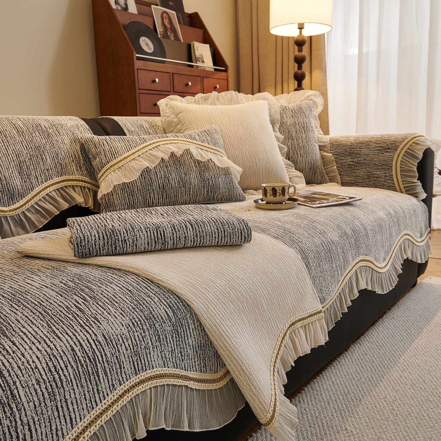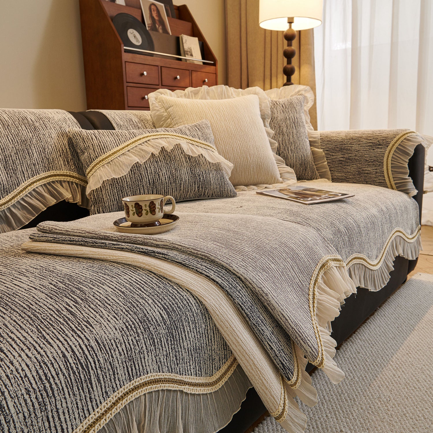 This chenille sofa cover combines comfort, elegance, and functionality for year-round use. The surface features soft, thick chenille fabric with a naturally flowing linear texture that feels smooth to the touch while offering breathable comfort. Its refined design includes subtle gradient stripes paired with decorative gold embroidery trim and pleated ruffle edges, adding a romantic, palace-inspired charm to any living room.