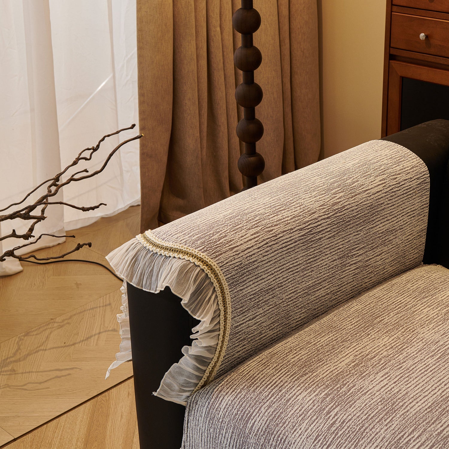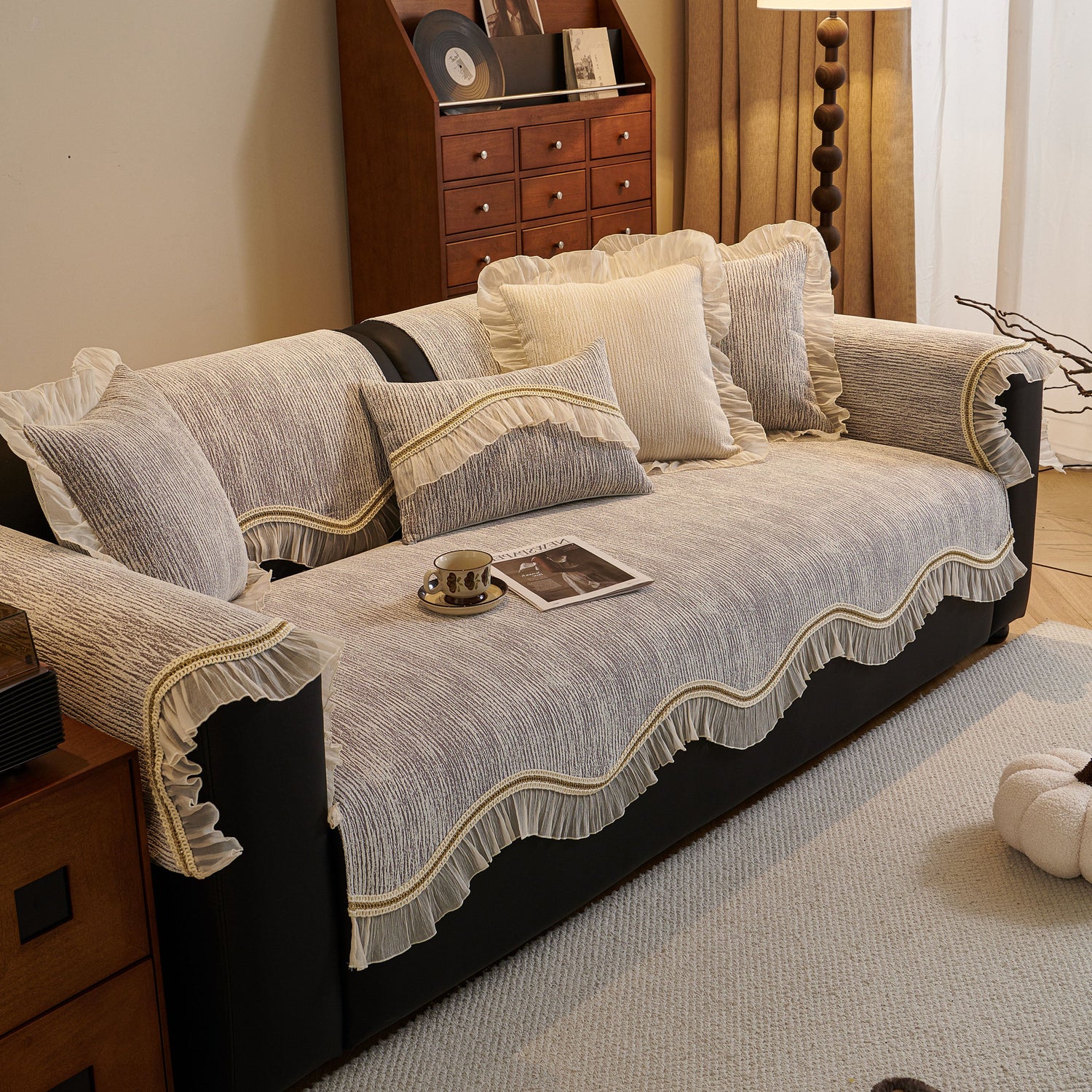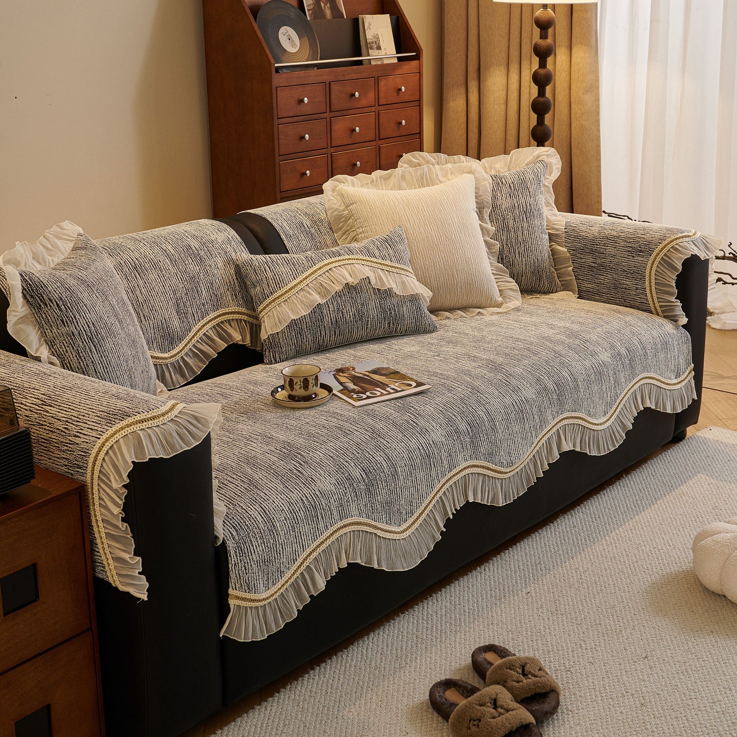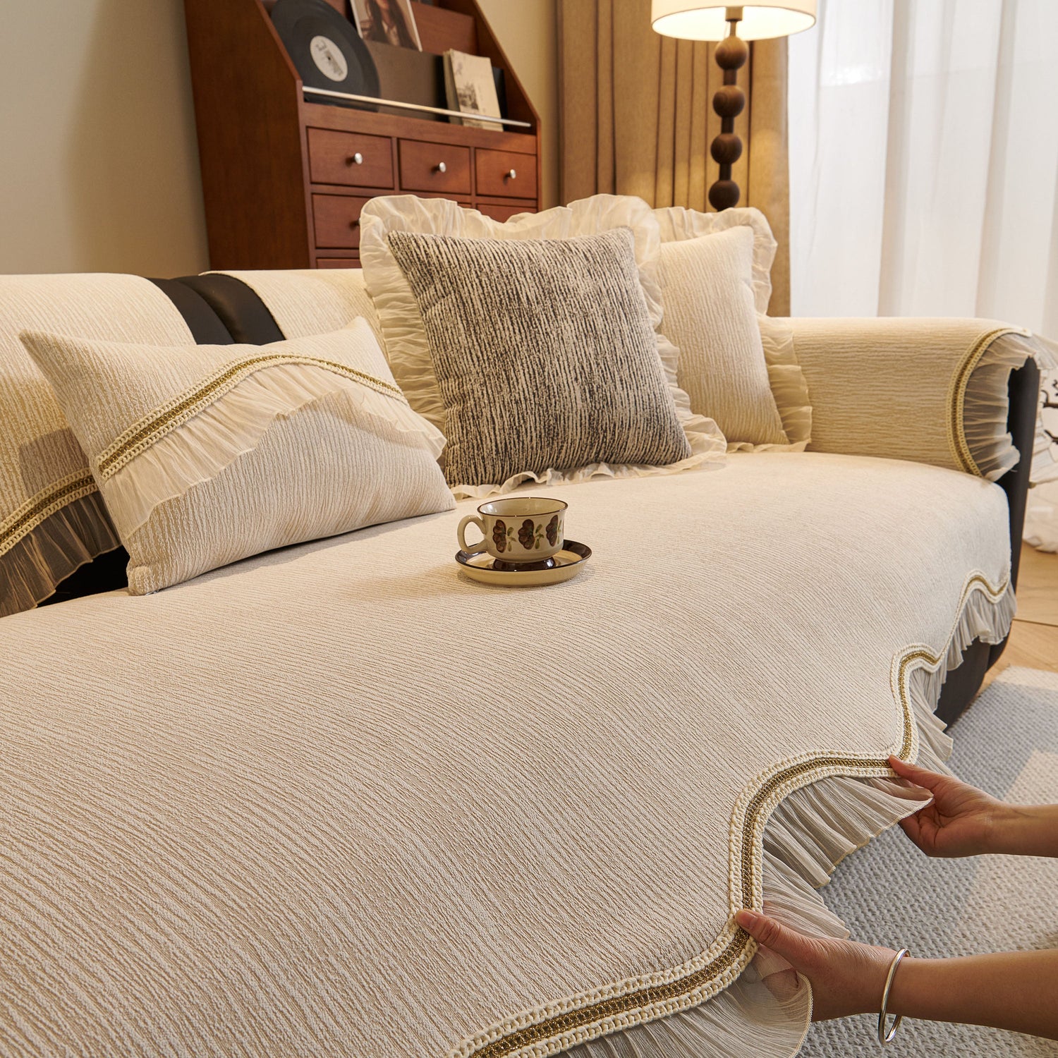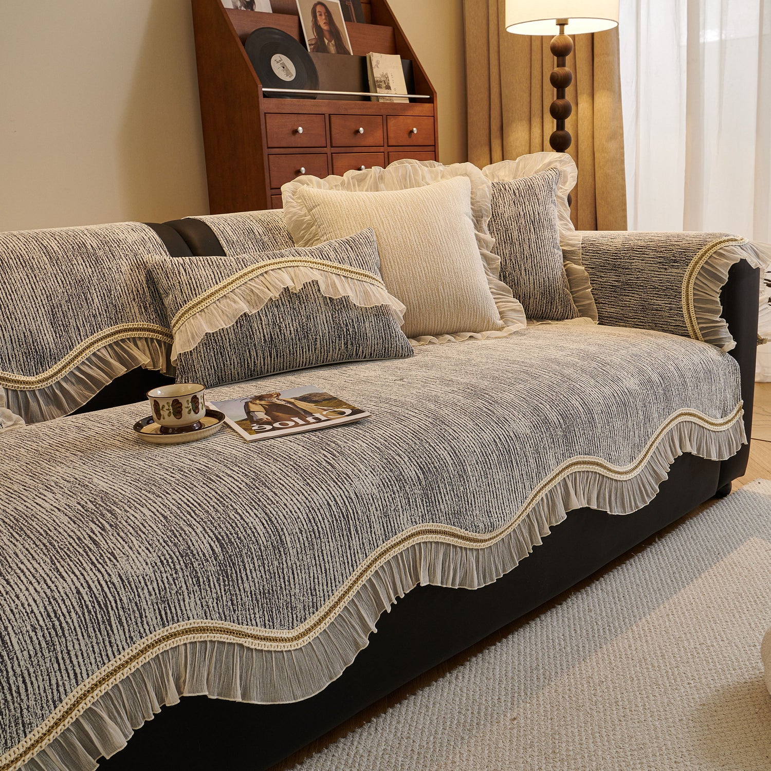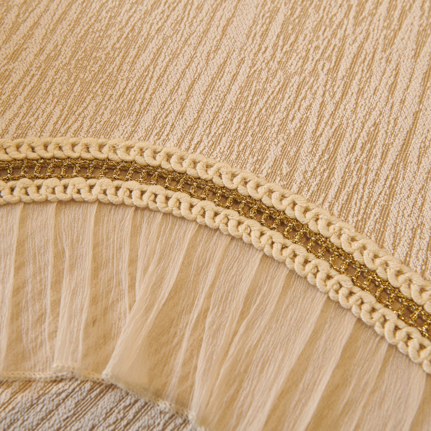This chenille sofa cover combines comfort, elegance, and functionality for year-round use. The surface features soft, thick chenille fabric with a naturally flowing linear texture that feels smooth to the touch while offering breathable comfort. Its refined design includes subtle gradient stripes paired with decorative gold embroidery trim and pleated ruffle edges, adding a romantic, palace-inspired charm to any living room.