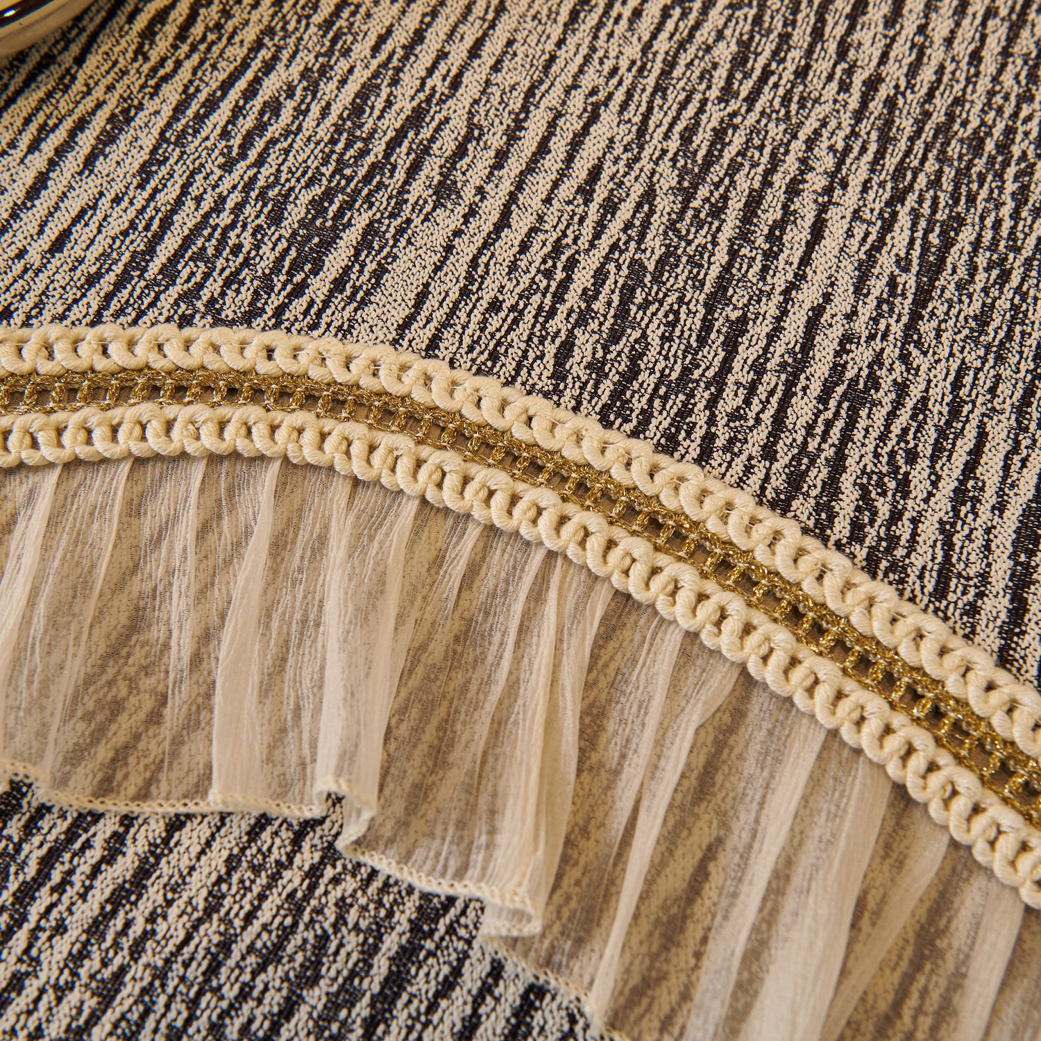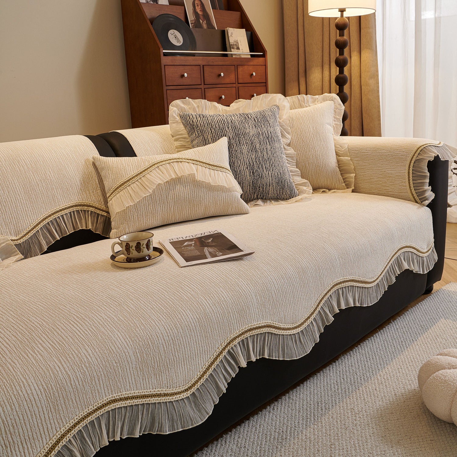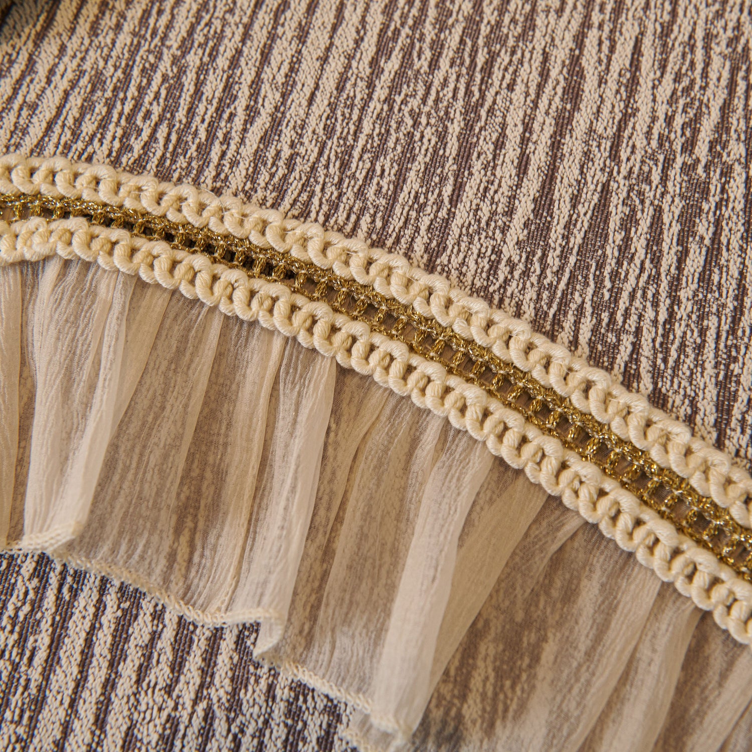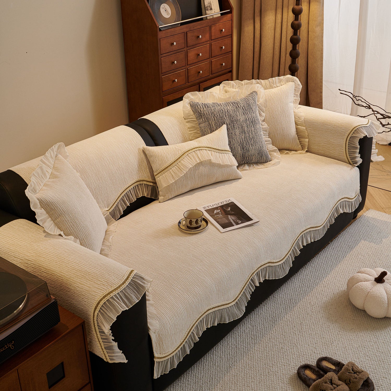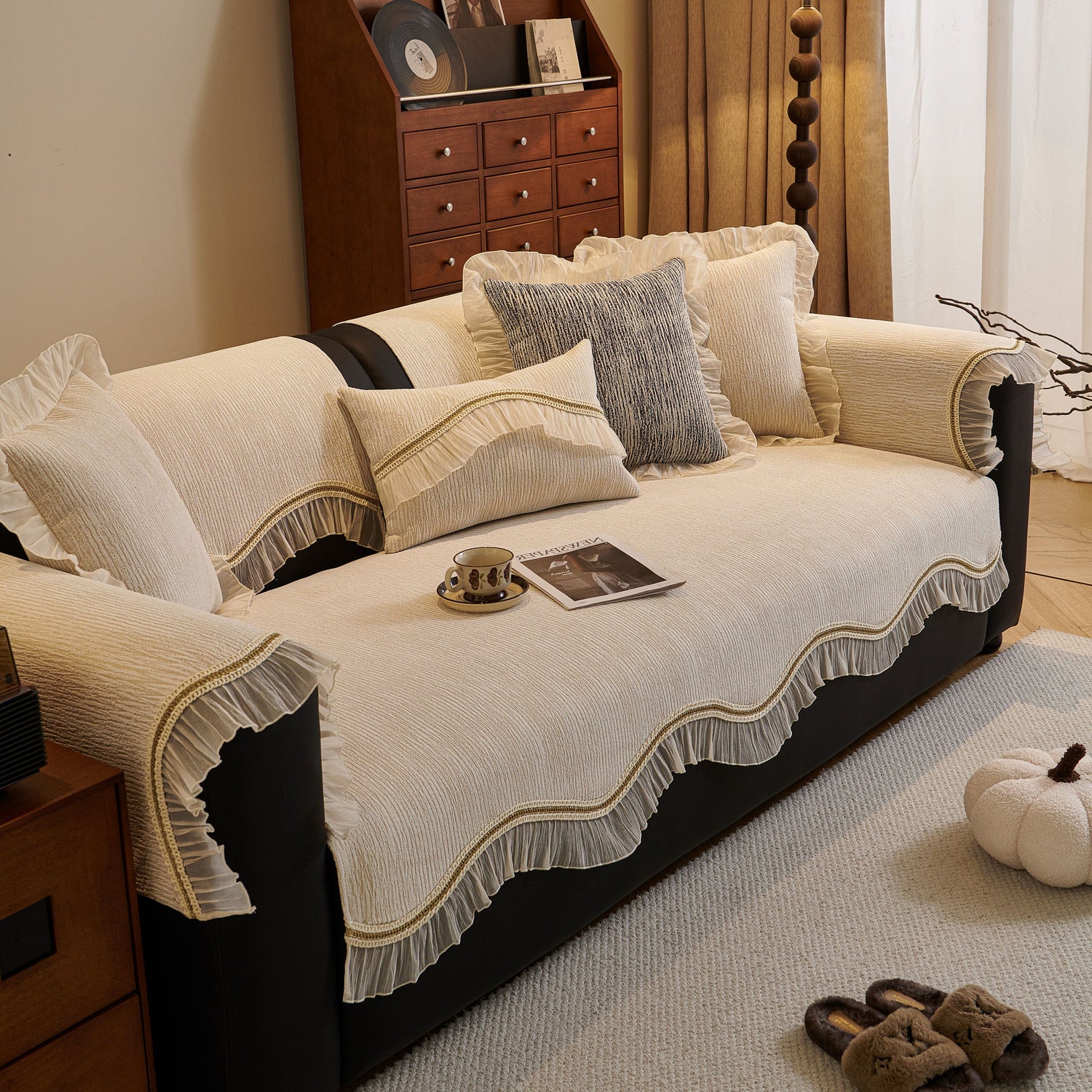 This chenille sofa cover combines comfort, elegance, and functionality for year-round use. The surface features soft, thick chenille fabric with a naturally flowing linear texture that feels smooth to the touch while offering breathable comfort. Its refined design includes subtle gradient stripes paired with decorative gold embroidery trim and pleated ruffle edges, adding a romantic, palace-inspired charm to any living room.