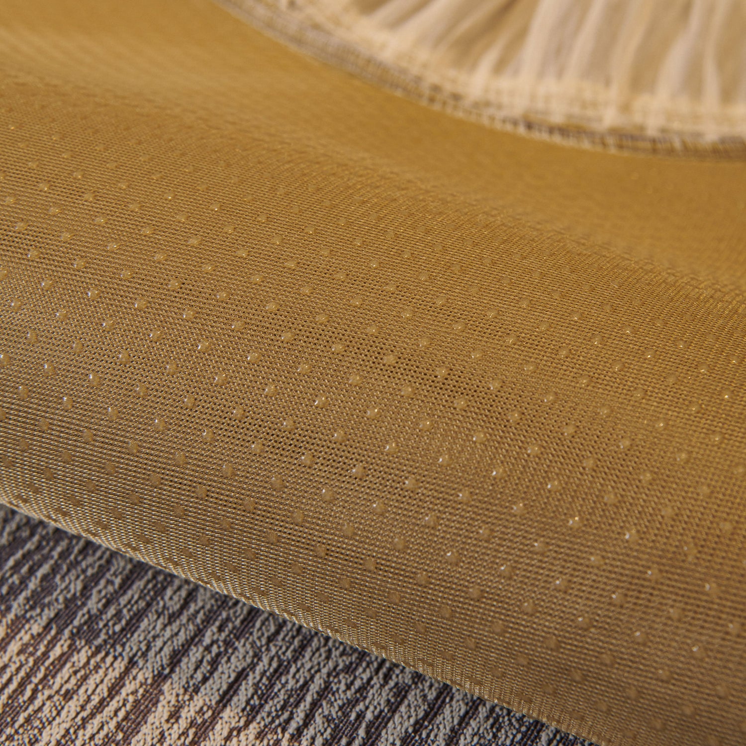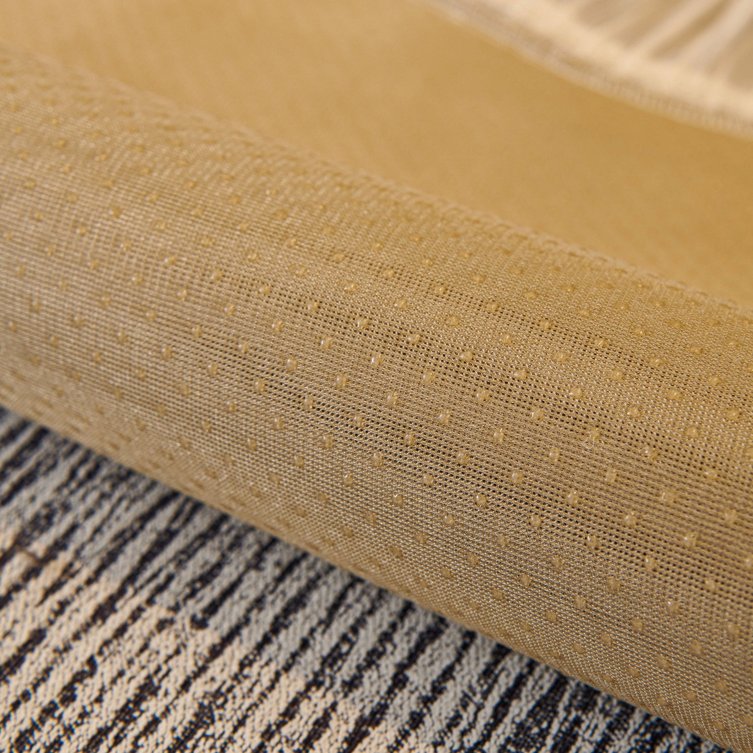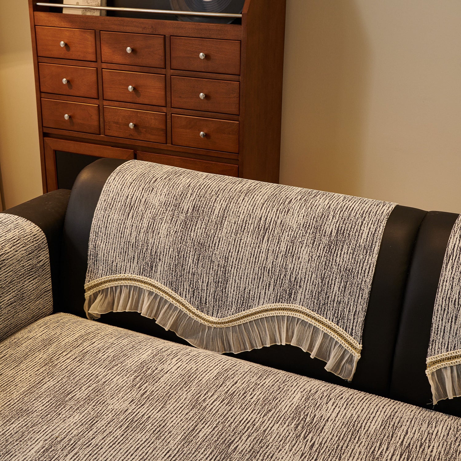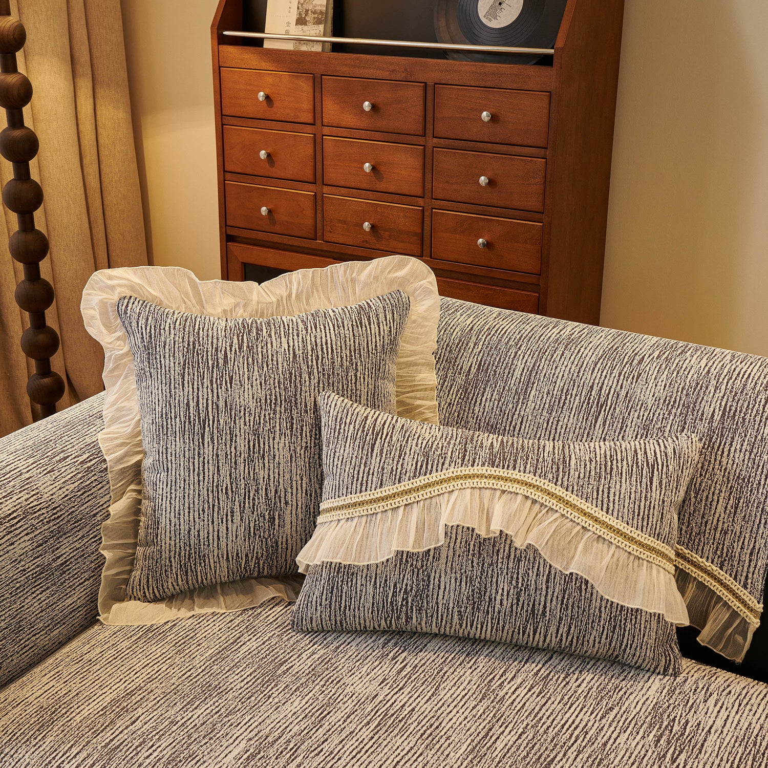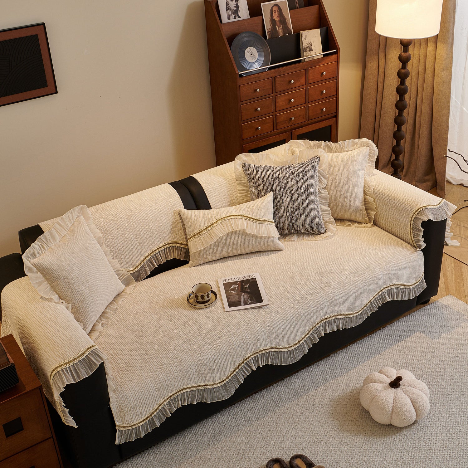 This chenille sofa cover combines comfort, elegance, and functionality for year-round use. The surface features soft, thick chenille fabric with a naturally flowing linear texture that feels smooth to the touch while offering breathable comfort. Its refined design includes subtle gradient stripes paired with decorative gold embroidery trim and pleated ruffle edges, adding a romantic, palace-inspired charm to any living room.