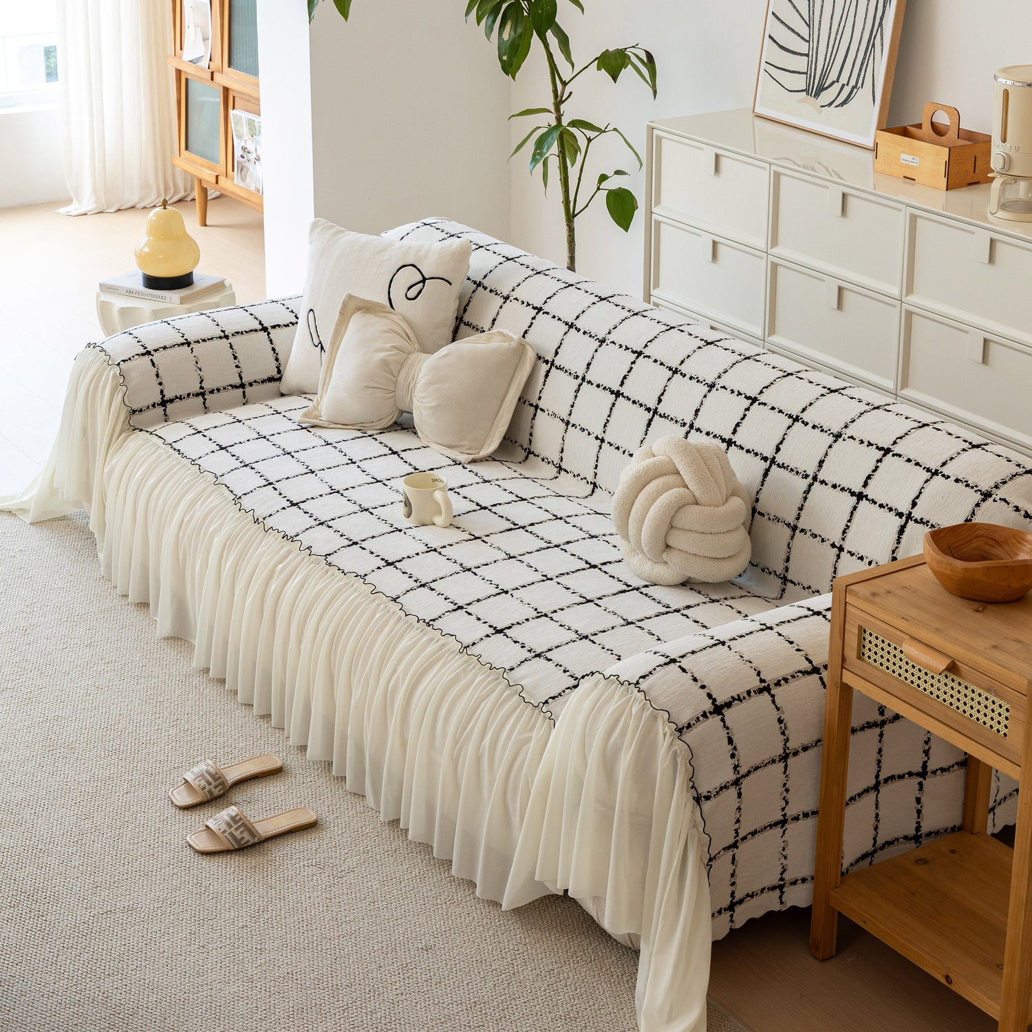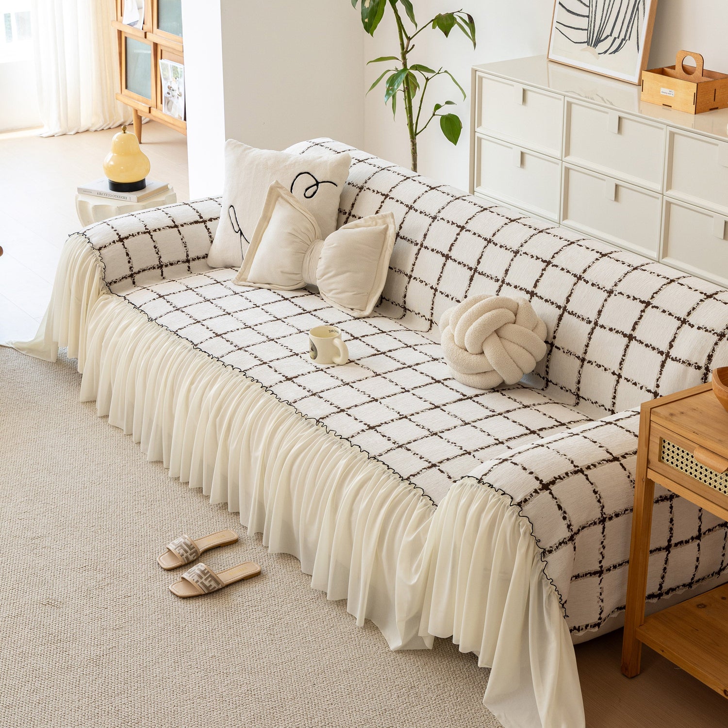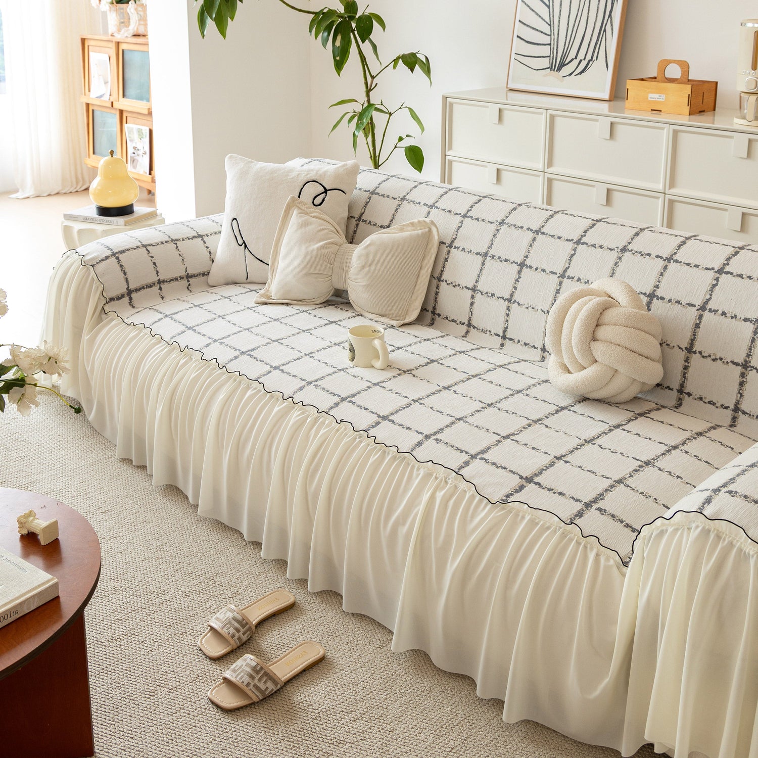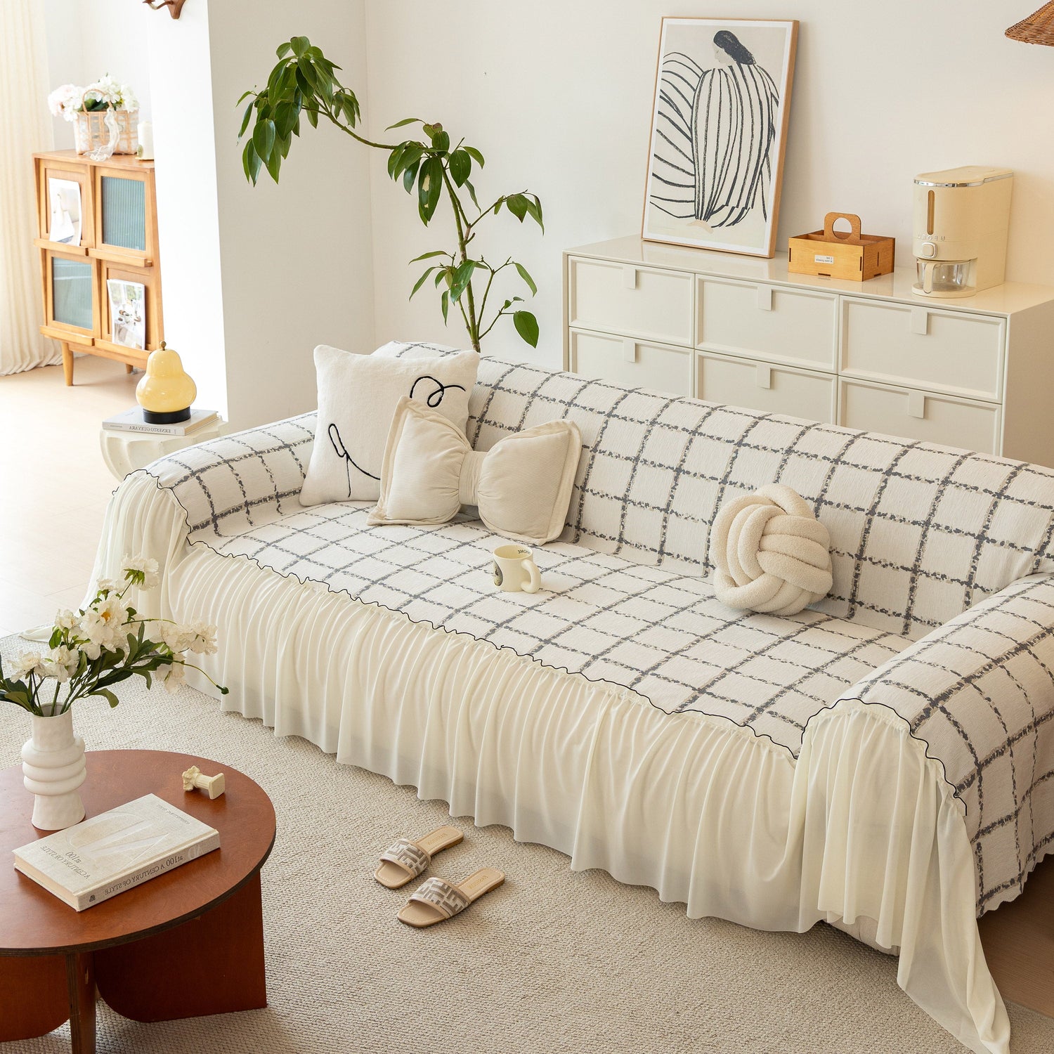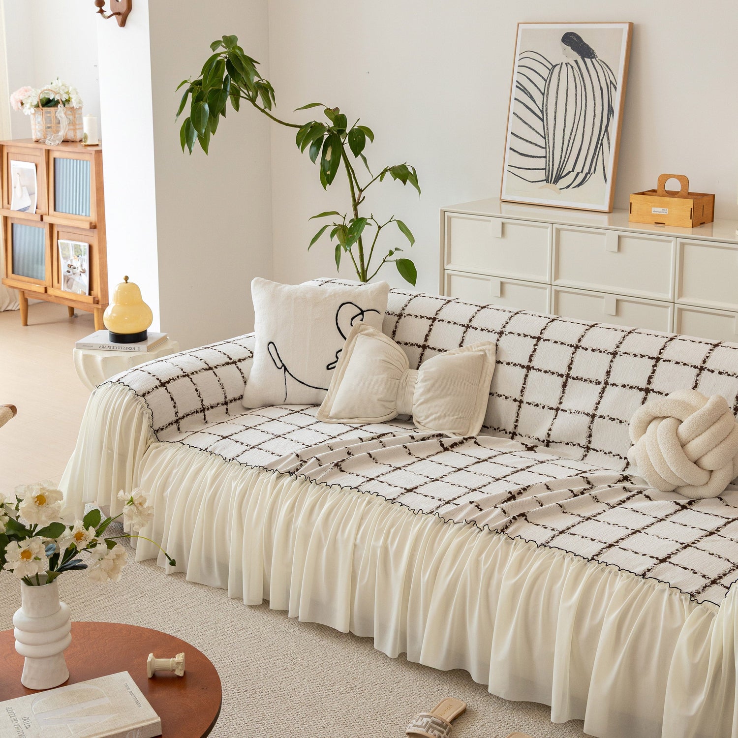 Grid Sofa Cover with Ruffle Skirt – Soft, Decorative, Full-Cover Couch Protector