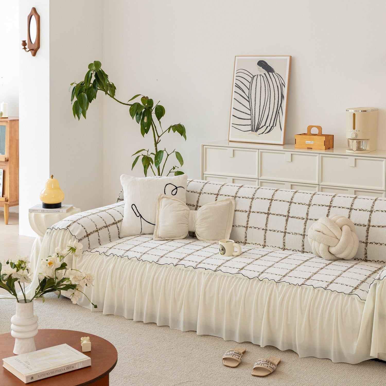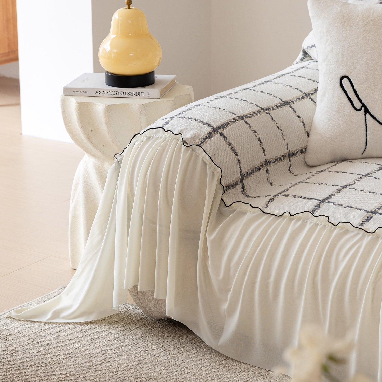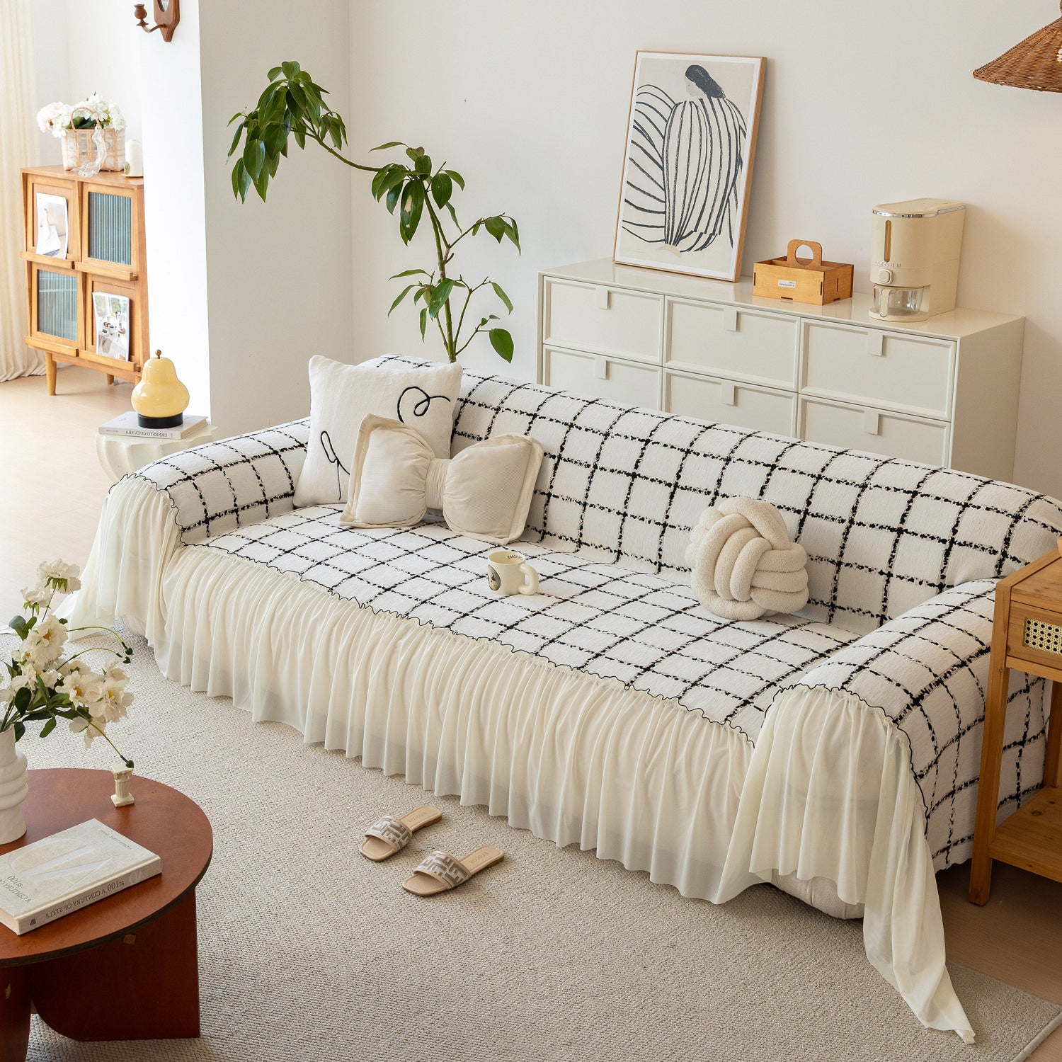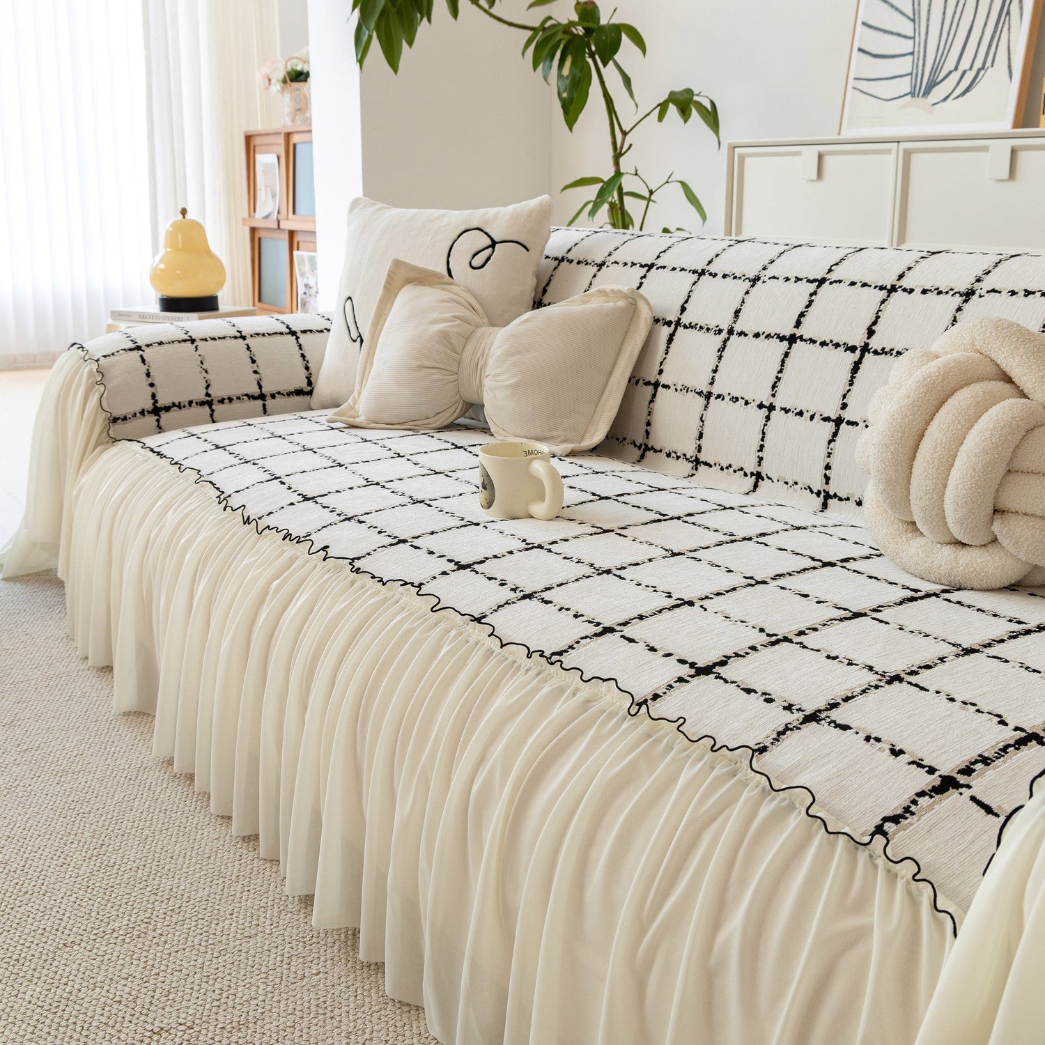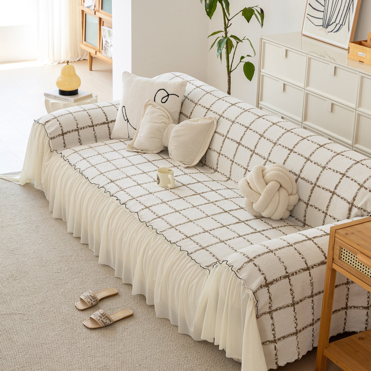 Grid Sofa Cover with Ruffle Skirt – Soft, Decorative, Full-Cover Couch Protector