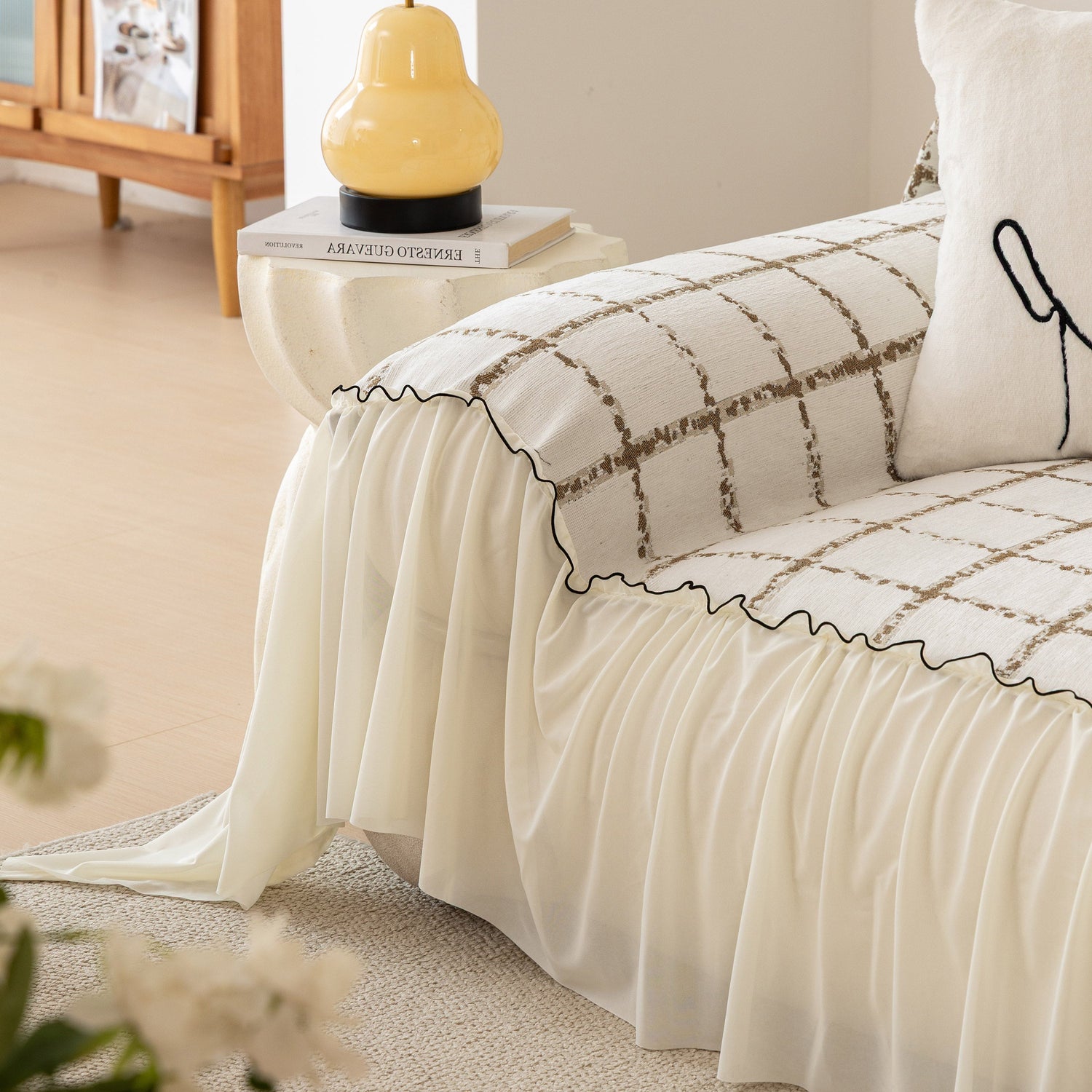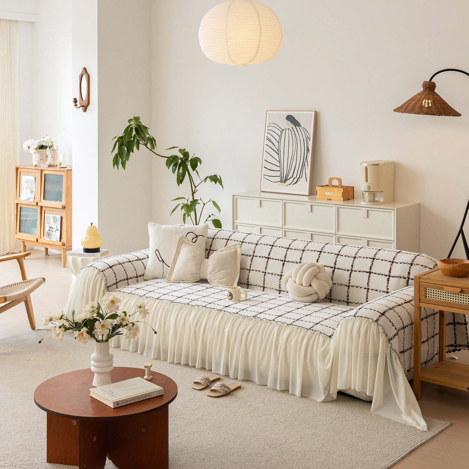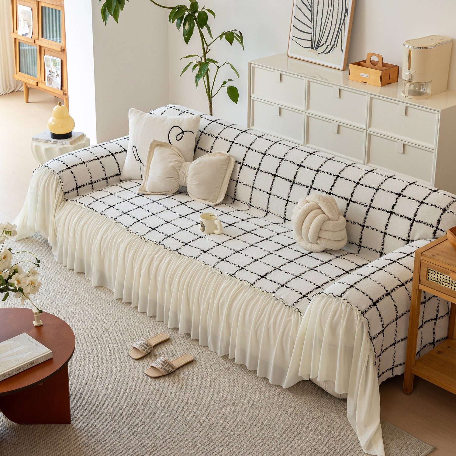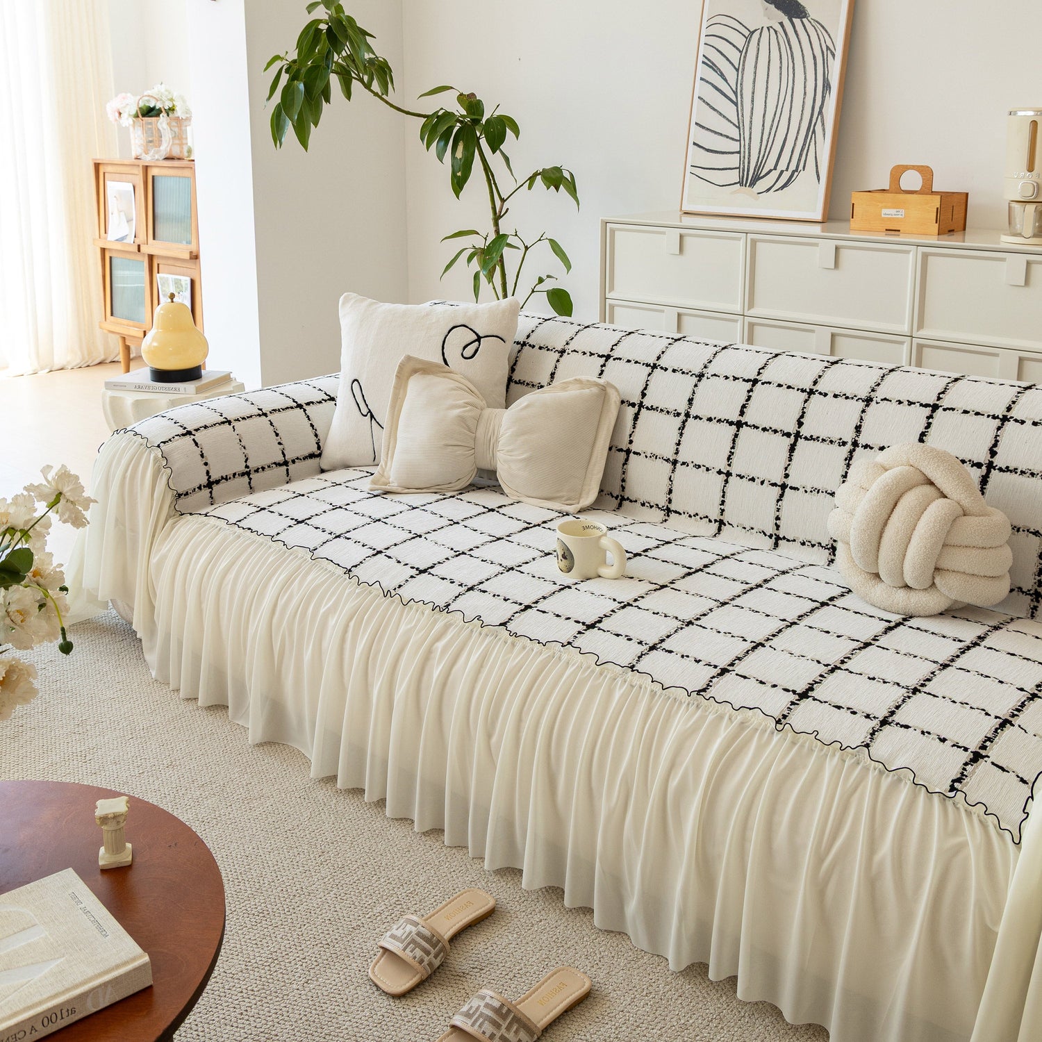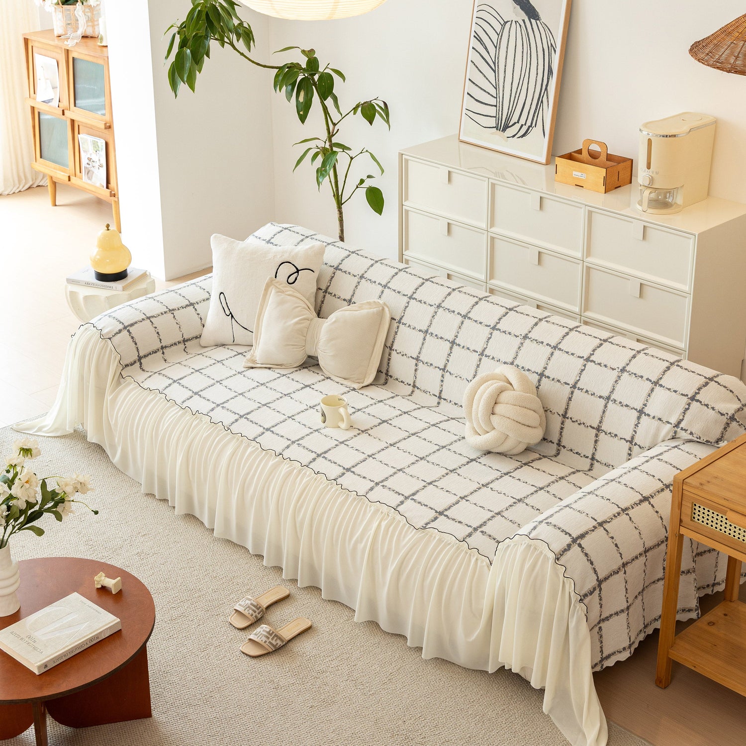 Grid Sofa Cover with Ruffle Skirt – Soft, Decorative, Full-Cover Couch Protector