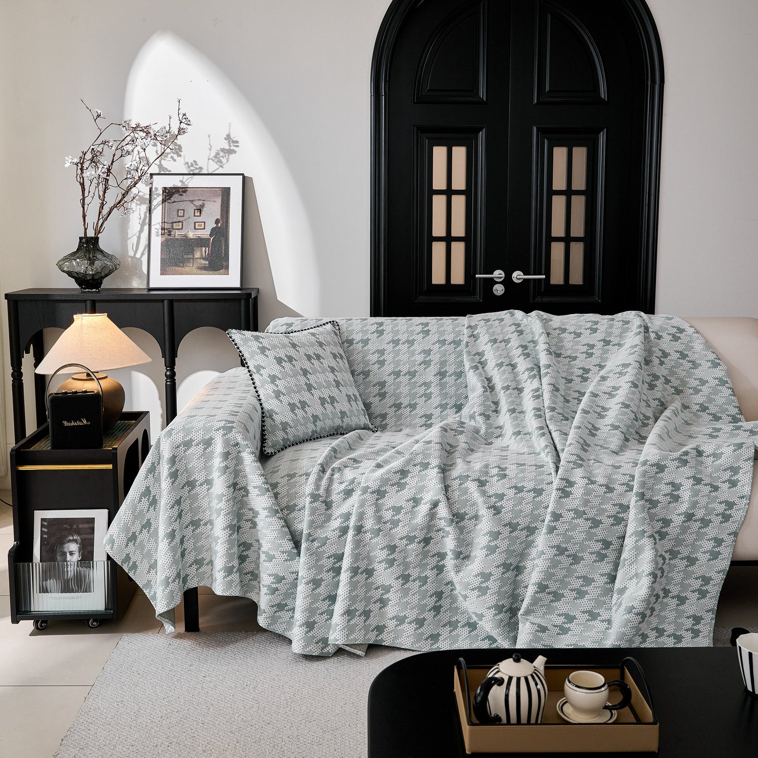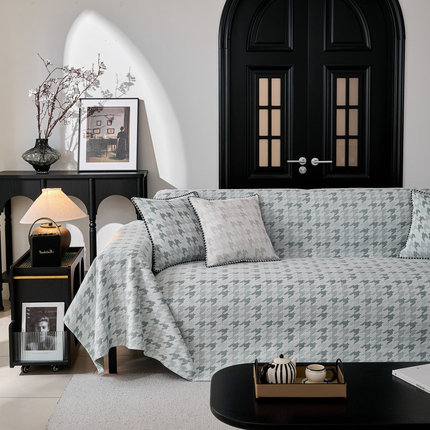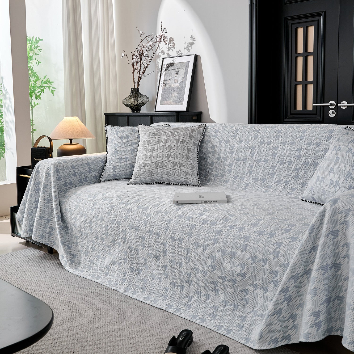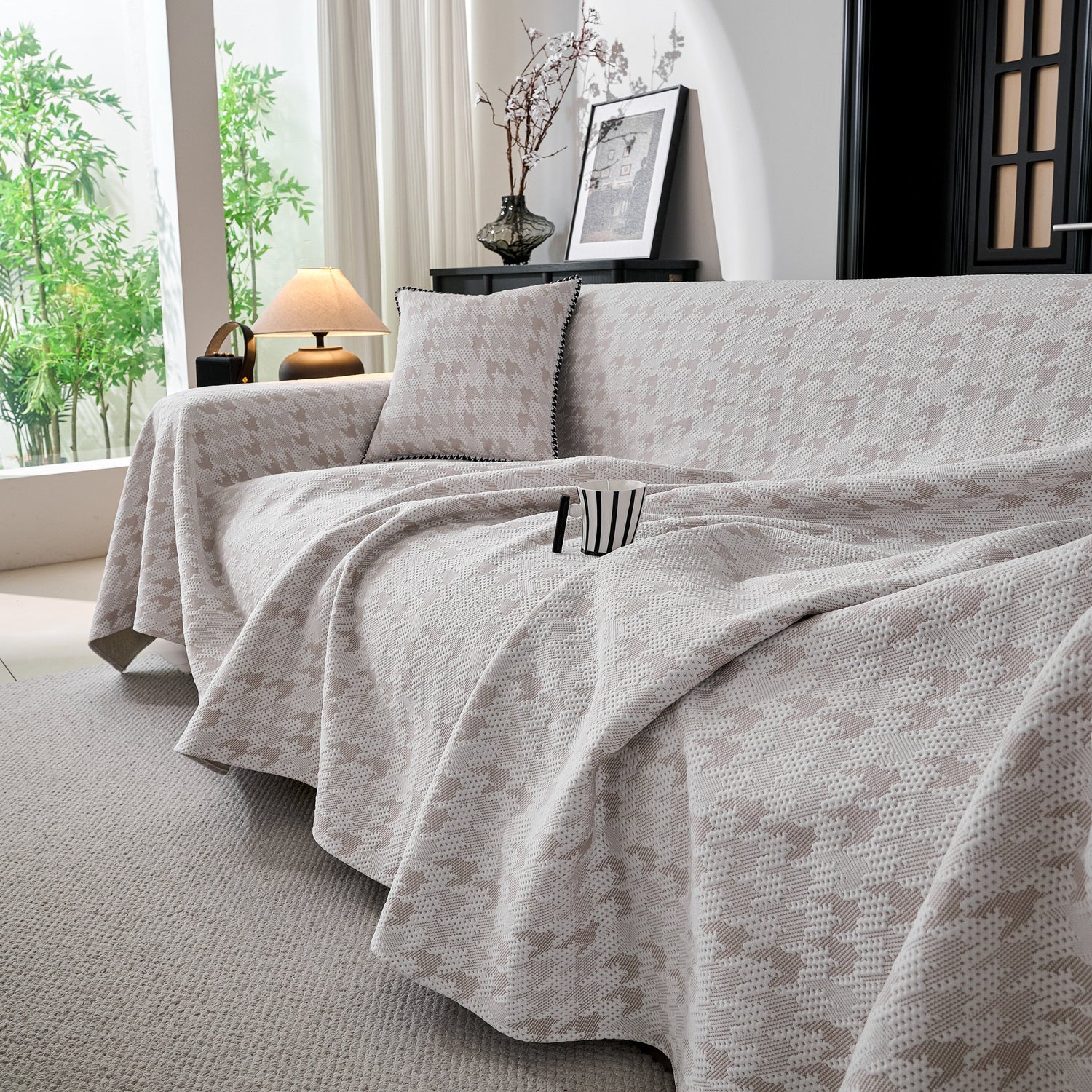 This luxury houndstooth sofa cover is crafted from premium polyester with a silky-smooth surface, offering a soft and comfortable feel. The front showcases a subtle raised houndstooth pattern, giving the cover a visually textured and high-end look. Its oversized one-piece design fully drapes over the sofa, providing complete protection for fabric or leather couches alike.
