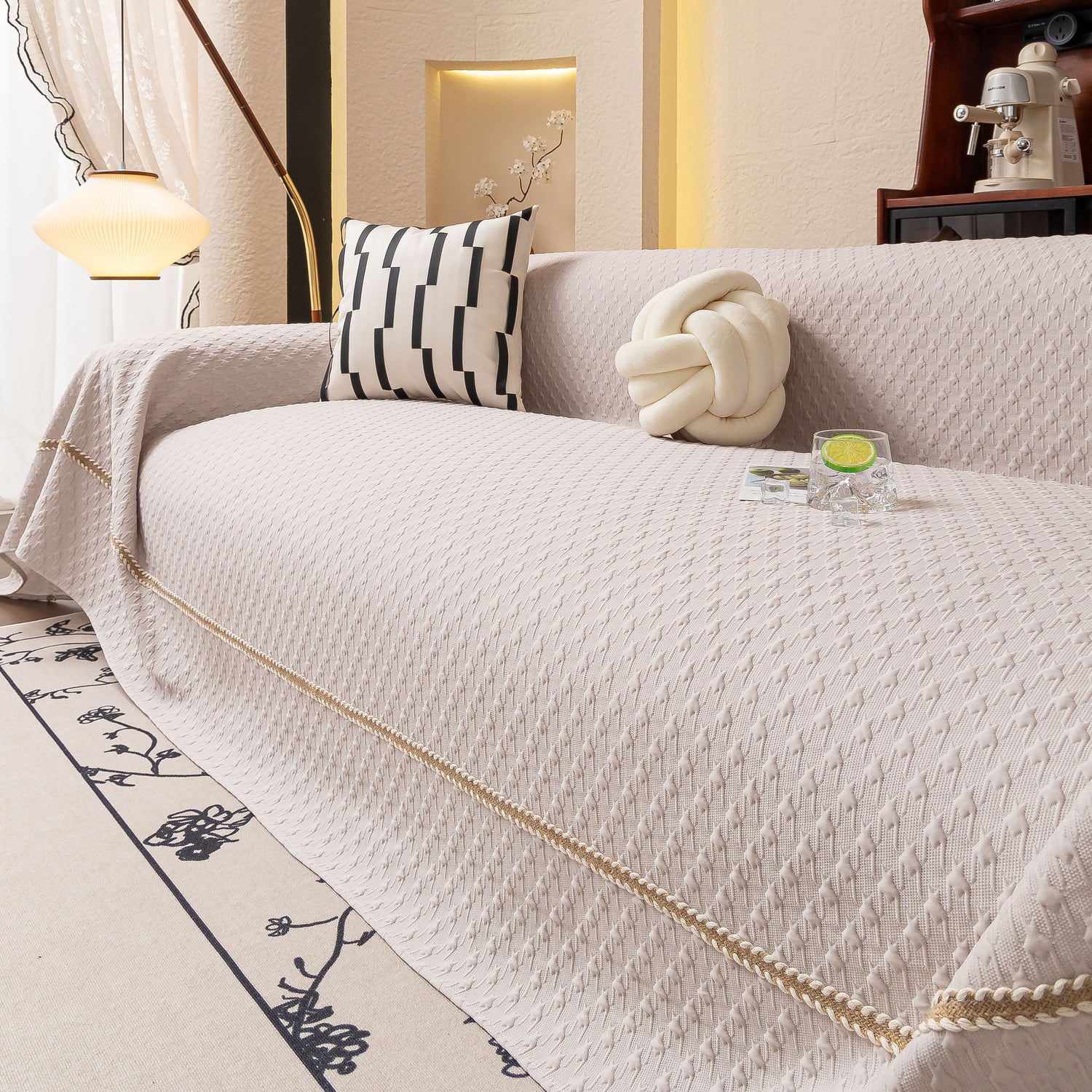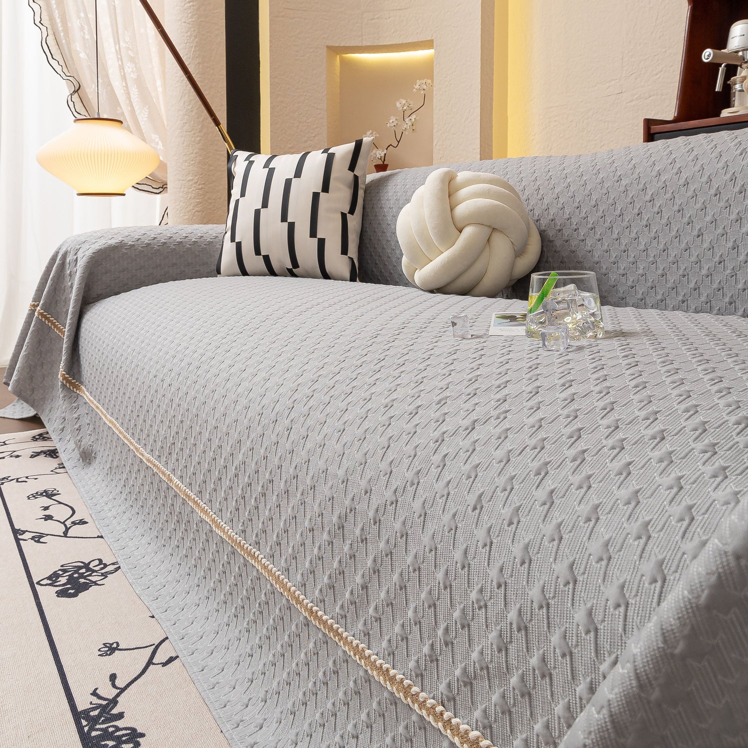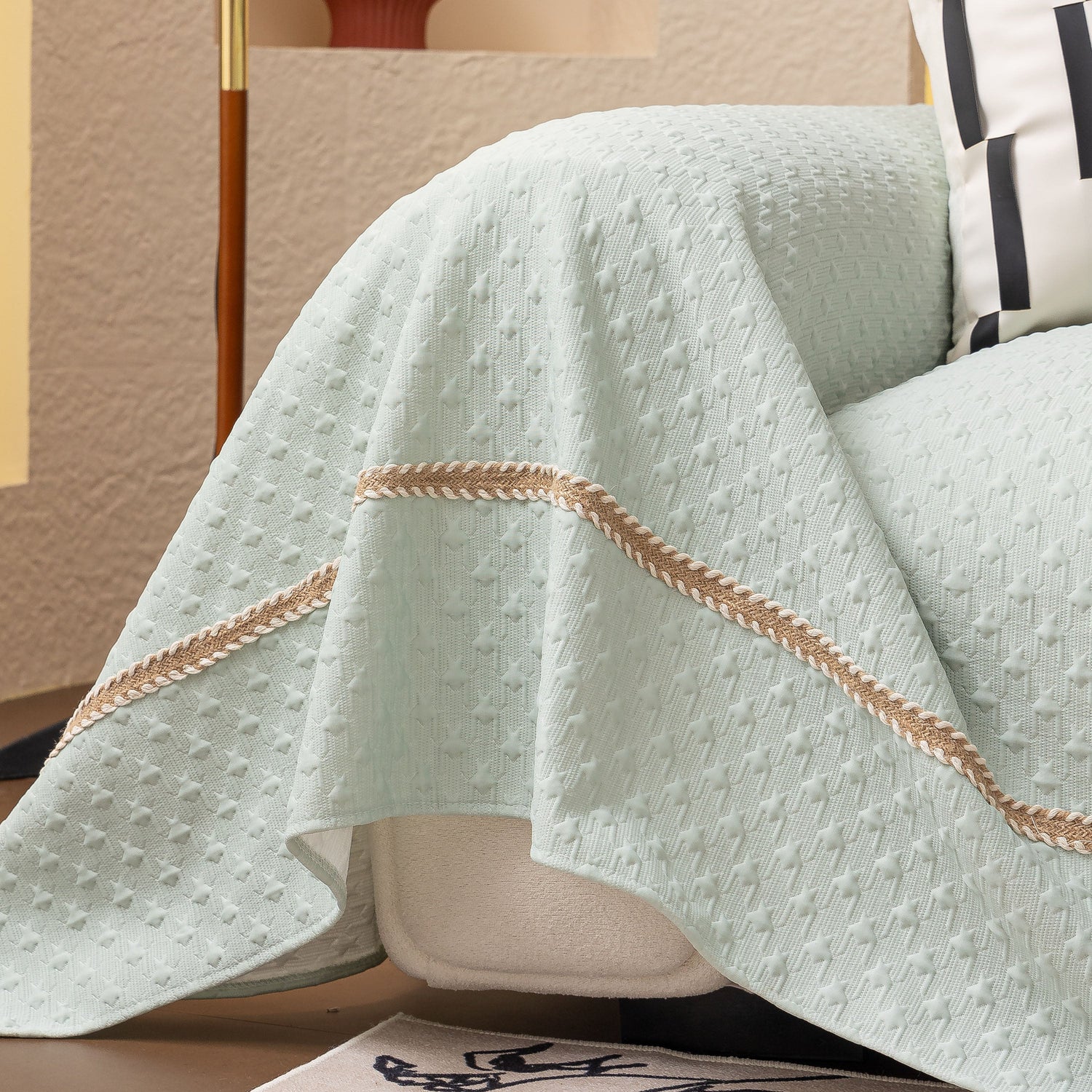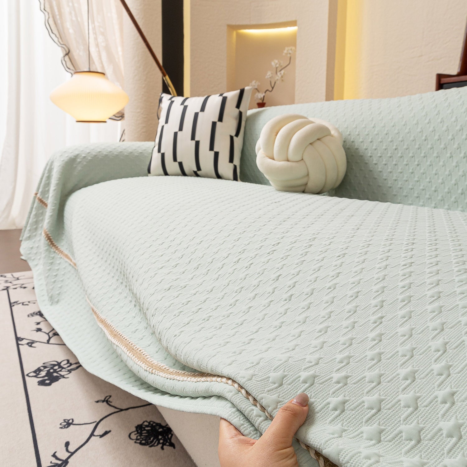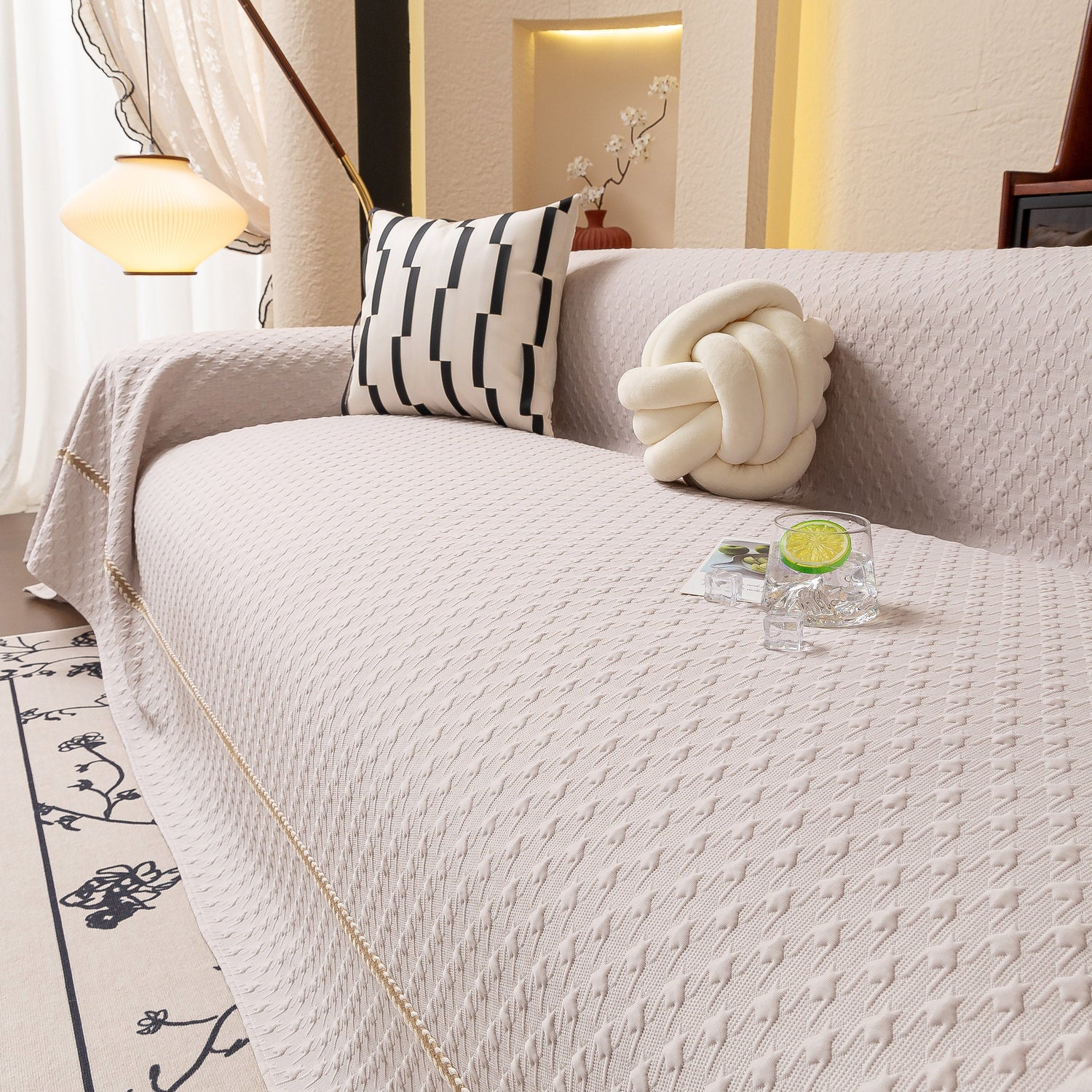 This sofa cover is made of smooth ice silk fabric, which is breathable, cool to the touch, and comfortable for use in warmer seasons. The surface features a woven houndstooth pattern formed through jacquard weaving, giving the fabric a fine texture with consistent, interlocking geometric shapes. A decorative gold braid trim runs along the edge, enhancing the overall finish and creating a refined look. The cover drapes naturally over various types of sofas and can be used to protect against dust, light stains, and pet hair. Suitable for both full-cover and partial layering, it is machine washable and retains its texture and shape after repeated laundering.