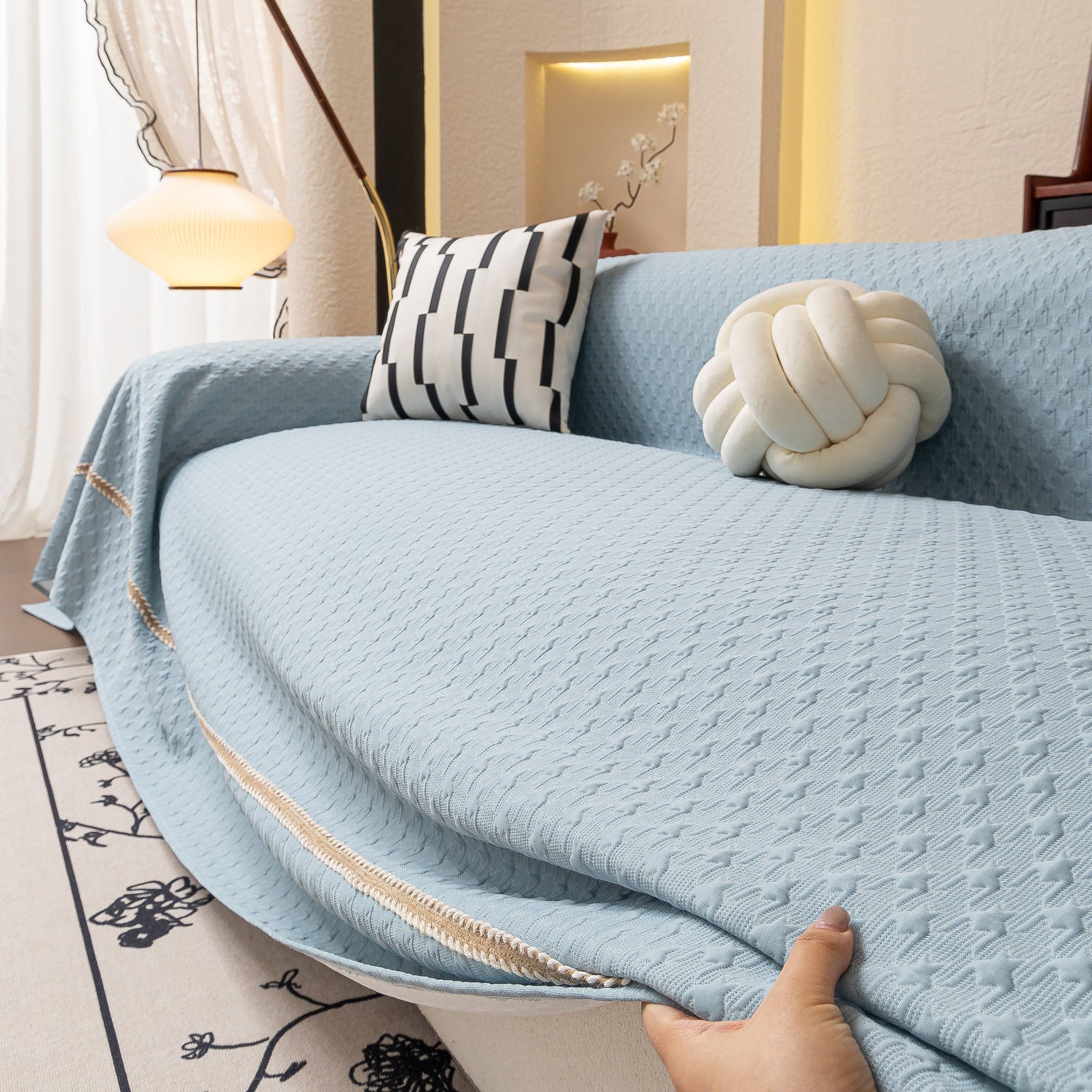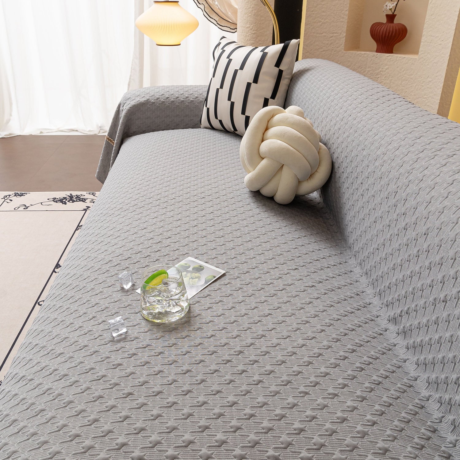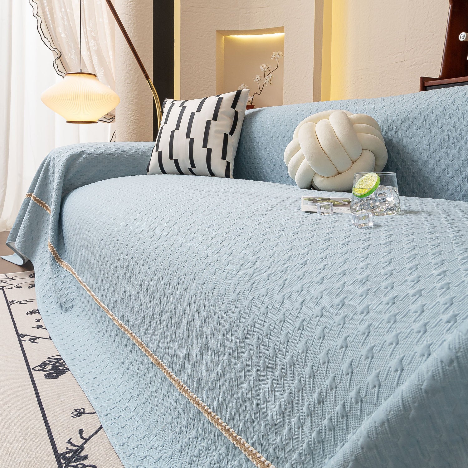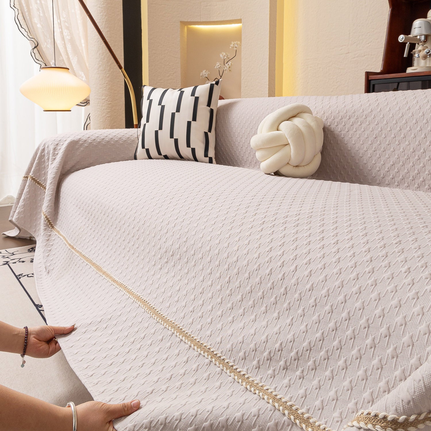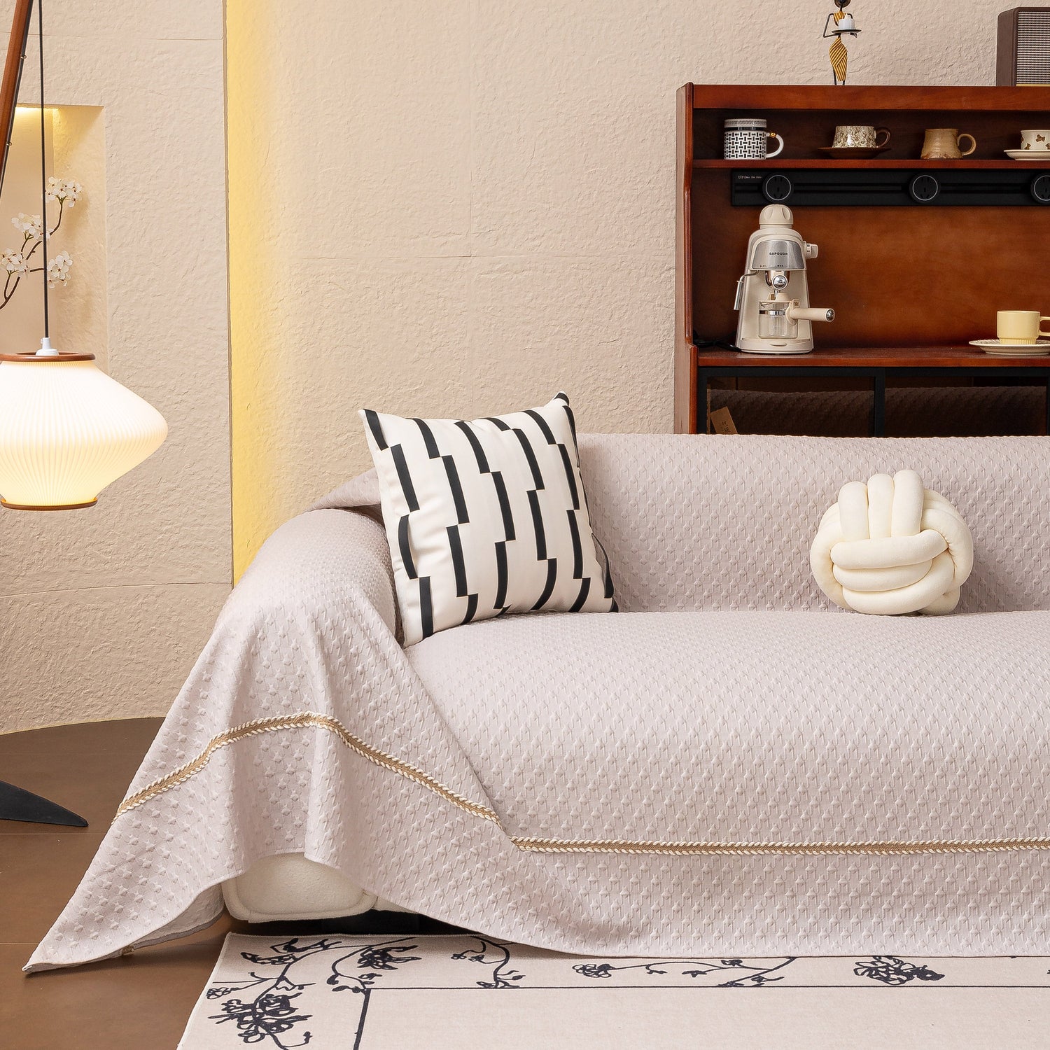 This sofa cover is made of smooth ice silk fabric, which is breathable, cool to the touch, and comfortable for use in warmer seasons. The surface features a woven houndstooth pattern formed through jacquard weaving, giving the fabric a fine texture with consistent, interlocking geometric shapes. A decorative gold braid trim runs along the edge, enhancing the overall finish and creating a refined look. The cover drapes naturally over various types of sofas and can be used to protect against dust, light stains, and pet hair. Suitable for both full-cover and partial layering, it is machine washable and retains its texture and shape after repeated laundering.