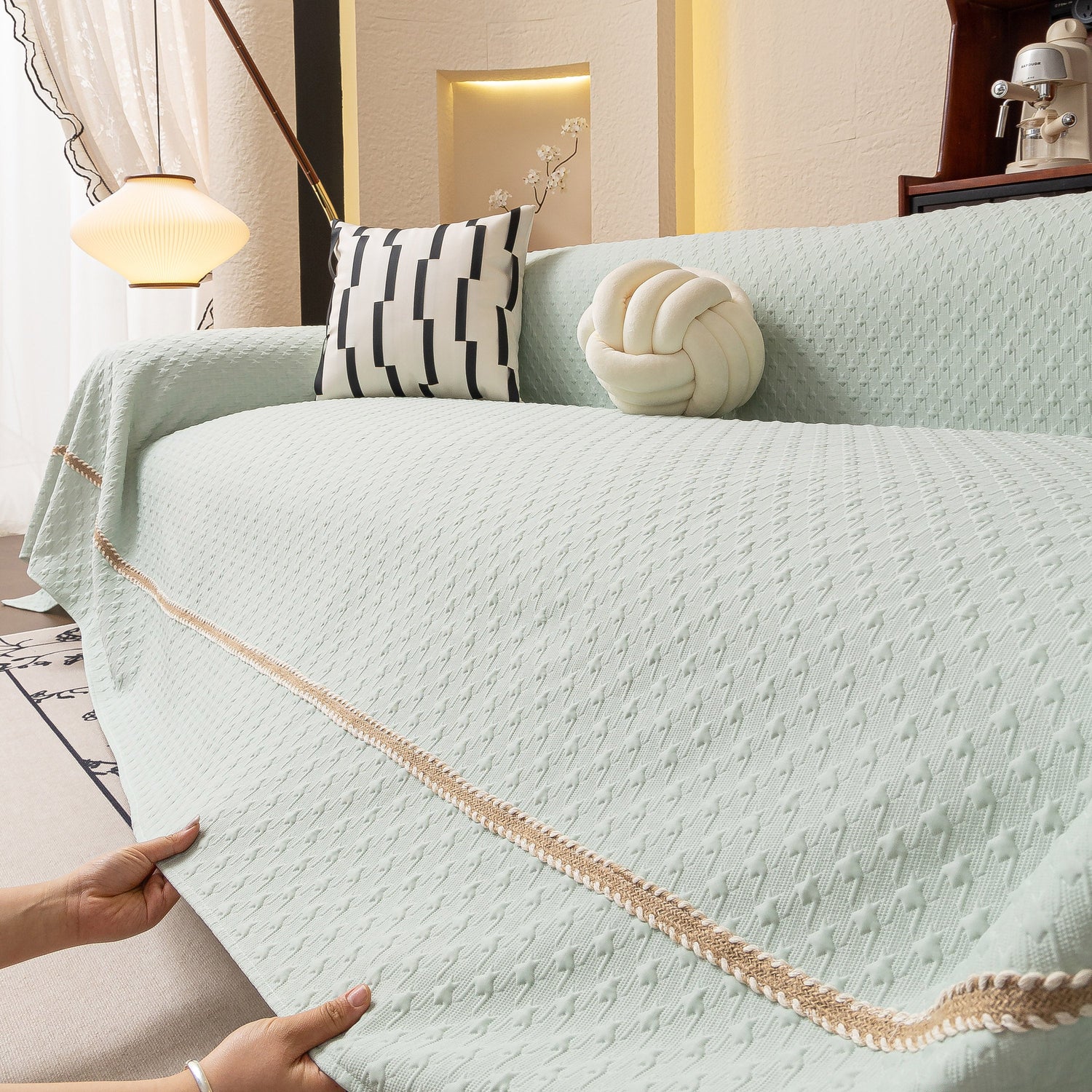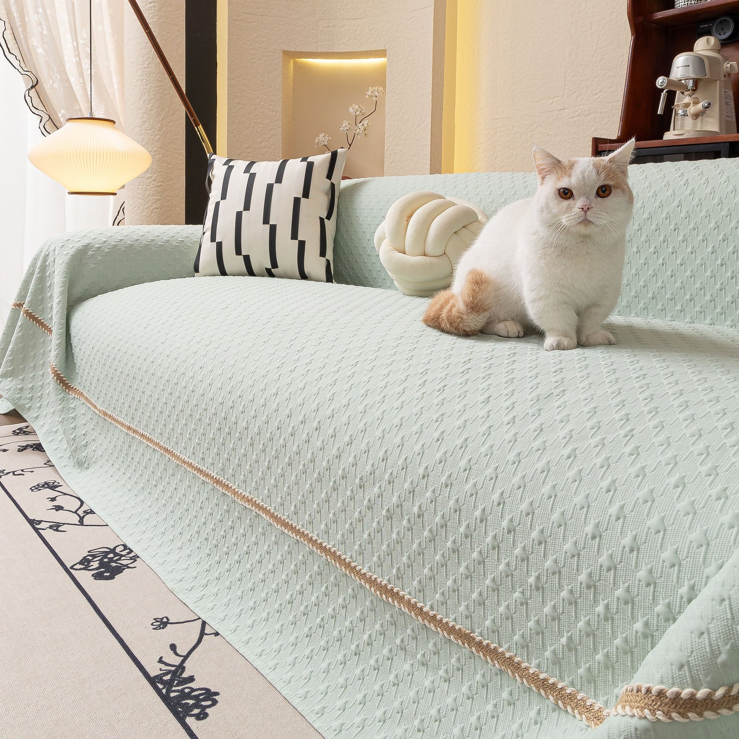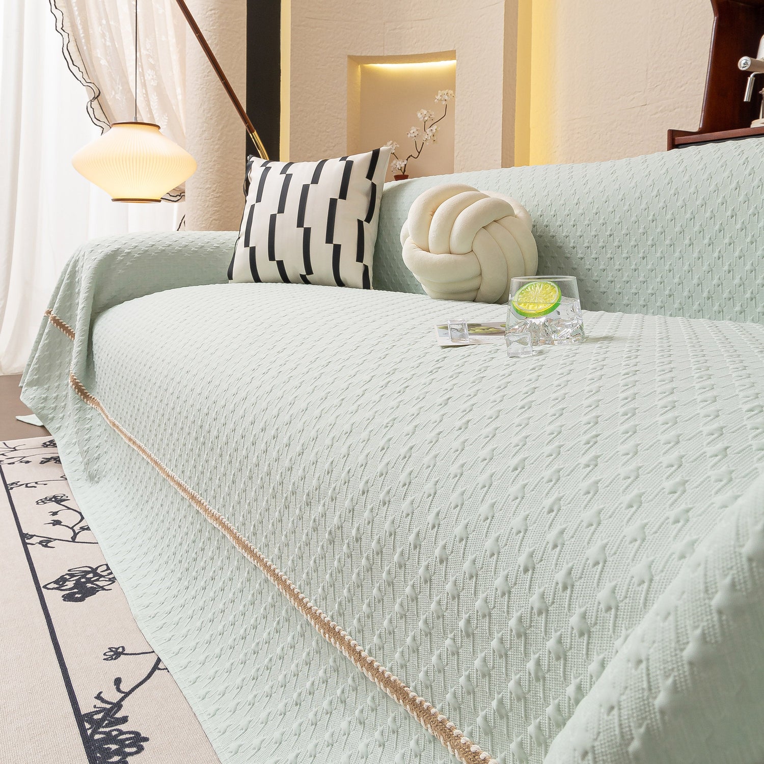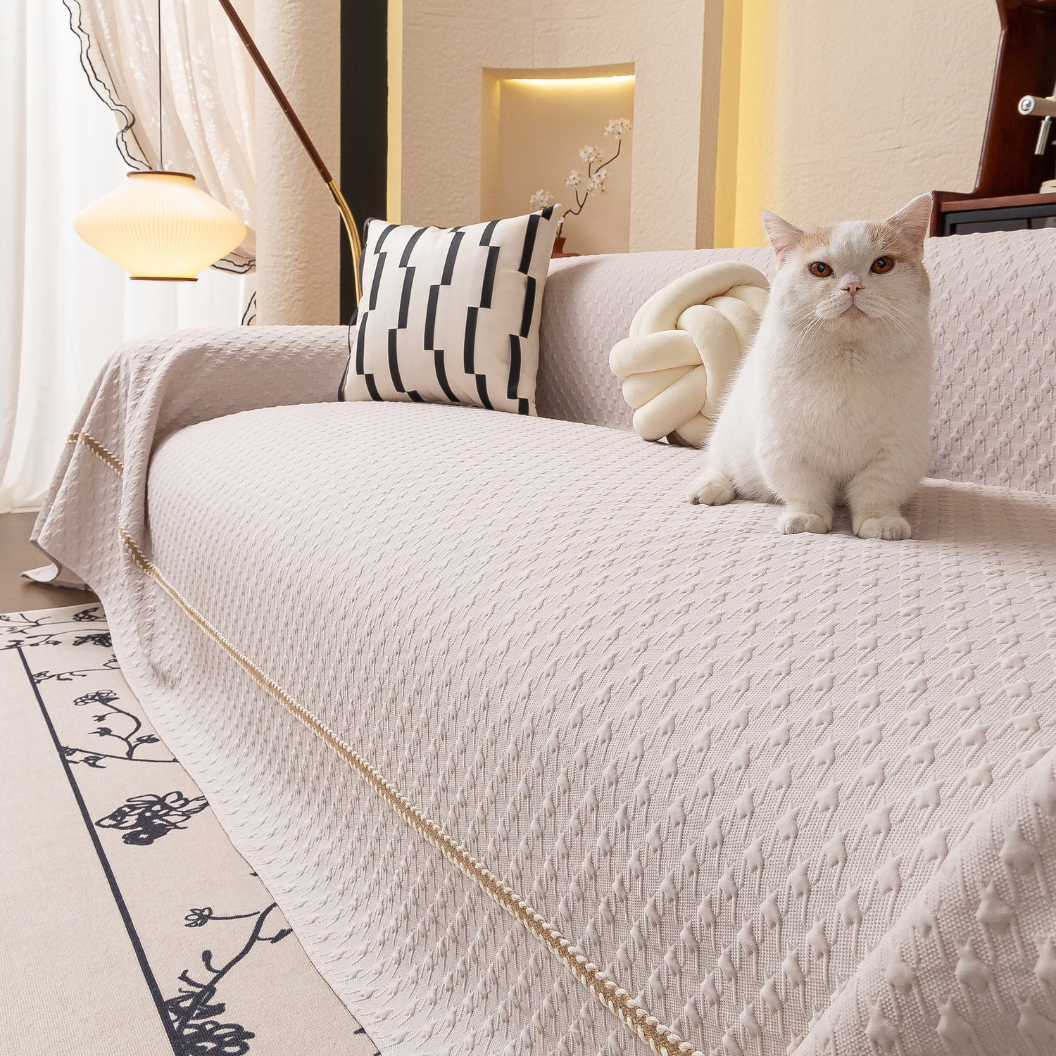 This sofa cover is made of smooth ice silk fabric, which is breathable, cool to the touch, and comfortable for use in warmer seasons. The surface features a woven houndstooth pattern formed through jacquard weaving, giving the fabric a fine texture with consistent, interlocking geometric shapes. A decorative gold braid trim runs along the edge, enhancing the overall finish and creating a refined look. The cover drapes naturally over various types of sofas and can be used to protect against dust, light stains, and pet hair. Suitable for both full-cover and partial layering, it is machine washable and retains its texture and shape after repeated laundering.