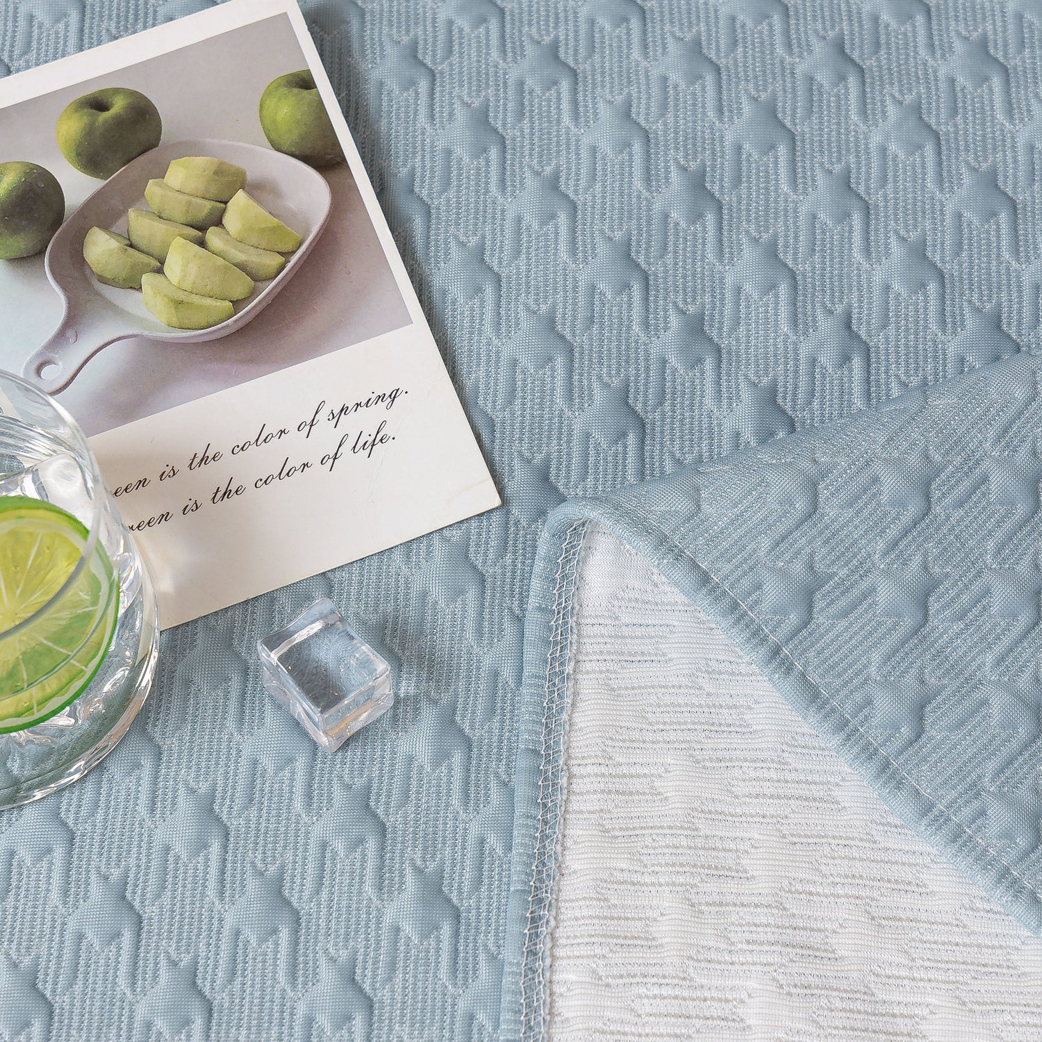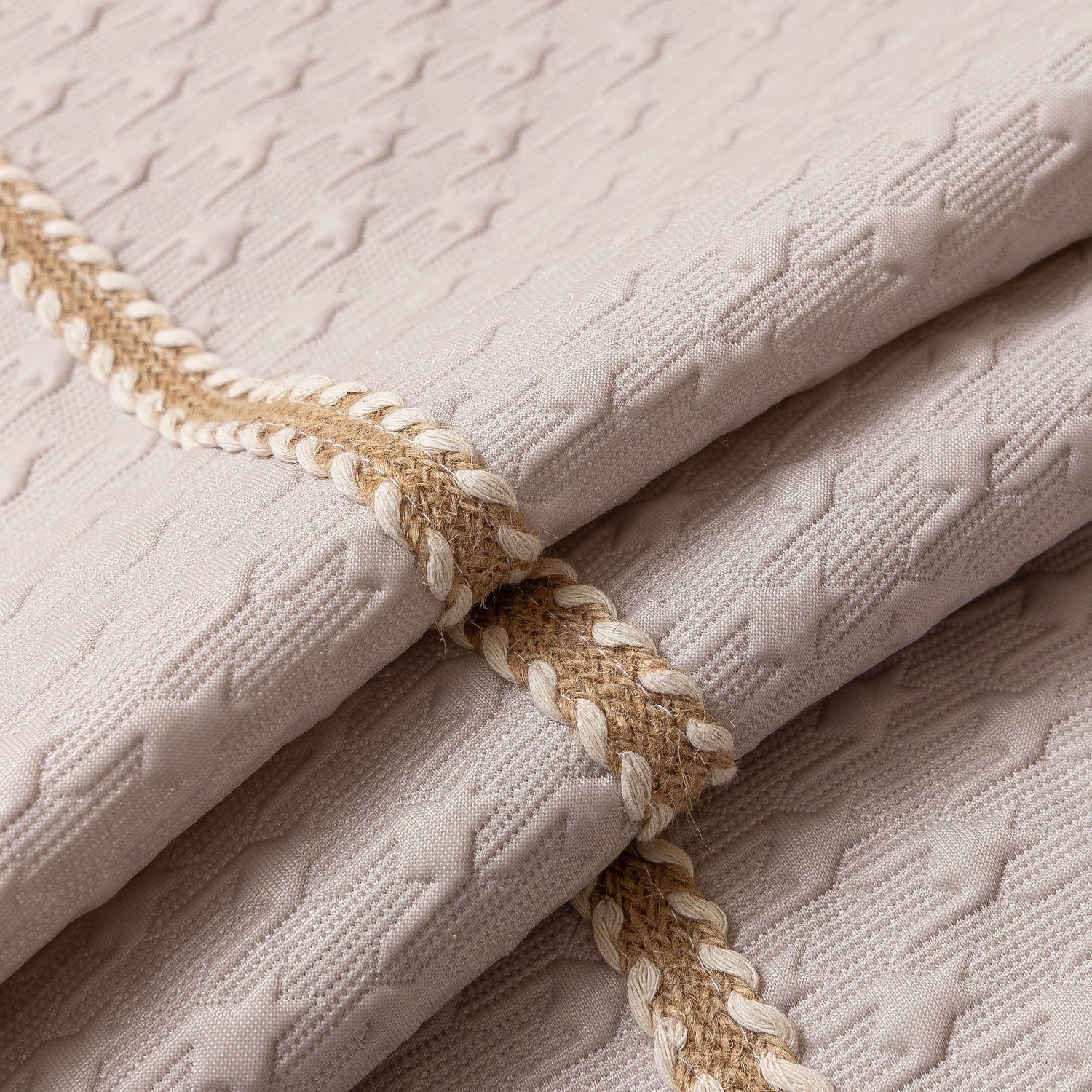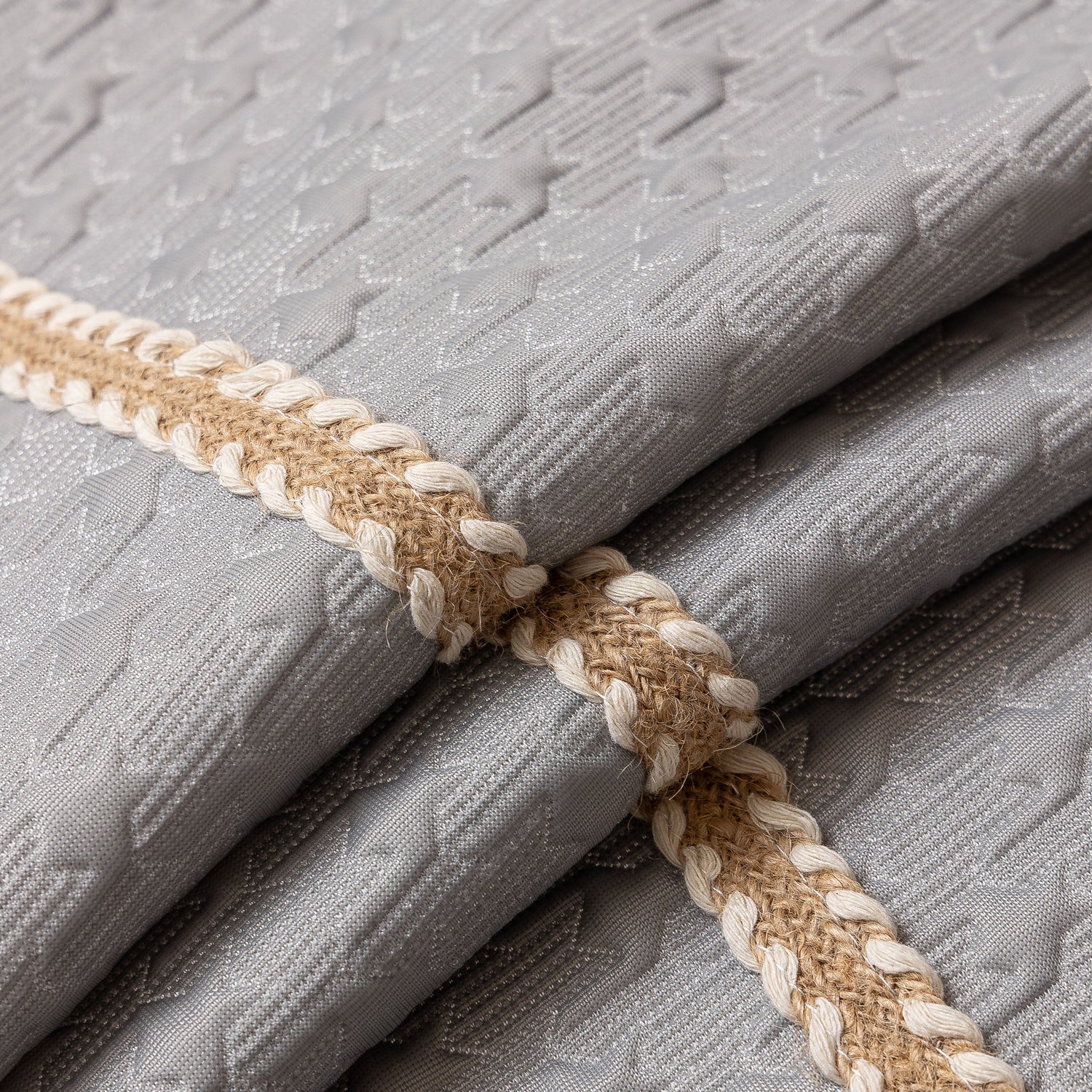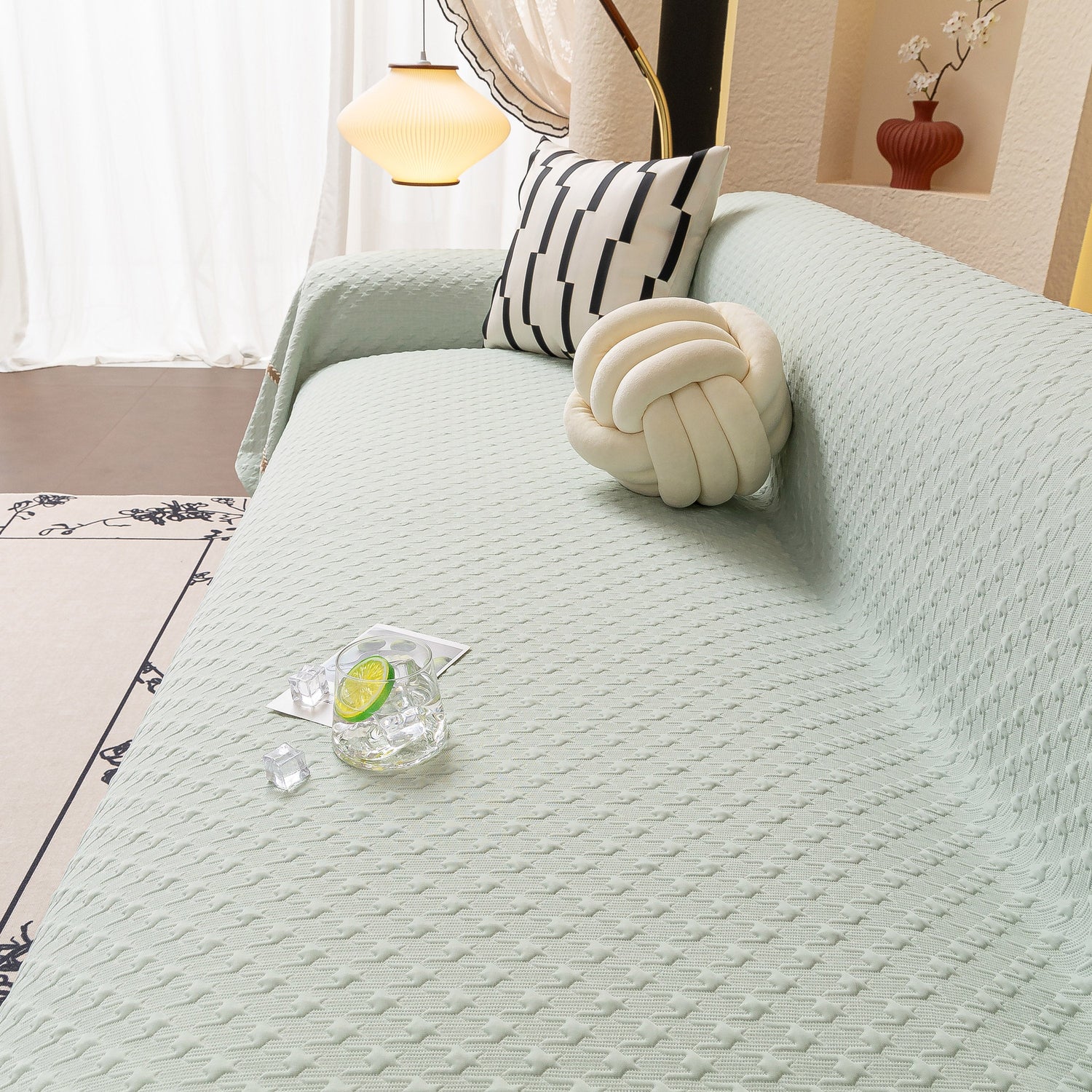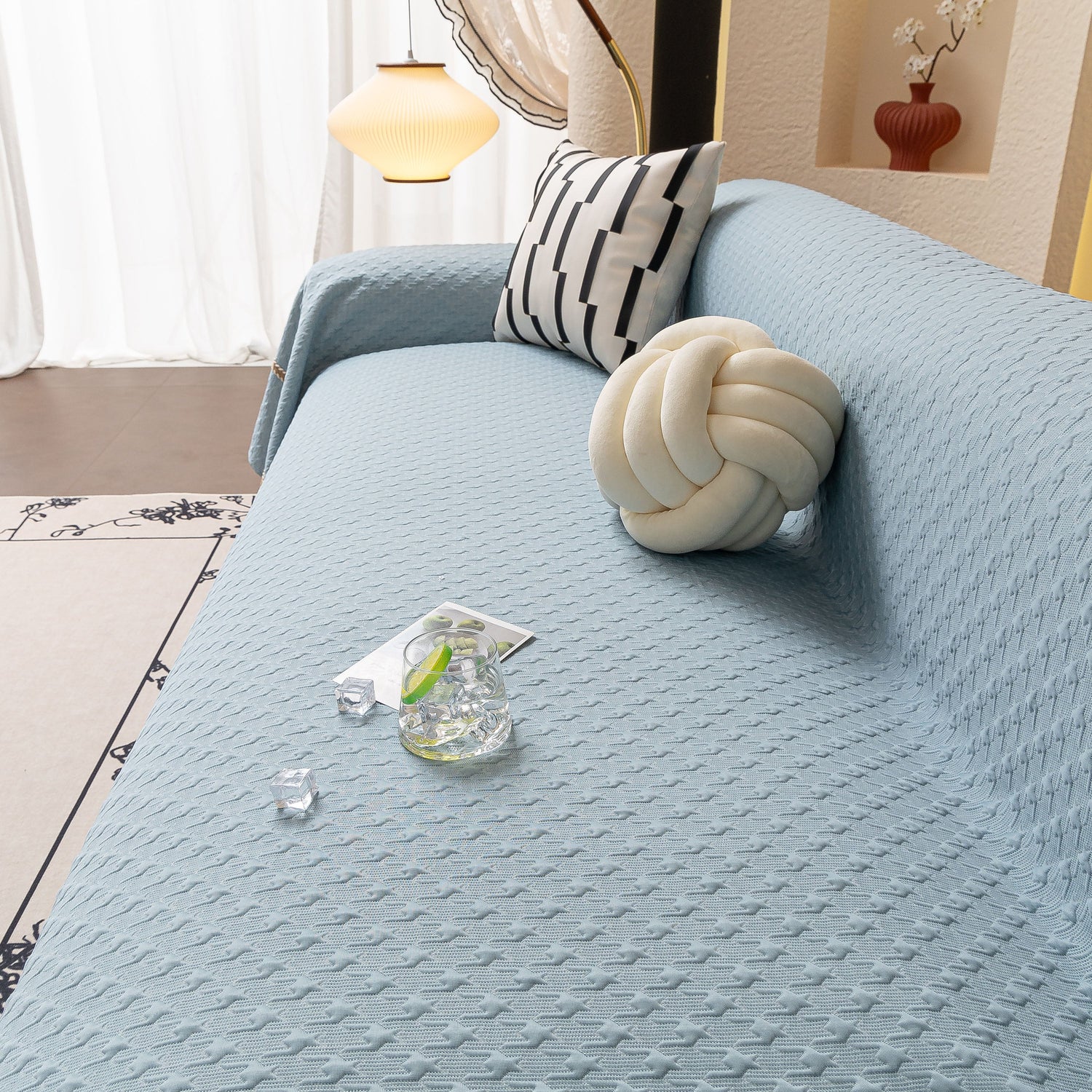 This sofa cover is made of smooth ice silk fabric, which is breathable, cool to the touch, and comfortable for use in warmer seasons. The surface features a woven houndstooth pattern formed through jacquard weaving, giving the fabric a fine texture with consistent, interlocking geometric shapes. A decorative gold braid trim runs along the edge, enhancing the overall finish and creating a refined look. The cover drapes naturally over various types of sofas and can be used to protect against dust, light stains, and pet hair. Suitable for both full-cover and partial layering, it is machine washable and retains its texture and shape after repeated laundering.