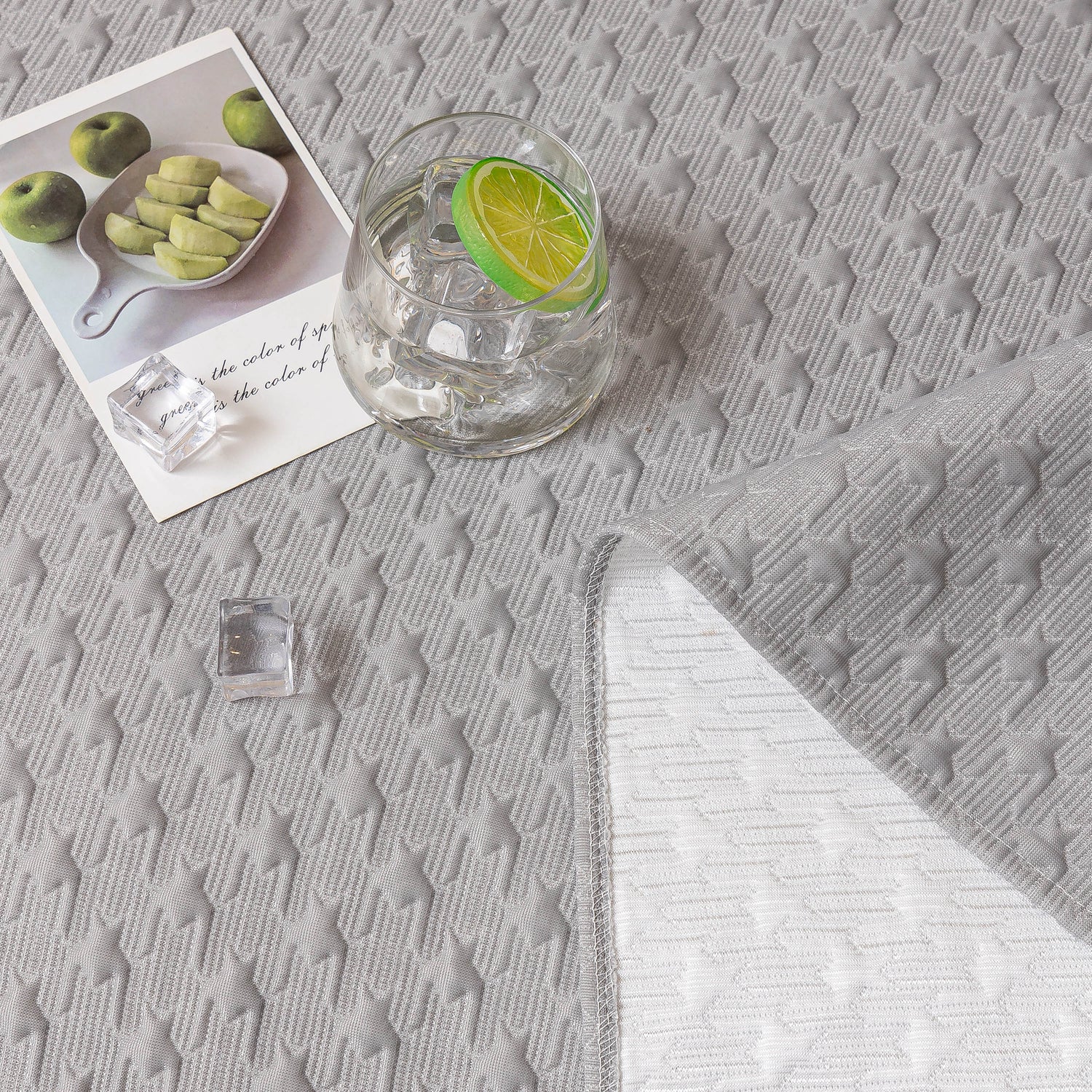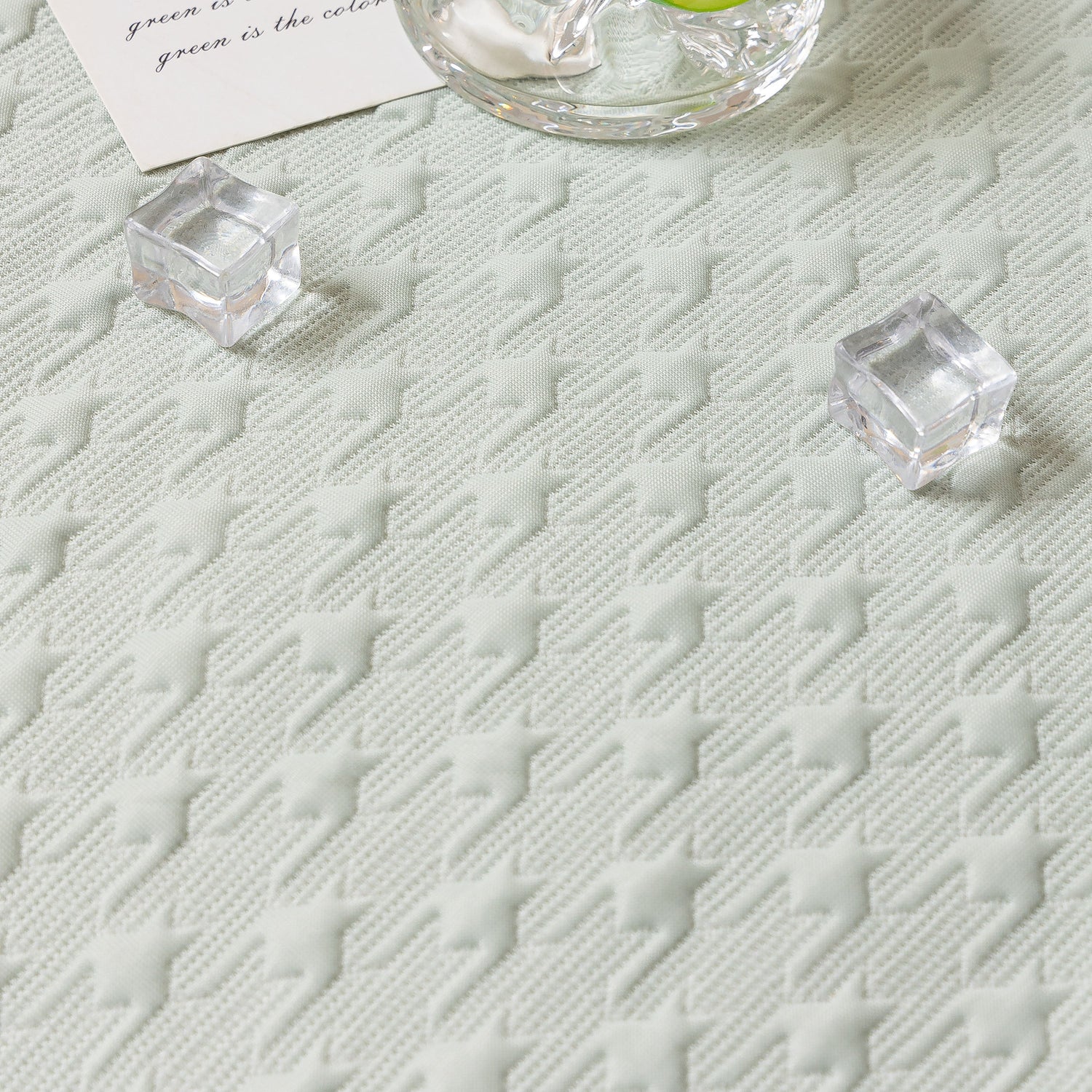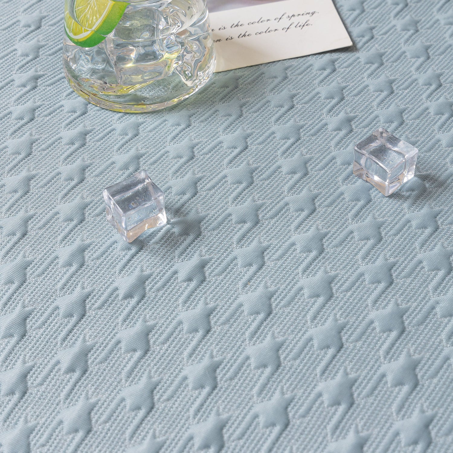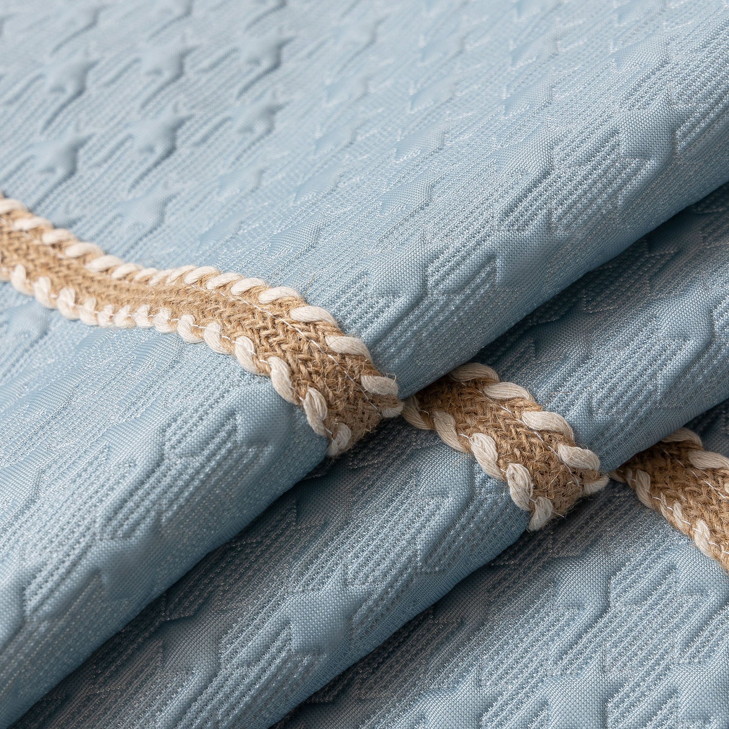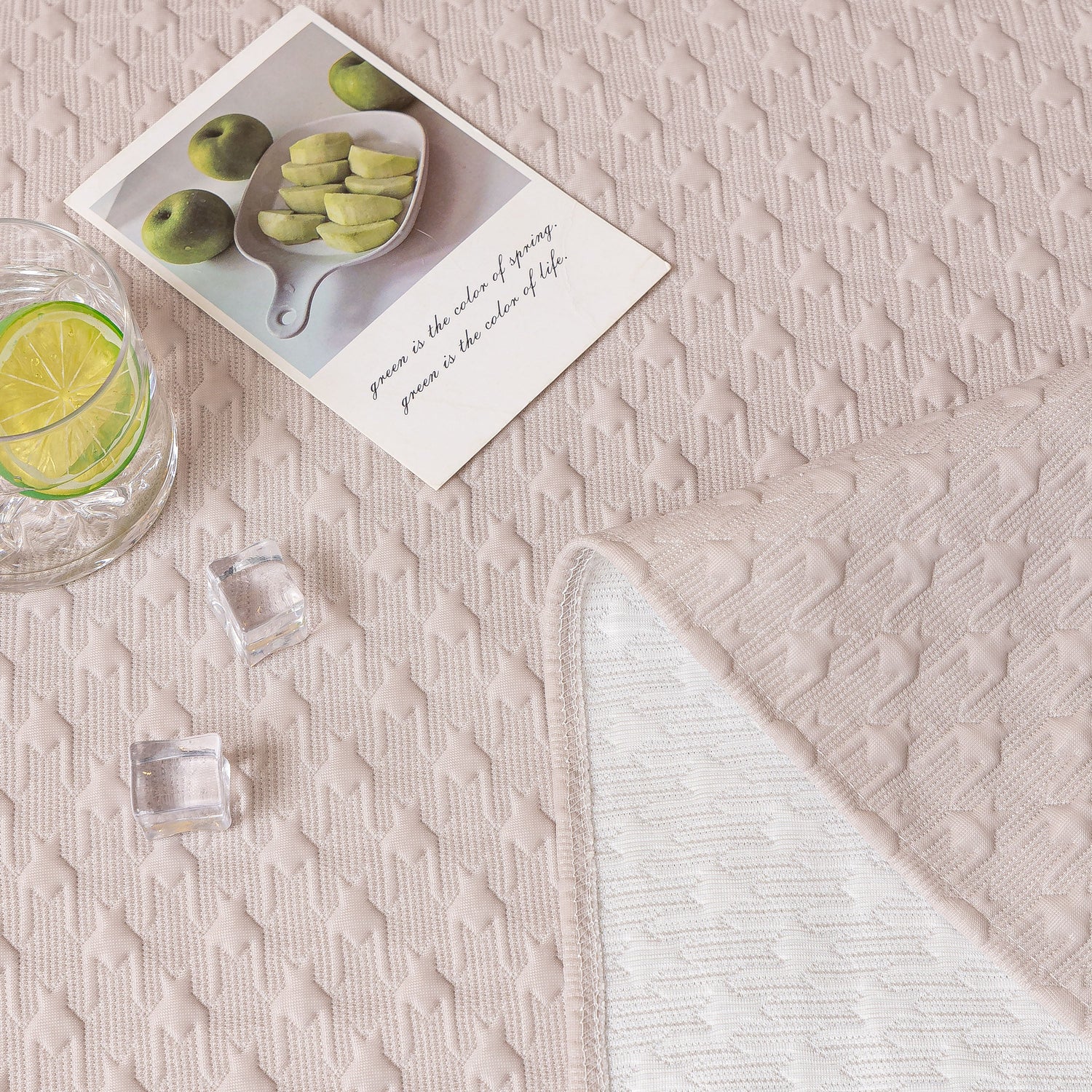This sofa cover is made of smooth ice silk fabric, which is breathable, cool to the touch, and comfortable for use in warmer seasons. The surface features a woven houndstooth pattern formed through jacquard weaving, giving the fabric a fine texture with consistent, interlocking geometric shapes. A decorative gold braid trim runs along the edge, enhancing the overall finish and creating a refined look. The cover drapes naturally over various types of sofas and can be used to protect against dust, light stains, and pet hair. Suitable for both full-cover and partial layering, it is machine washable and retains its texture and shape after repeated laundering.