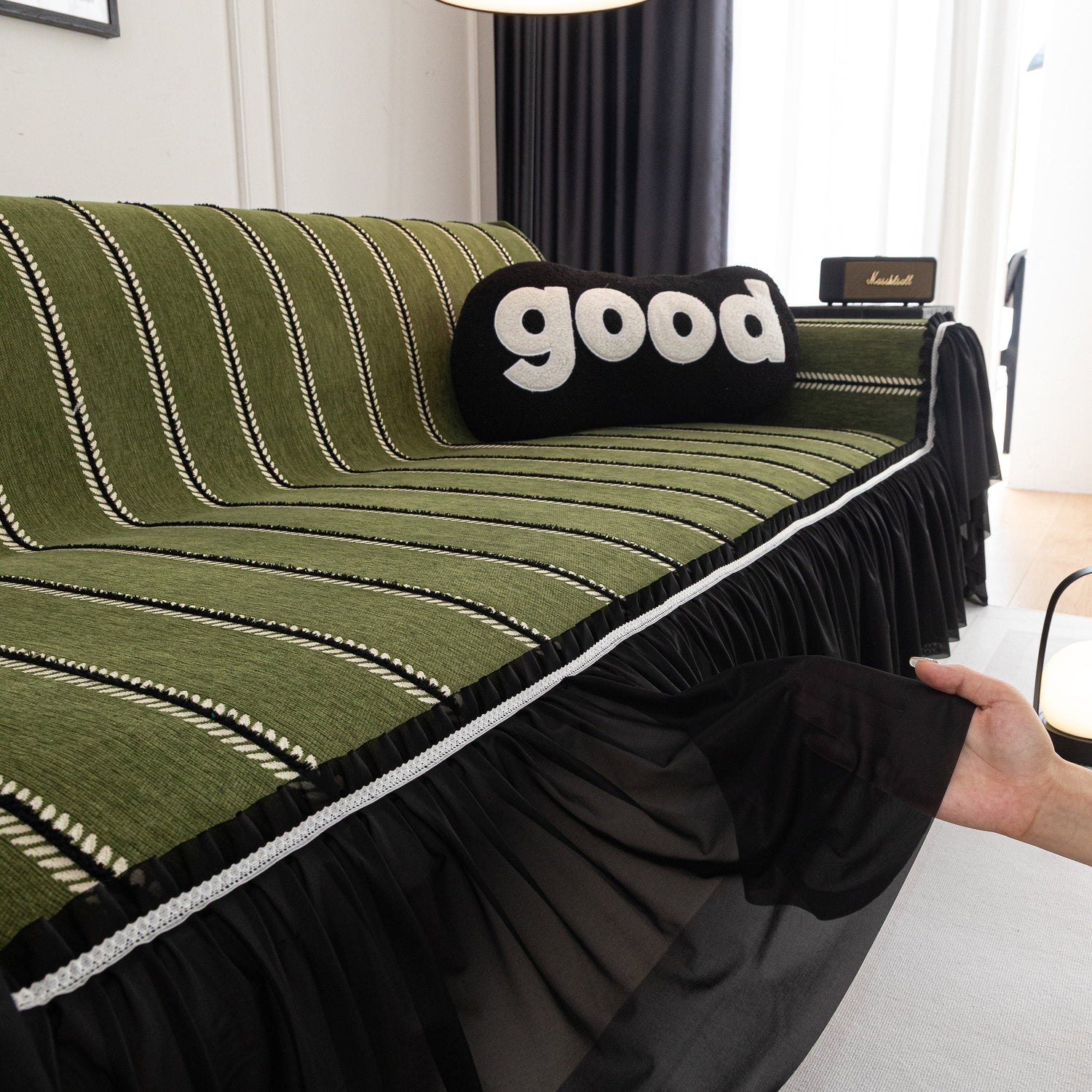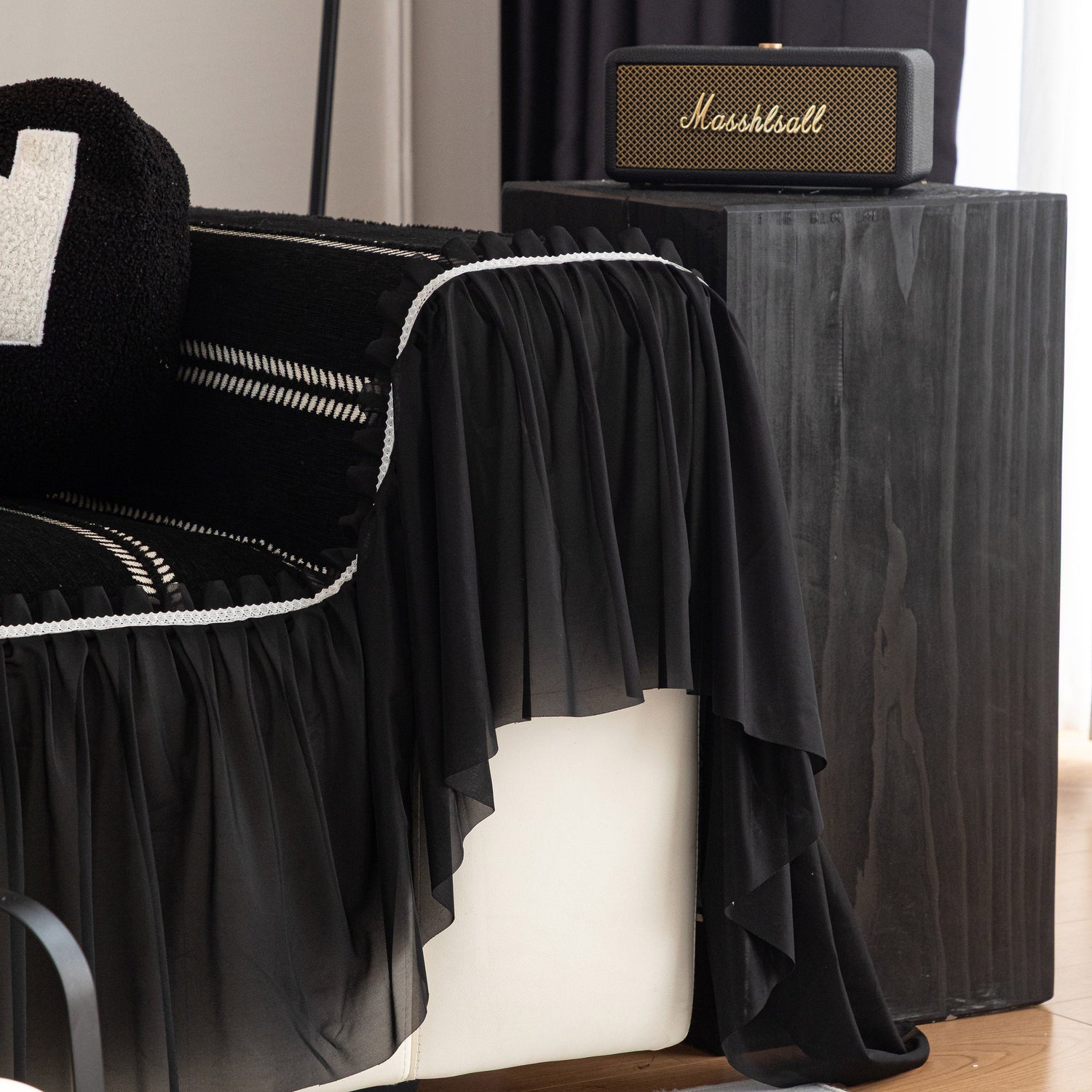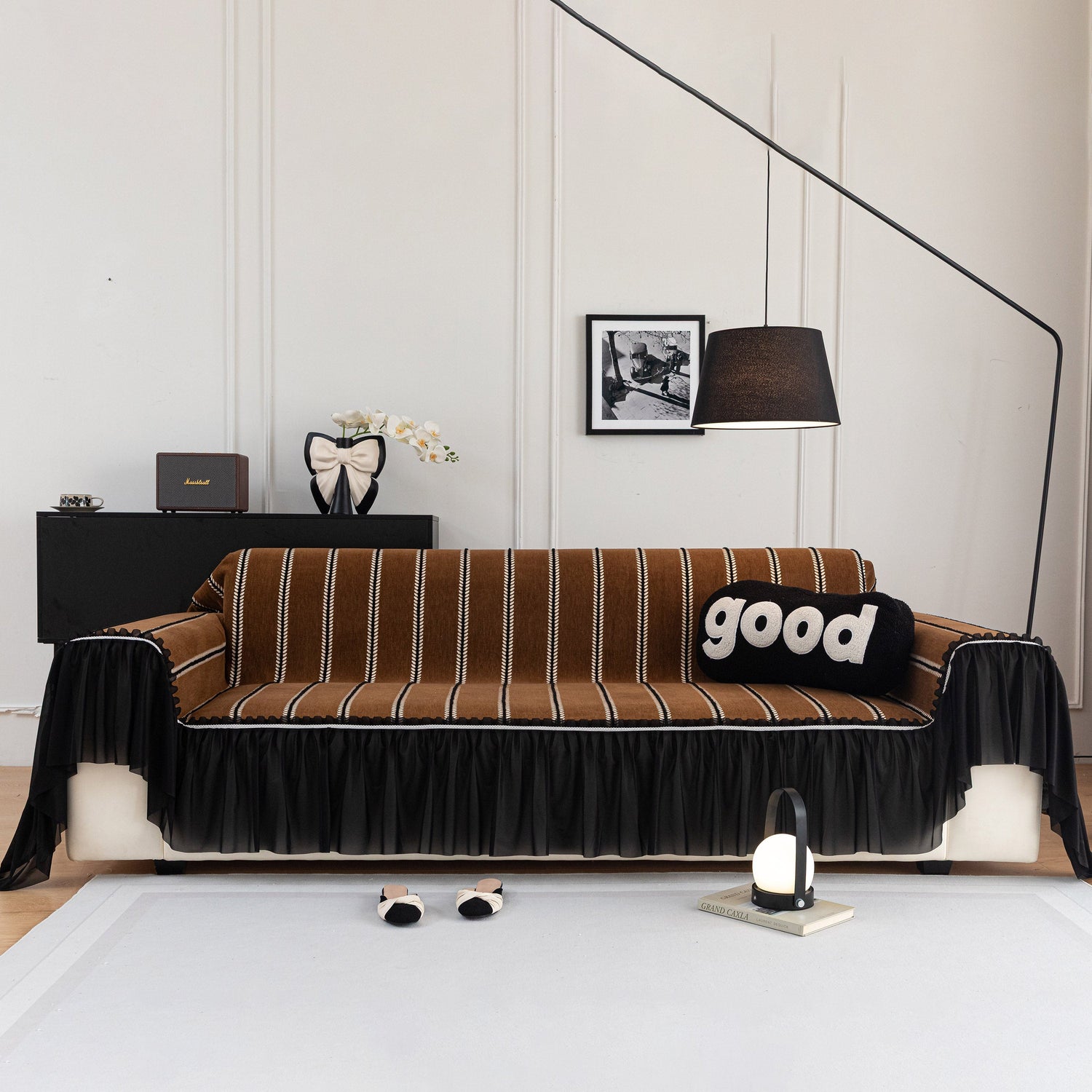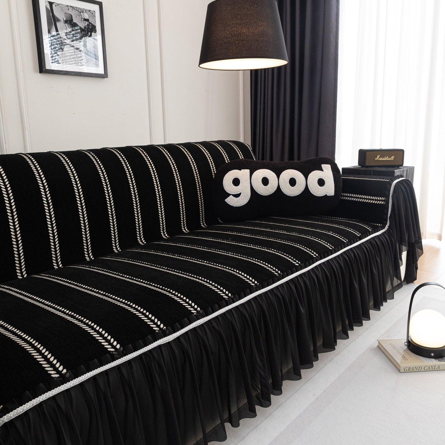 This all-season chenille sofa throw cover features elegant willow-leaf stripes and a flowing black chiffon skirt, bringing both decorative charm and practical protection. Ideal for covering seats, backs, and armrests, it guards against pets, dust, and daily wear. With multiple color options and a soft yet structured texture, it fits seamlessly into minimalist, Nordic, Japanese, or modern luxury interiors.