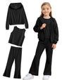 [【Longsleeve 3 piece set with Jacket tank top and flared pant】: Girls 3 piece Sweatsuit set contains Crop Tank topZipper Hoodie Jacket and Bell bottom pants a whole fashion look for your little girl long sleeve jacket with hoodie waffle texture solid tank top and bell bottom Split pant each piece is vintage and unique can be worn together as casual daily set or worn separately as basic layershirt hooded windbreaker or stylish pants for more look depending on the look your girl wants "【Comfy Material】-The solid girl 3 piece set is comfy stretchy knit fabric skin-friendly breathable soft and comfortable to wear. Not fade or itchy. Suitable for spring Summer autumn and winter inner tank is also a perfect layer under a sweater jacket or trench coat drop shoulder jacket keep warm when cold split flared pants show a trendy chill look perfect for kids everyday essentials creating a more casual feel" 【Classic for Daily or Gathering】-Kid girl 3 piece pants set with hoodie/Elastic pants waist & jacket hem/ crewneck tank top design/Thick soft knit fabric and Solid colors. Waffle pattern adds extra texture and makes this school clothing set even more sophisticated ideal yearround set for girl "【Warm Tips】-Our Size is Standard US Size. Also If you are not sure of your size Please read the Size Information of Product description in order to choose her own size!Were here to help you embrace your own signatures style with our girls fall outfits and get a new look sorted in this seasons hottest trends" Package: 1*Jacket+1*Tank top+1*Pants / GARMENT CARE:Machine Wash / Hand Wash(recommend Hand washbetter with water under 40℃) / Dry Clean / hang or line dry / do not bleach]