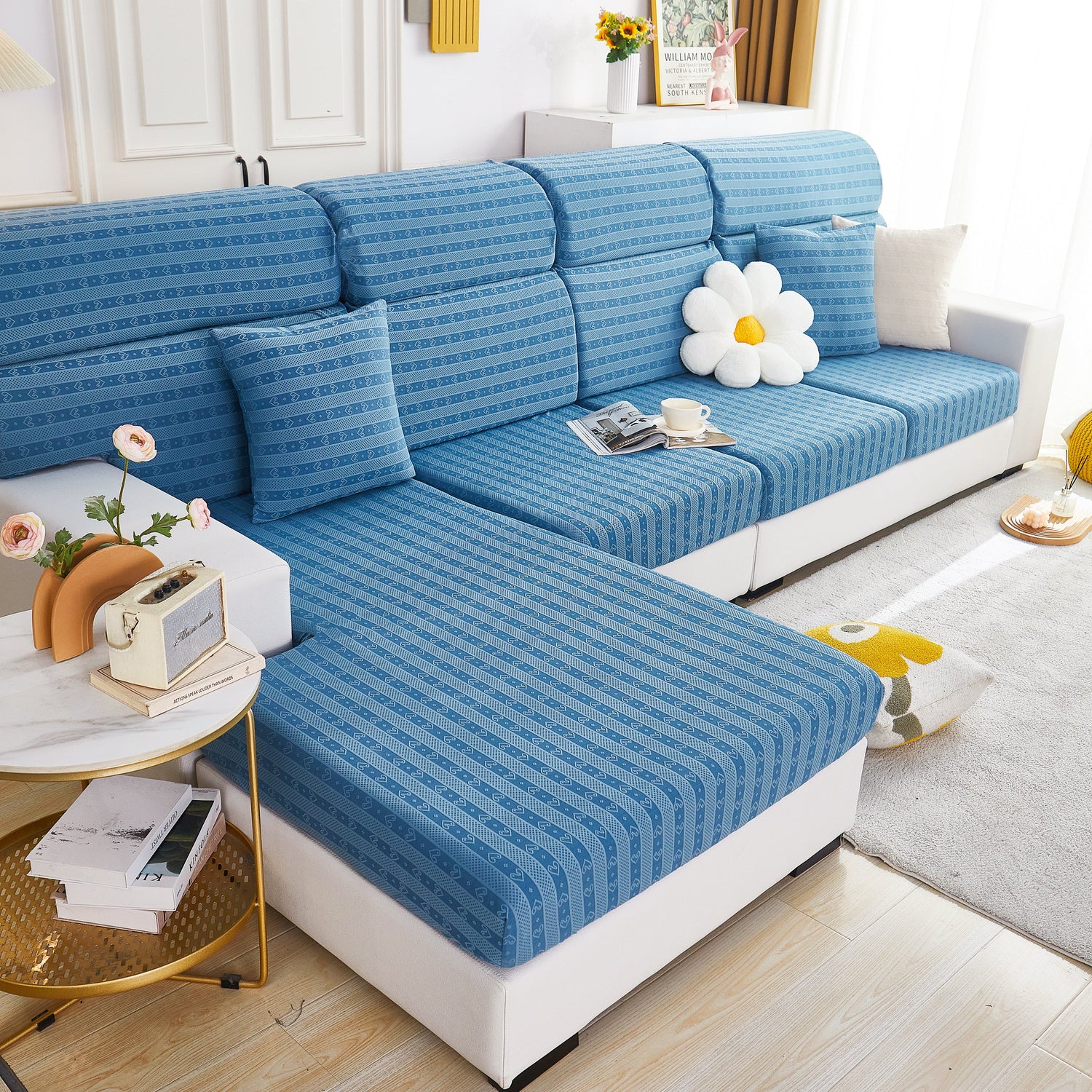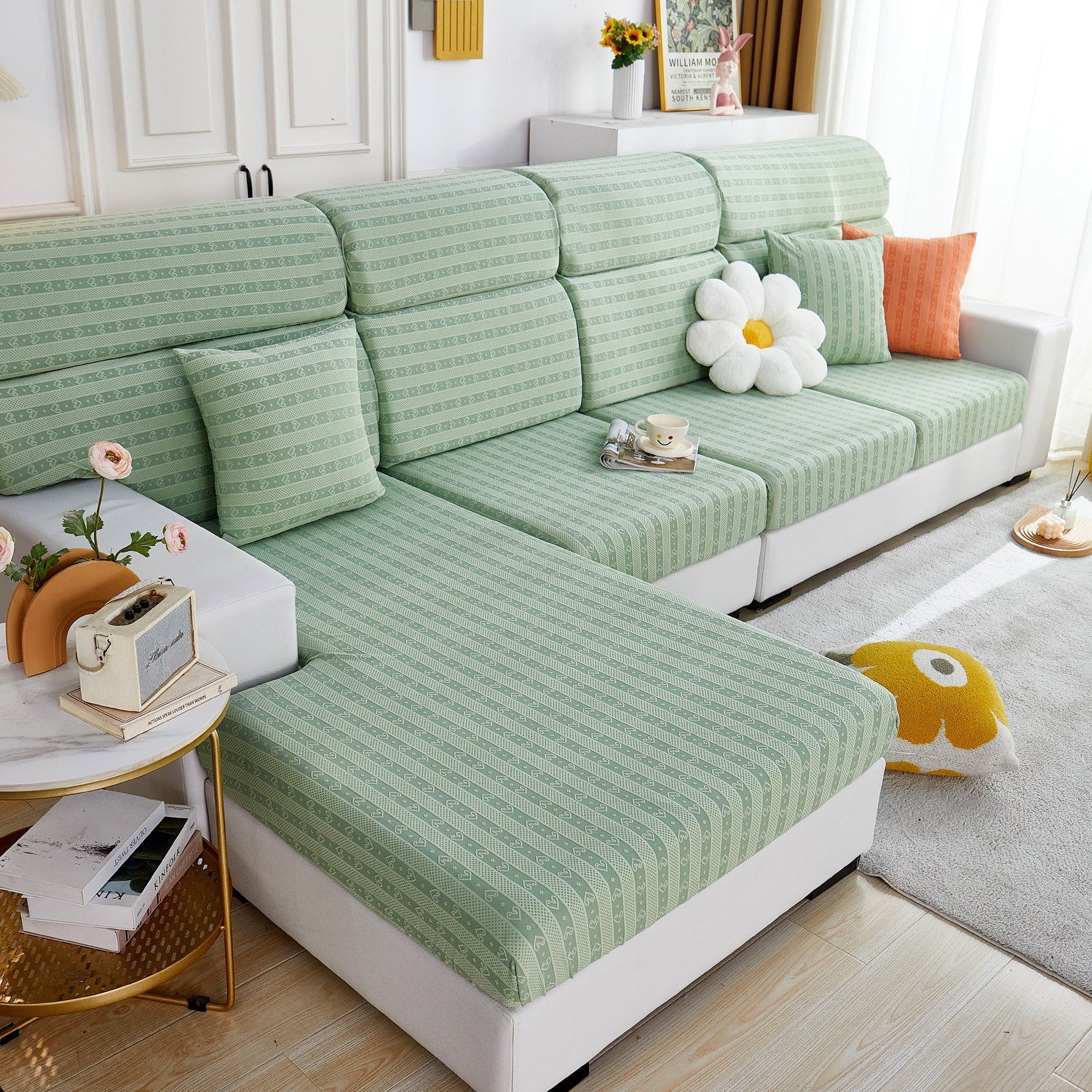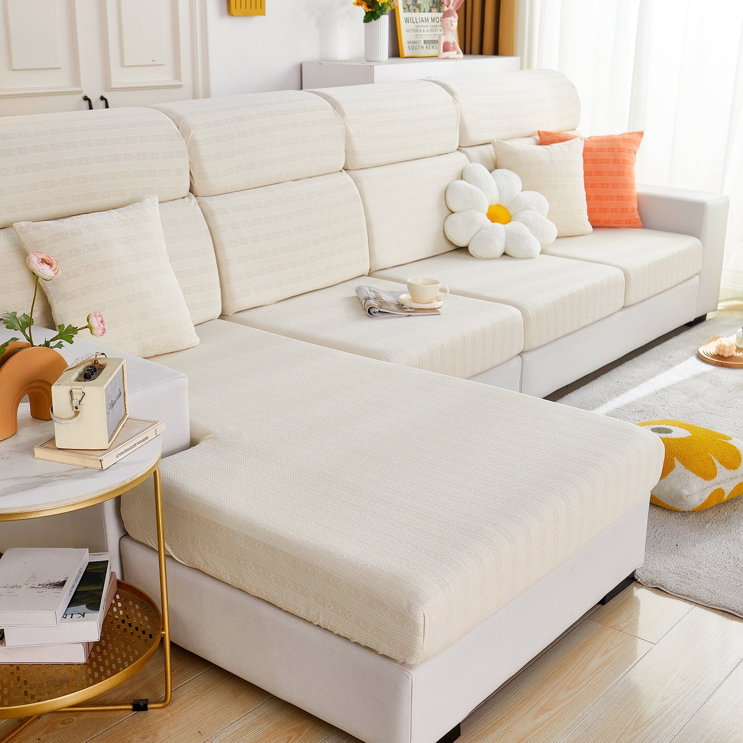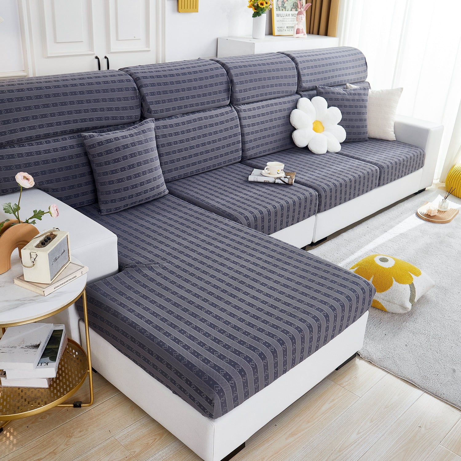 Love Stripe Jacquard Fleece Fabric Stretch Cushion Cover, Non-Slip Furniture Protector for Kids, Couch Cushion Covers