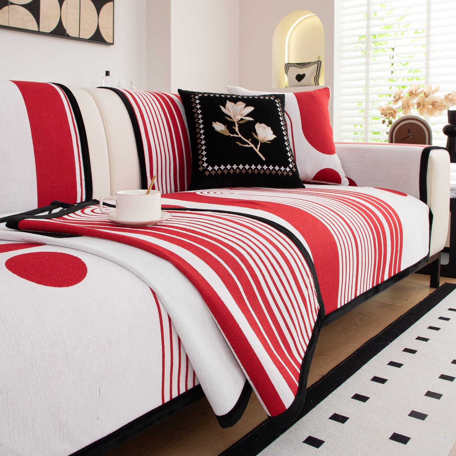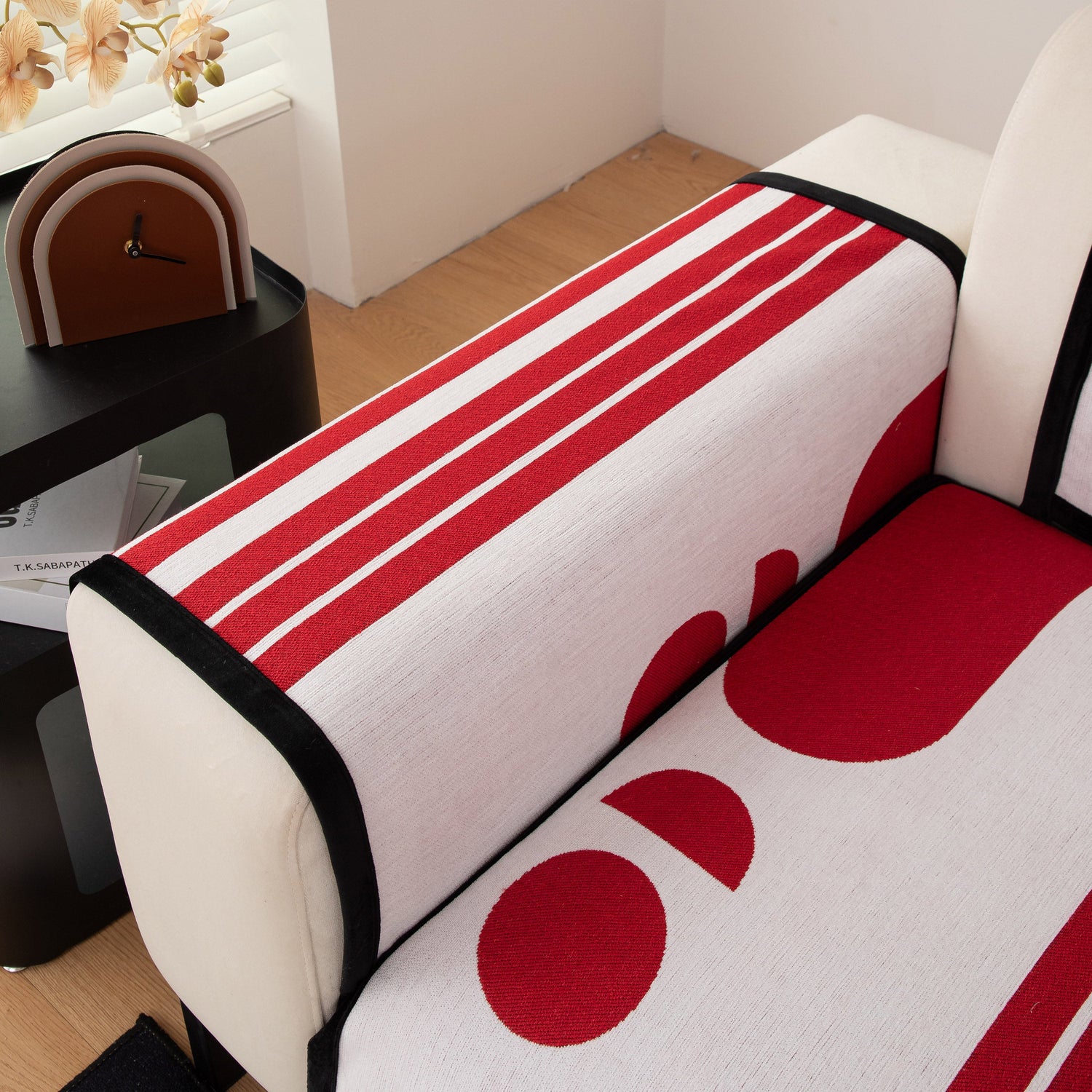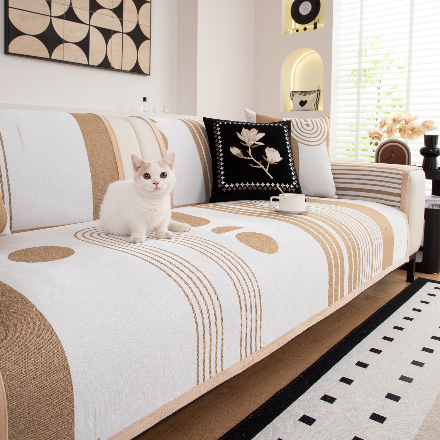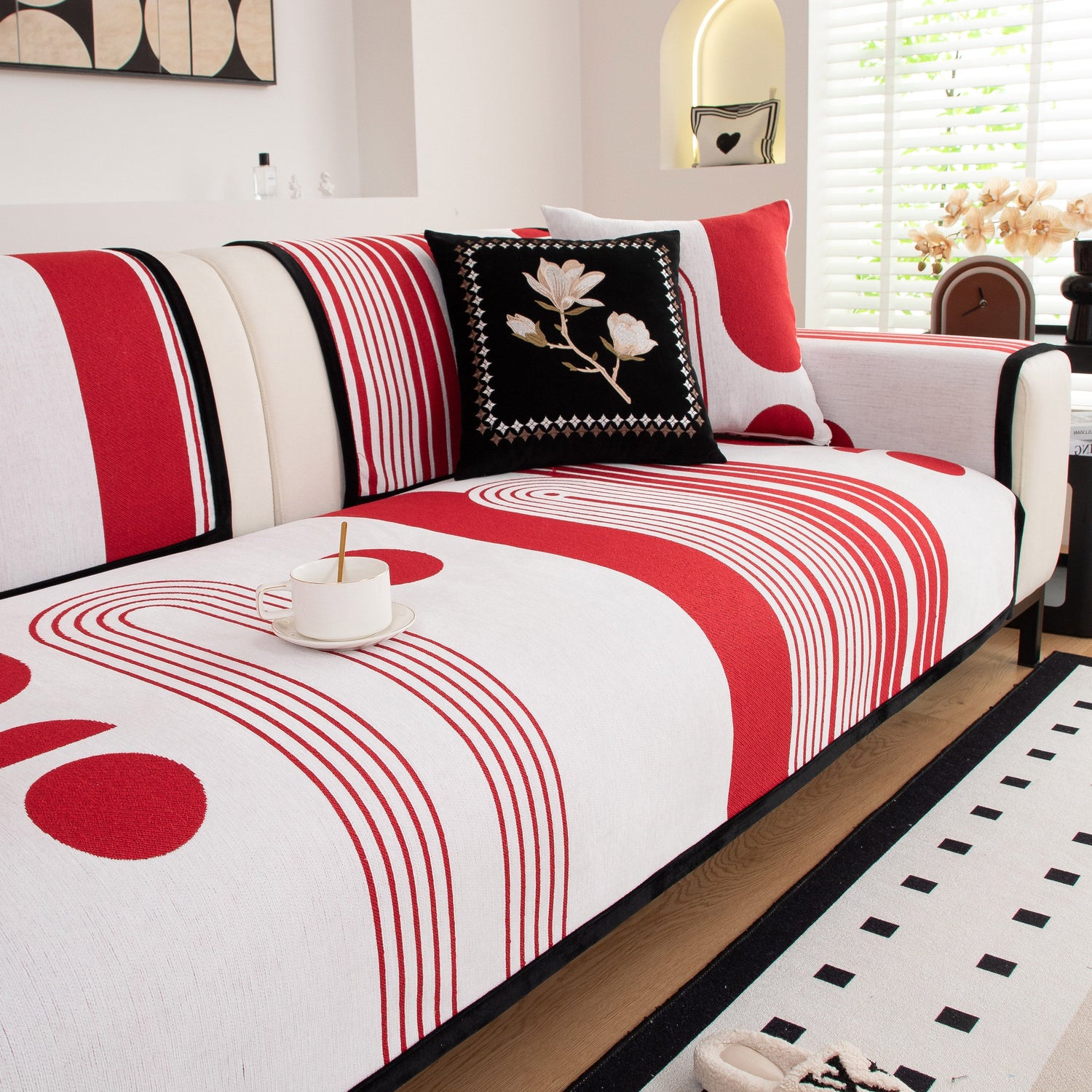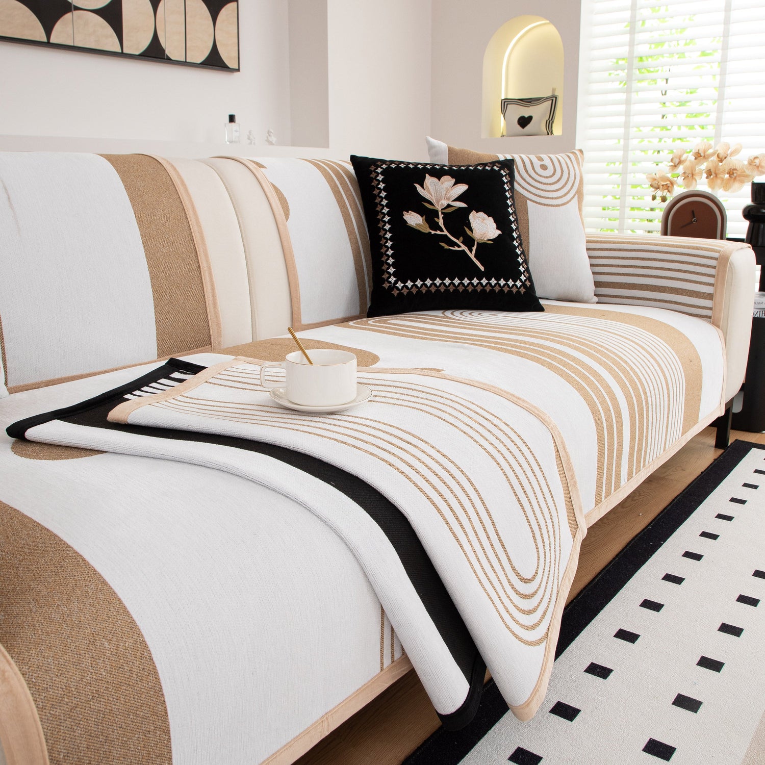 This modern sofa cover is designed with both aesthetics and practicality in mind. The front side features a soft-touch chenille fabric, woven with bold curves and circular patterns that lend a modern, architectural feel to the room. The back side is lined with anti-slip silicone dots to help reduce shifting during everyday use.
