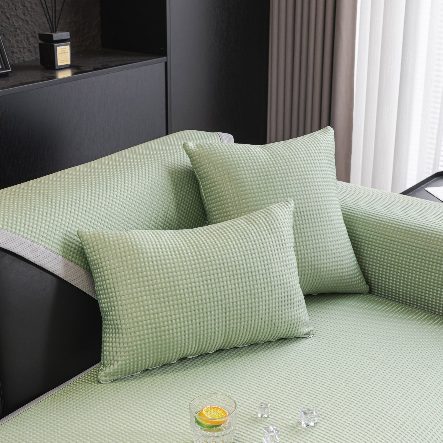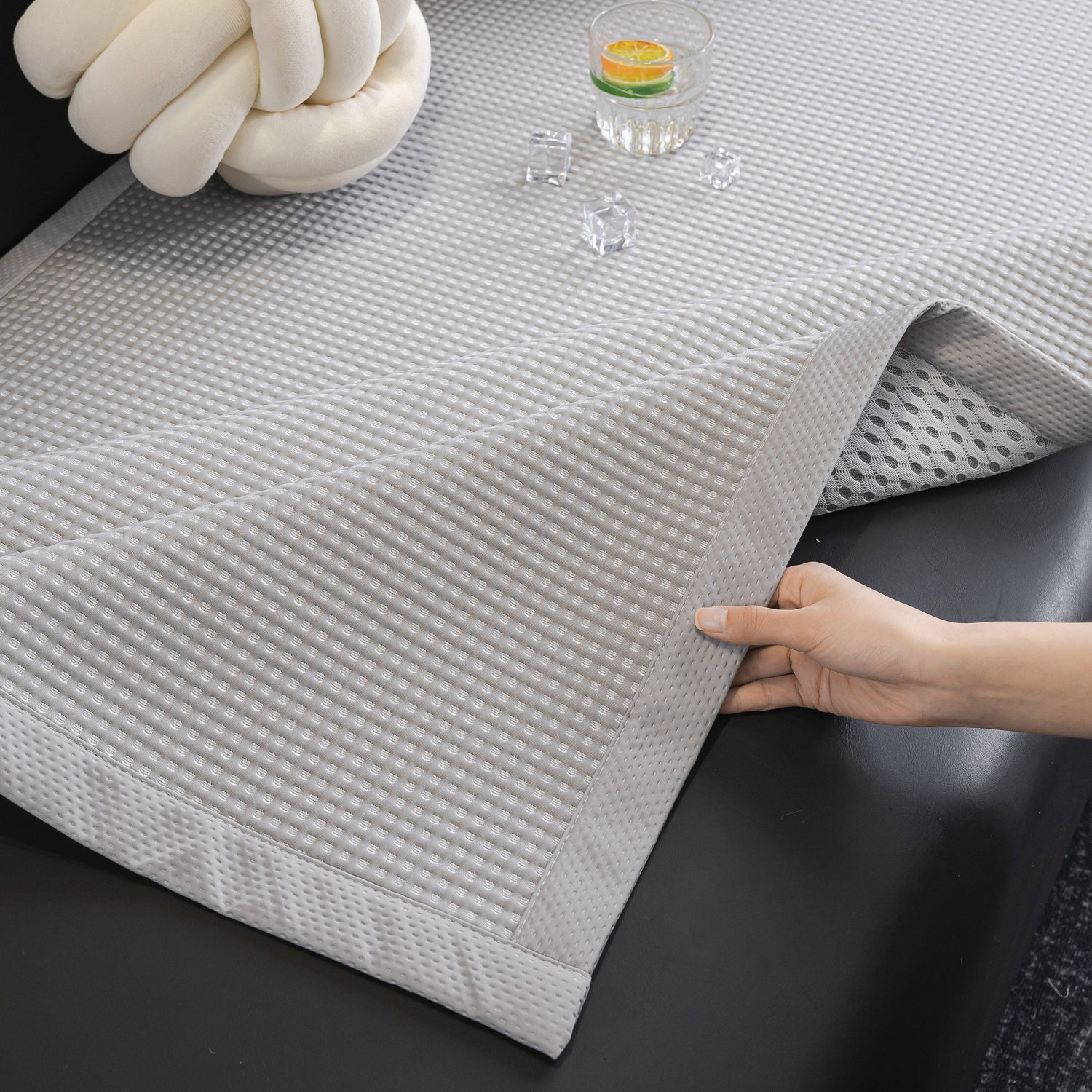 This cooling breathable couch protector towel features a cool-to-the-touch ice silk surface and a ventilated, anti-slip mesh backing that keeps your seating area dry and comfortable even on hot days. Its clean texture and smooth matte finish offer a fresh, understated look that complements both modern and casual interiors.