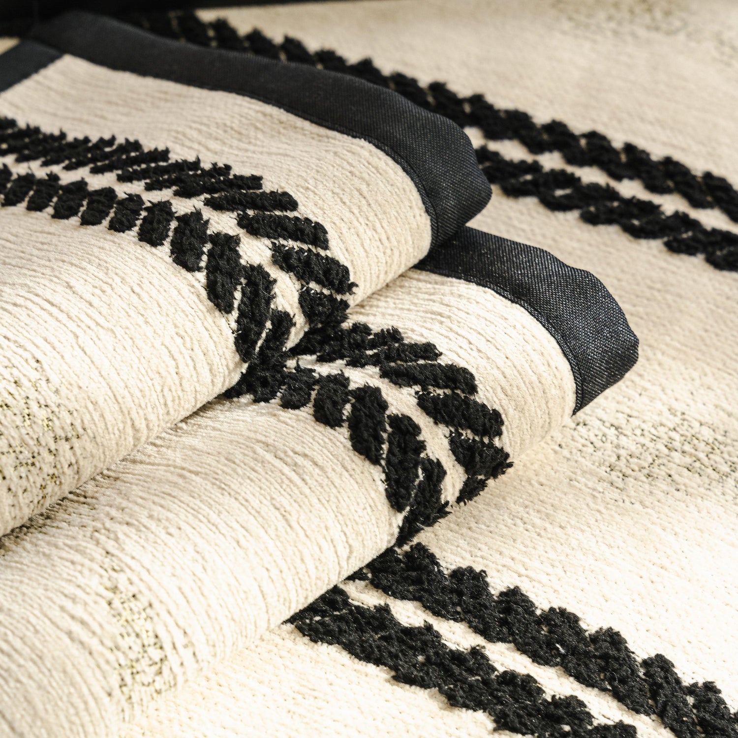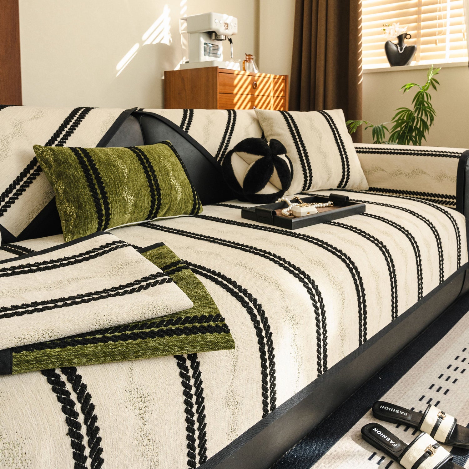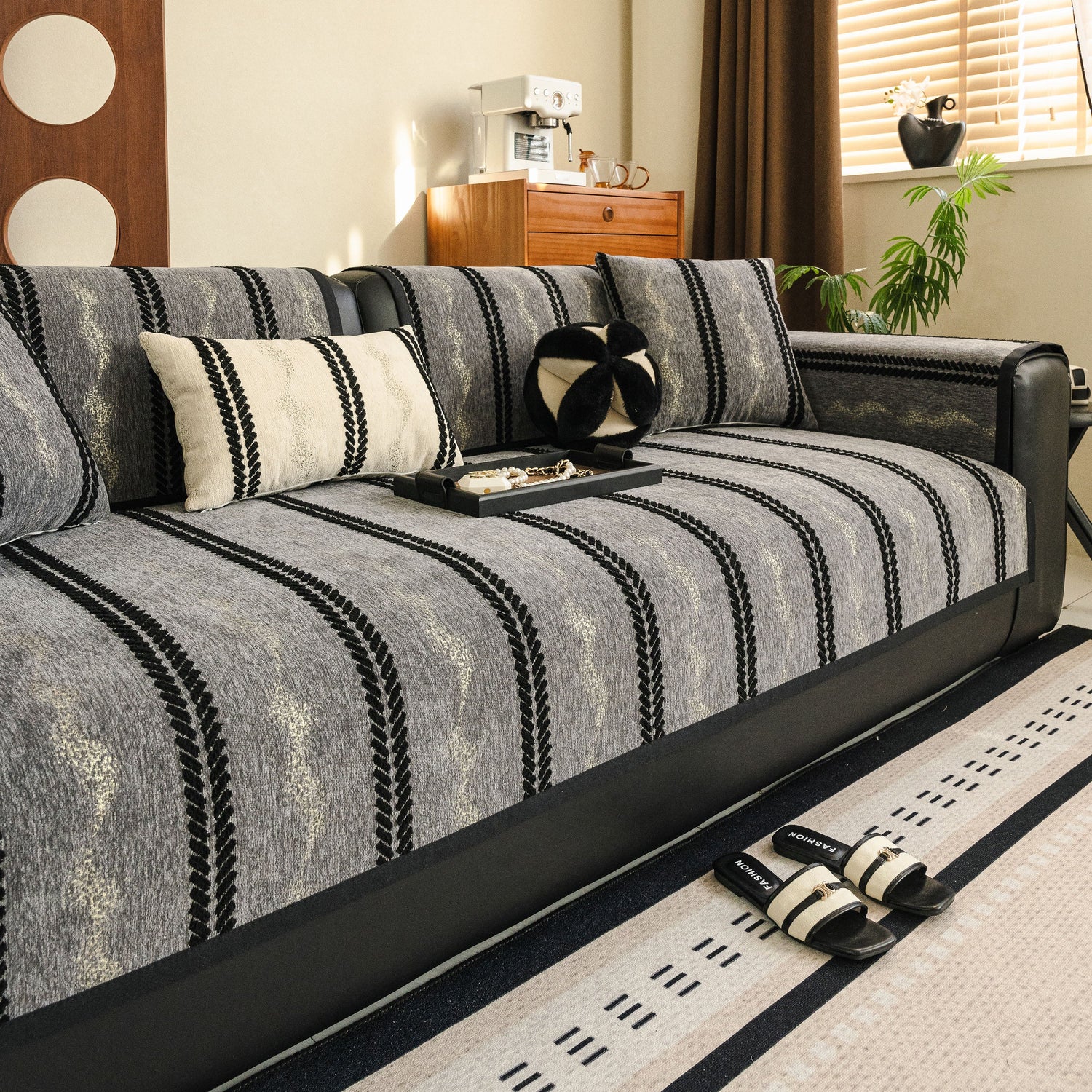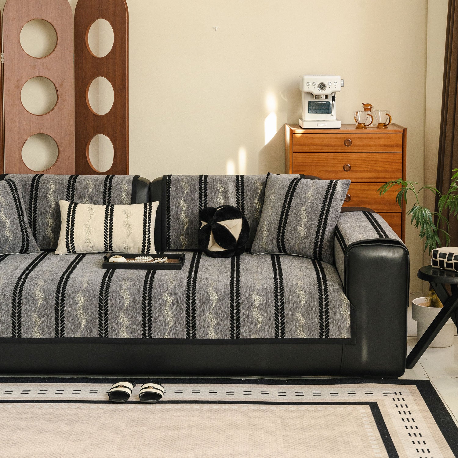 This chenille sofa cover combines vertical stripes with rope-like 3D woven trim, crafted using a thick twill weave for a modern, textured look. The soft, skin-friendly fabric adds comfort, while the silicone anti-slip backing keeps it in place on both fabric and leather sofas.