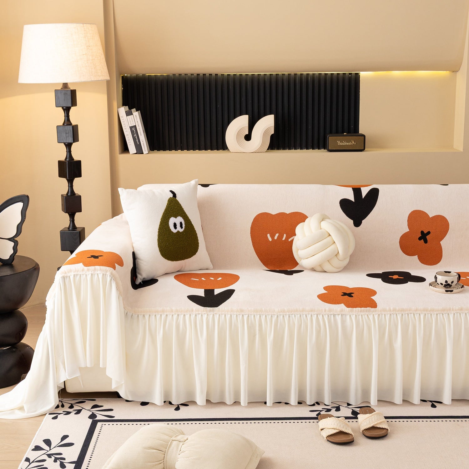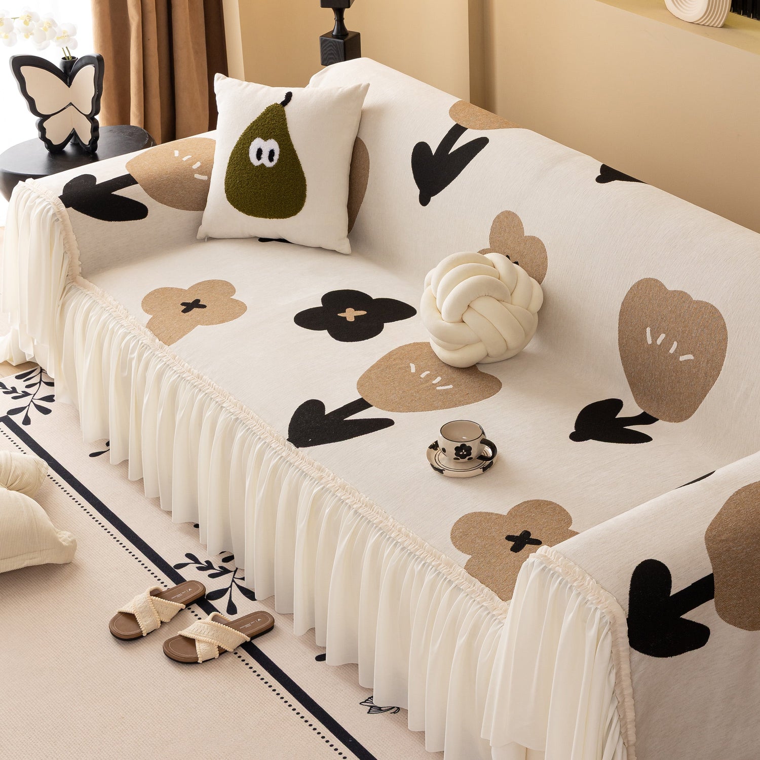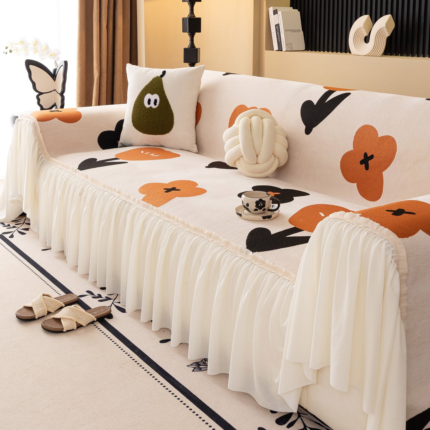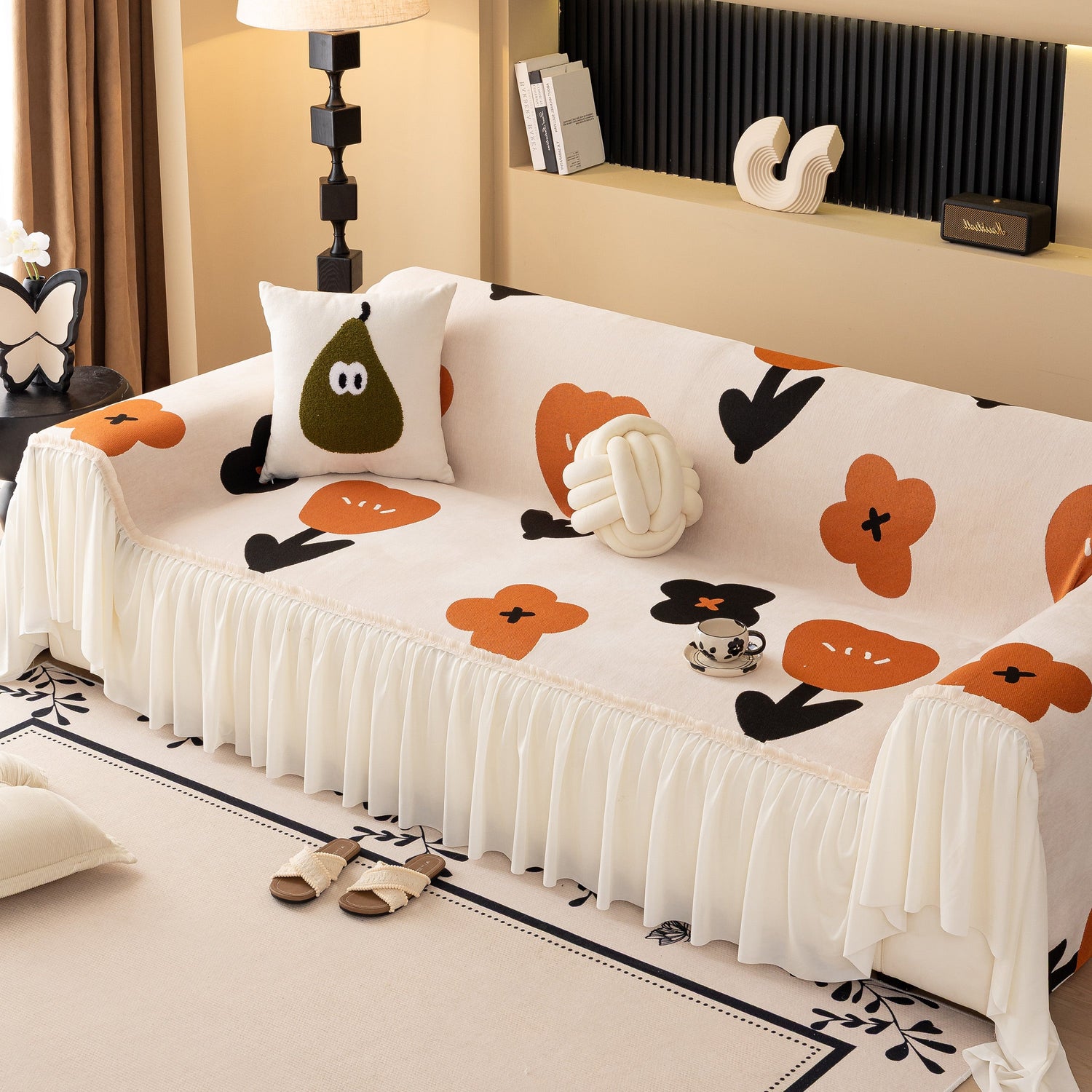 This decorative retro sofa cover features a bold floral pattern and is made from medium-weight chenille fabric, which is soft, breathable, and gentle to the touch. The cover includes a pleated sheer skirt made from chiffon-like material that runs along the bottom and sides, adding a light and airy detail.