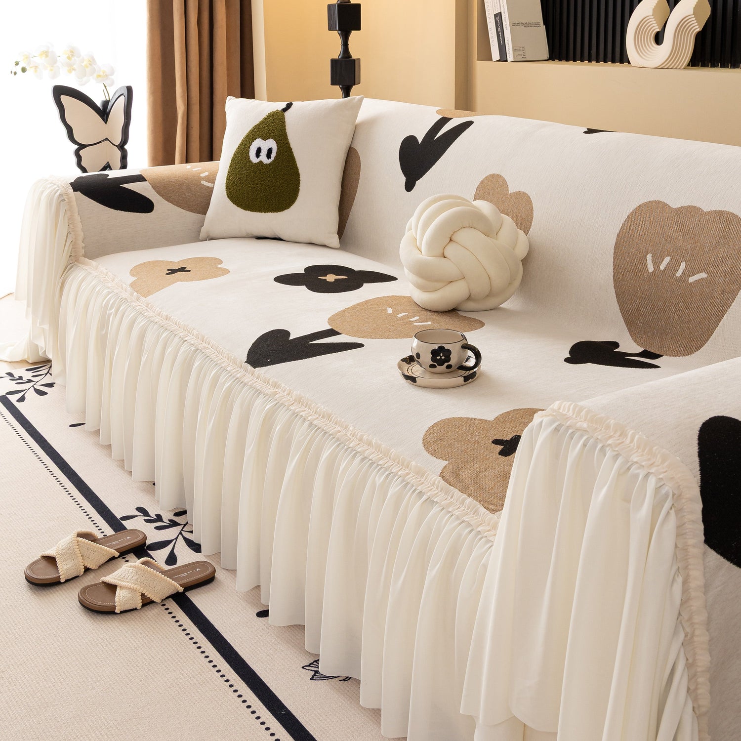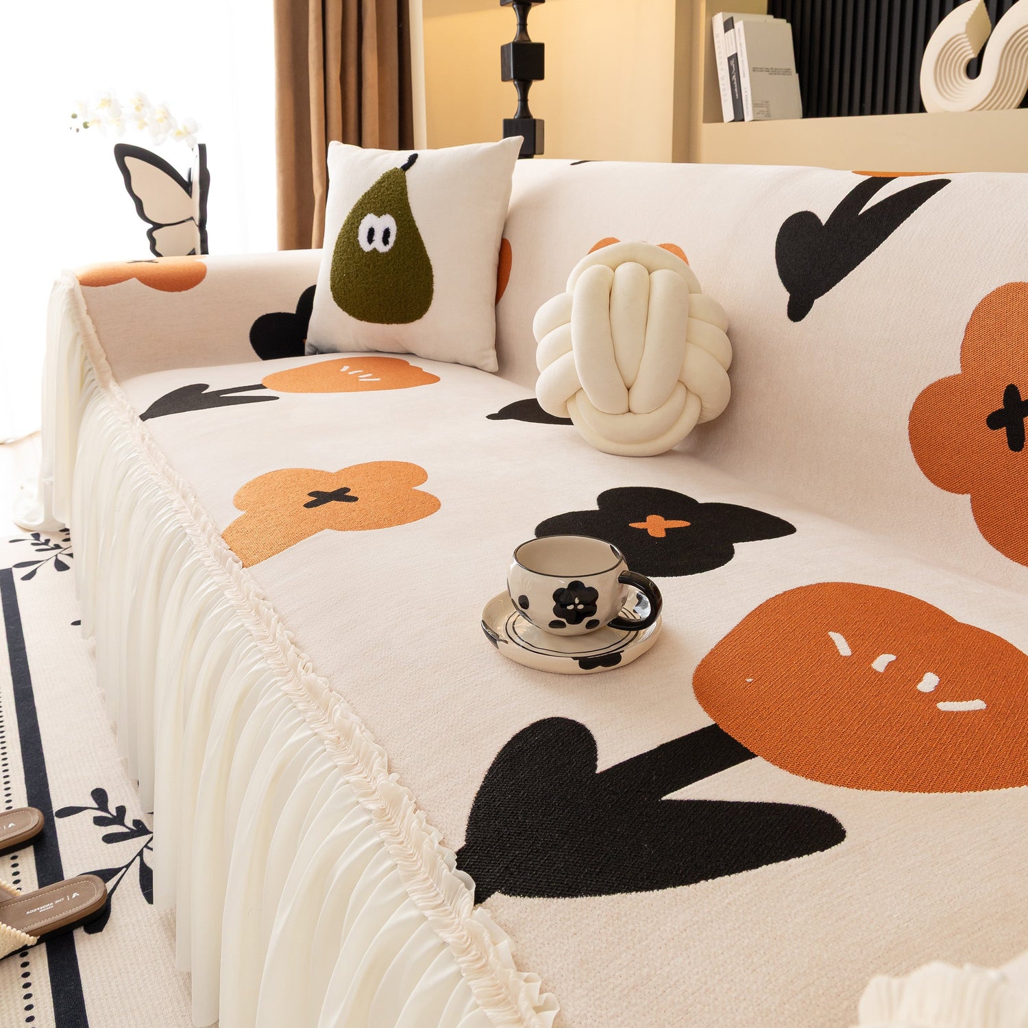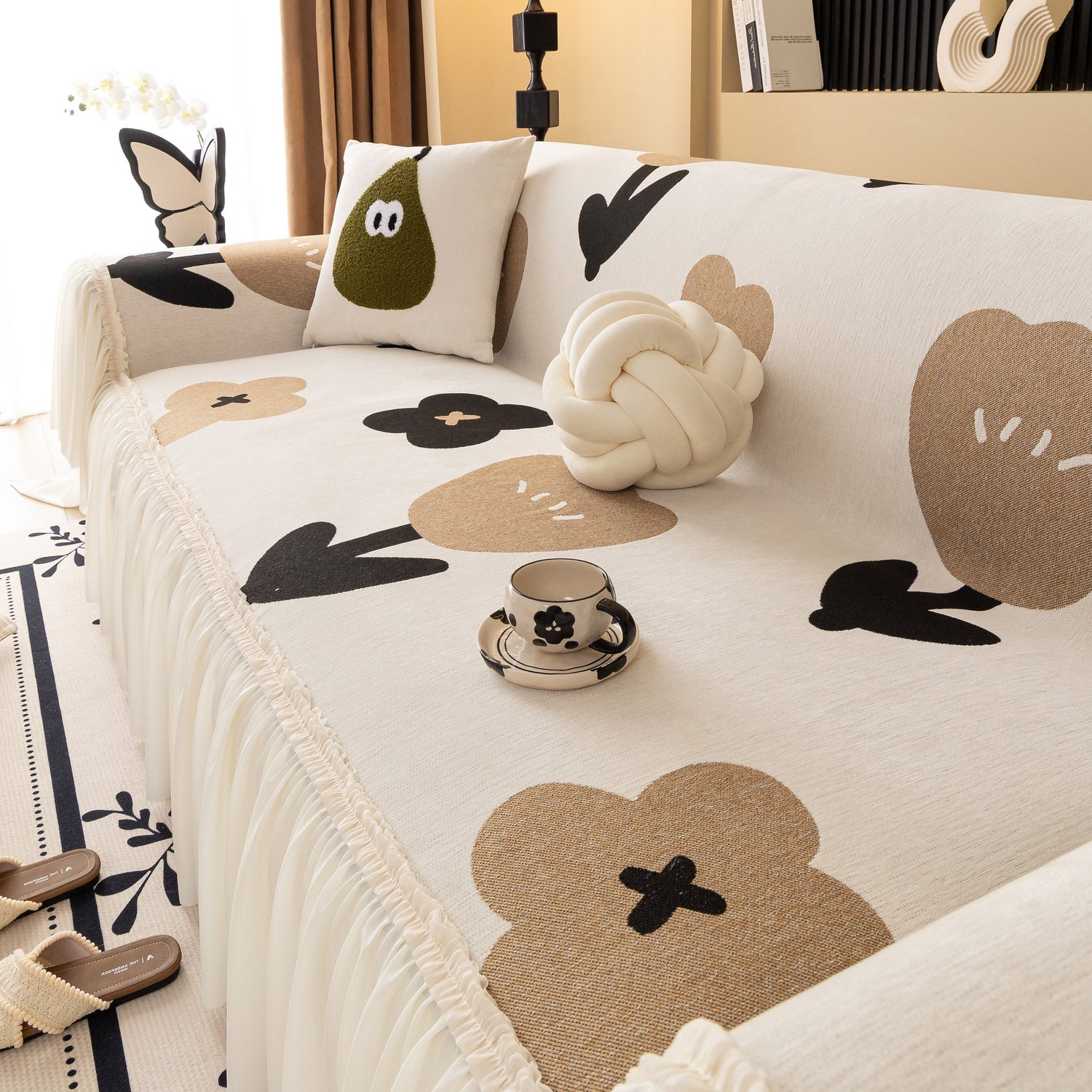 This decorative retro sofa cover features a bold floral pattern and is made from medium-weight chenille fabric, which is soft, breathable, and gentle to the touch. The cover includes a pleated sheer skirt made from chiffon-like material that runs along the bottom and sides, adding a light and airy detail.