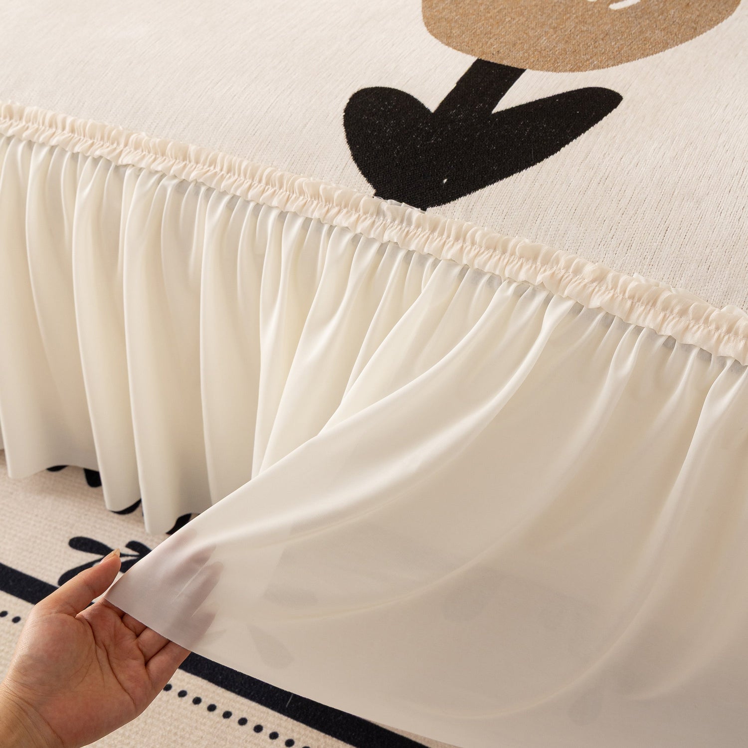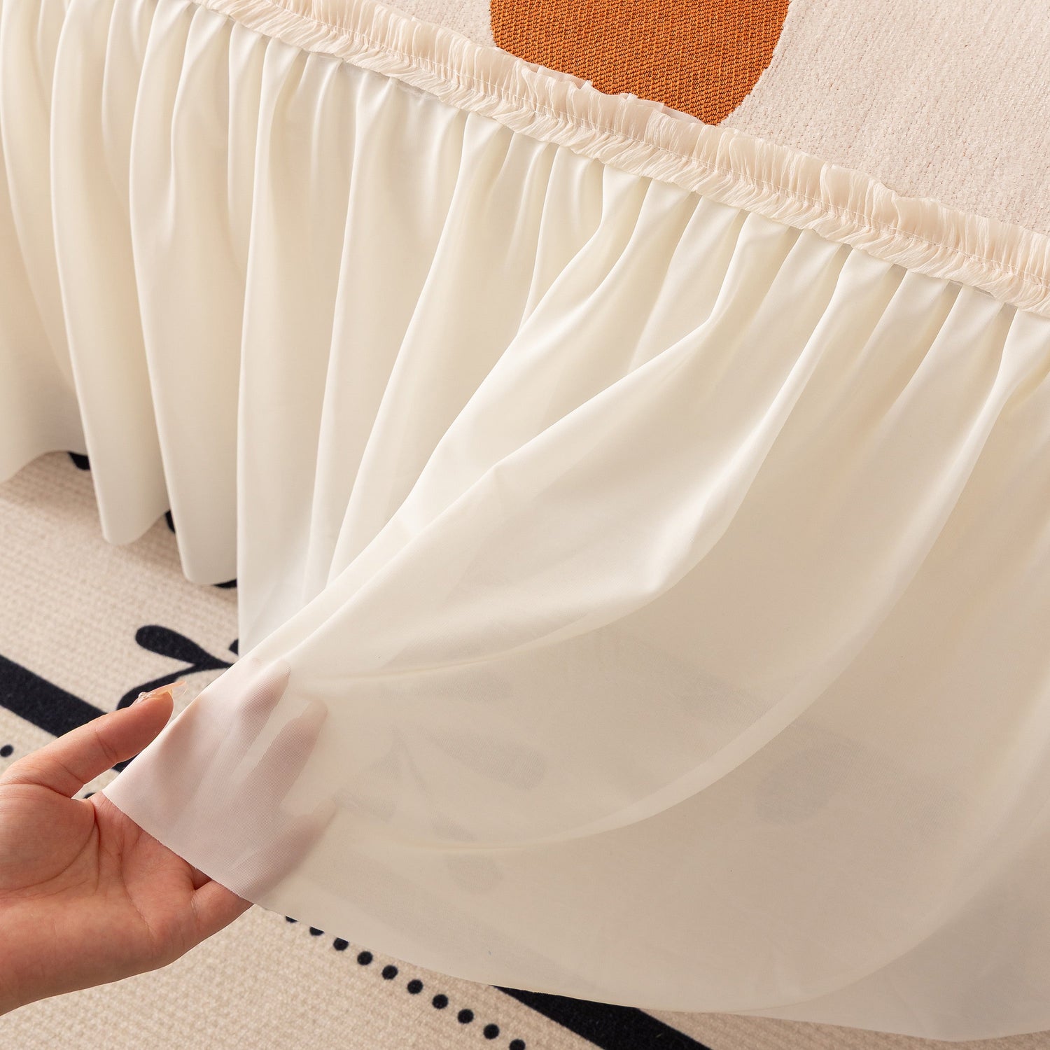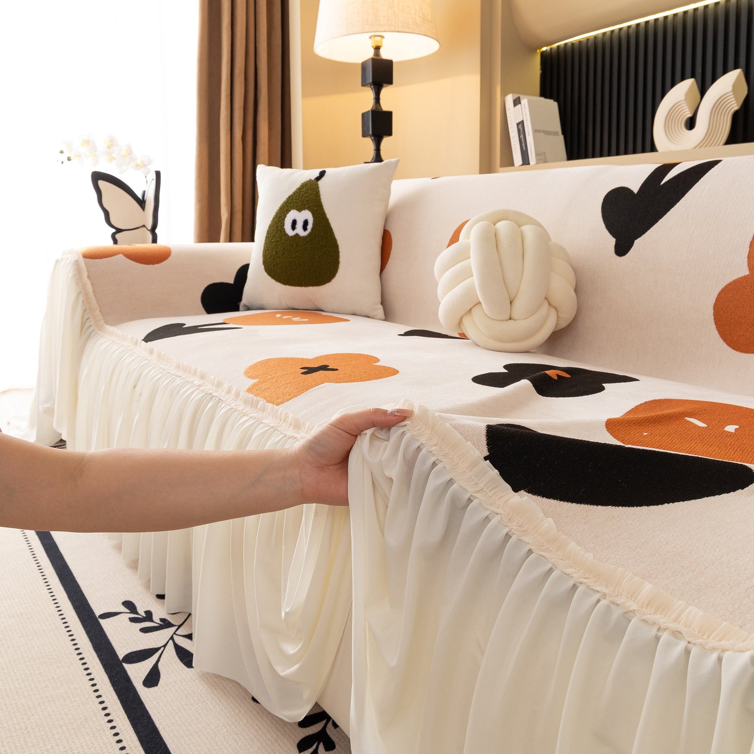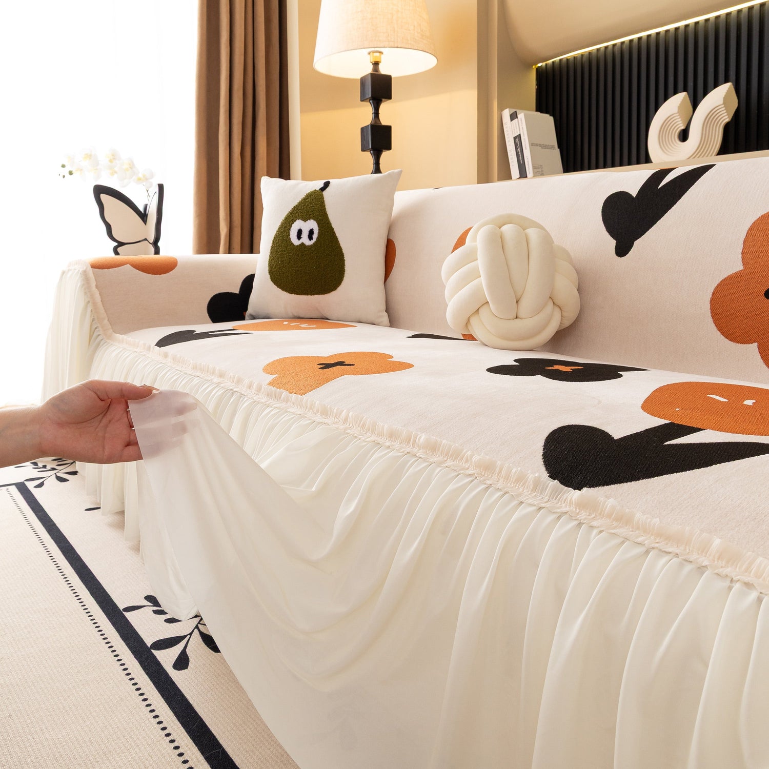 This decorative retro sofa cover features a bold floral pattern and is made from medium-weight chenille fabric, which is soft, breathable, and gentle to the touch. The cover includes a pleated sheer skirt made from chiffon-like material that runs along the bottom and sides, adding a light and airy detail.