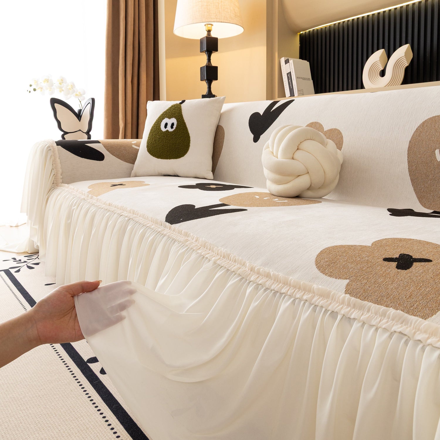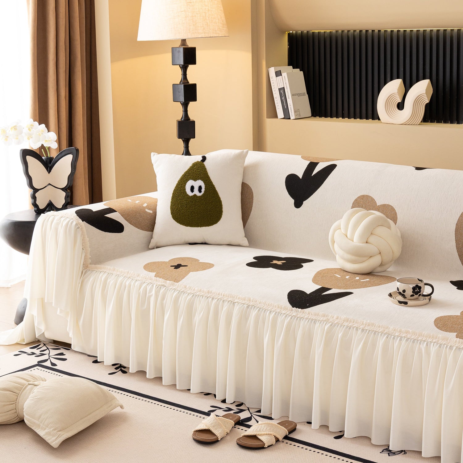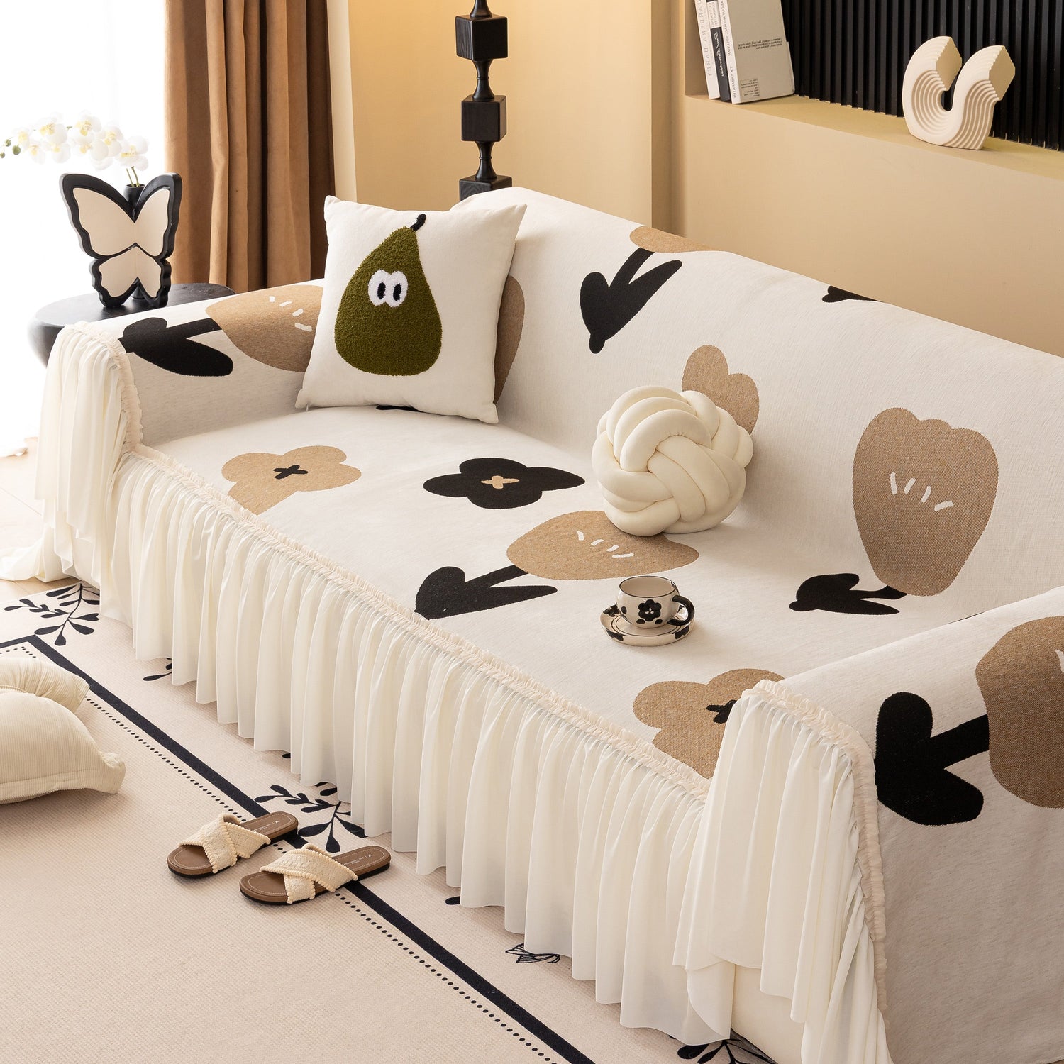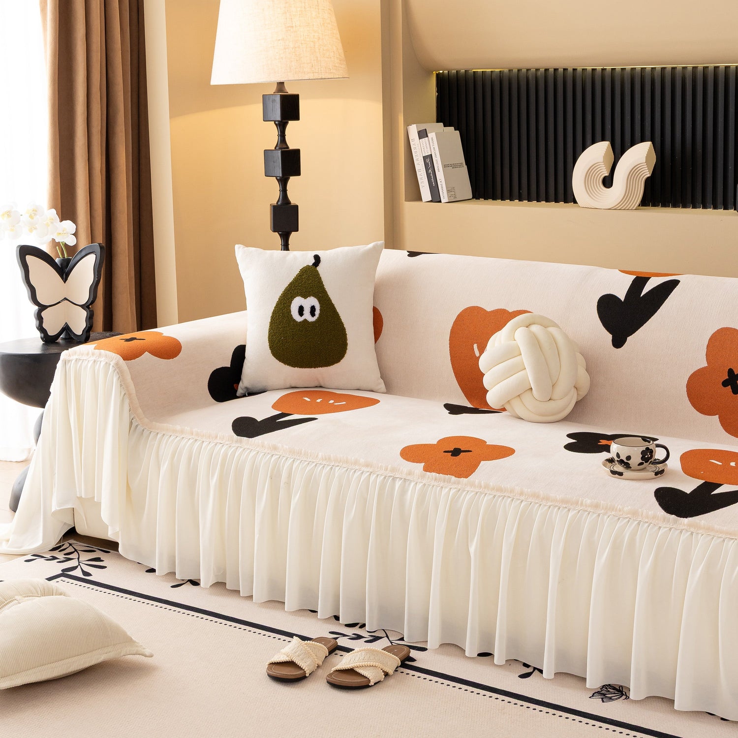 Retro Floral Sofa Cover with Sheer Ruffle Skirt, Decorative Sofa Protector Cover