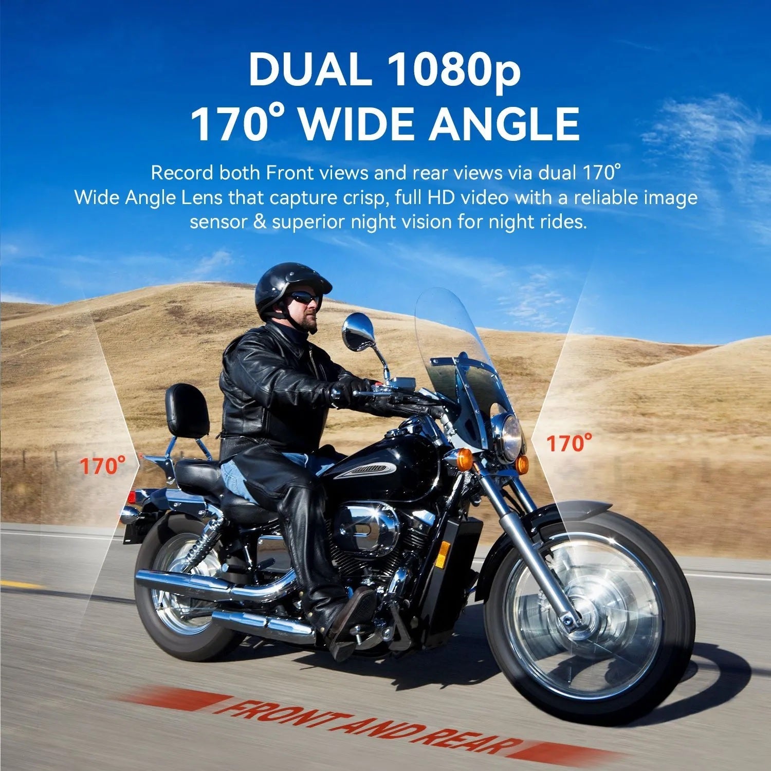 3” LCD | Front and Rear Recording 1080p w/170° Wide Angle Lens | Loop Recording | G-Sensor | Waterproof Motorcycle Camera | Mobile App | 128GB Supported