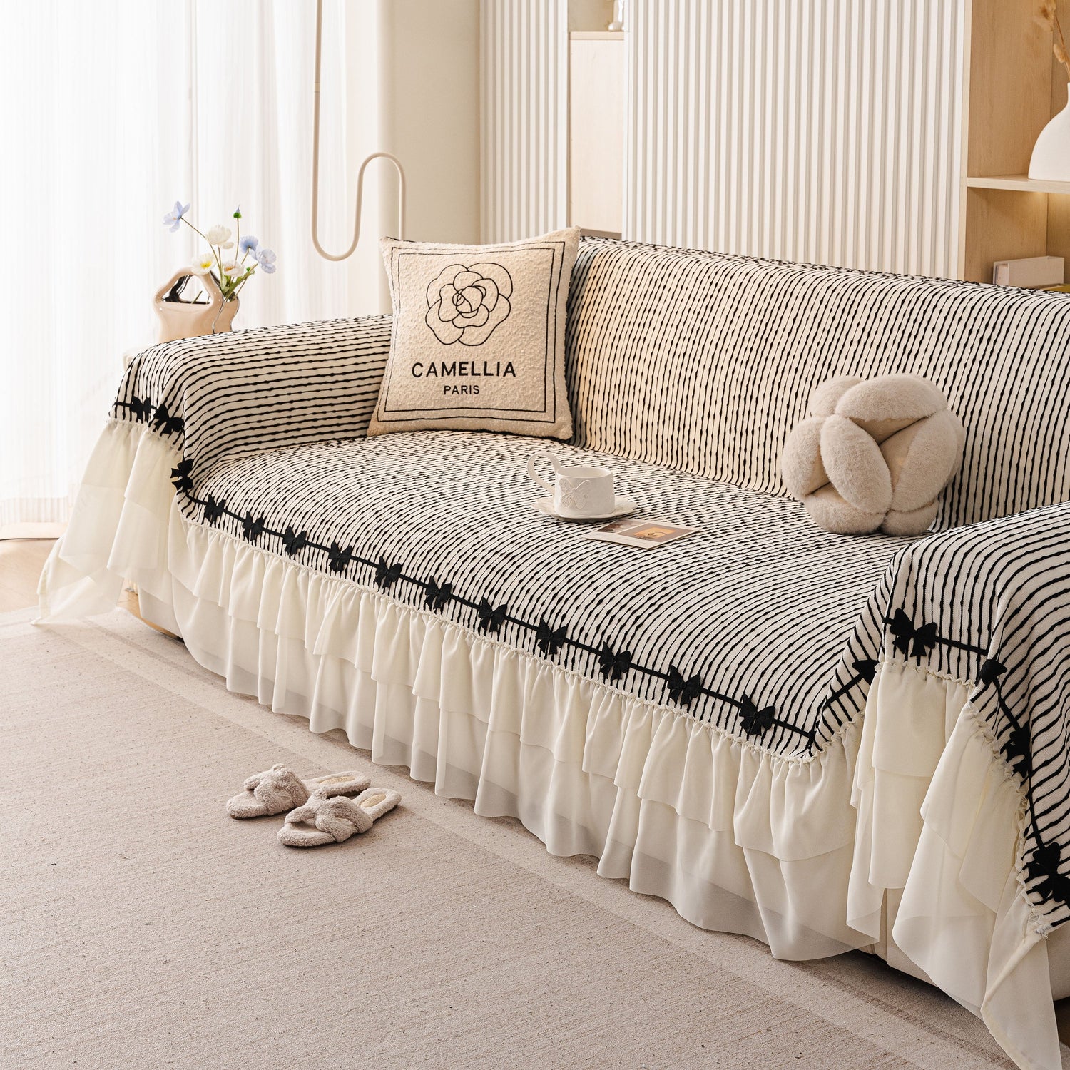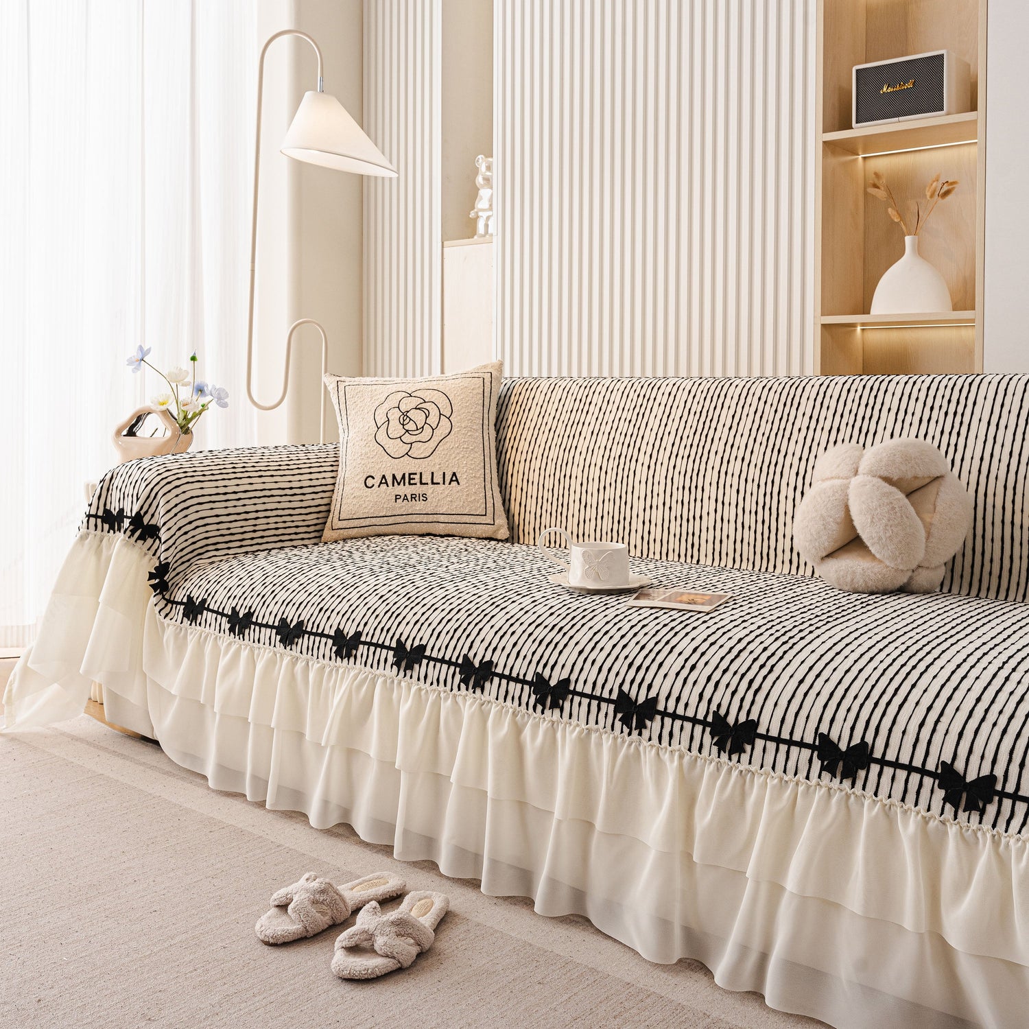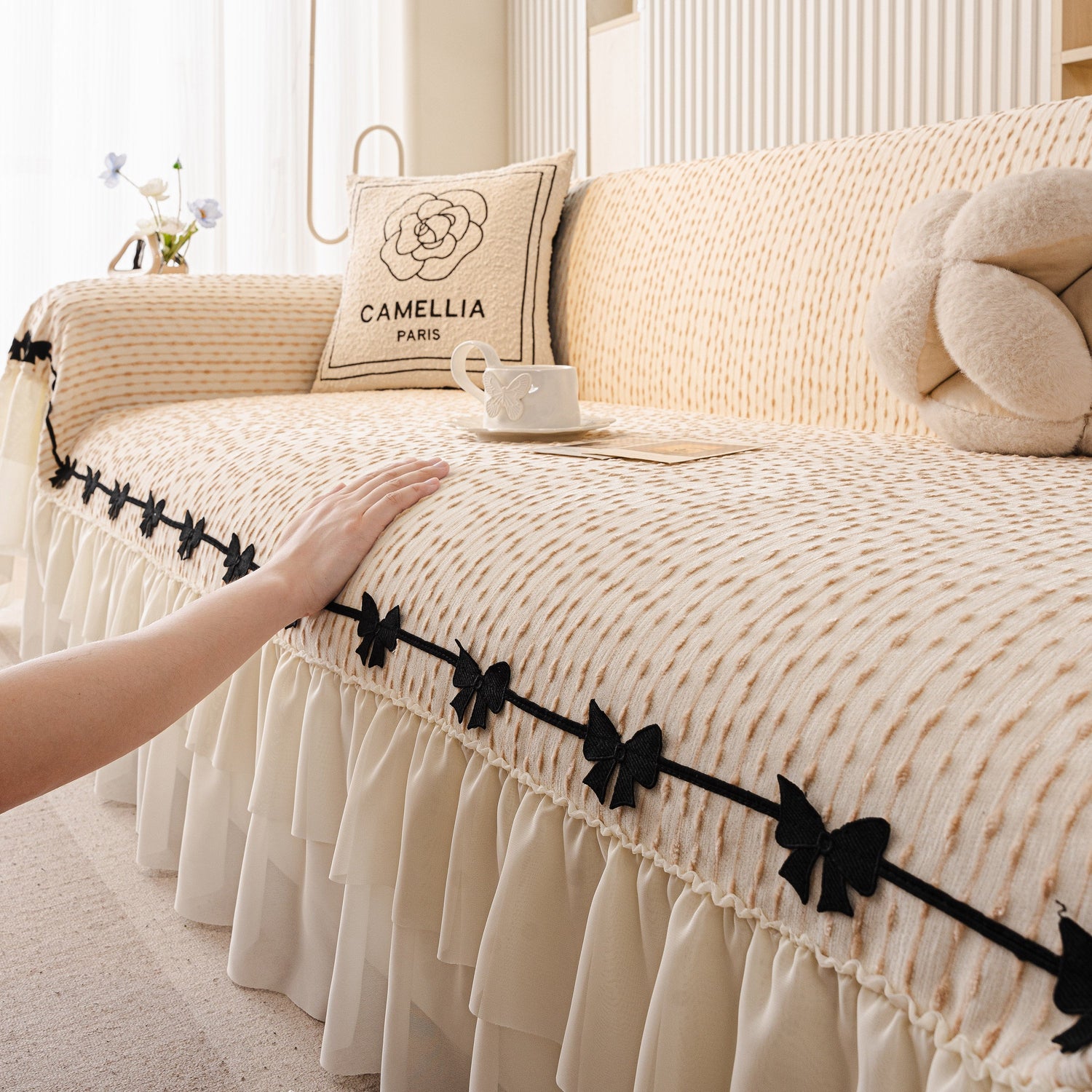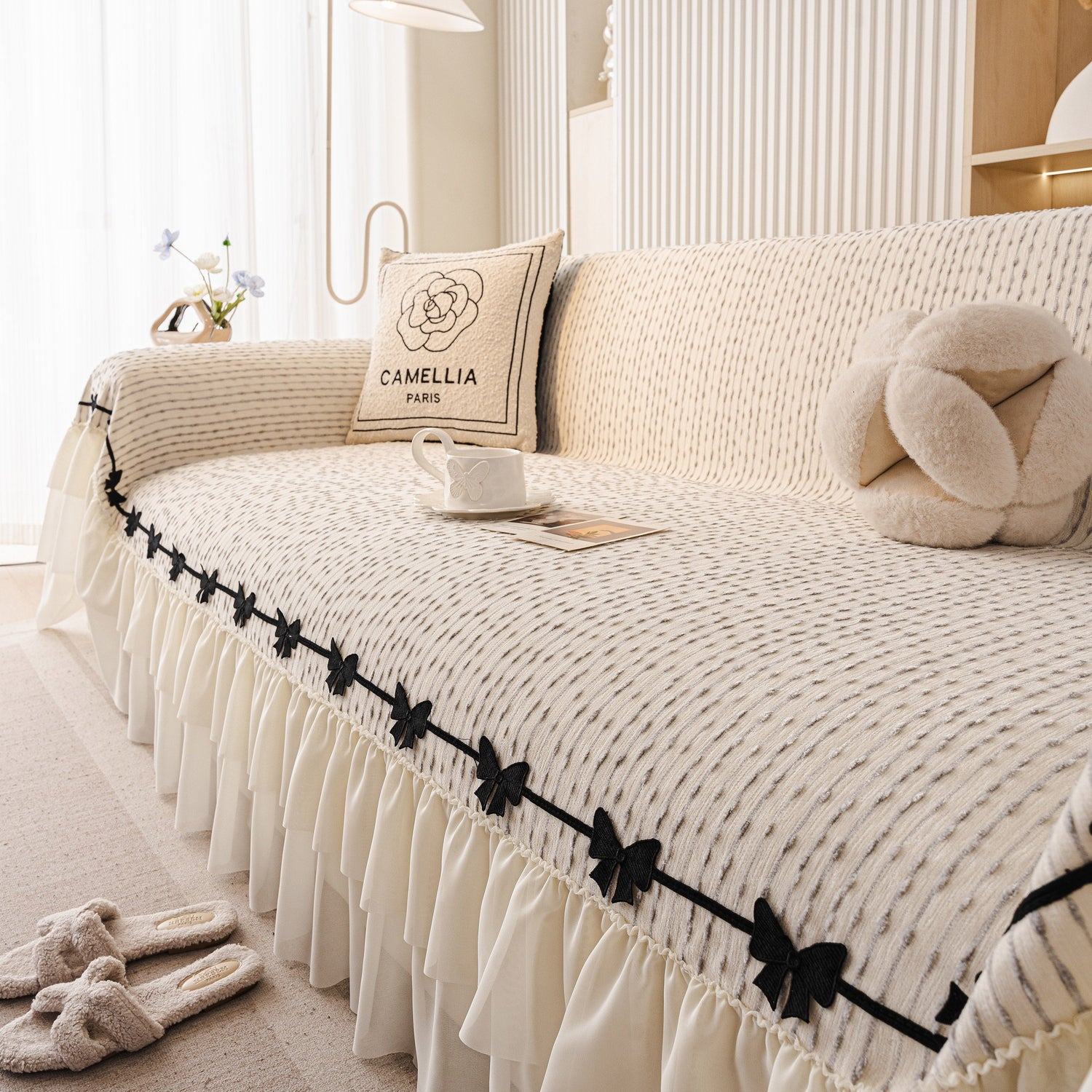 - Chic & Unique Design: Inspired by classic French Country aesthetics, this sofa cover adds a touch of romantic elegance to any room. The charming black bowknots are beautifully complemented by a flowing ruffled skirt, creating a soft and stylish silhouette that's both timeless and unique.