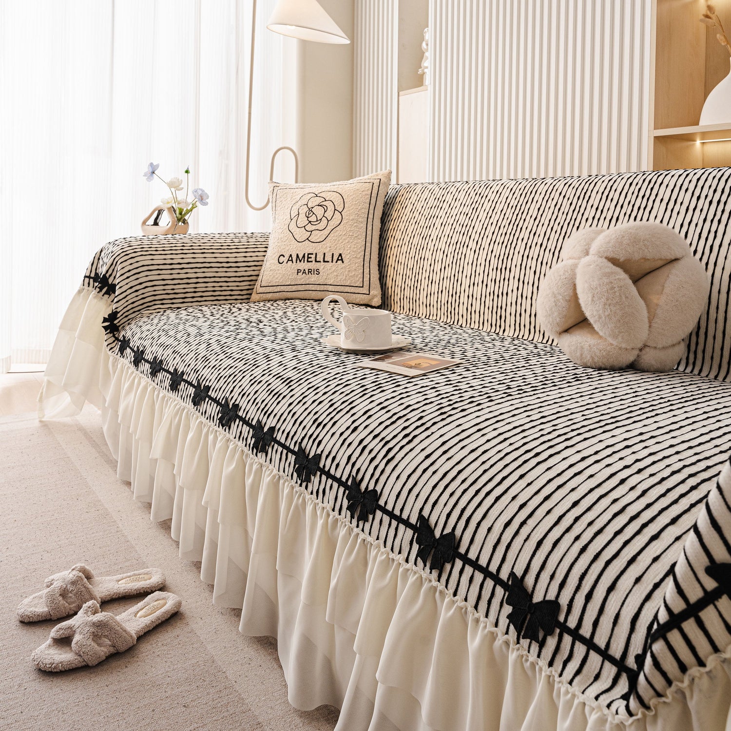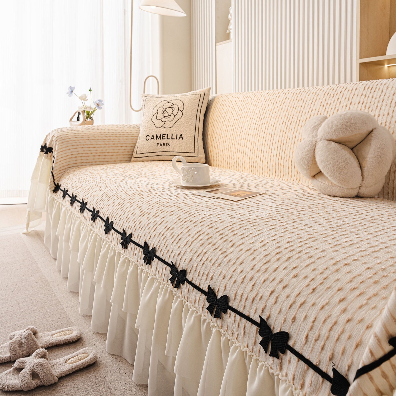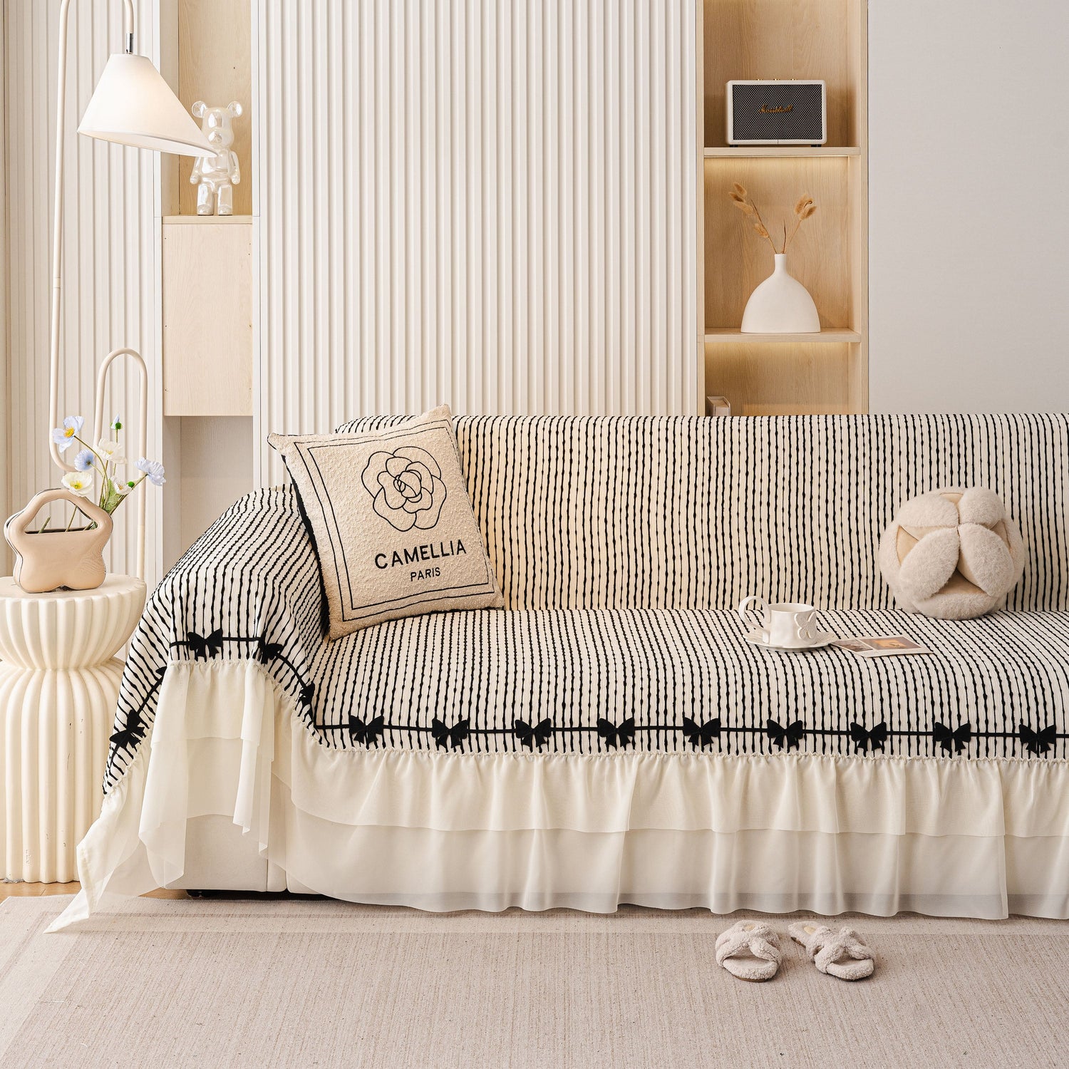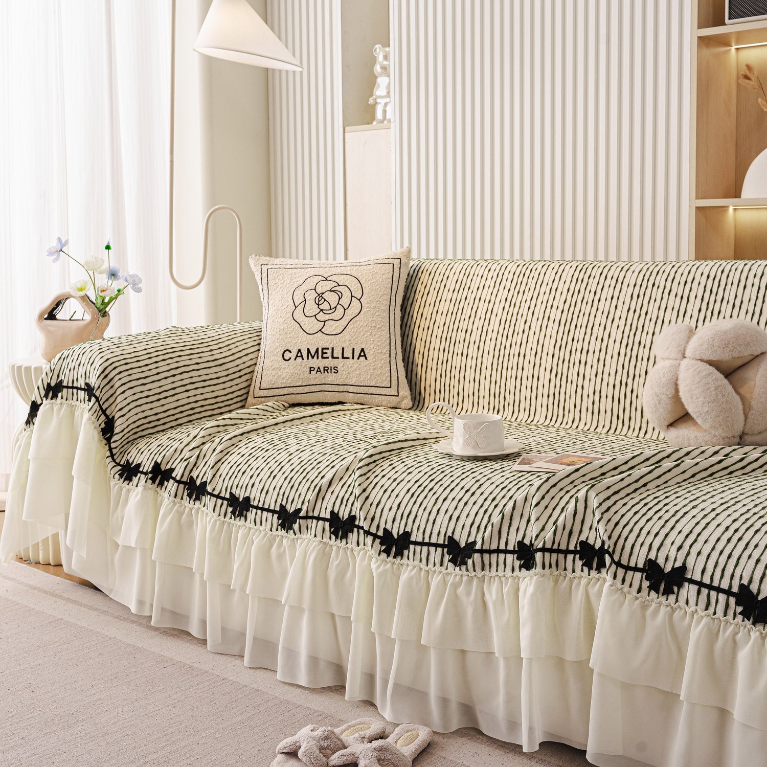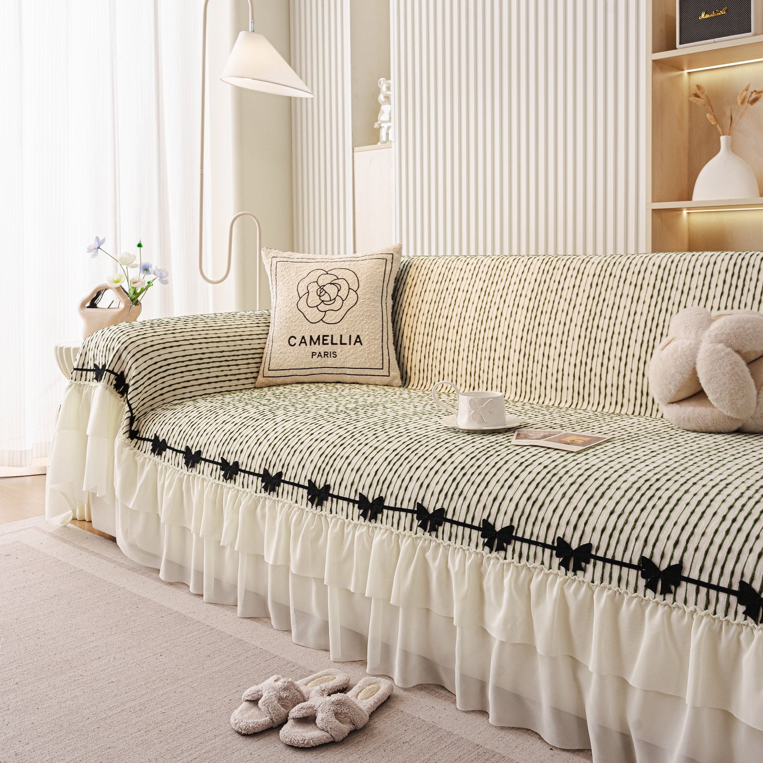 - Chic & Unique Design: Inspired by classic French Country aesthetics, this sofa cover adds a touch of romantic elegance to any room. The charming black bowknots are beautifully complemented by a flowing ruffled skirt, creating a soft and stylish silhouette that's both timeless and unique.