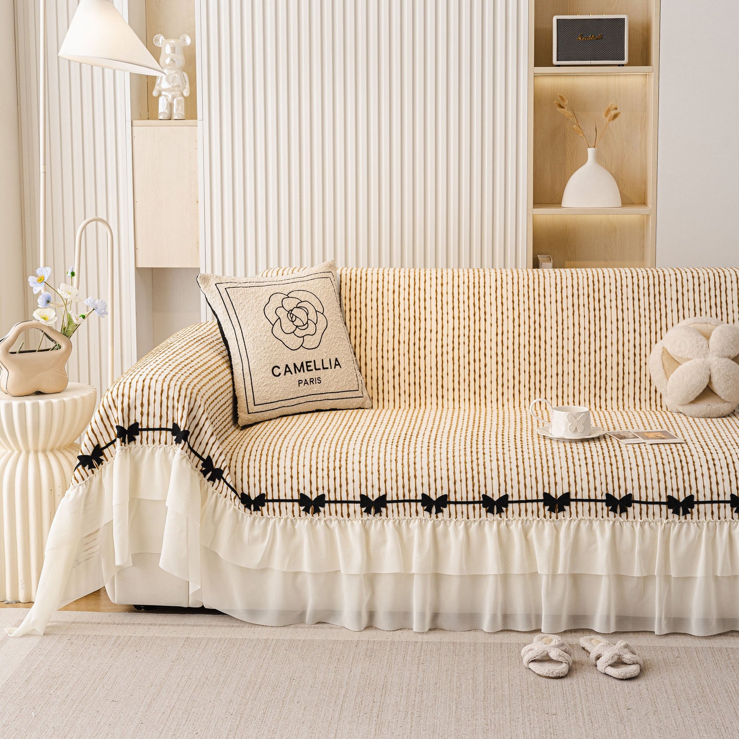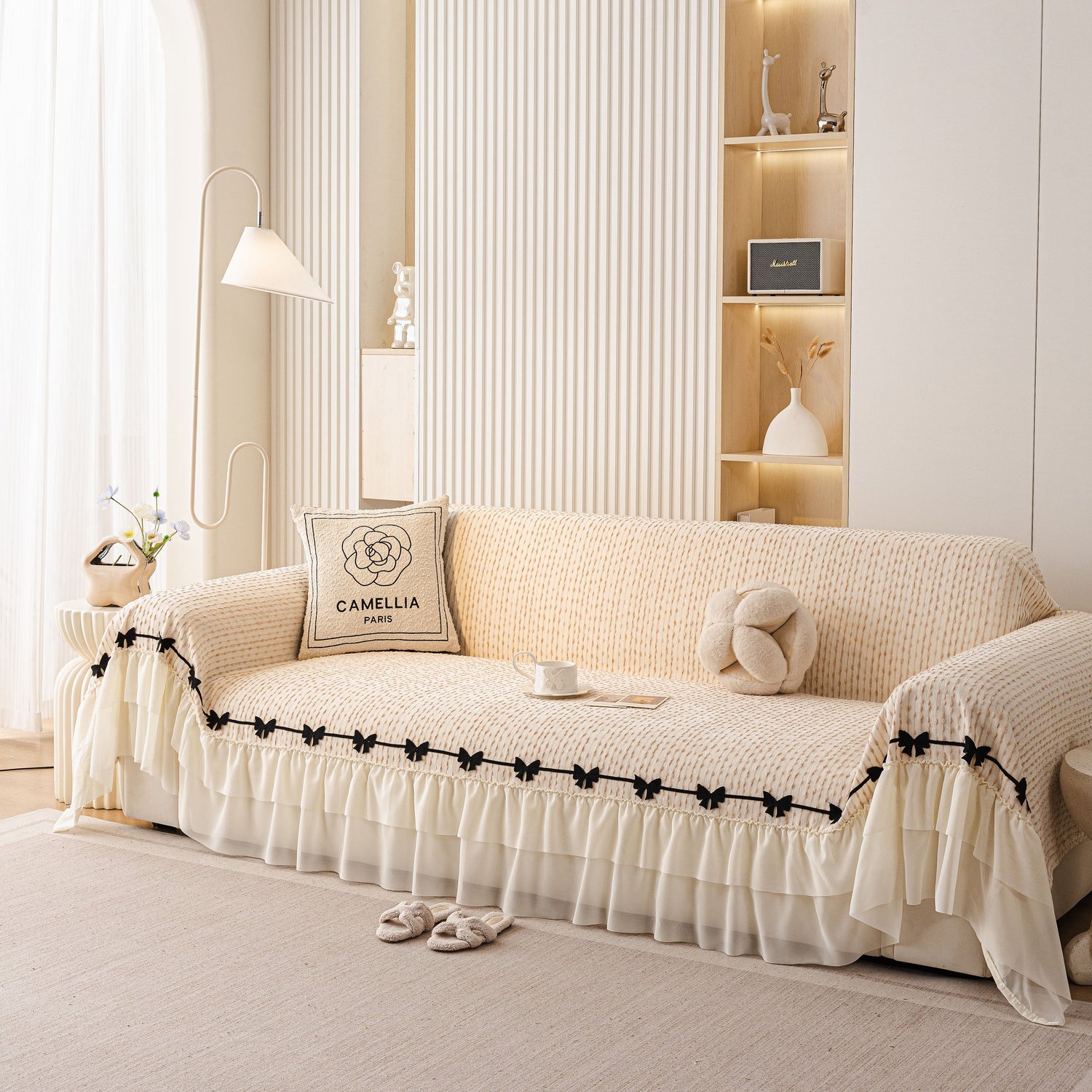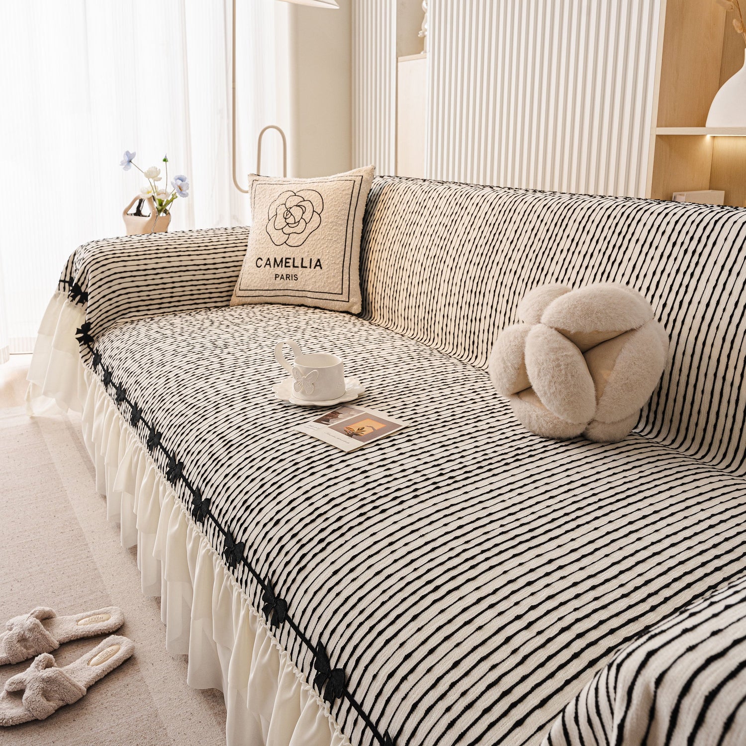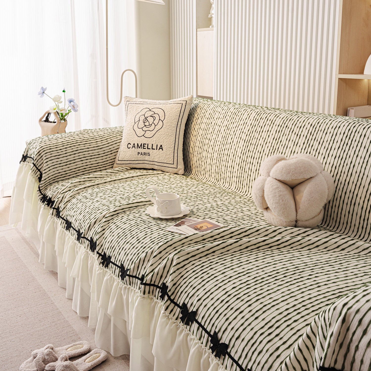 - Chic & Unique Design: Inspired by classic French Country aesthetics, this sofa cover adds a touch of romantic elegance to any room. The charming black bowknots are beautifully complemented by a flowing ruffled skirt, creating a soft and stylish silhouette that's both timeless and unique.