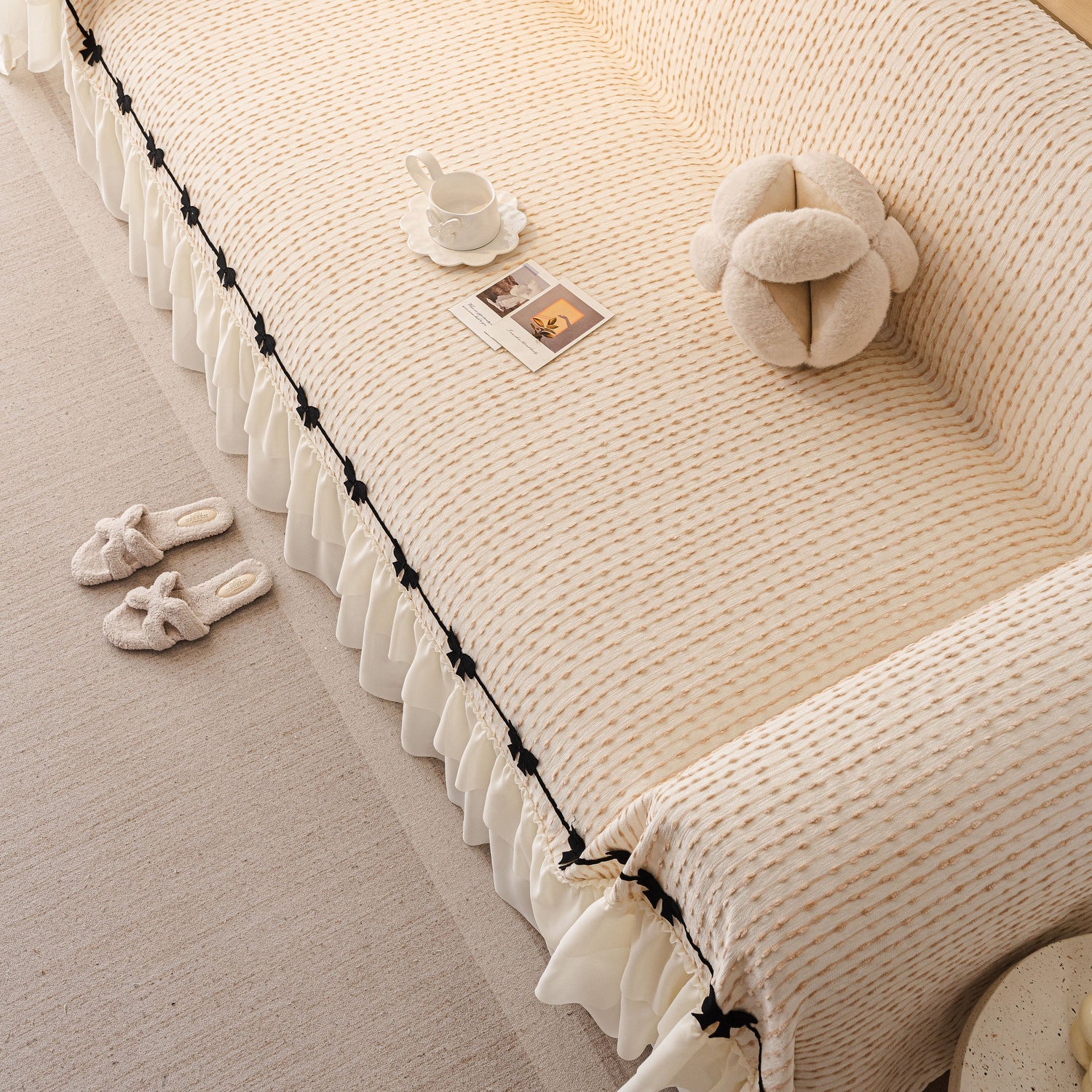 Ruffled Sofa Cover with Bowknot Decor, French Country Style Skirted Couch Slipcover