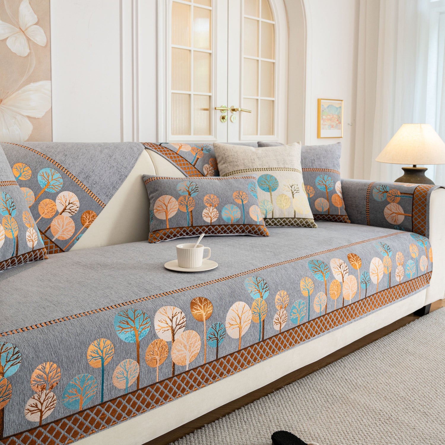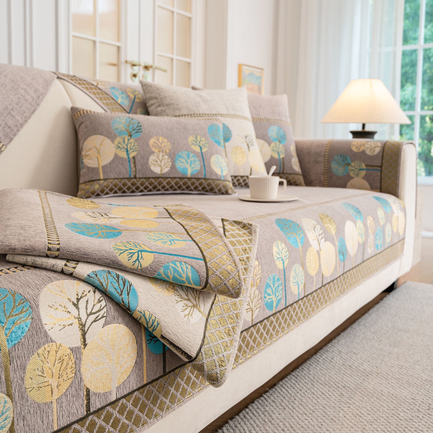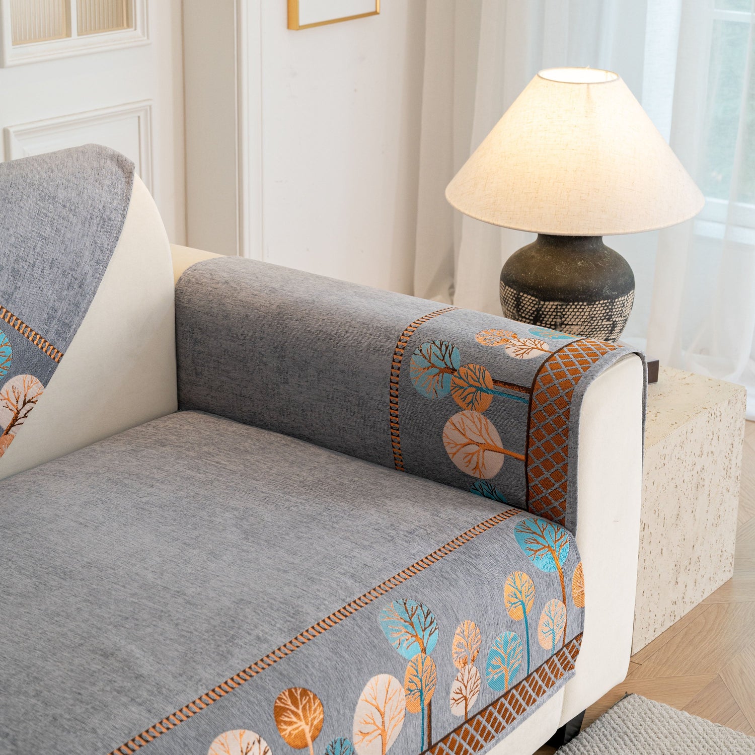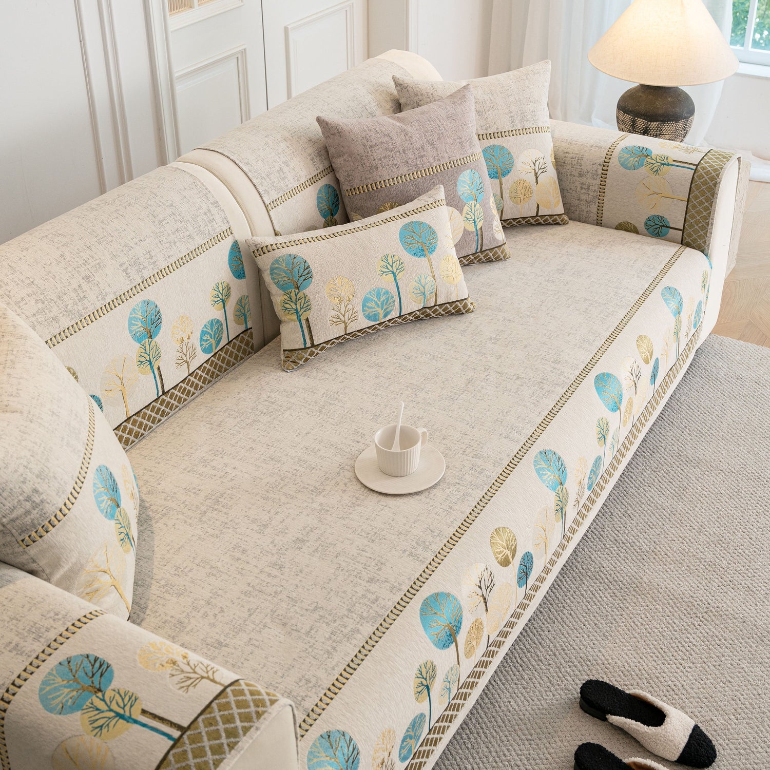 A jacquard-woven tree pattern adds subtle texture and a nature-inspired aesthetic, blending well with modern, minimalist, and transitional interior styles. The reverse side is equipped with anti-slip silicone dots that help keep the cover in place on both fabric and leather sofas, even with regular movement or pets at home.