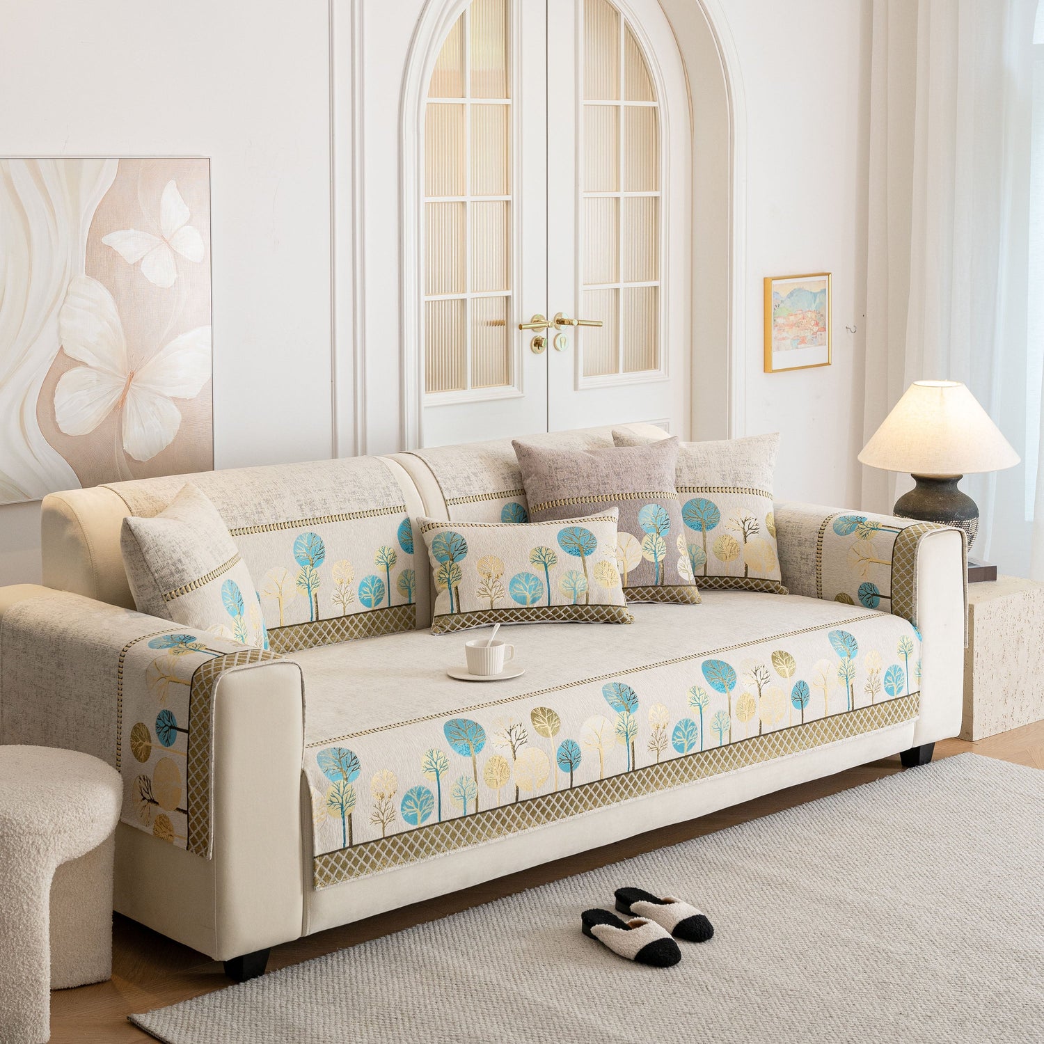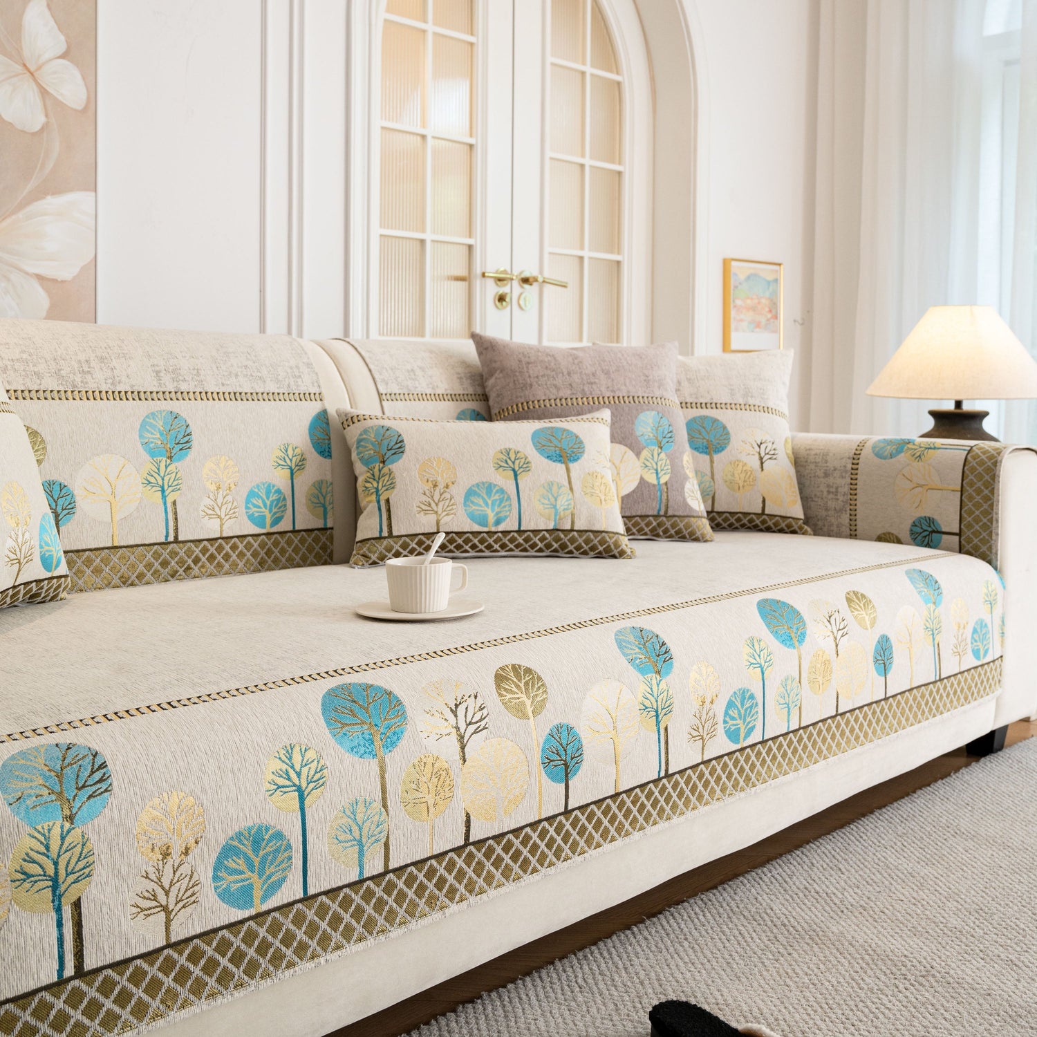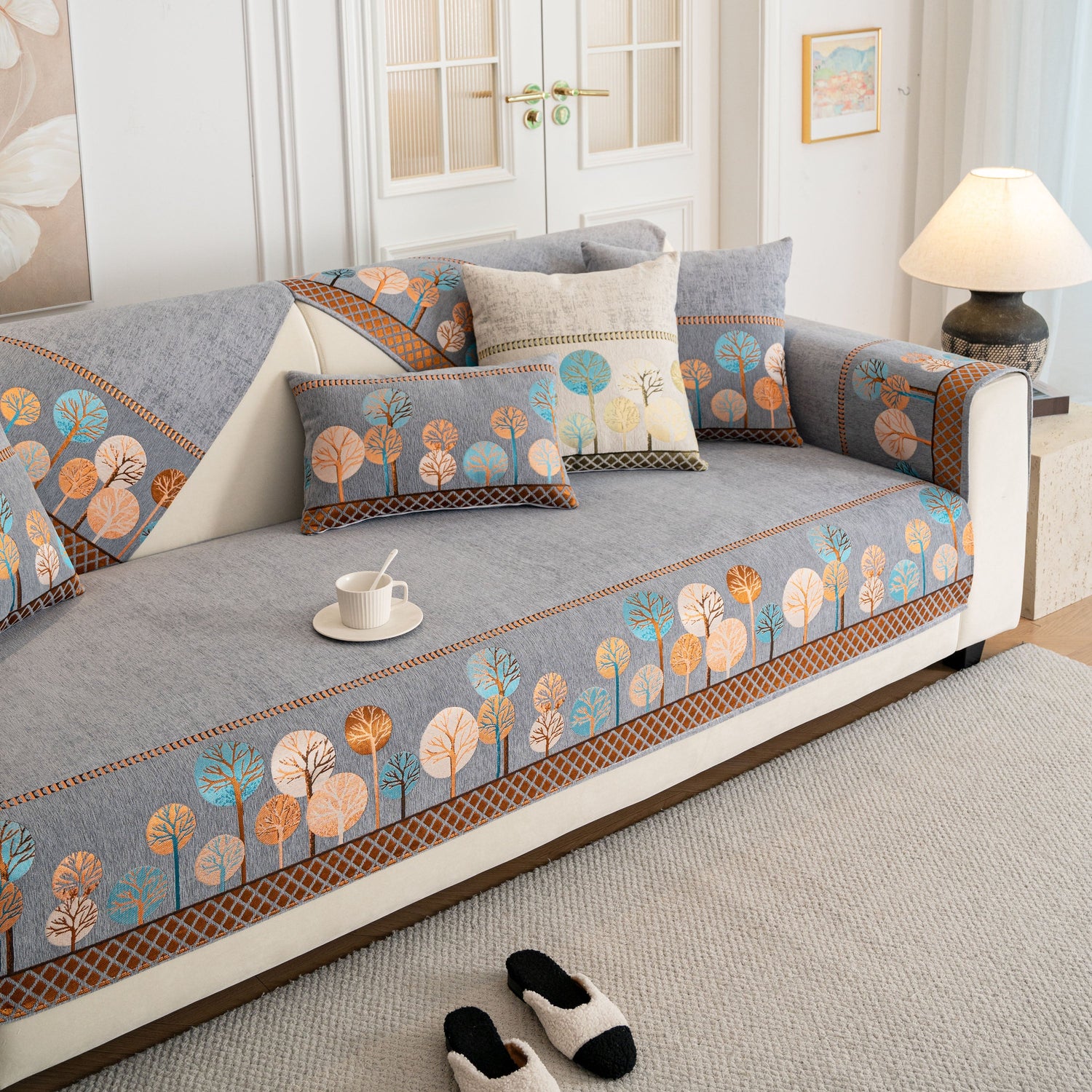 A jacquard-woven tree pattern adds subtle texture and a nature-inspired aesthetic, blending well with modern, minimalist, and transitional interior styles. The reverse side is equipped with anti-slip silicone dots that help keep the cover in place on both fabric and leather sofas, even with regular movement or pets at home.
