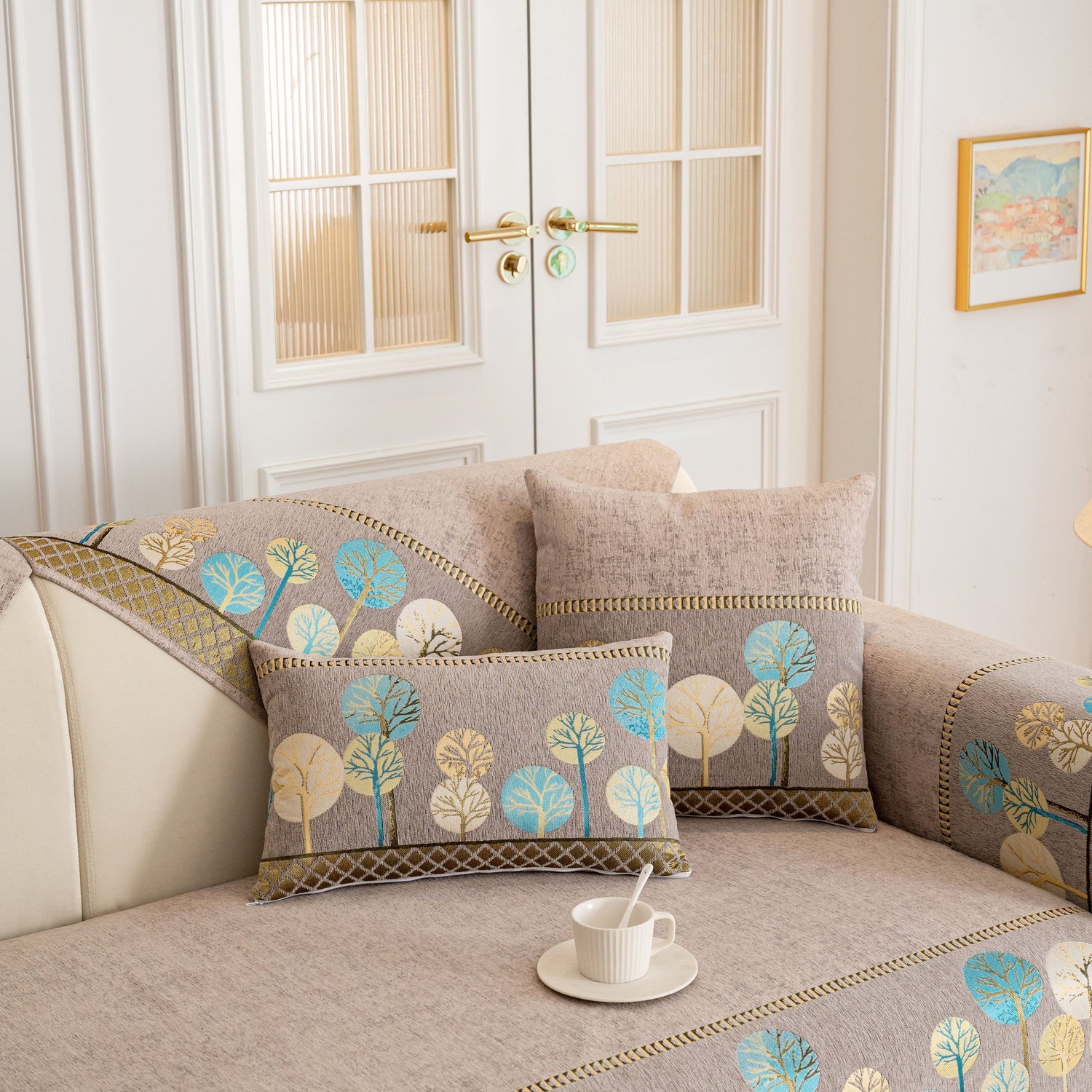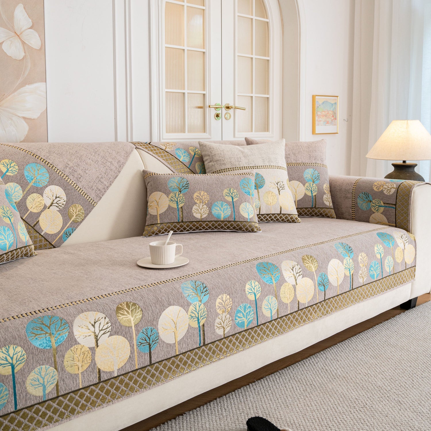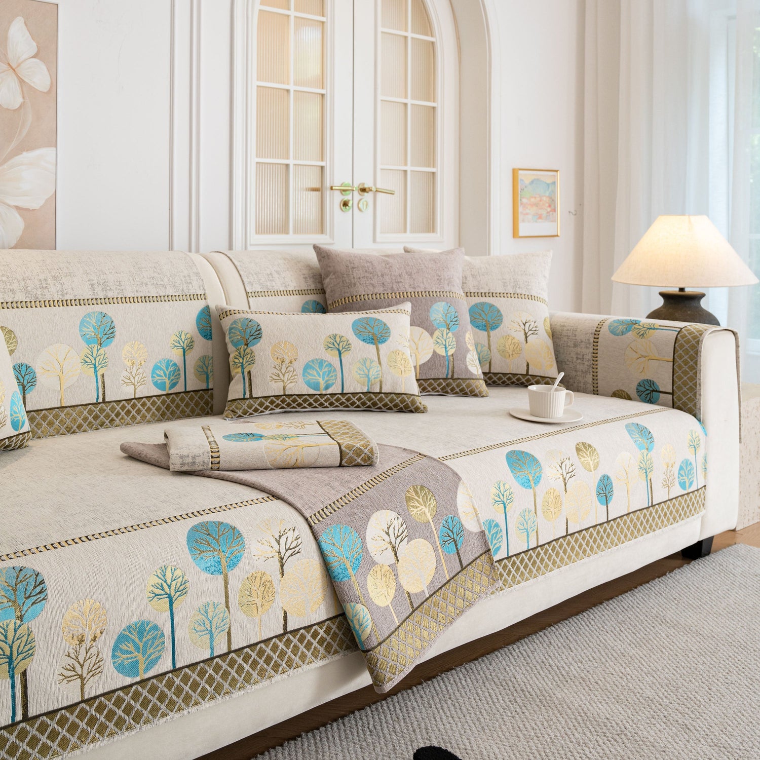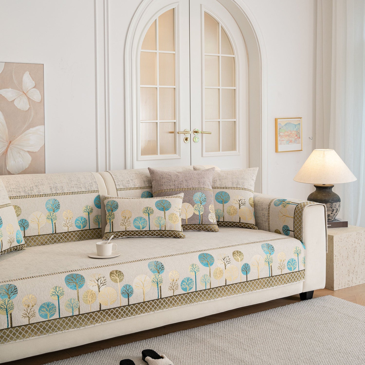 A jacquard-woven tree pattern adds subtle texture and a nature-inspired aesthetic, blending well with modern, minimalist, and transitional interior styles. The reverse side is equipped with anti-slip silicone dots that help keep the cover in place on both fabric and leather sofas, even with regular movement or pets at home.