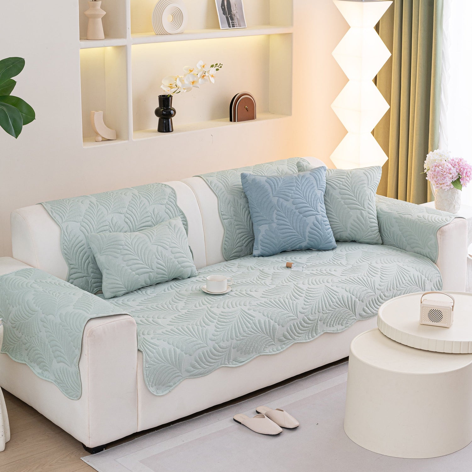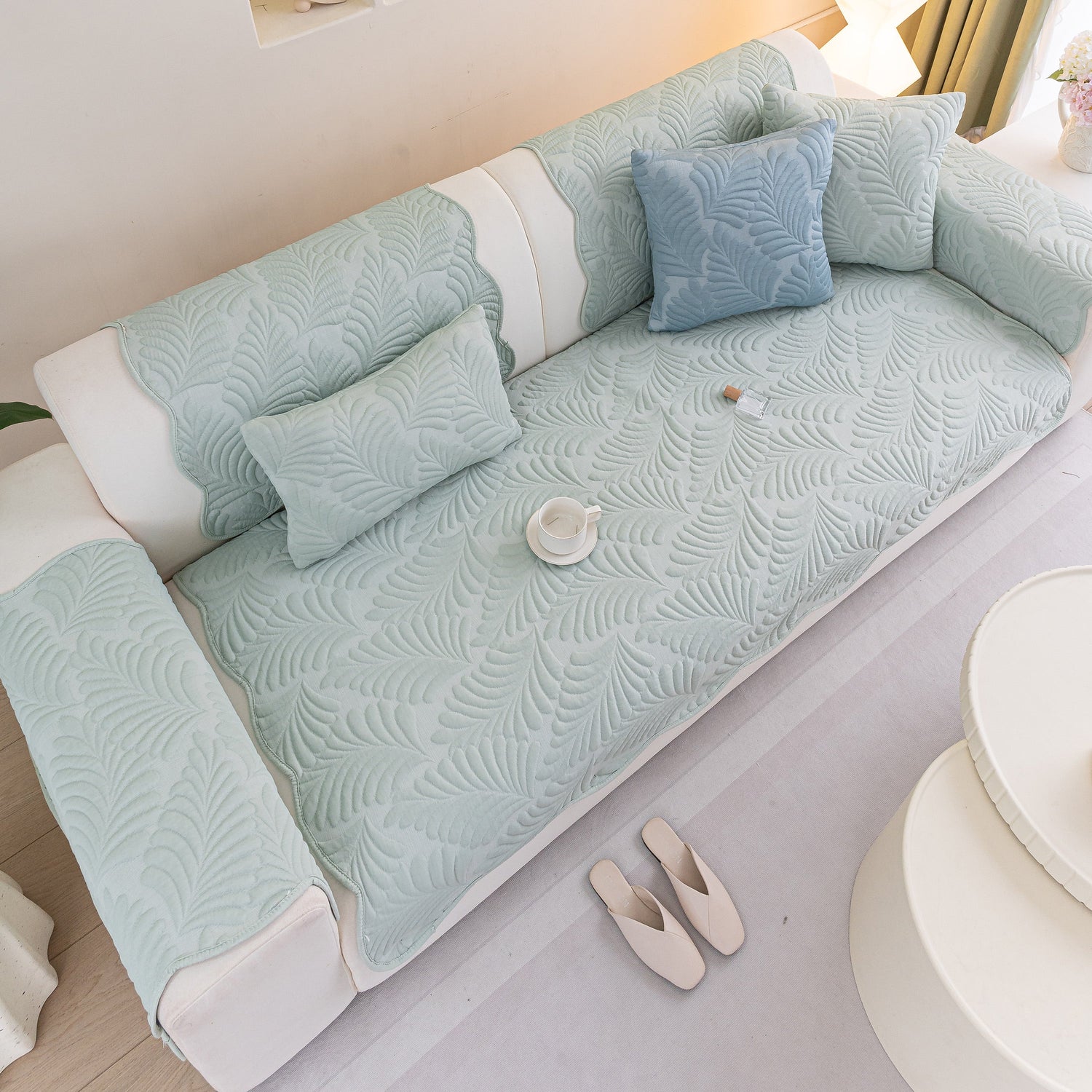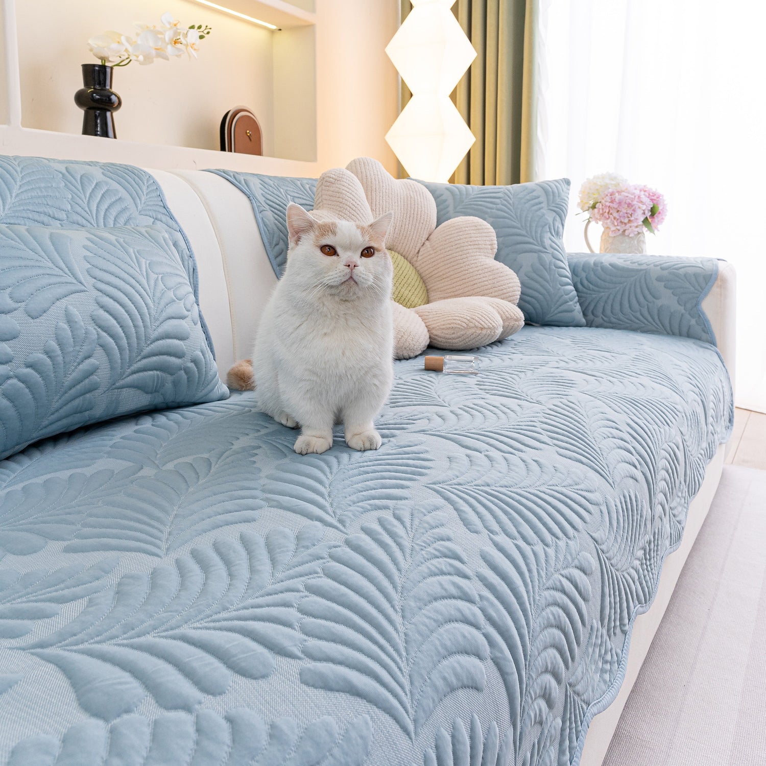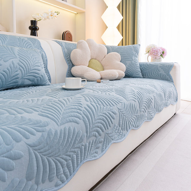 This sofa cover is made of a quilted cotton-blend fabric with a three-dimensional leaf embossing on the surface. The back side is coated with silicone anti-slip particles, which help keep the cover in place on both fabric and leather sofas. The edges are finished with a wave-cut design. The cover is composed of separate pieces that can be used on the seat, backrest, and armrest areas. Although the fabric is thickened for durability, it does not trap heat easily and may offer a degree of breathability. The cover is machine washable and designed for year-round use.
