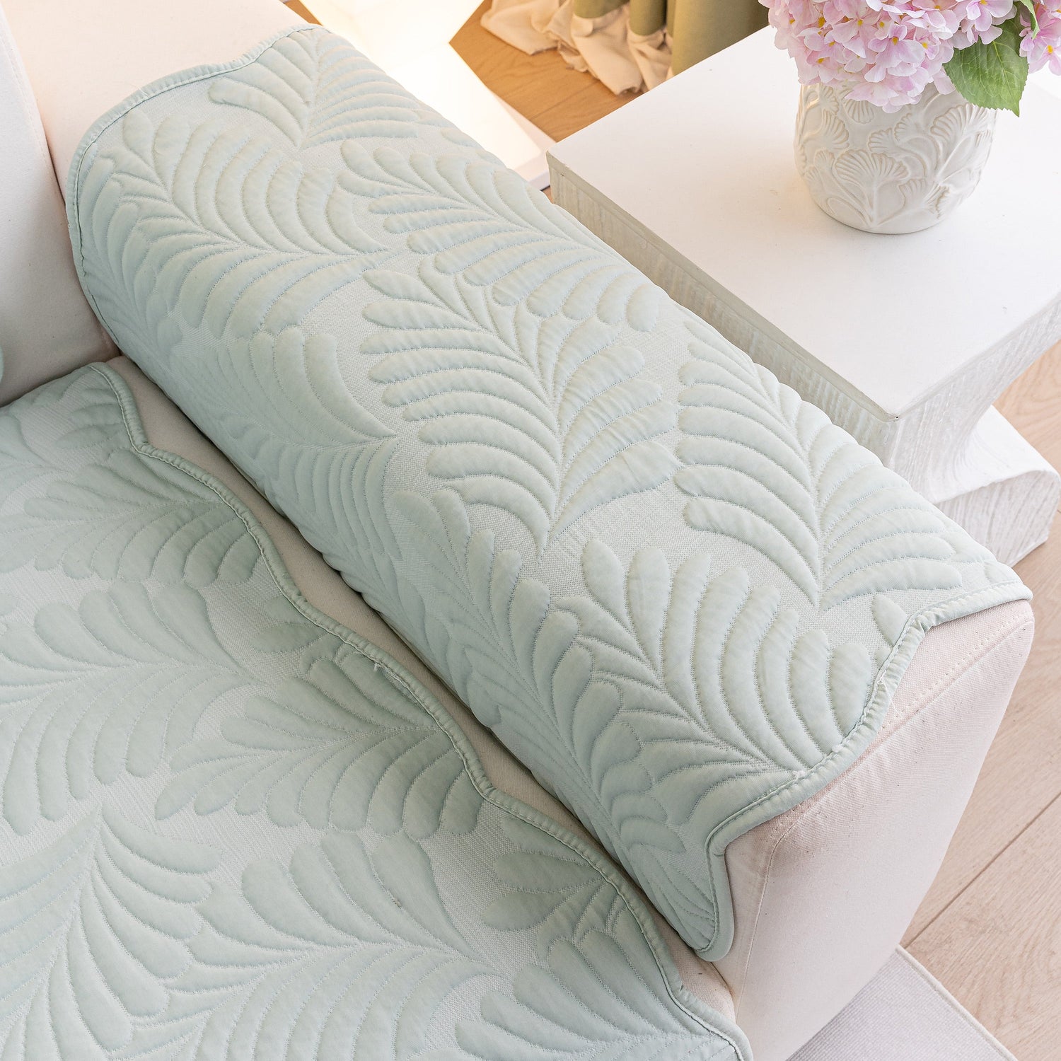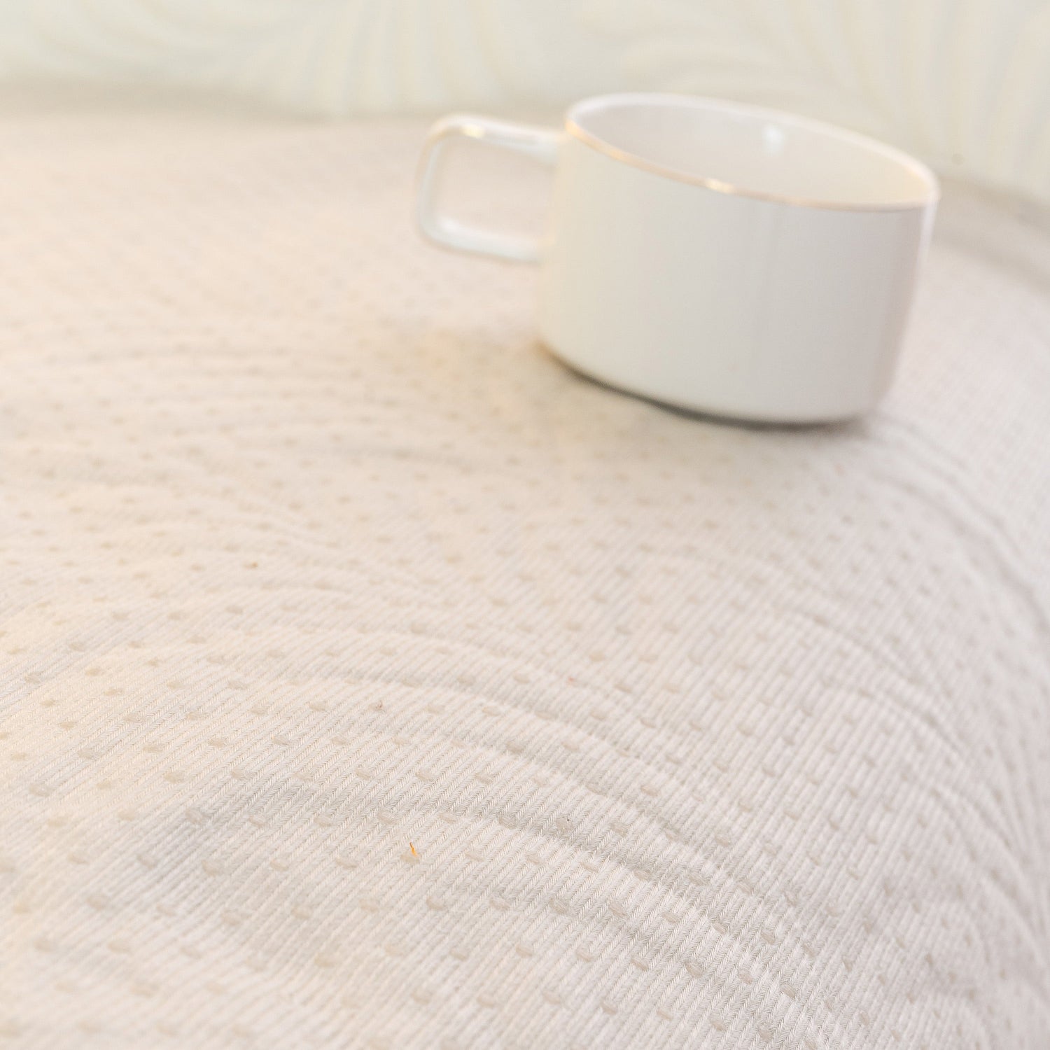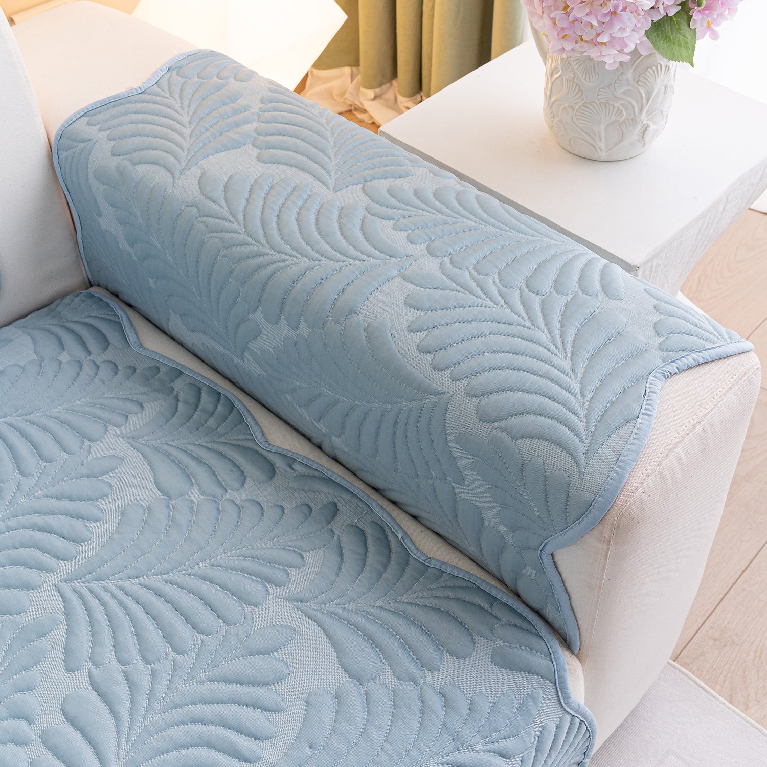 This sofa cover is made of a quilted cotton-blend fabric with a three-dimensional leaf embossing on the surface. The back side is coated with silicone anti-slip particles, which help keep the cover in place on both fabric and leather sofas. The edges are finished with a wave-cut design. The cover is composed of separate pieces that can be used on the seat, backrest, and armrest areas. Although the fabric is thickened for durability, it does not trap heat easily and may offer a degree of breathability. The cover is machine washable and designed for year-round use.