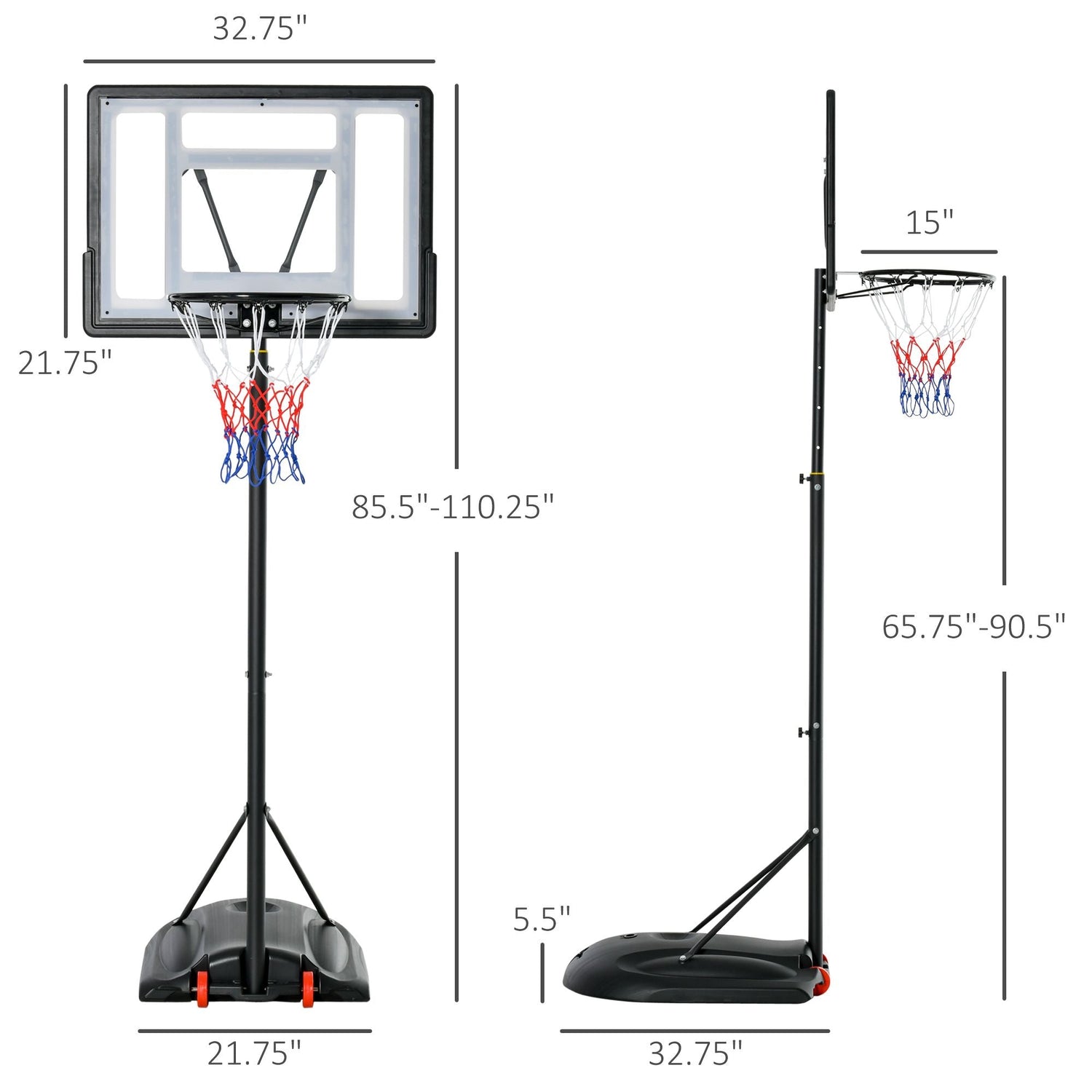 - Basketball Hoop Information: Backboard Dimensions: 32.75"W x 21.75"H, Adjustable Height: 85.5"-110.25", Basketball Hoop Height: 65.75"-90.5", Base Dimension: 32.75"L x 21.75"W x 5.5"H. Assembly required.