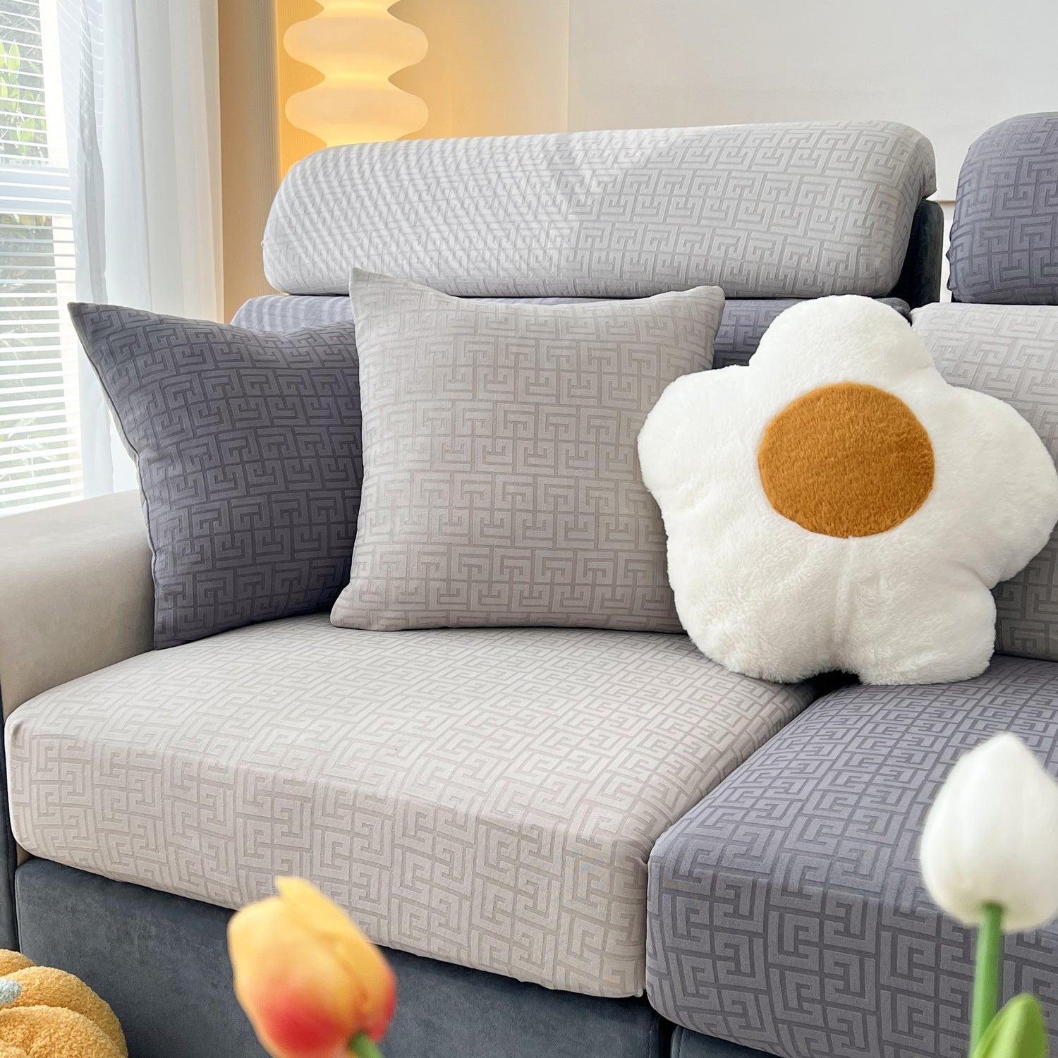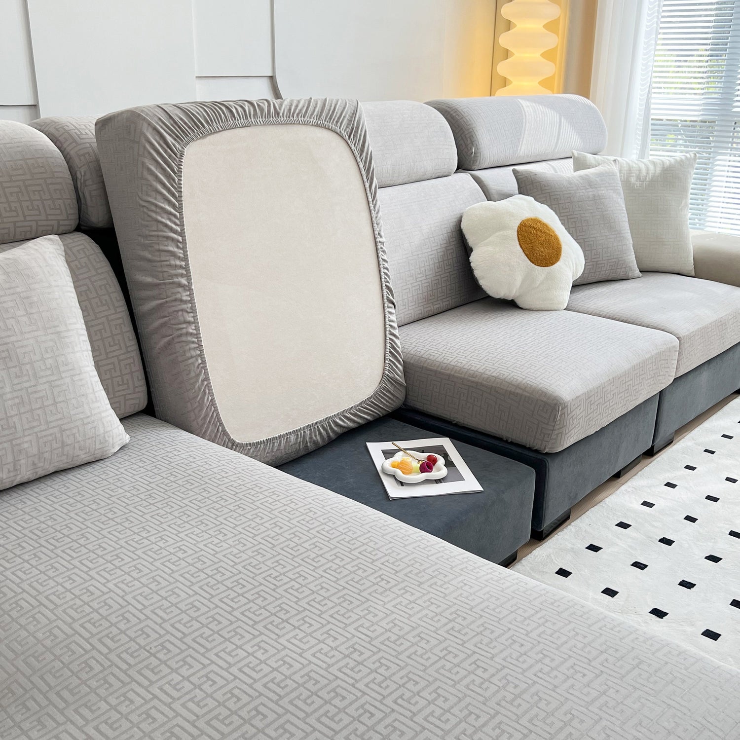 Vedic Chant Jacquard Fleece Fabric Stretch Cushion Cover, Non-Slip Furniture Protector for Kids, Chaise Lounge Cushion Covers - Gray / 1-Seater XL is backordered and will ship as soon as it is back in stock.