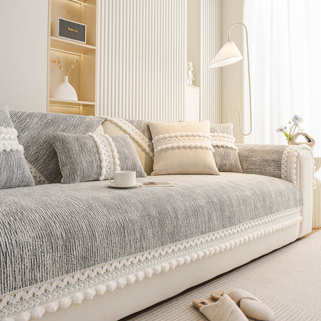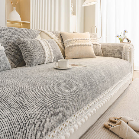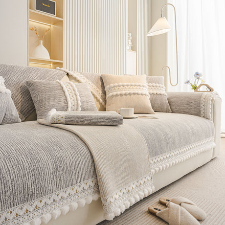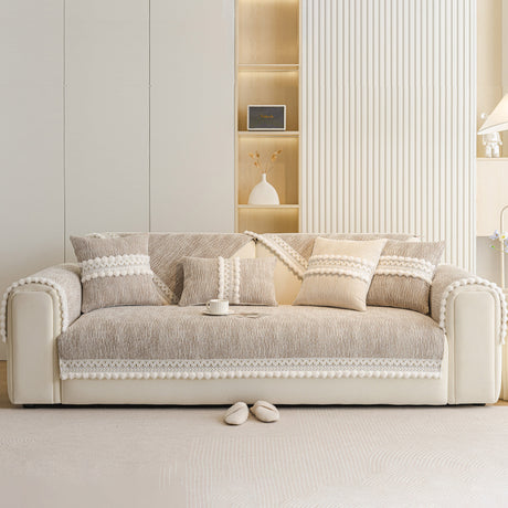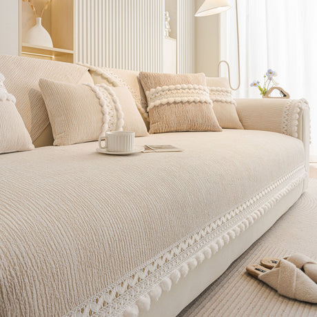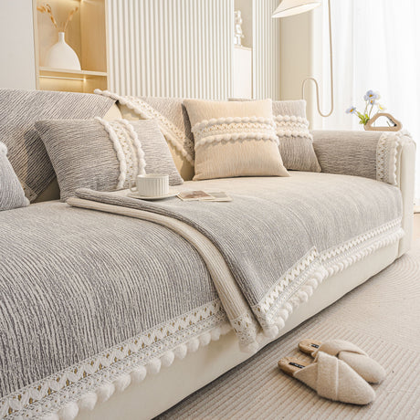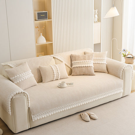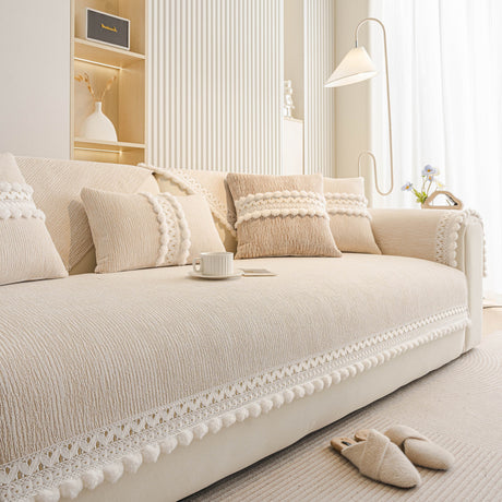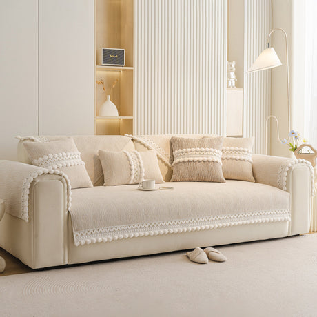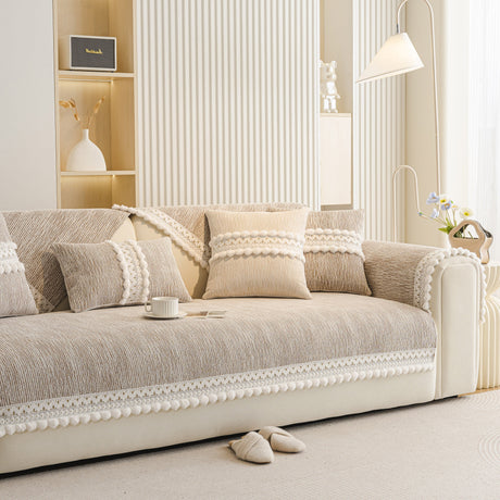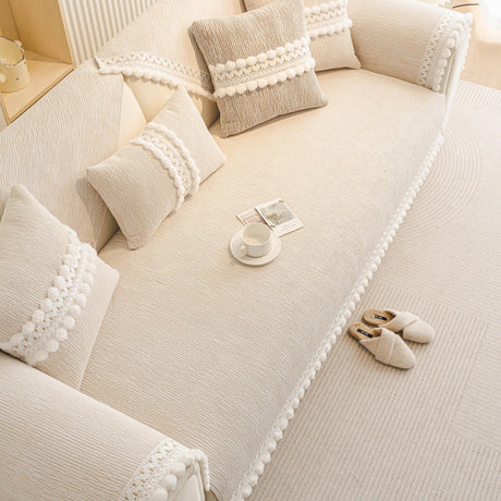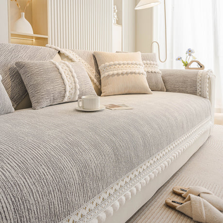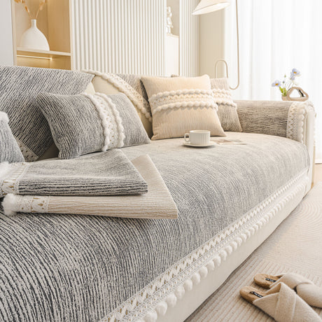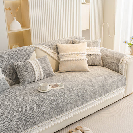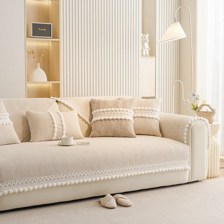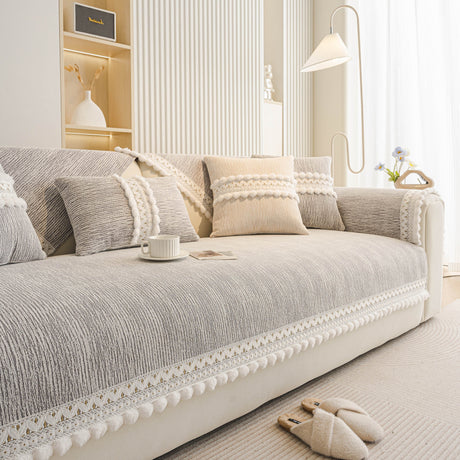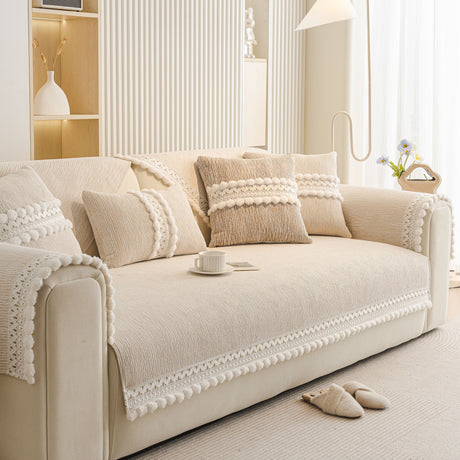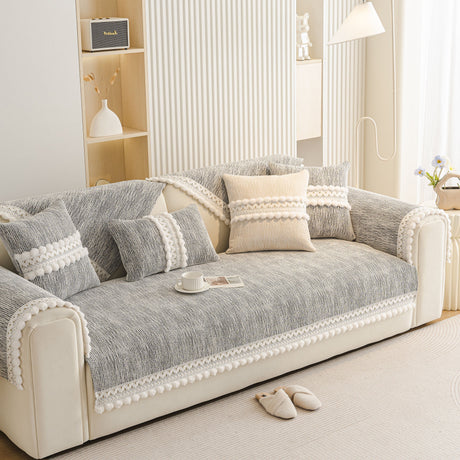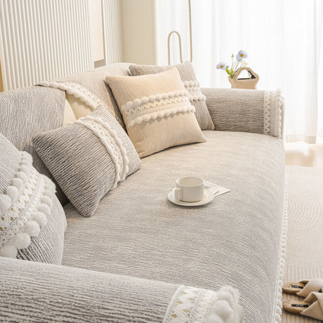 Soft Chenille Sectional Sofa Cover with Pom Pom Trim – Non-Slip Couch Protector