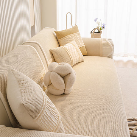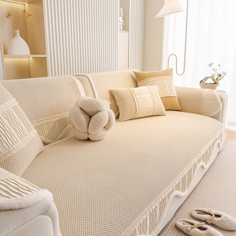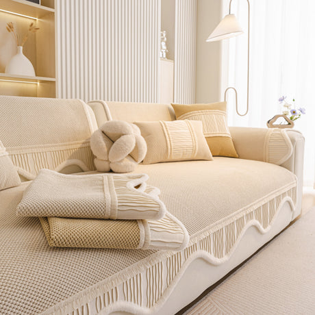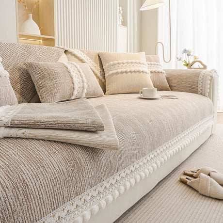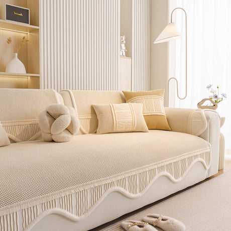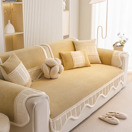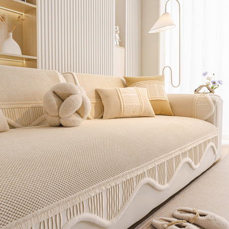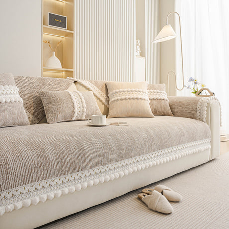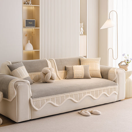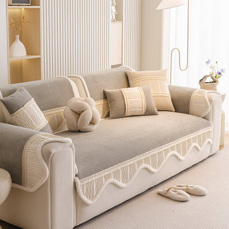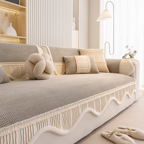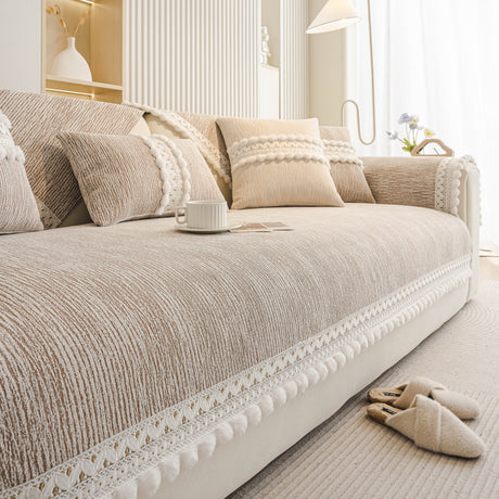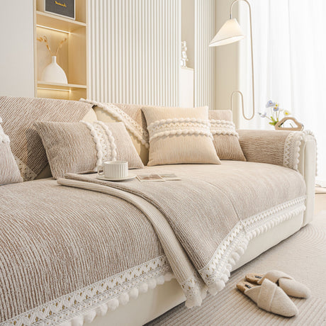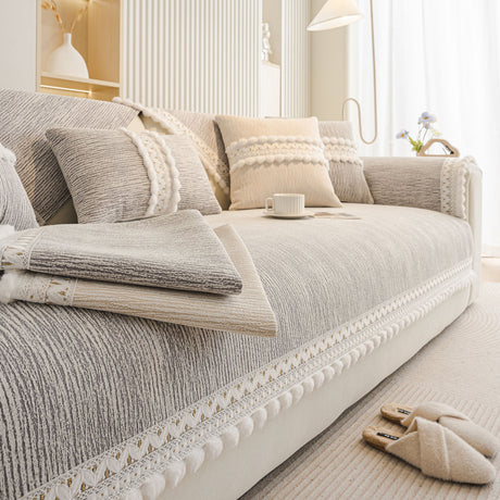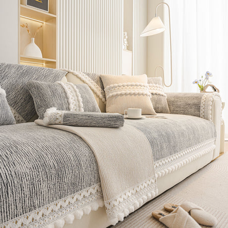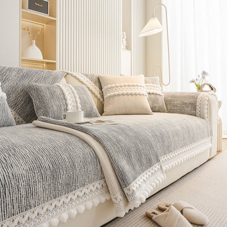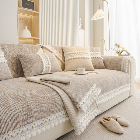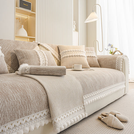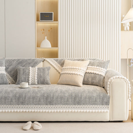 Soft Chenille Sectional Sofa Cover with Pom Pom Trim – Non-Slip Couch Protector